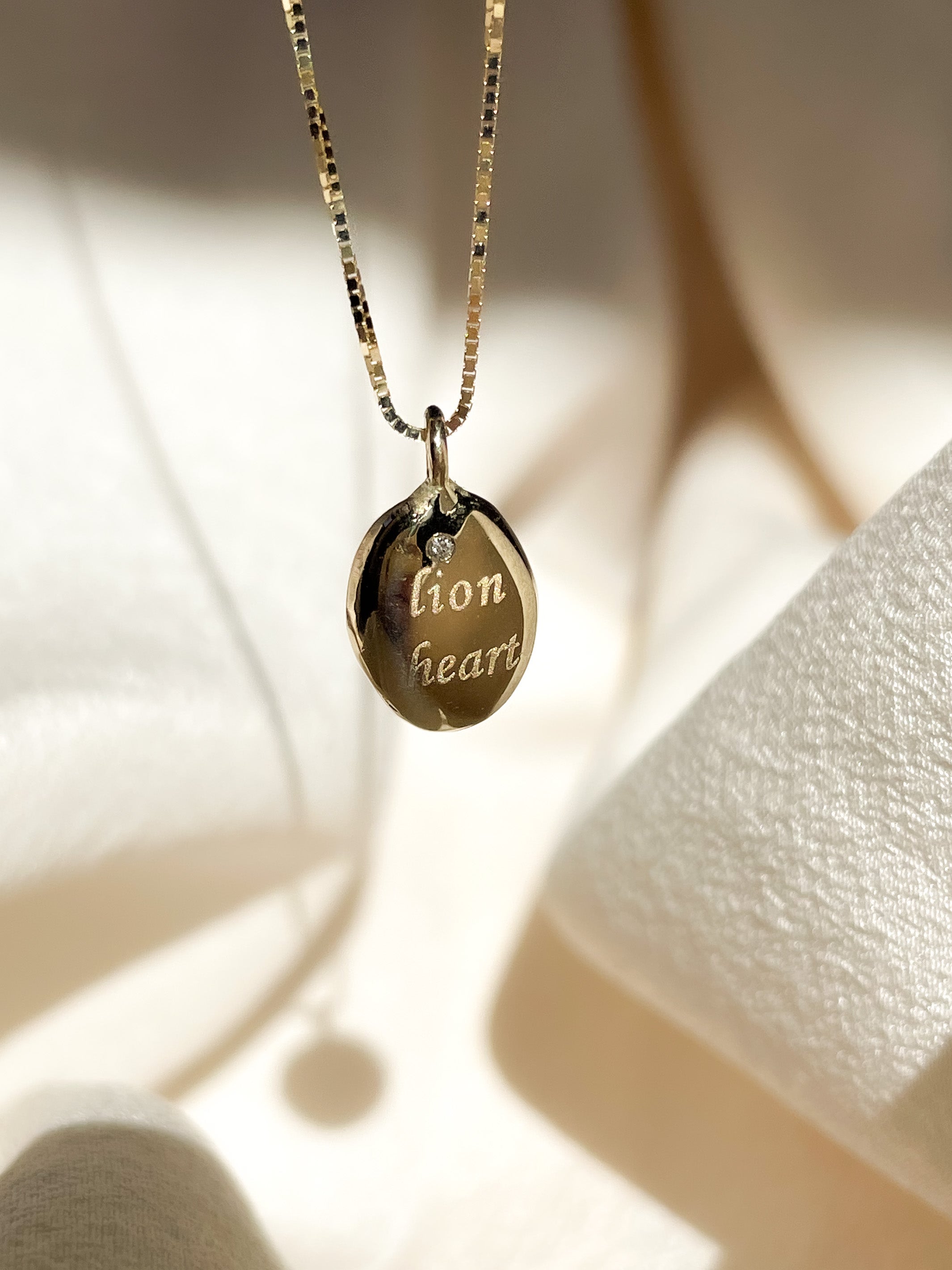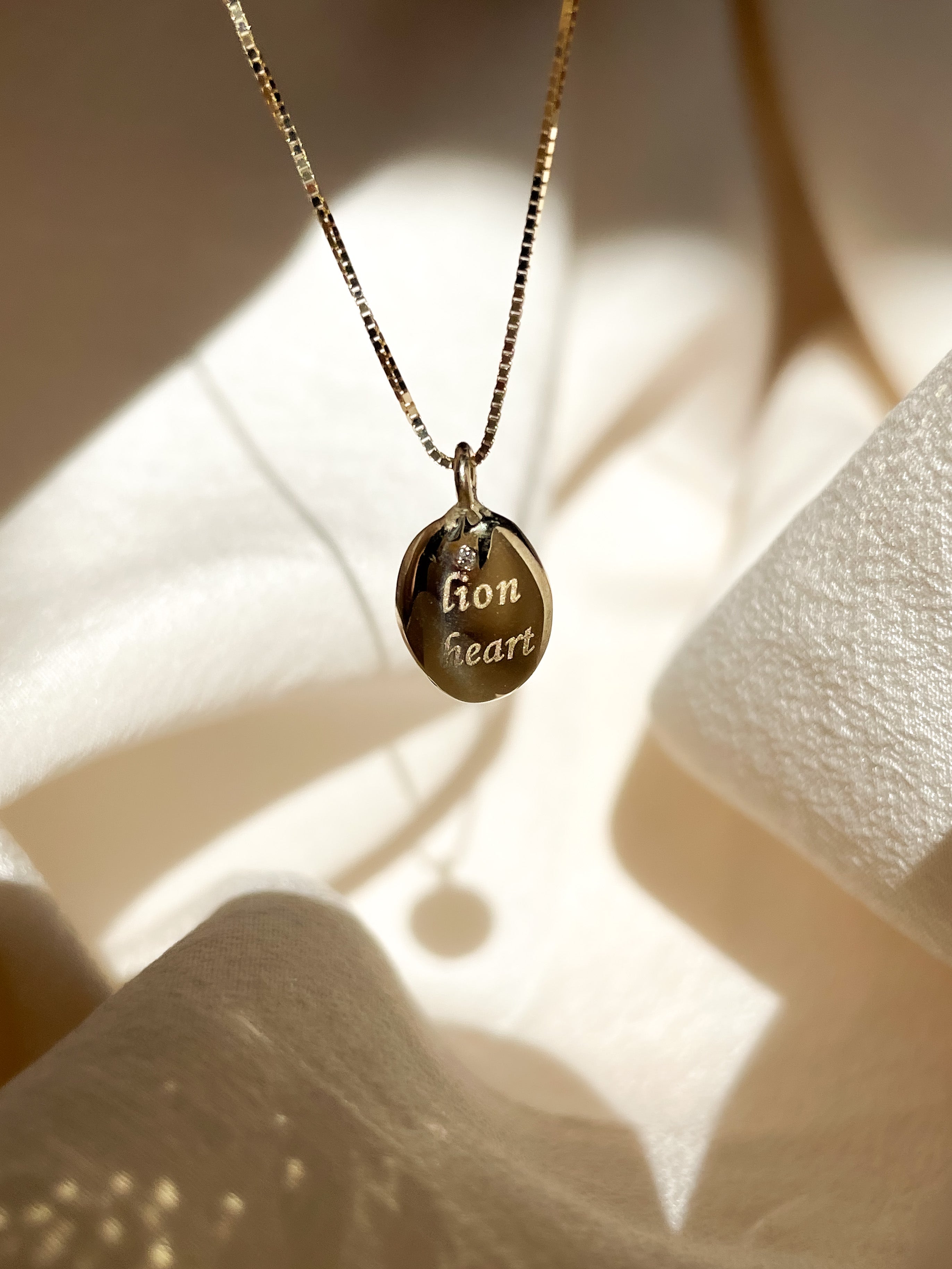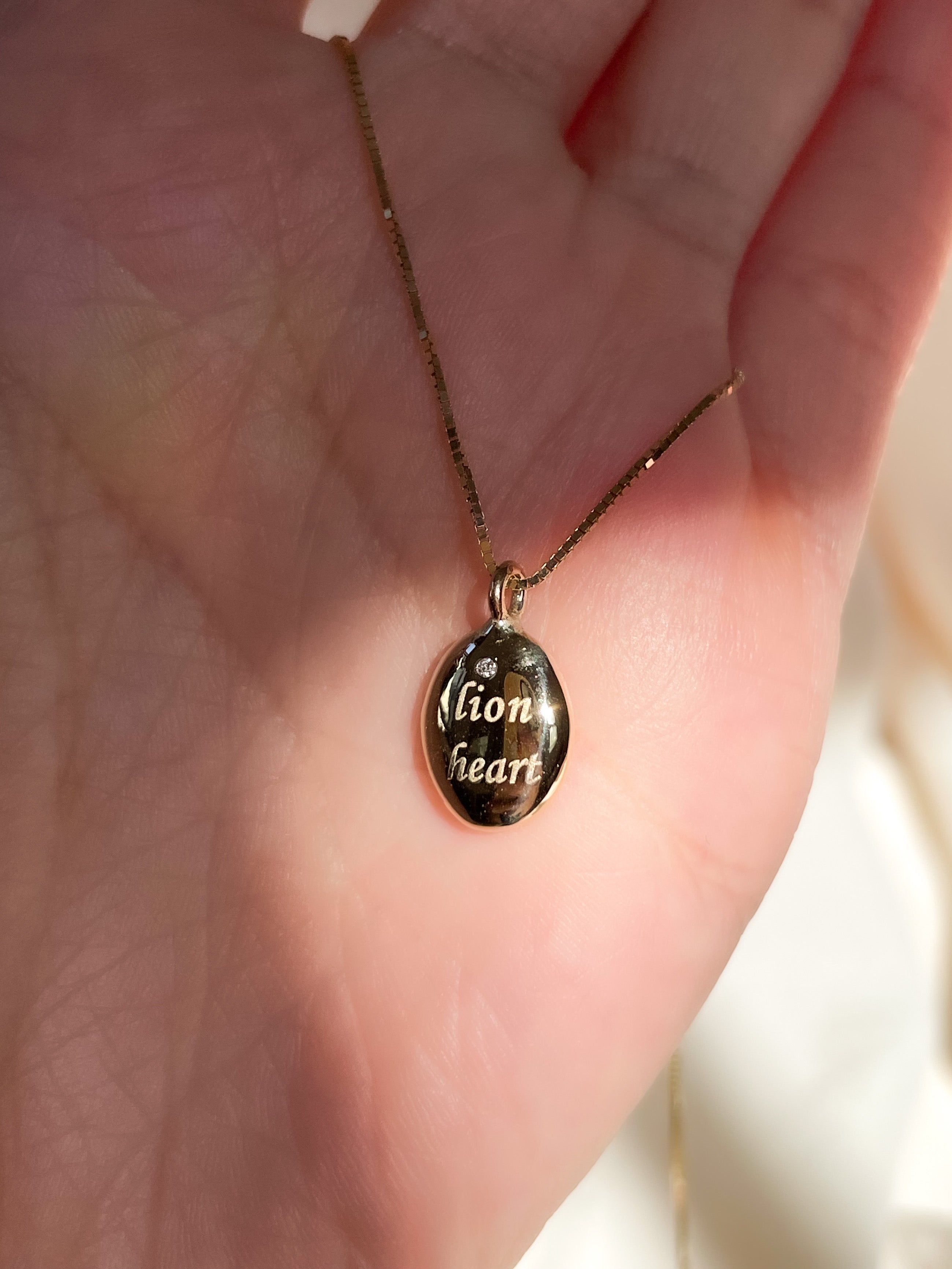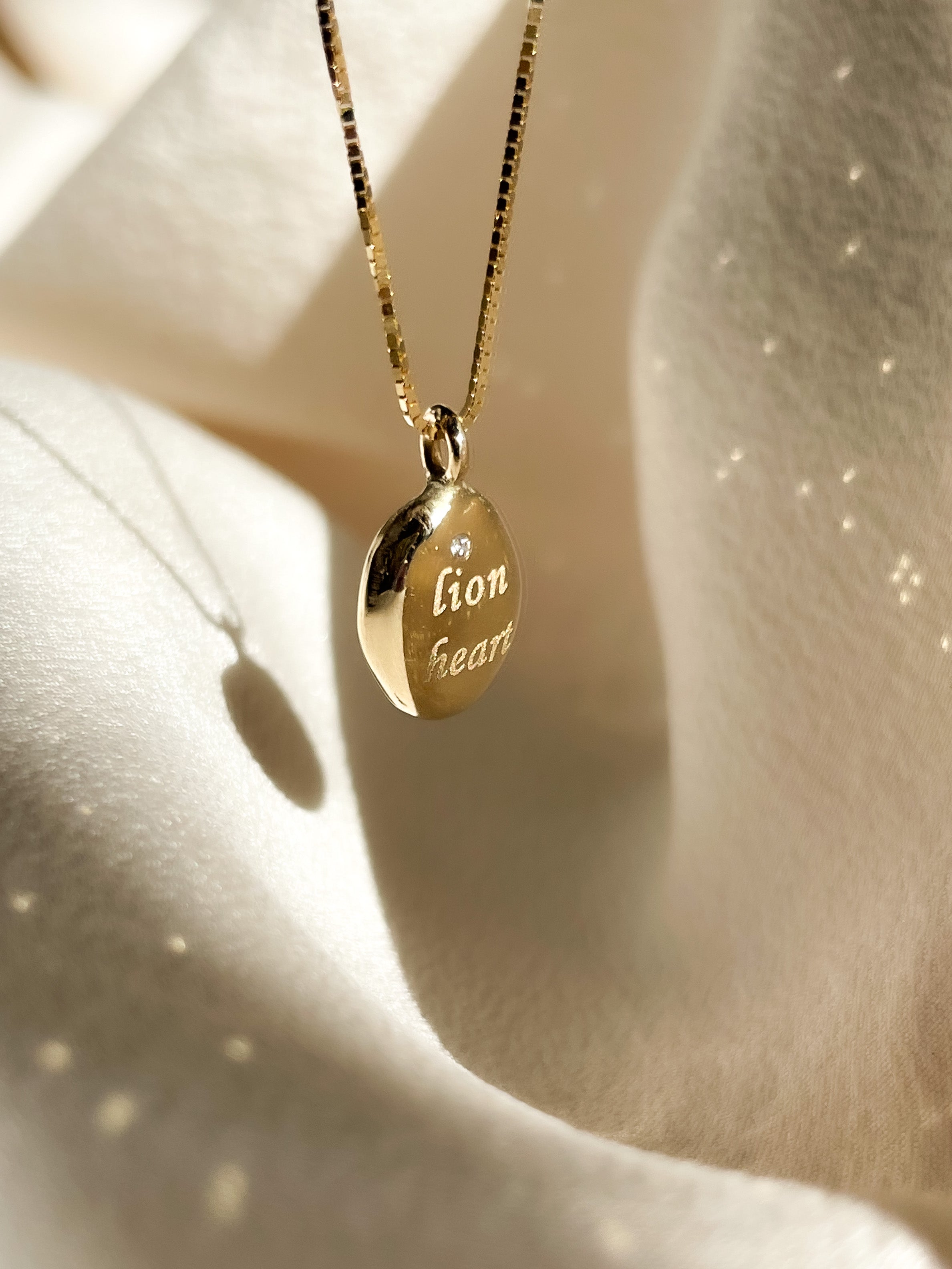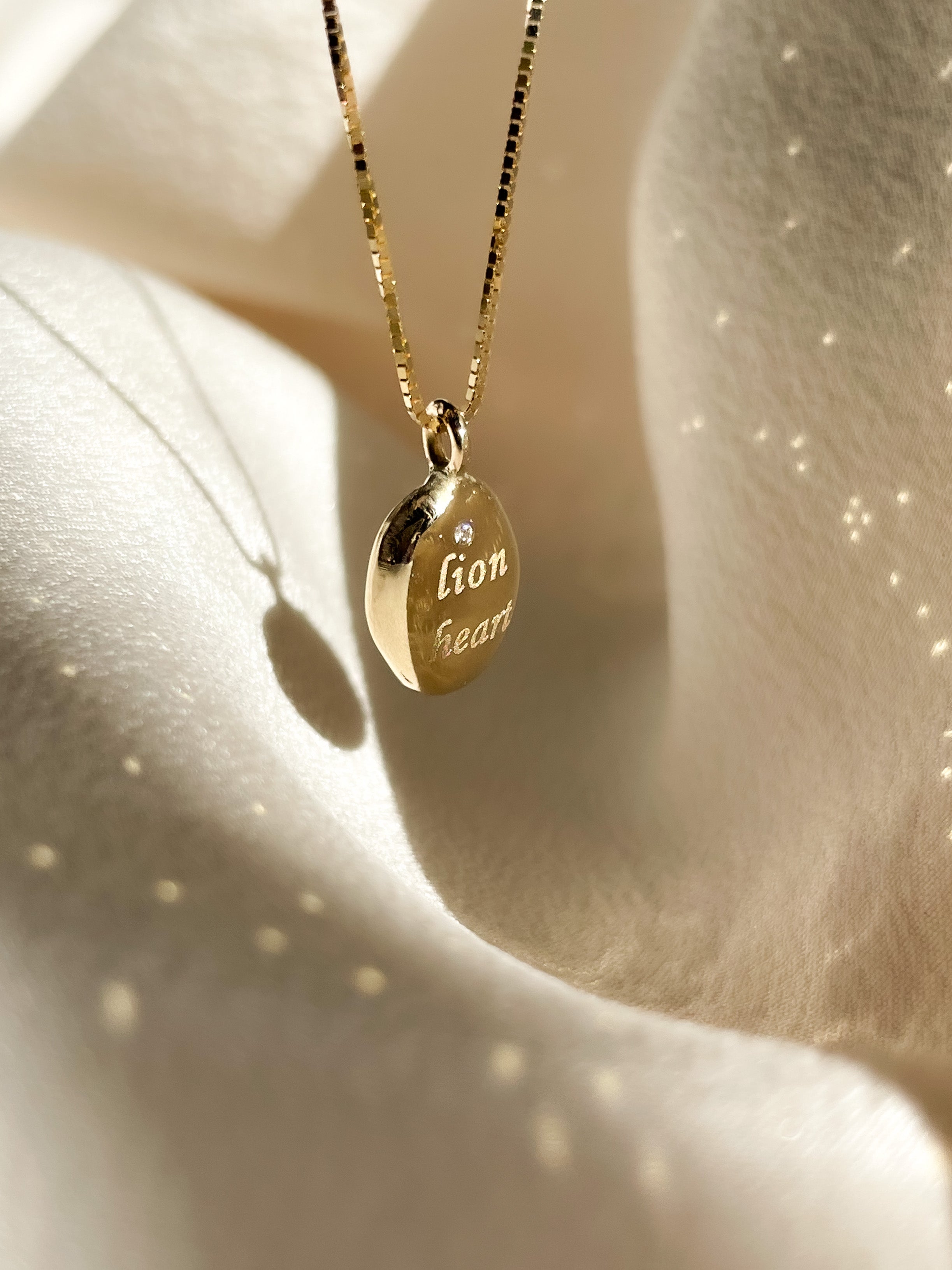 Solid 14k Yellow Gold pendant engraved with the emblem "lion heart", adorned with (1) 1.2mm sacred Diamond on a 0.8mm box chain.