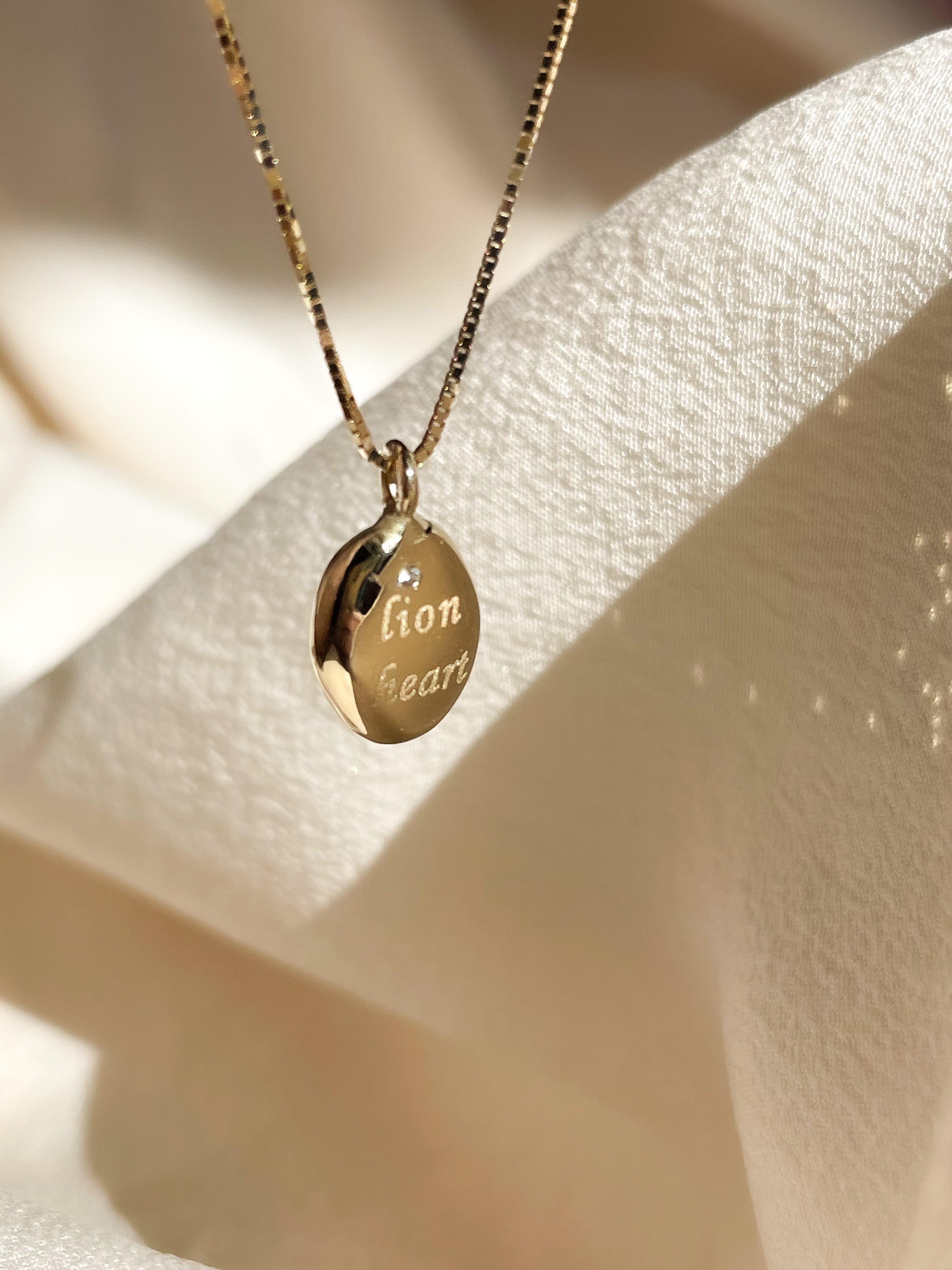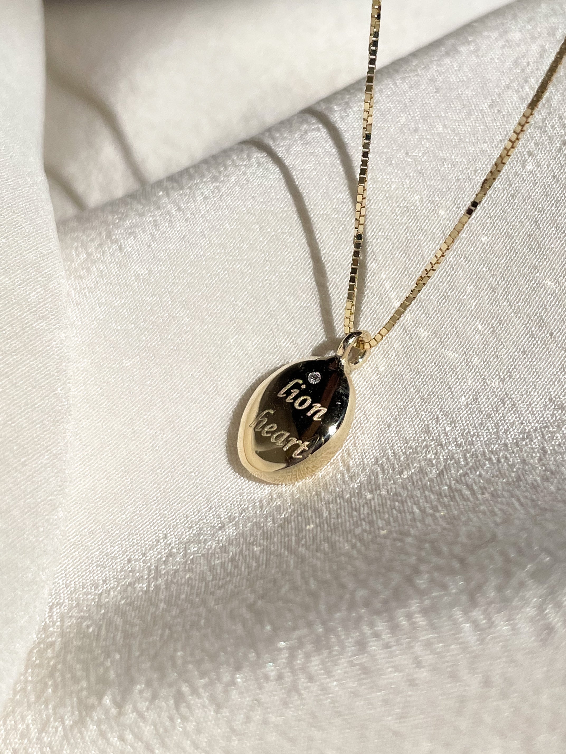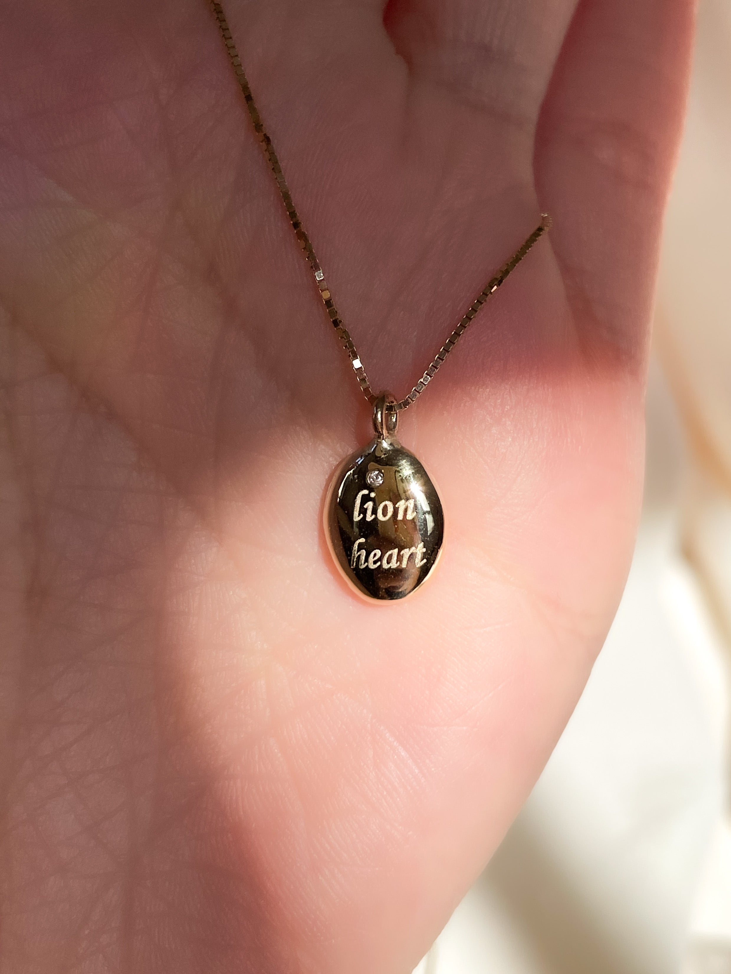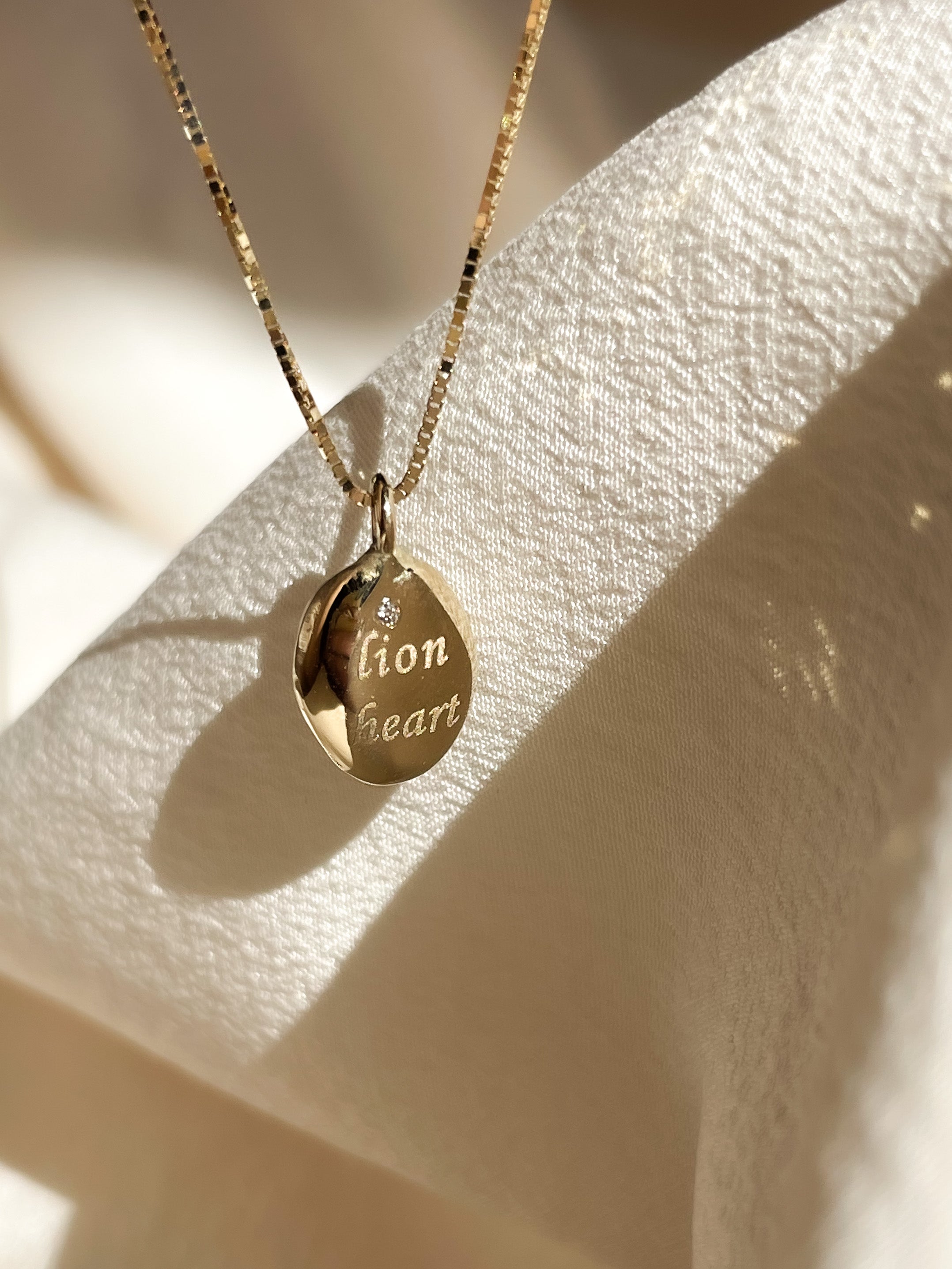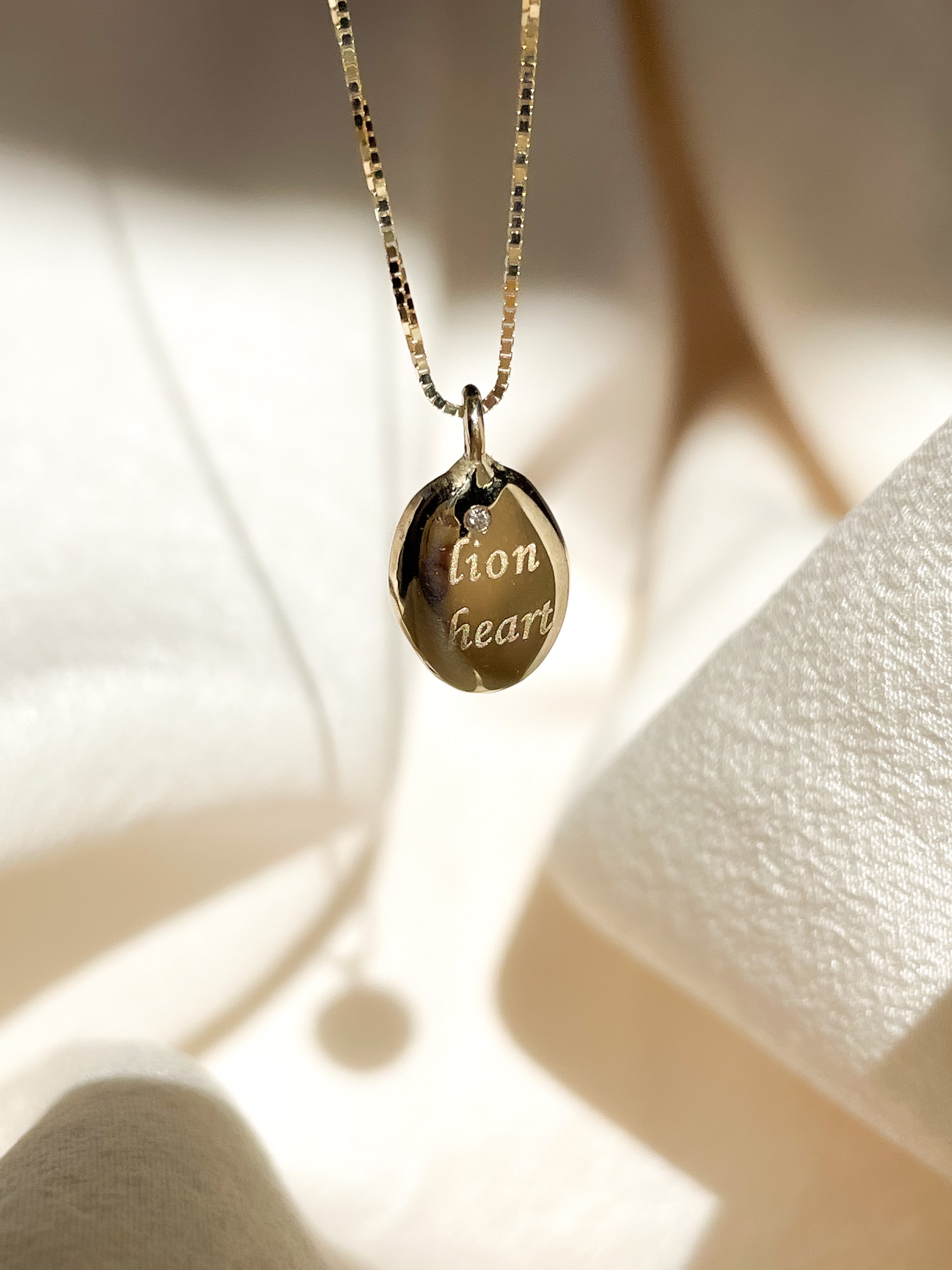 Solid 14k Yellow Gold pendant engraved with the emblem "lion heart", adorned with (1) 1.2mm sacred Diamond on a 0.8mm box chain.