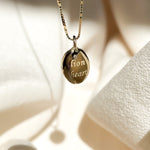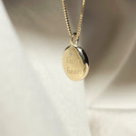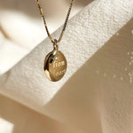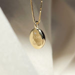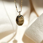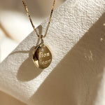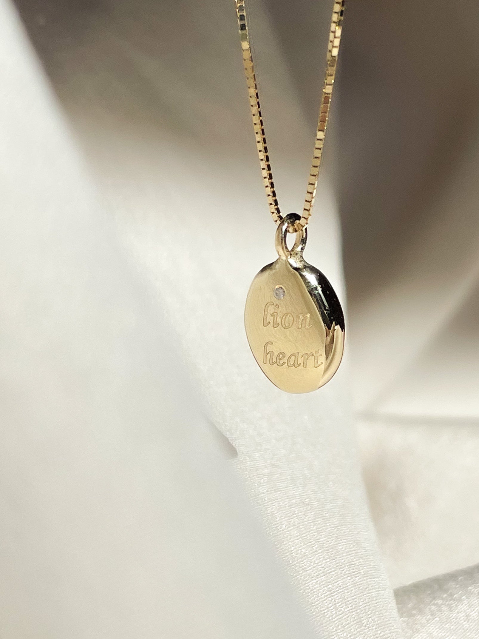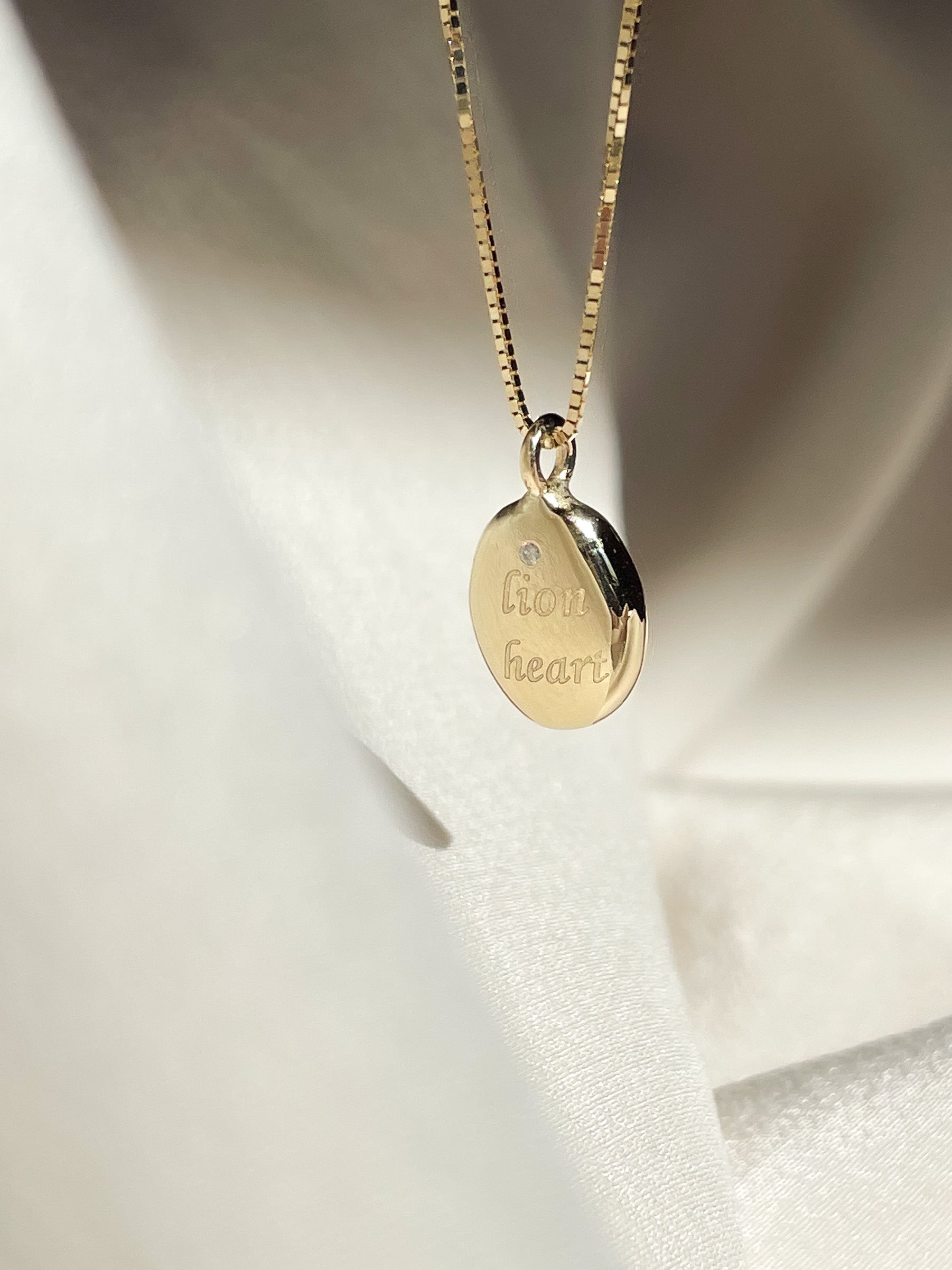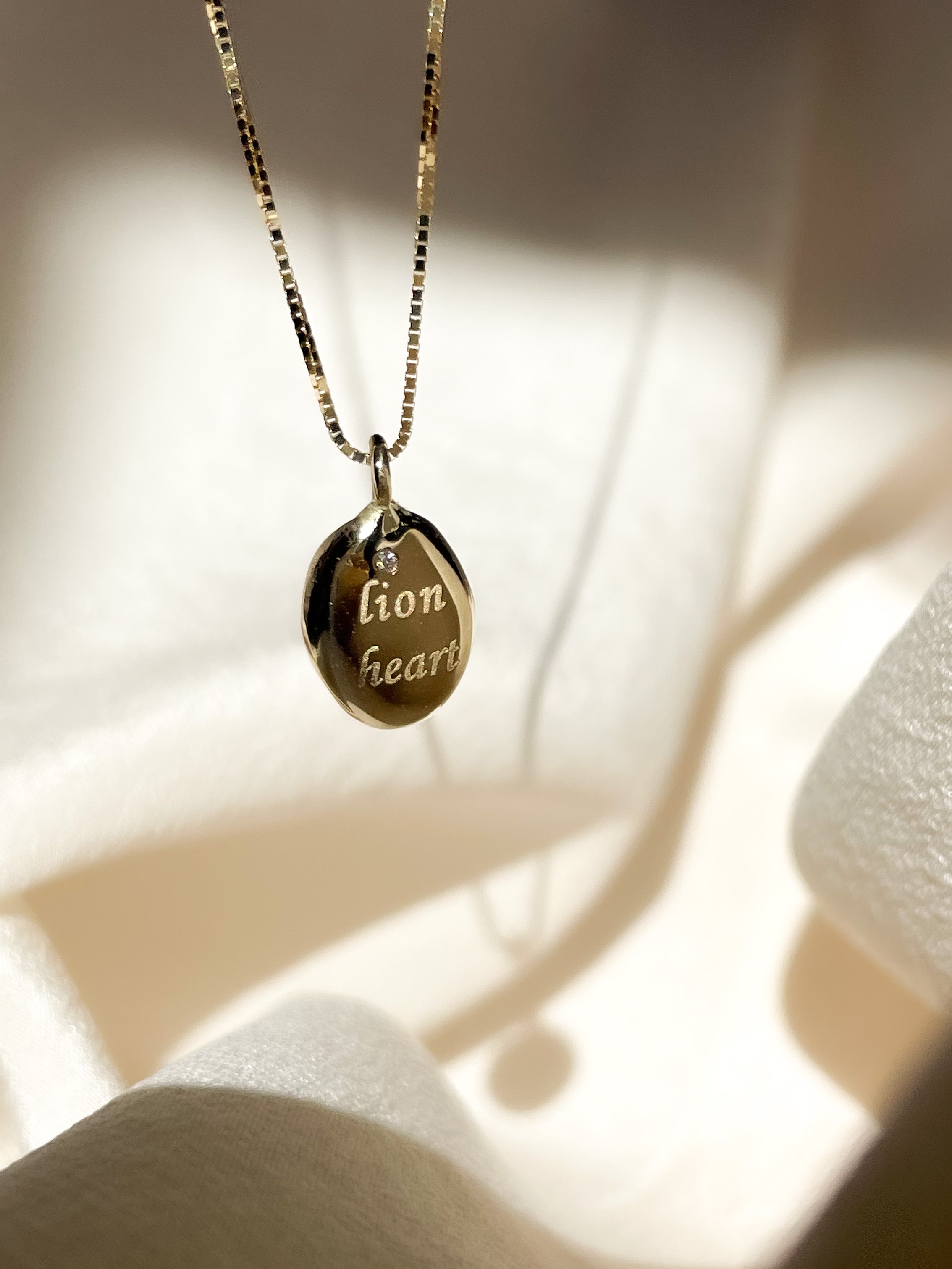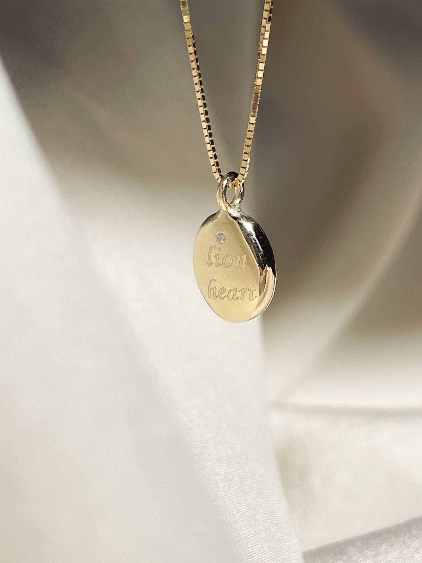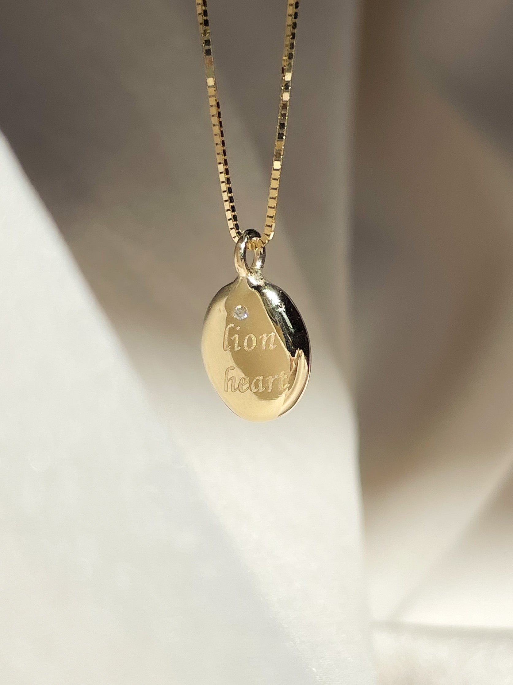 Solid 14k Yellow Gold pendant engraved with the emblem "lion heart", adorned with (1) 1.2mm sacred Diamond on a 0.8mm box chain.