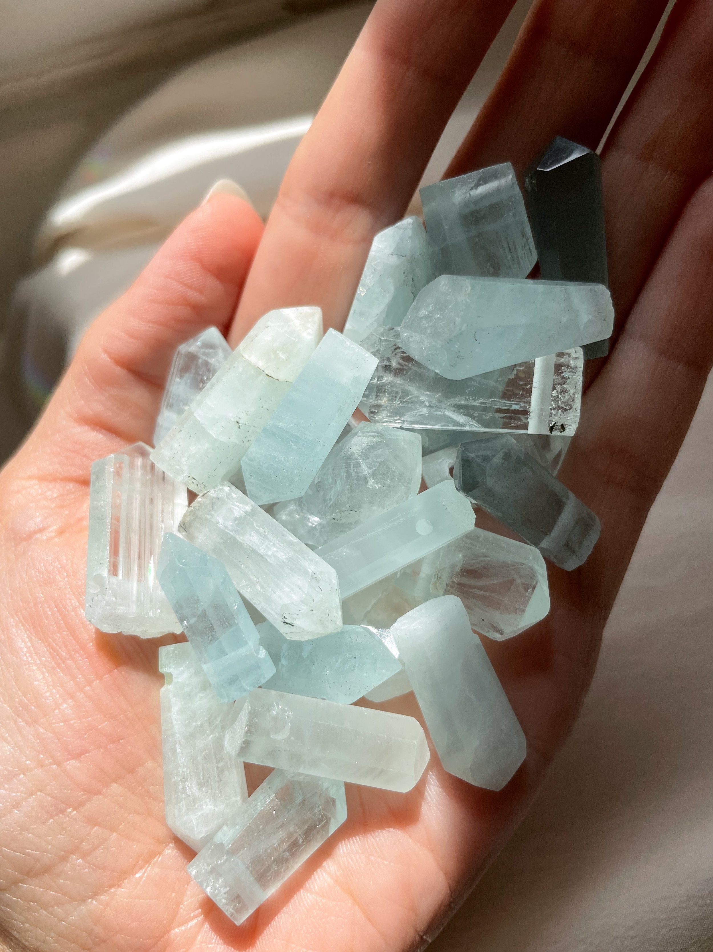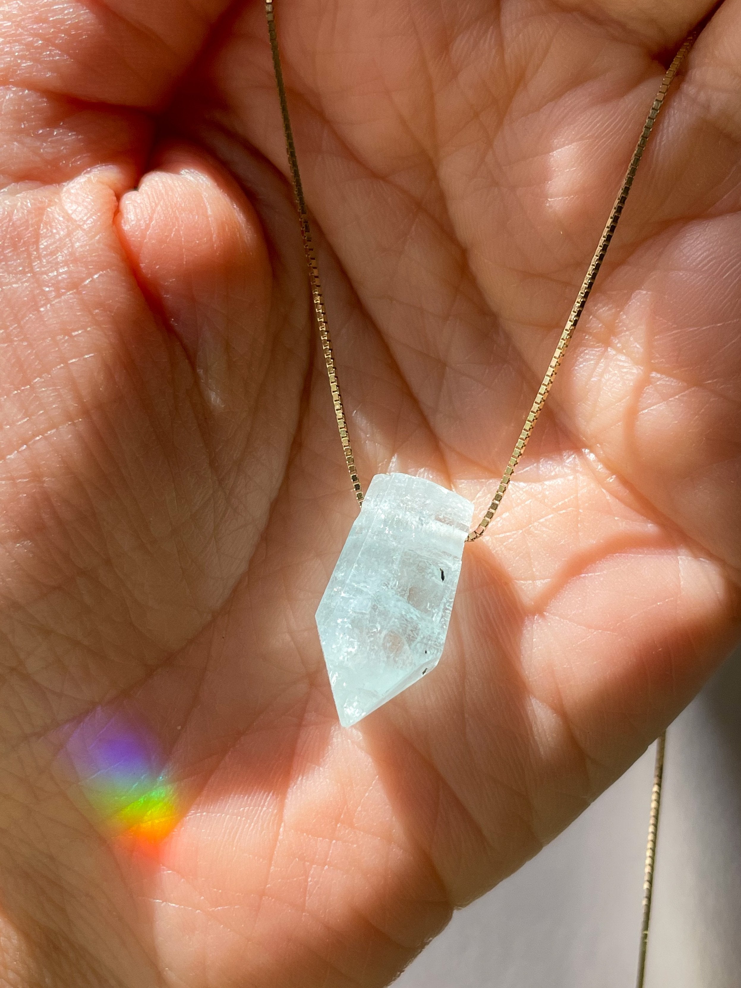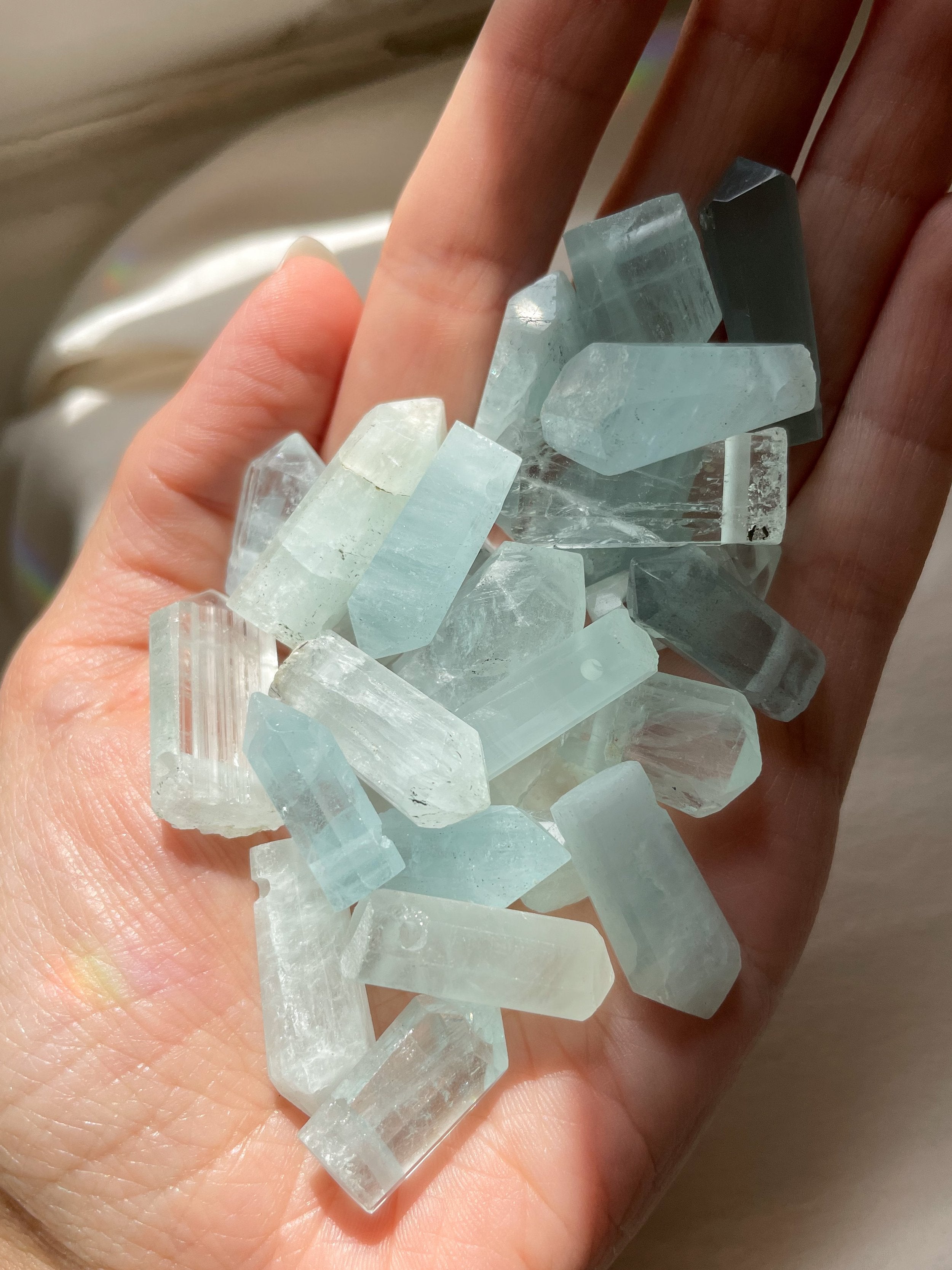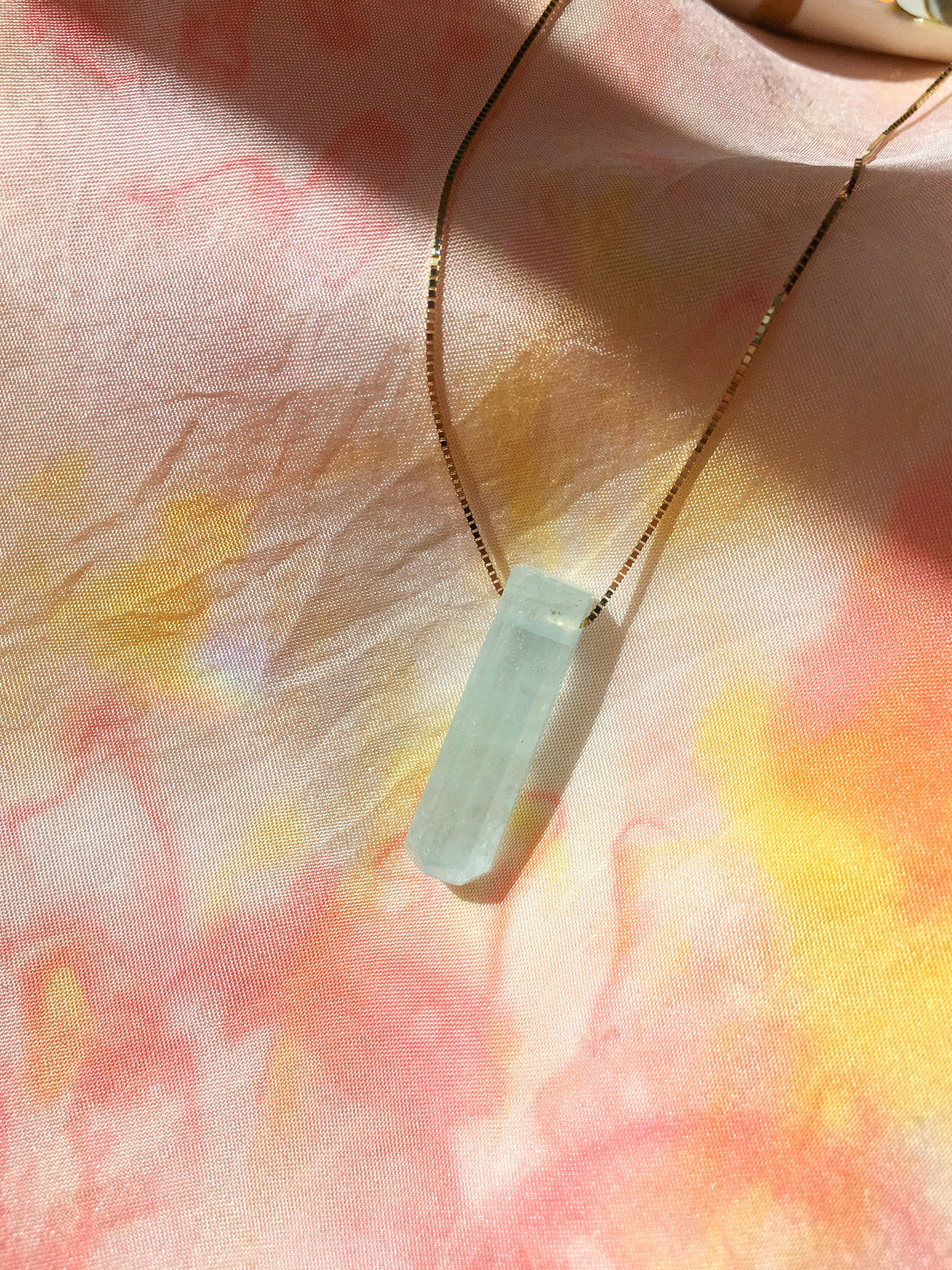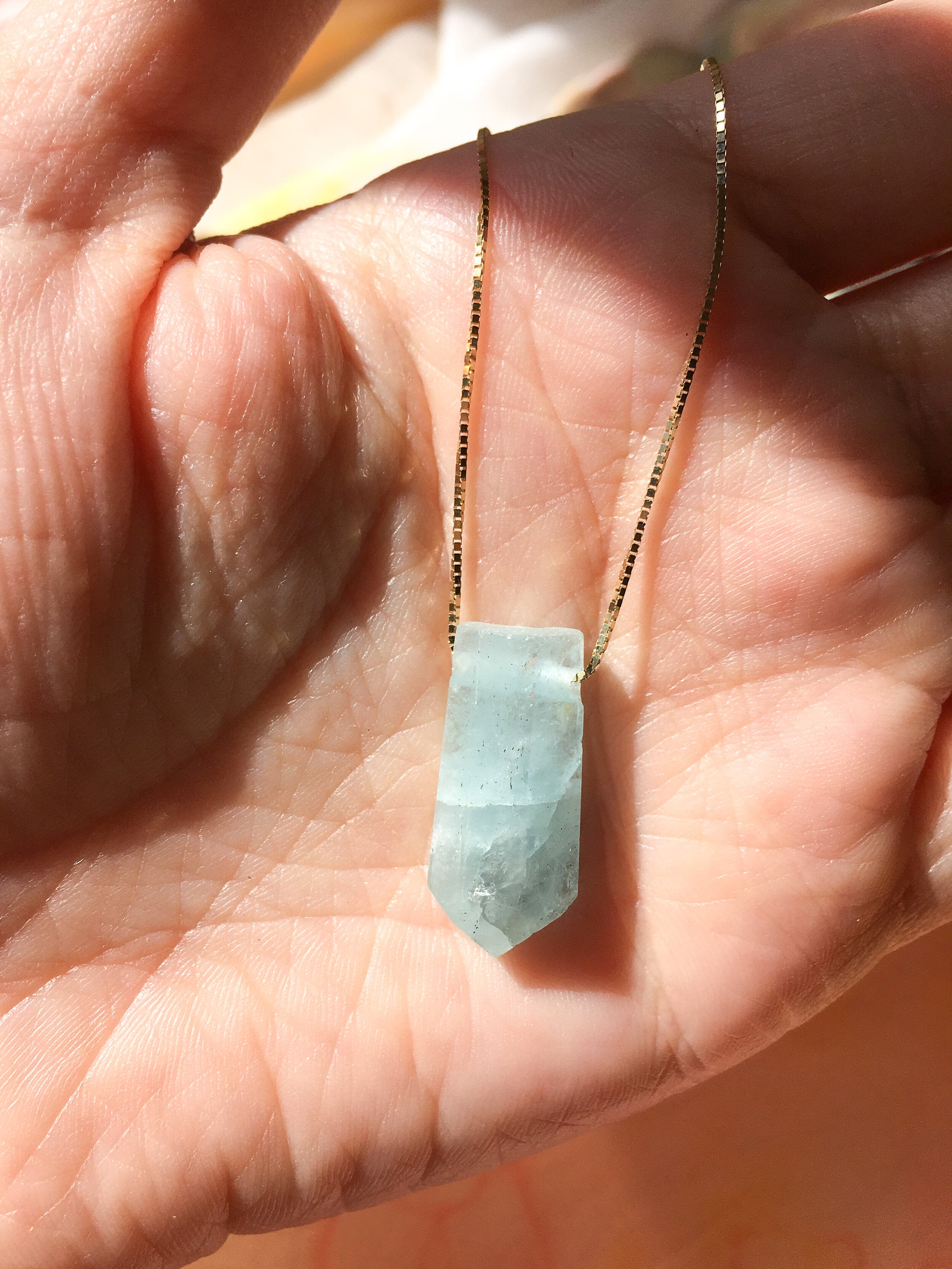 Aquamarine embodies the Divine Feminine energy which fills our oceans, its Latin name translating to water of the sea. It is calming and opens the platform for a truthful, cool, and calm way of communicating, and is empowering to those who are more sensitive and empathic. Aquamarine is a comforting stone, as it implores you to use your voice with confidence, while releasing stress or fear to create positive changes in your life and let go of what no longer belongs to you. According to ancient lore, Aquamarine was believed to be the treasure of the mermaids, and was used by sailors for good luck, fearlessness and protection. Aquamarine lends you feelings of courage during times that require you to challenge yourself from shying away from your dreams, assisting you to channel your inner Goddess to understand yourself on a deeper level and relate to those around you more intuitively.