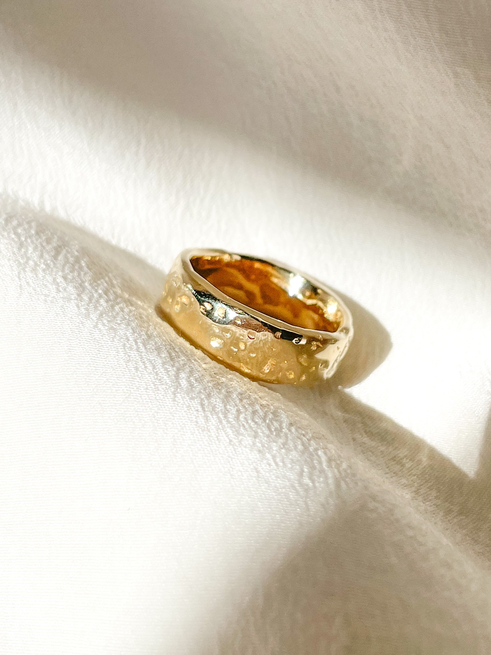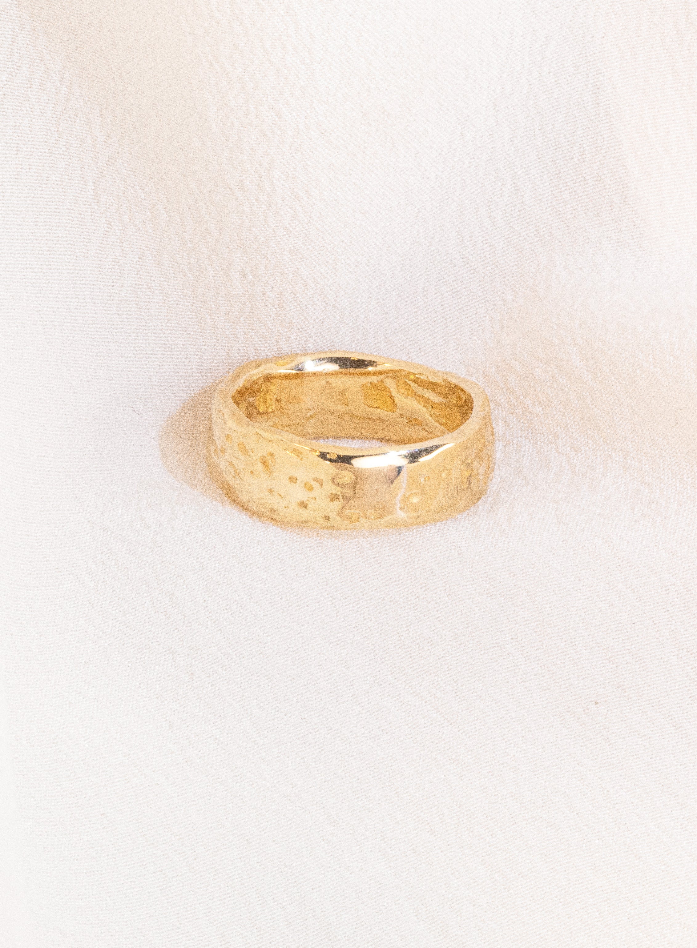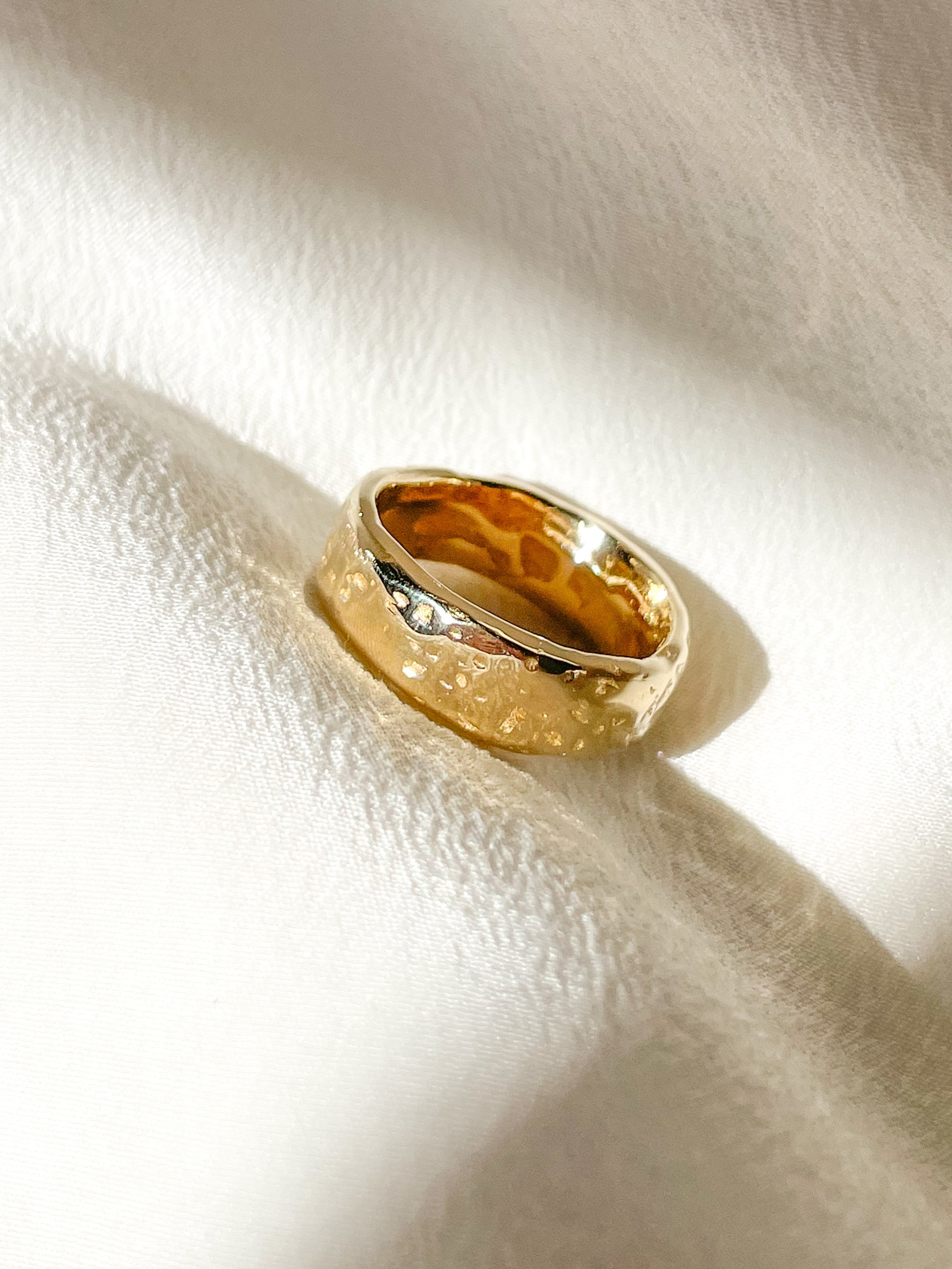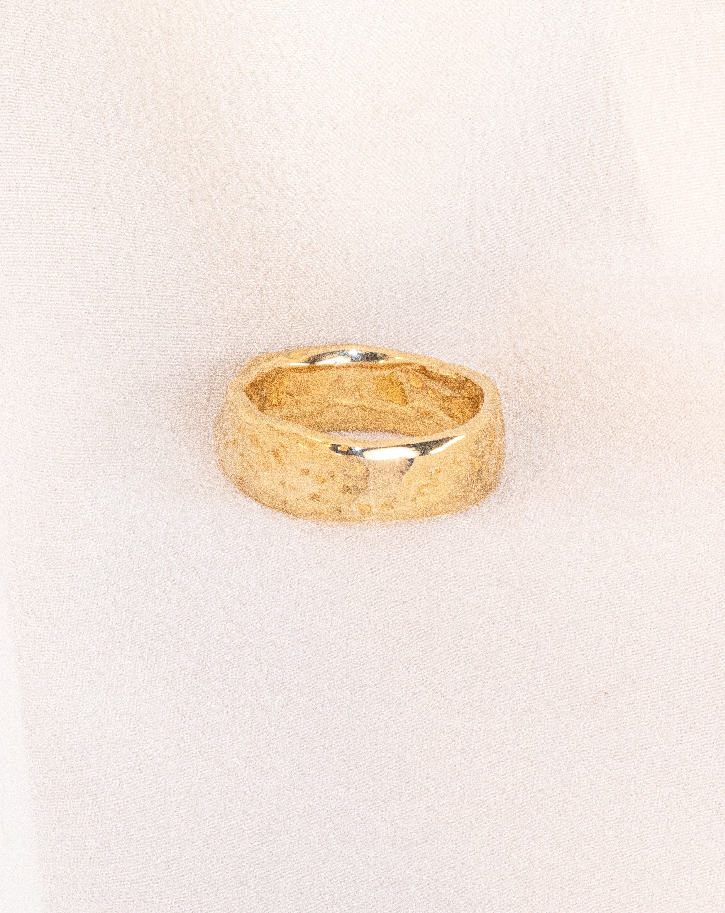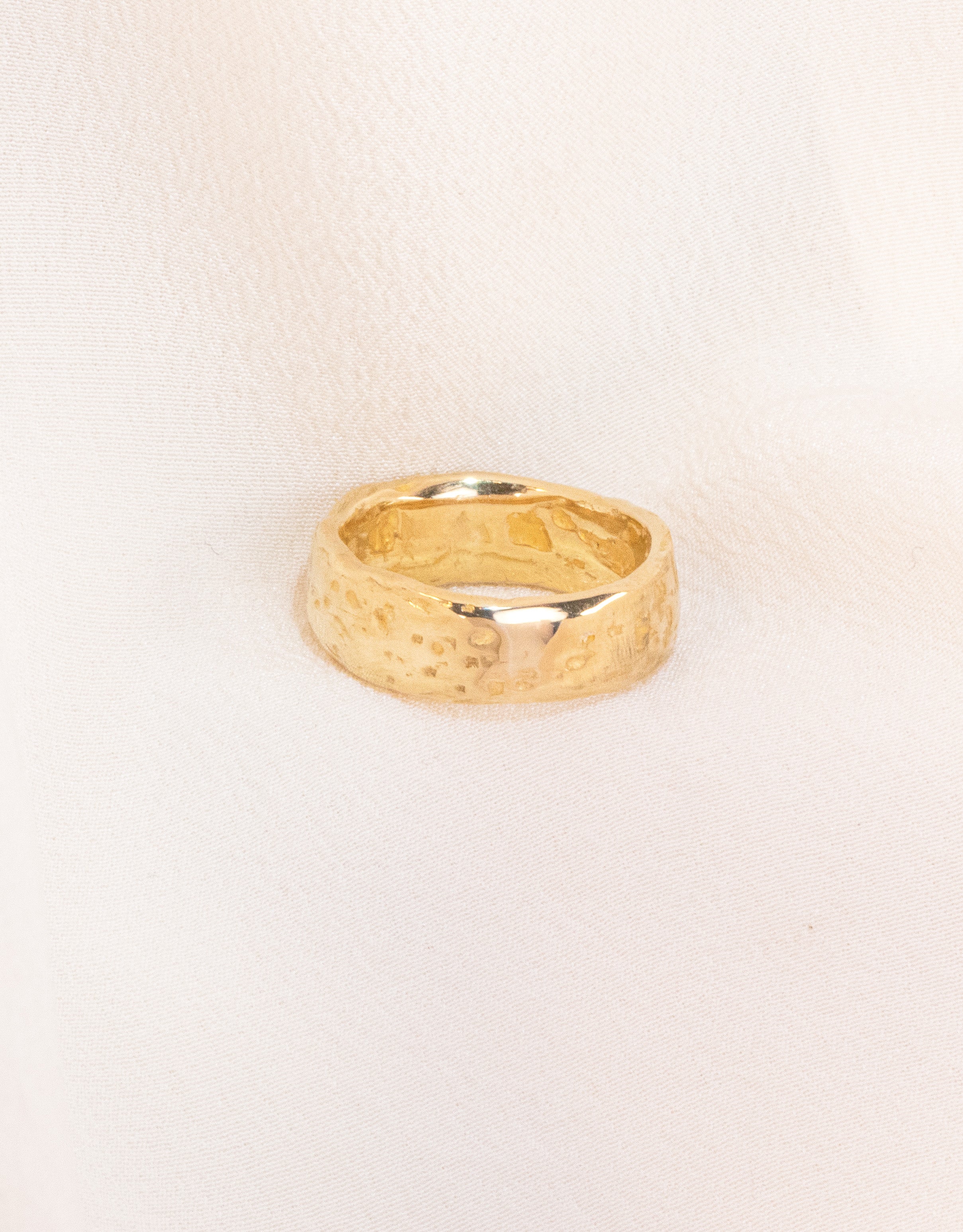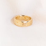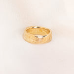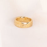 Hand-carved texturized band available in solid 14k Yellow, White, or Rose Gold.
