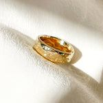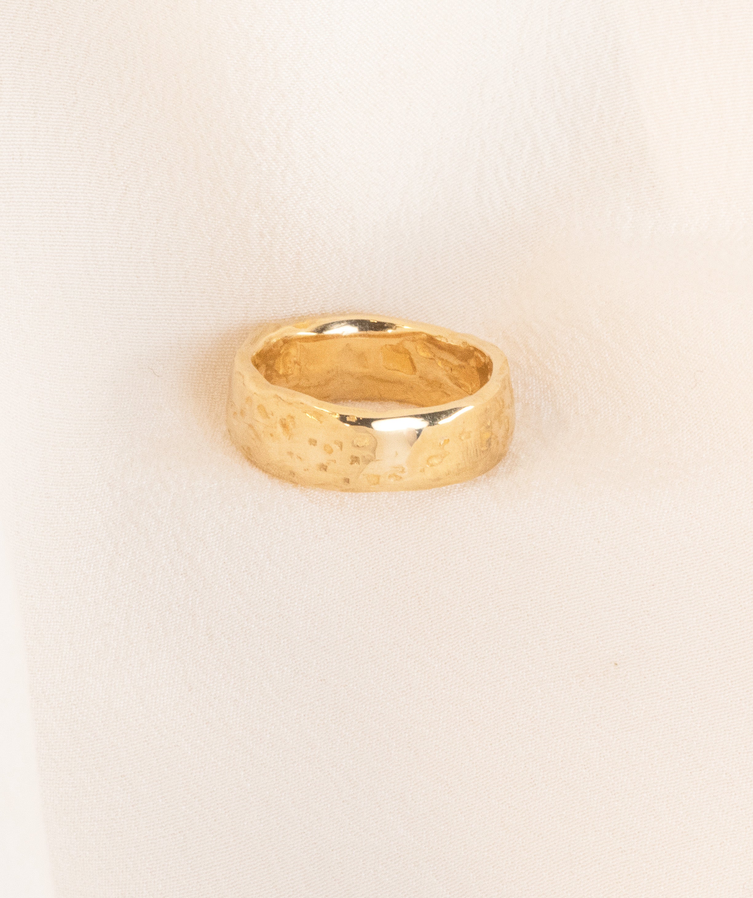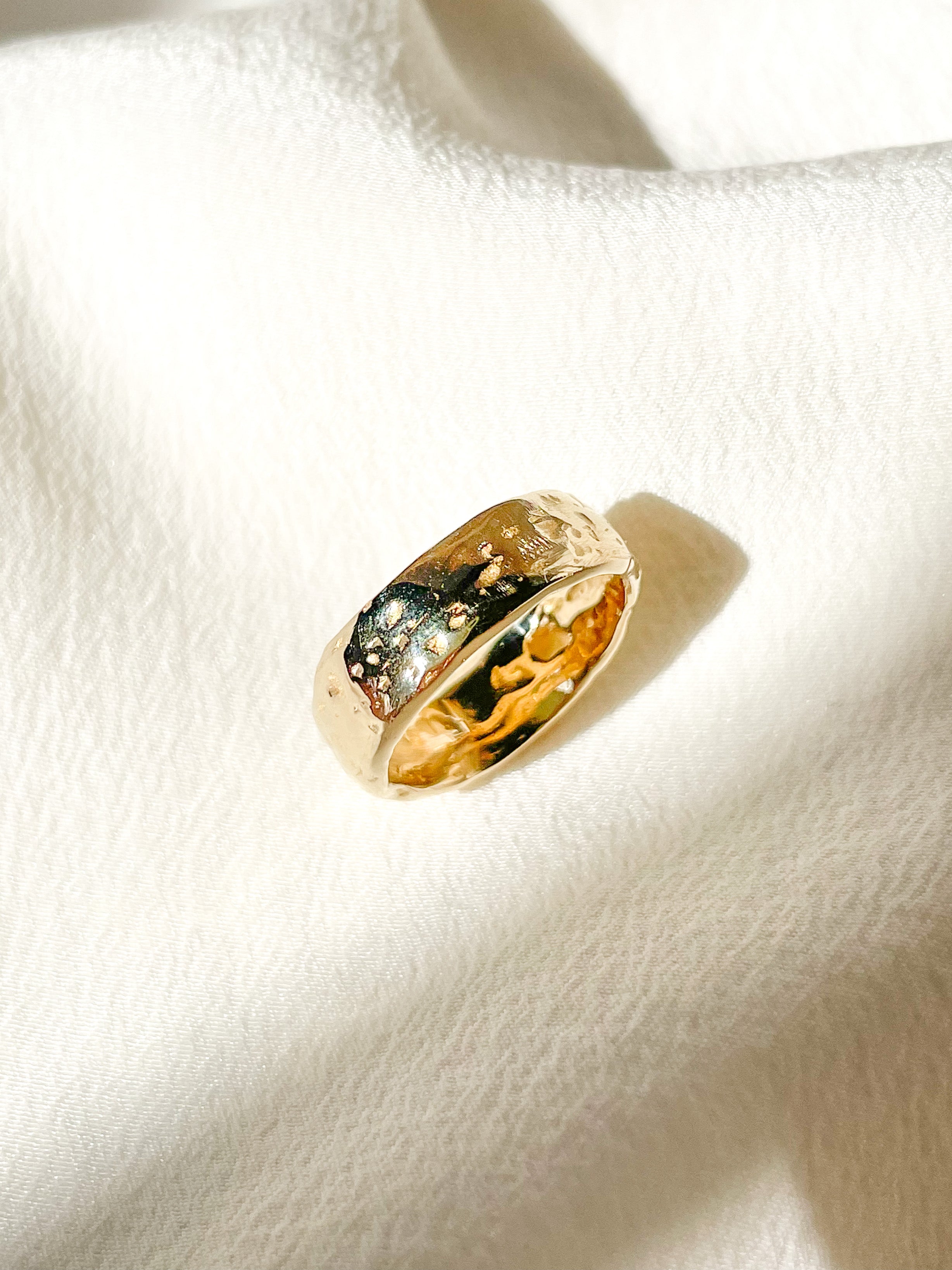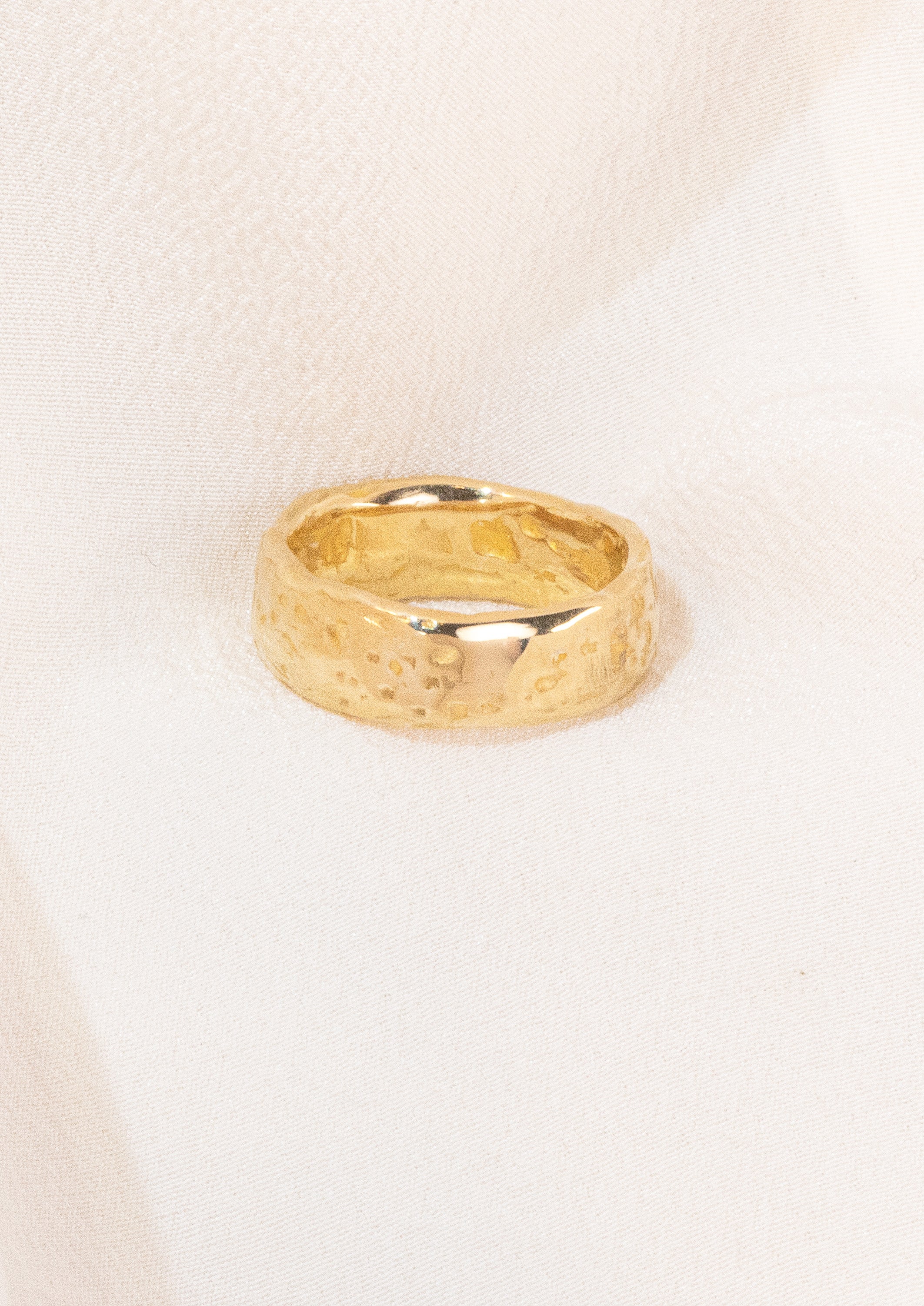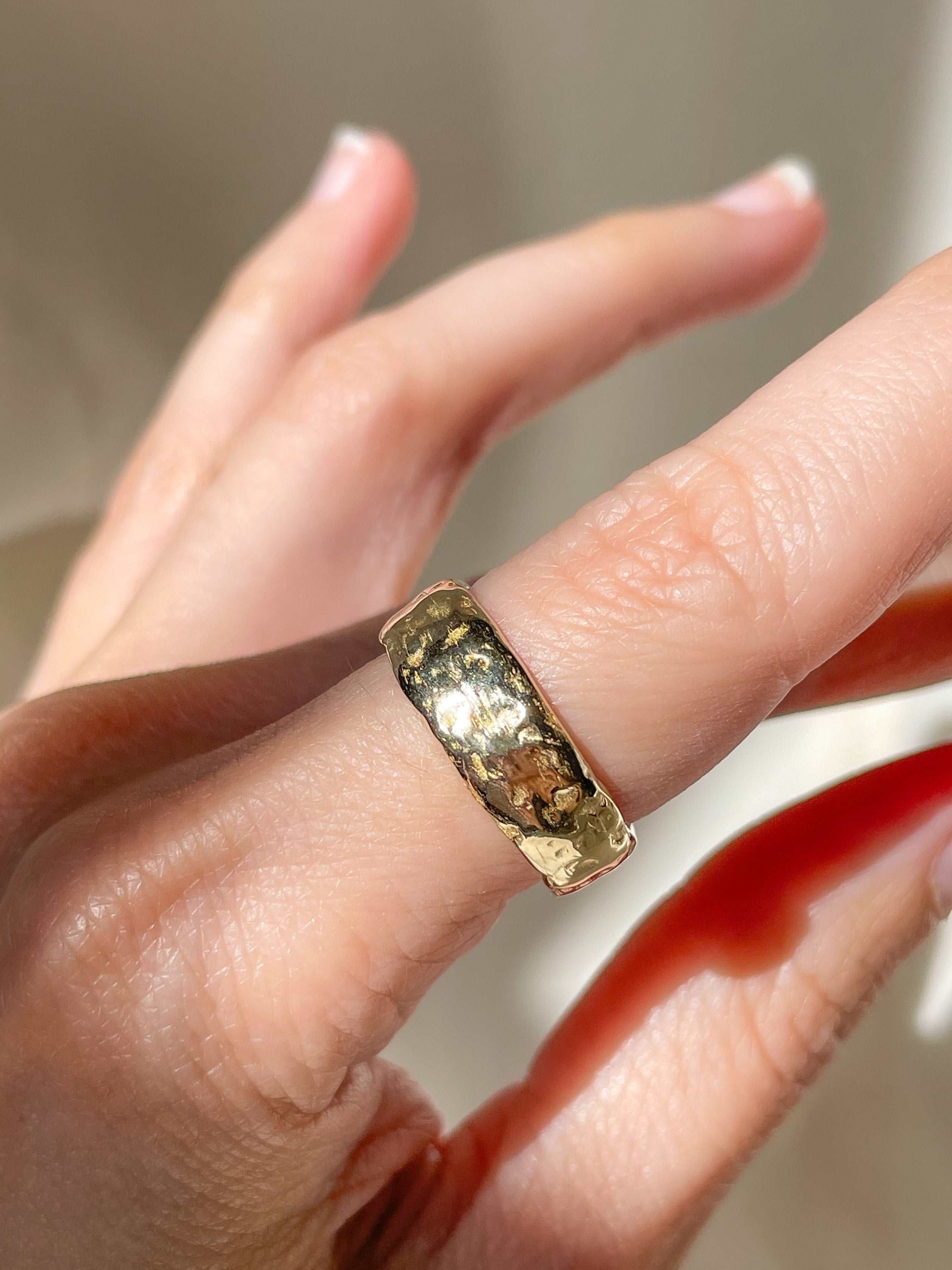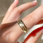 Hand-carved texturized band available in solid 14k Yellow, White, or Rose Gold.