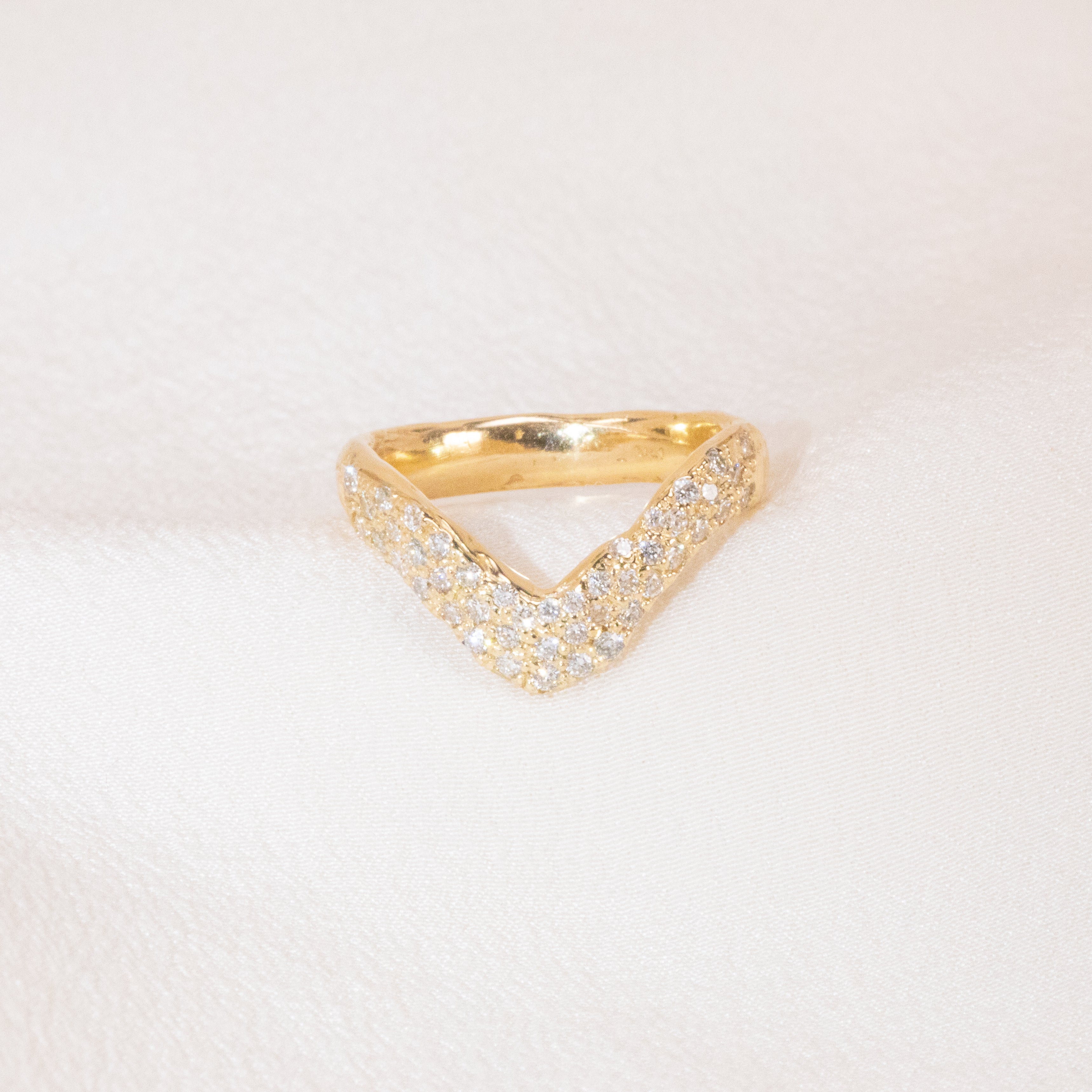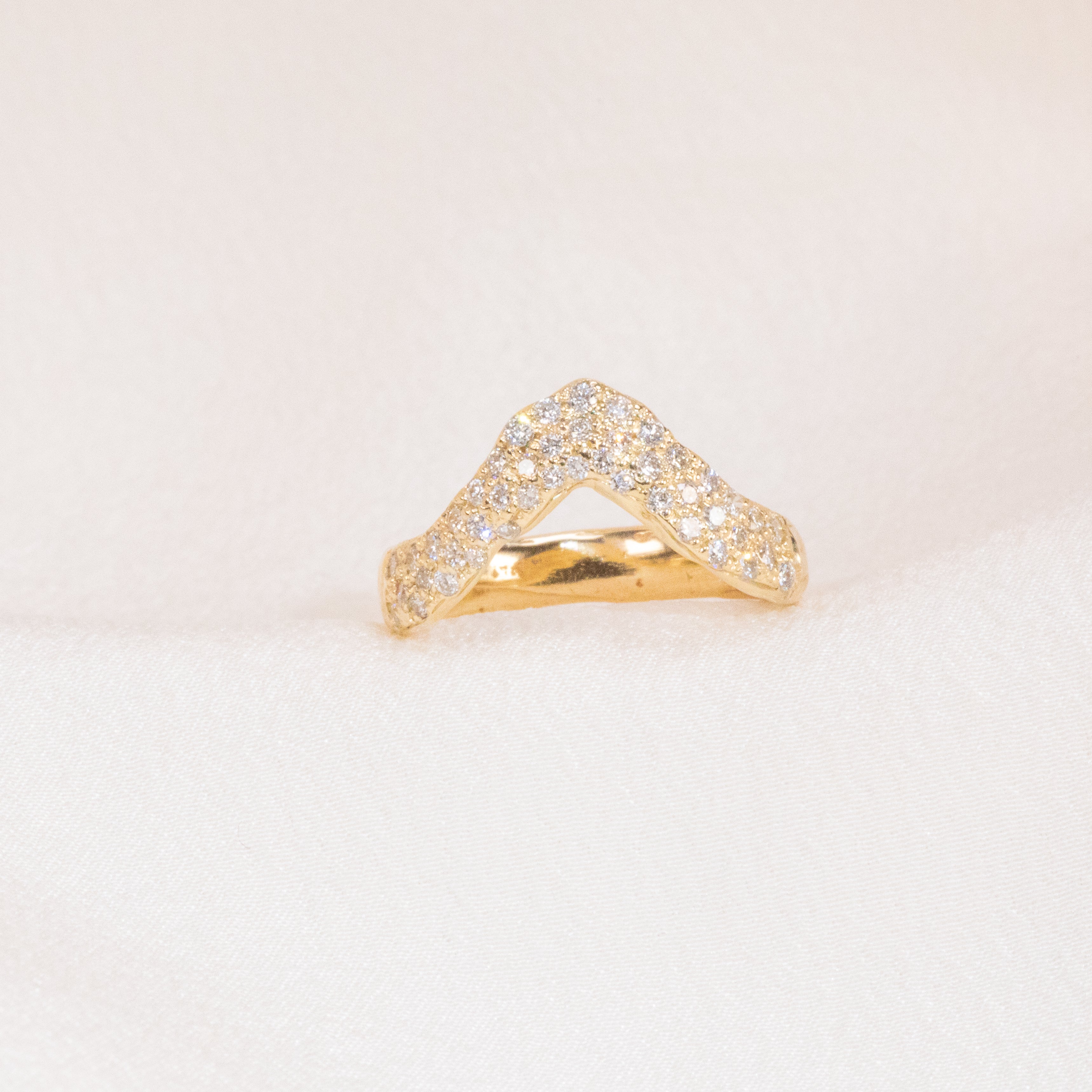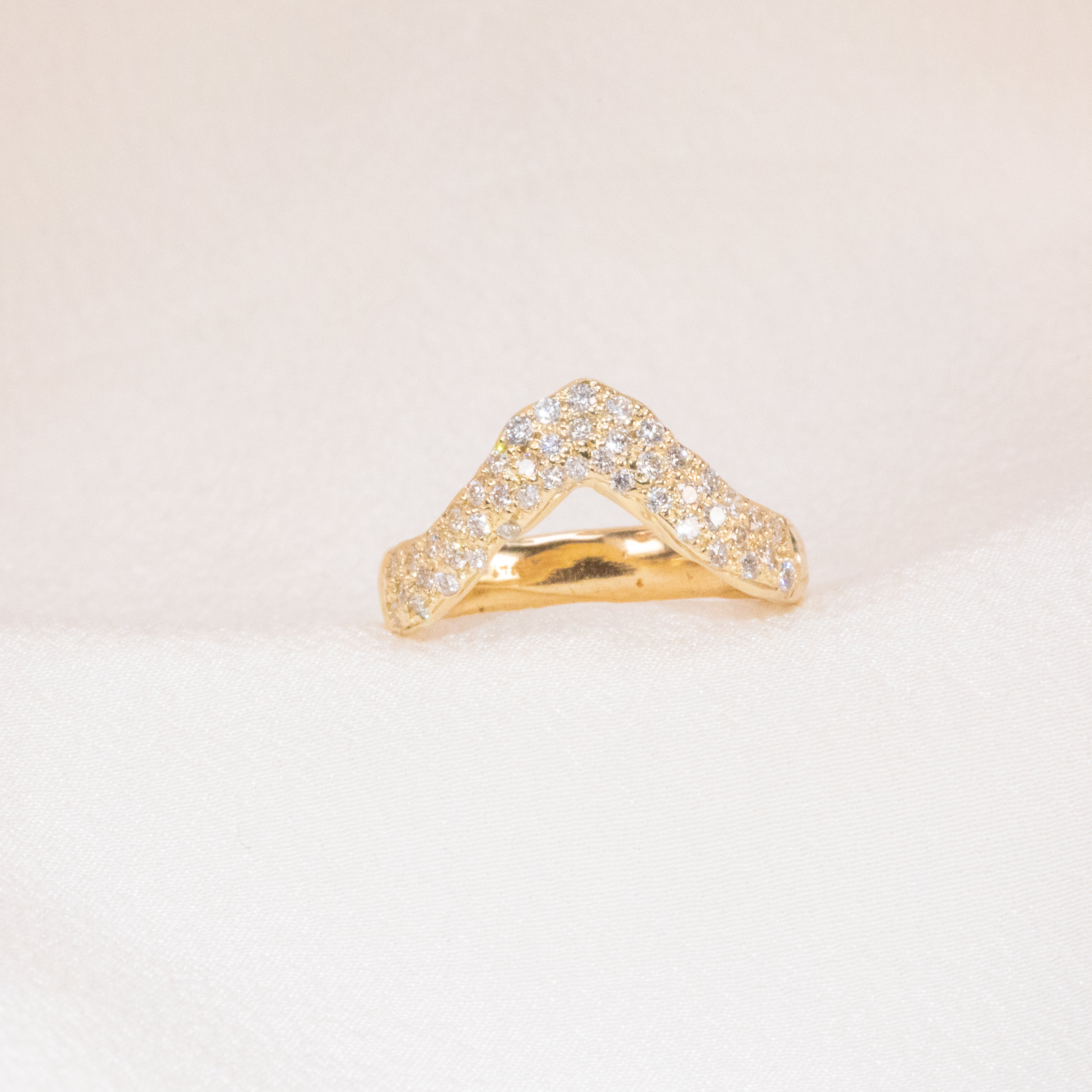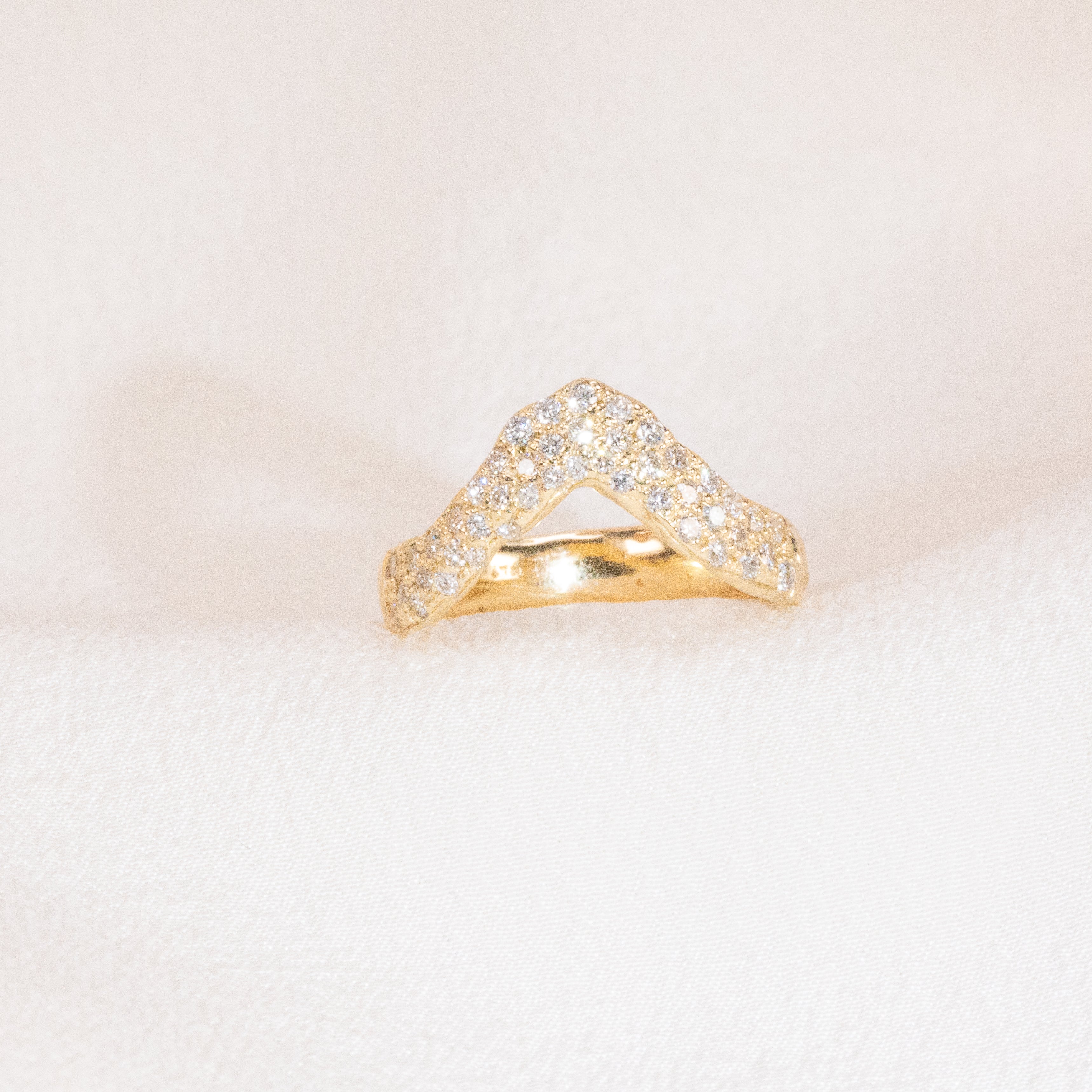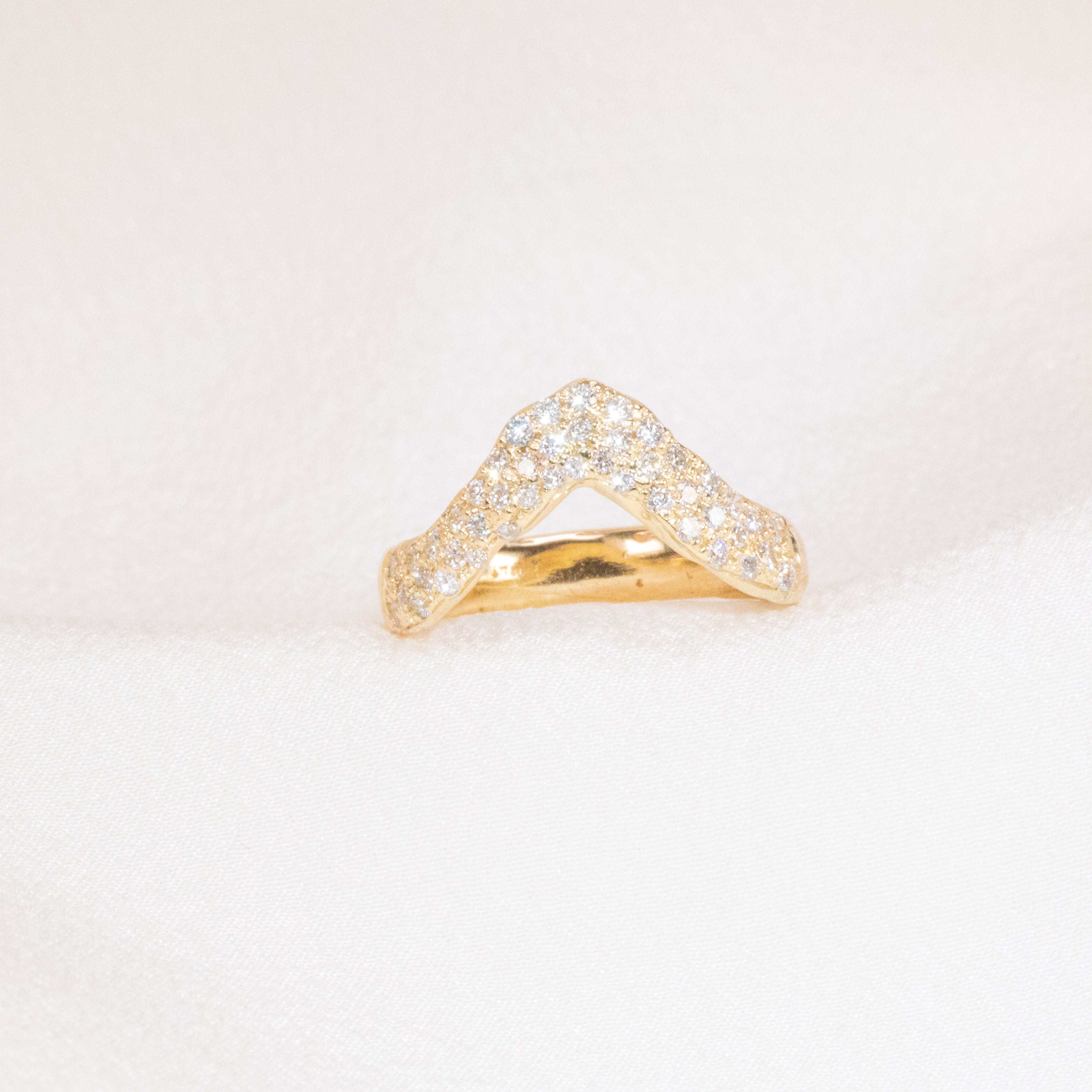 Hand-carved v-shaped band available in 14k Yellow, White, or Rose Gold, set with an incredible, shimmering disco party of 45 White Diamonds.