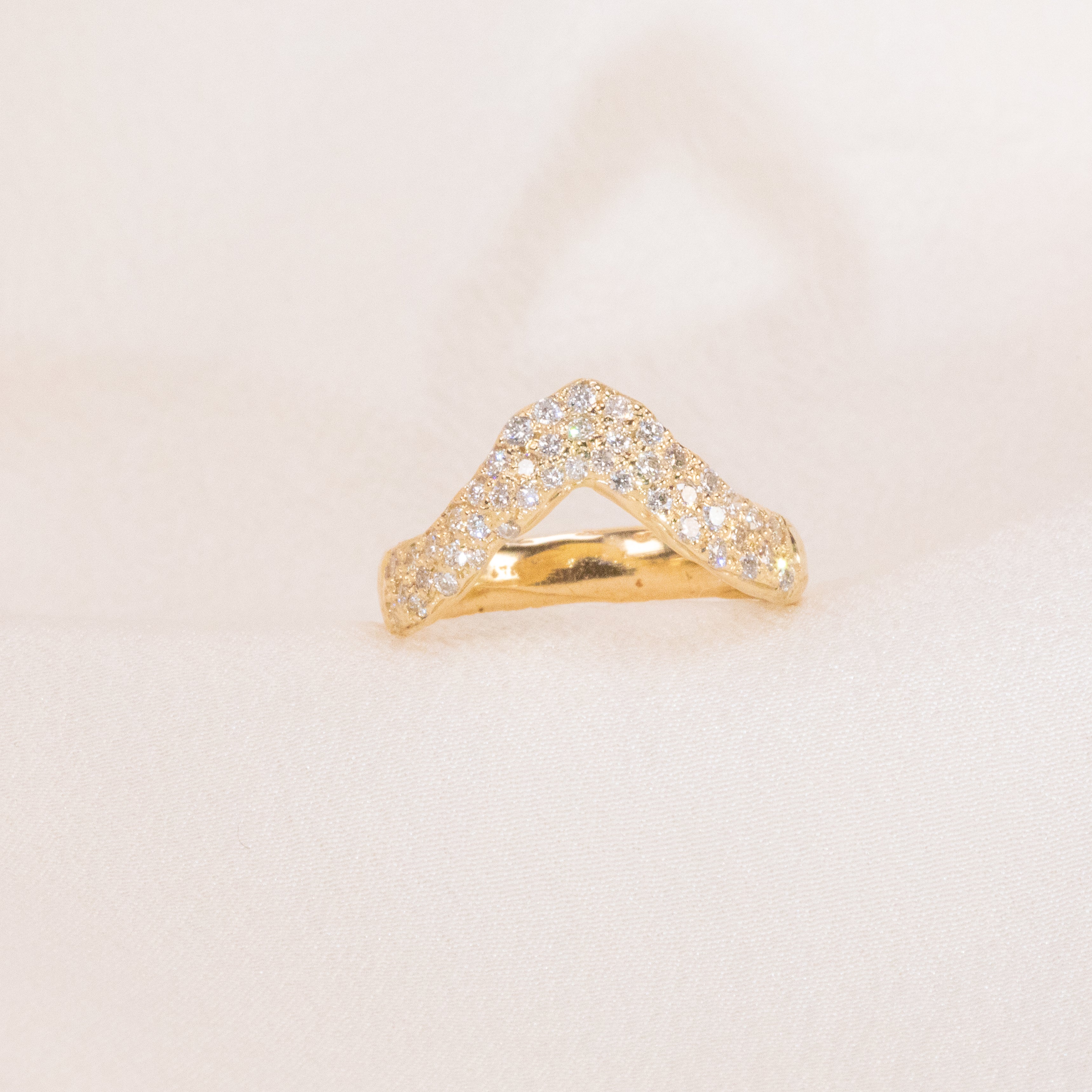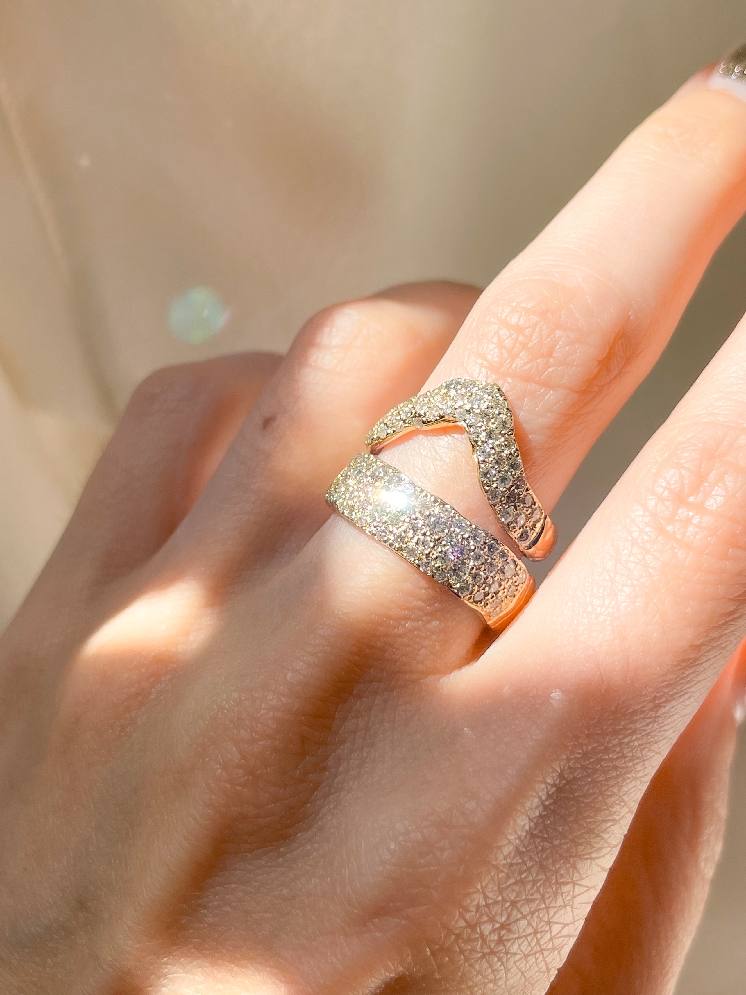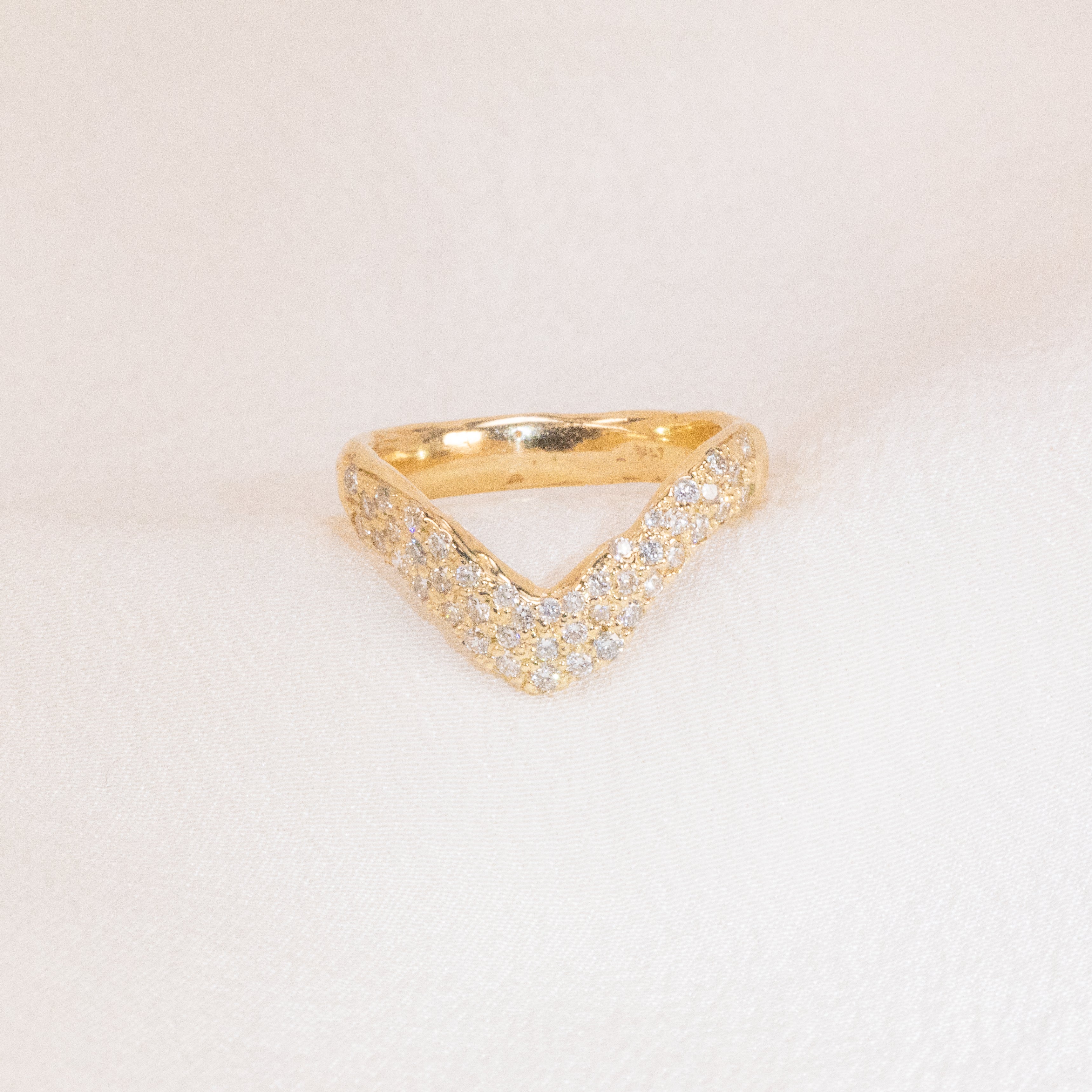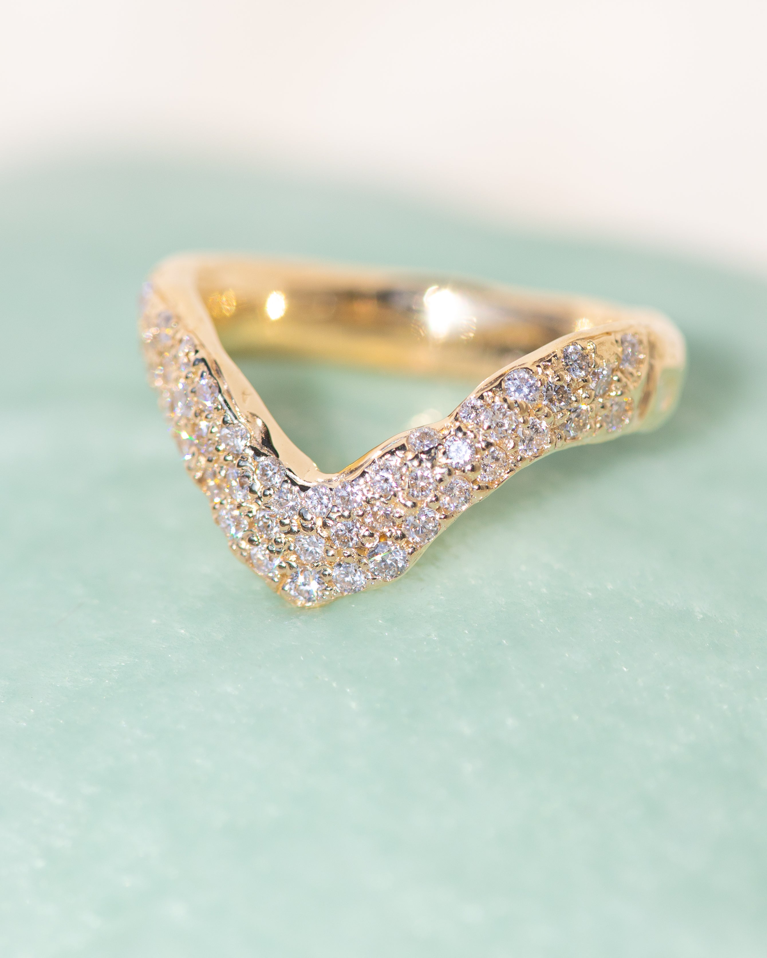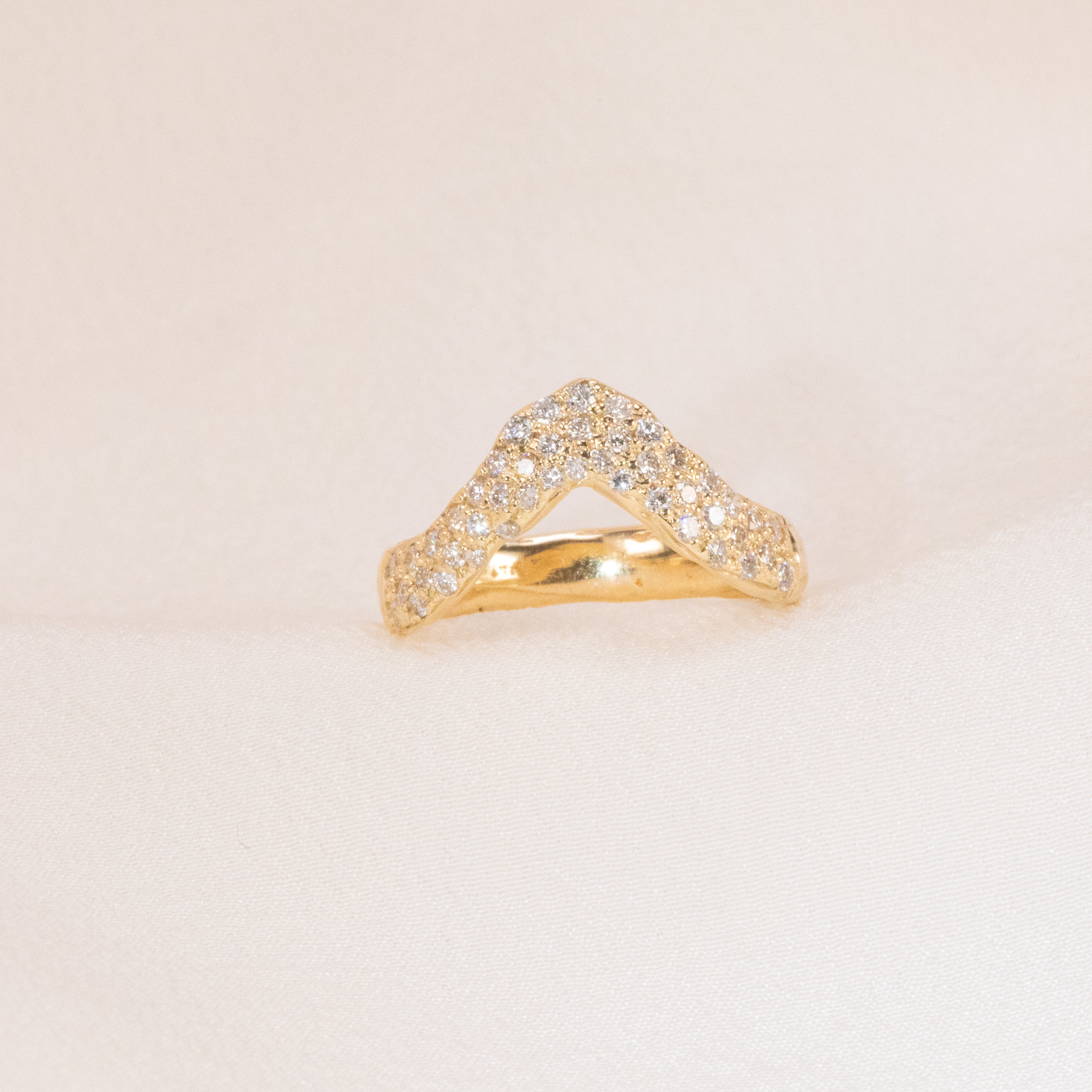 Hand-carved v-shaped band available in 14k Yellow, White, or Rose Gold, set with an incredible, shimmering disco party of 45 White Diamonds.