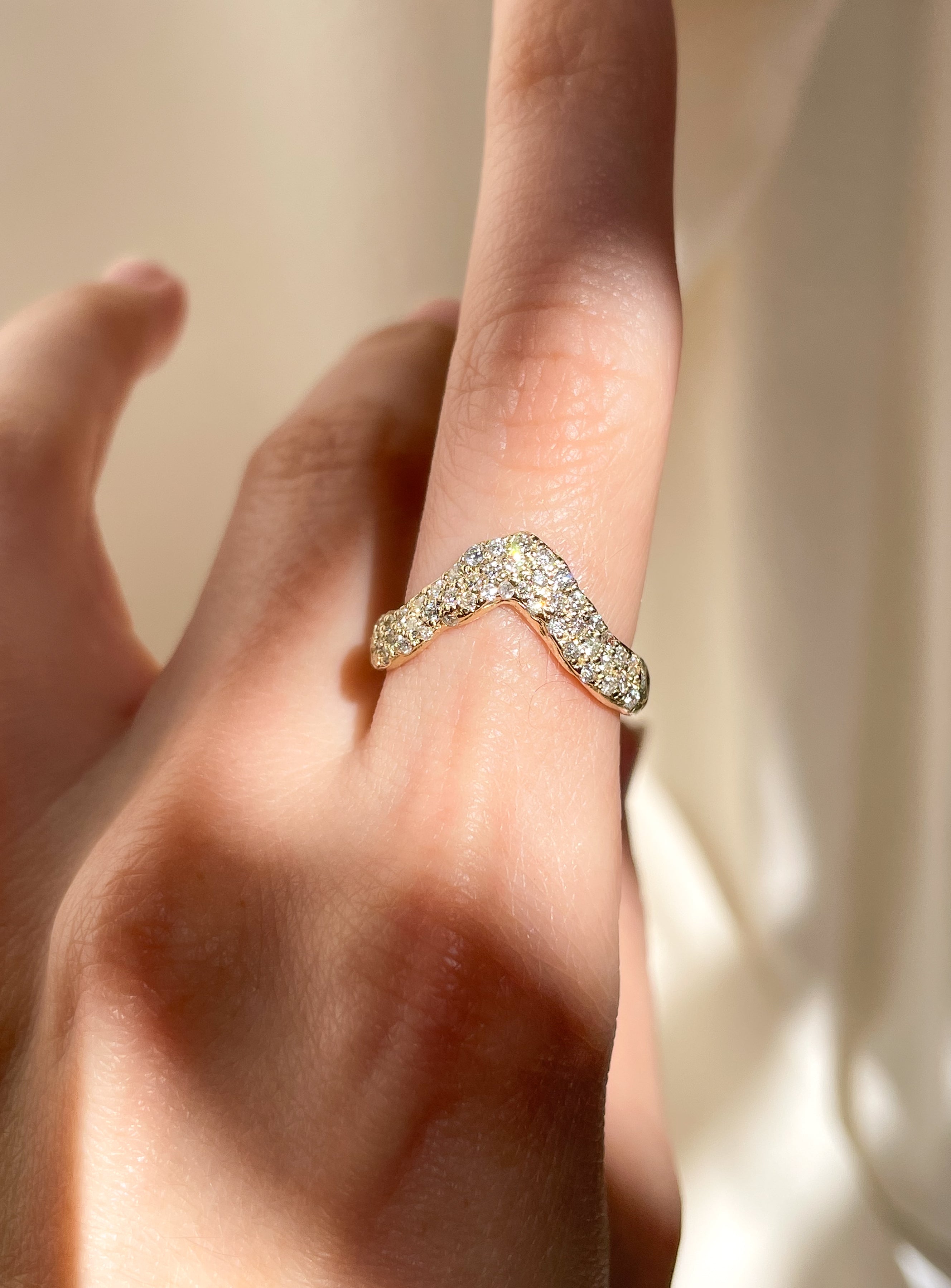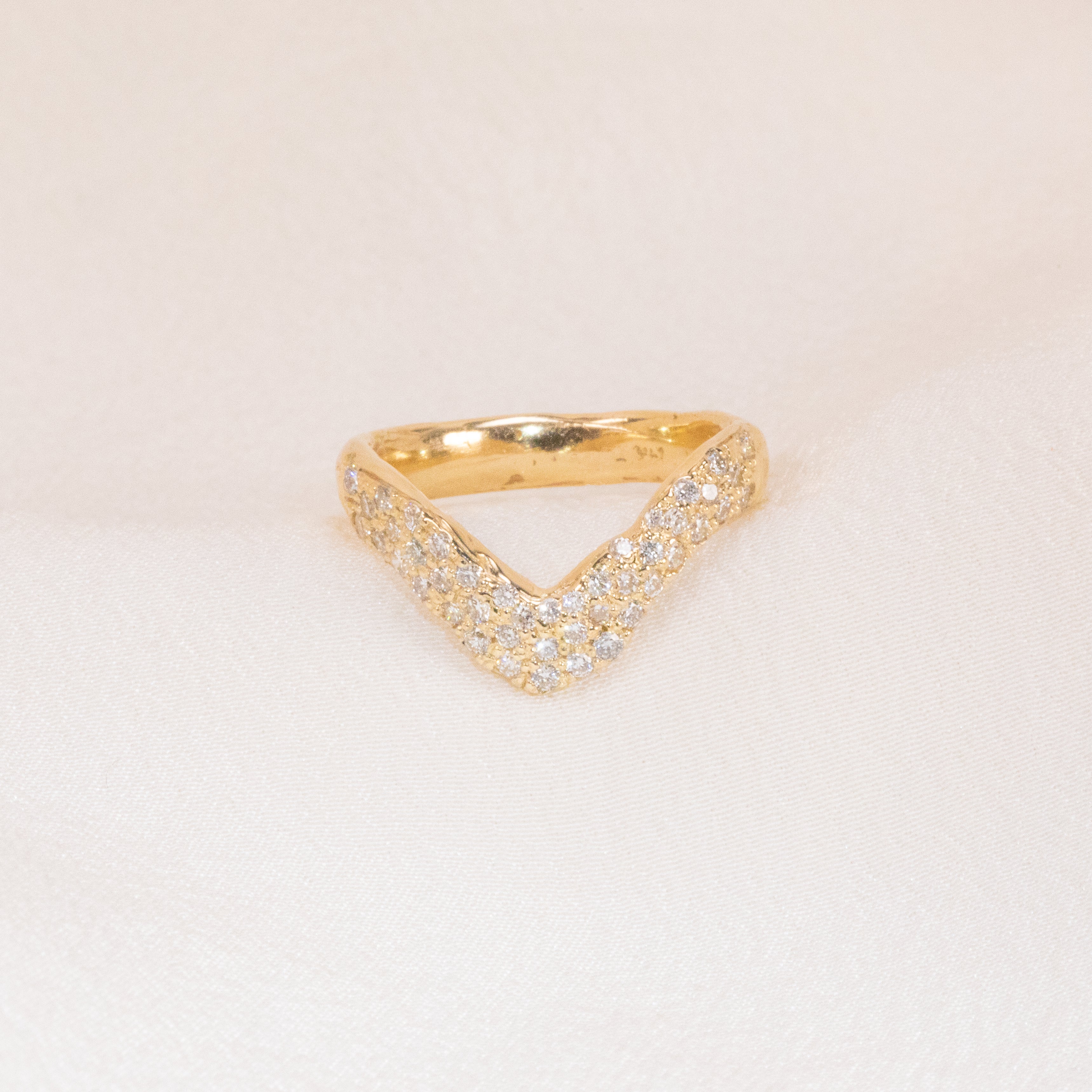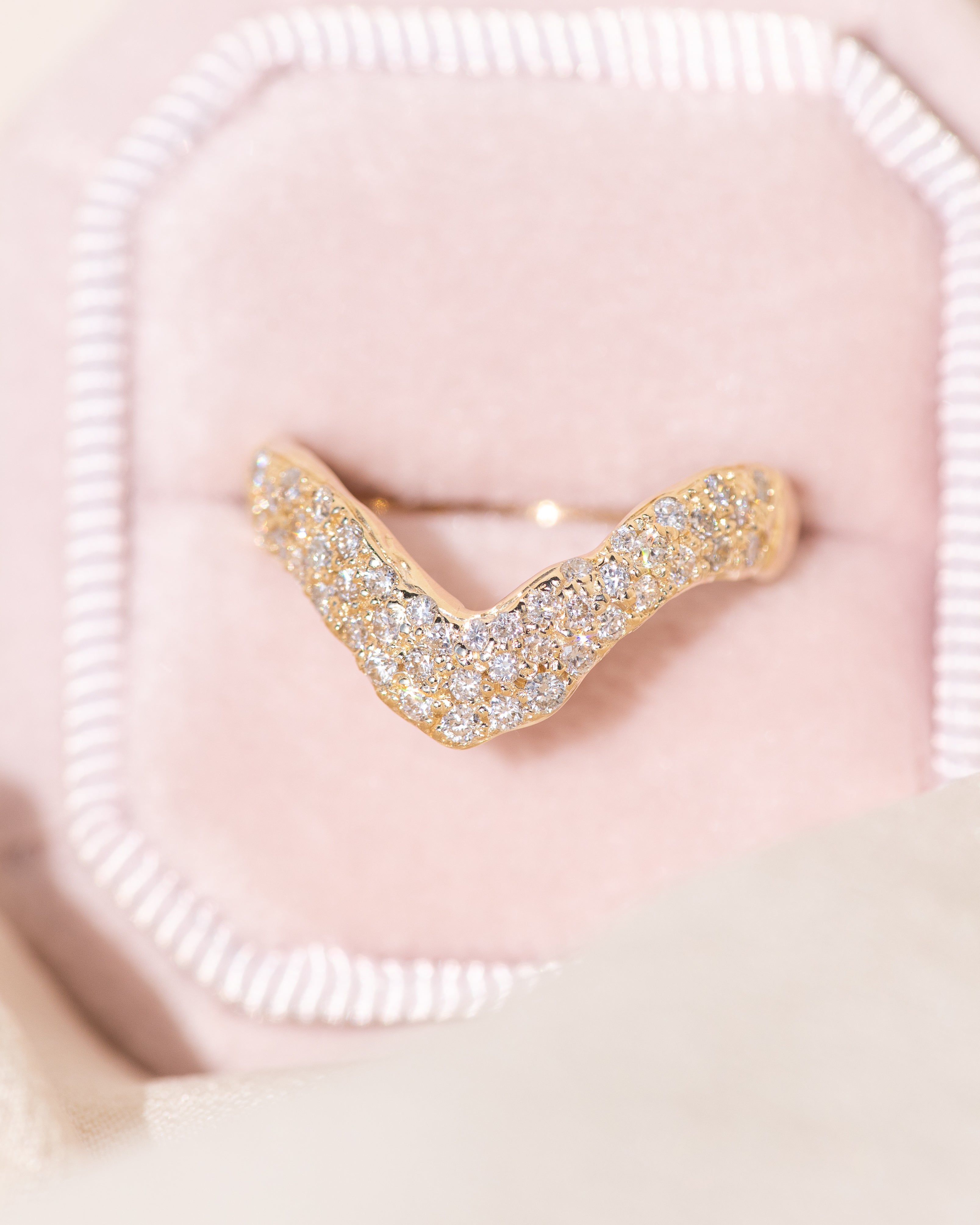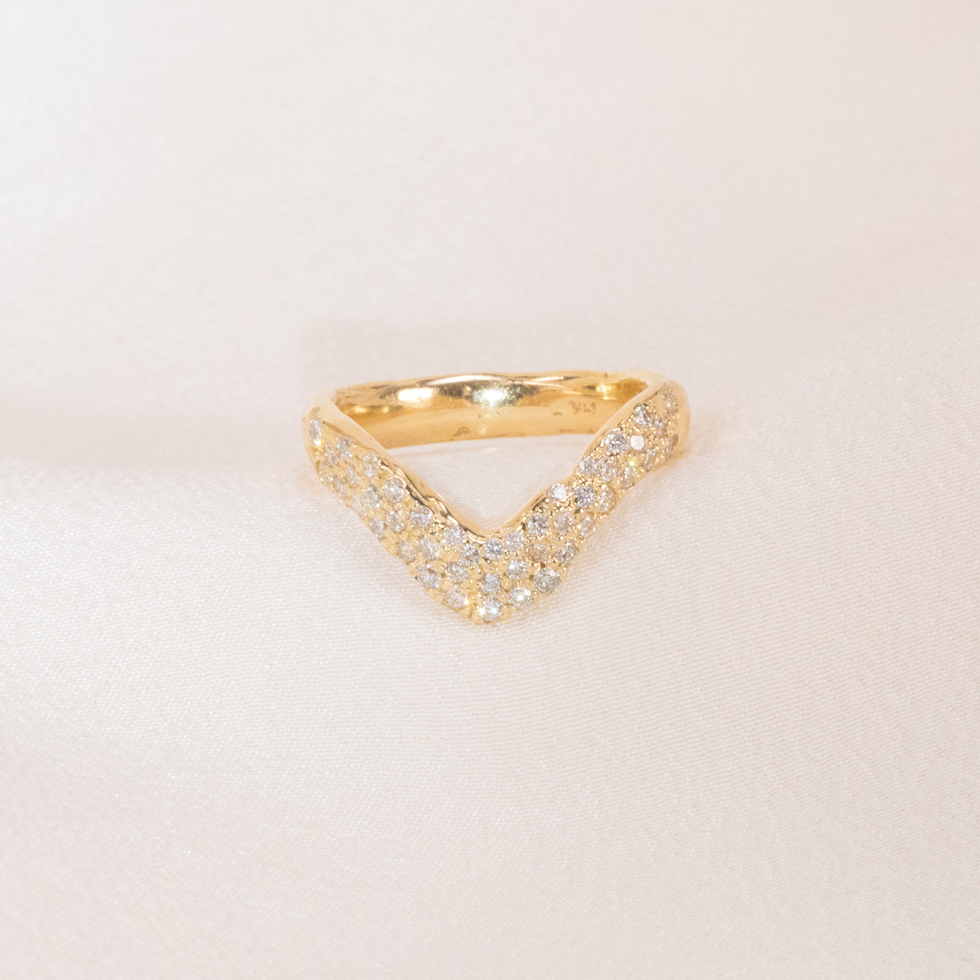 Hand-carved v-shaped band available in 14k Yellow, White, or Rose Gold, set with an incredible, shimmering disco party of 45 White Diamonds.