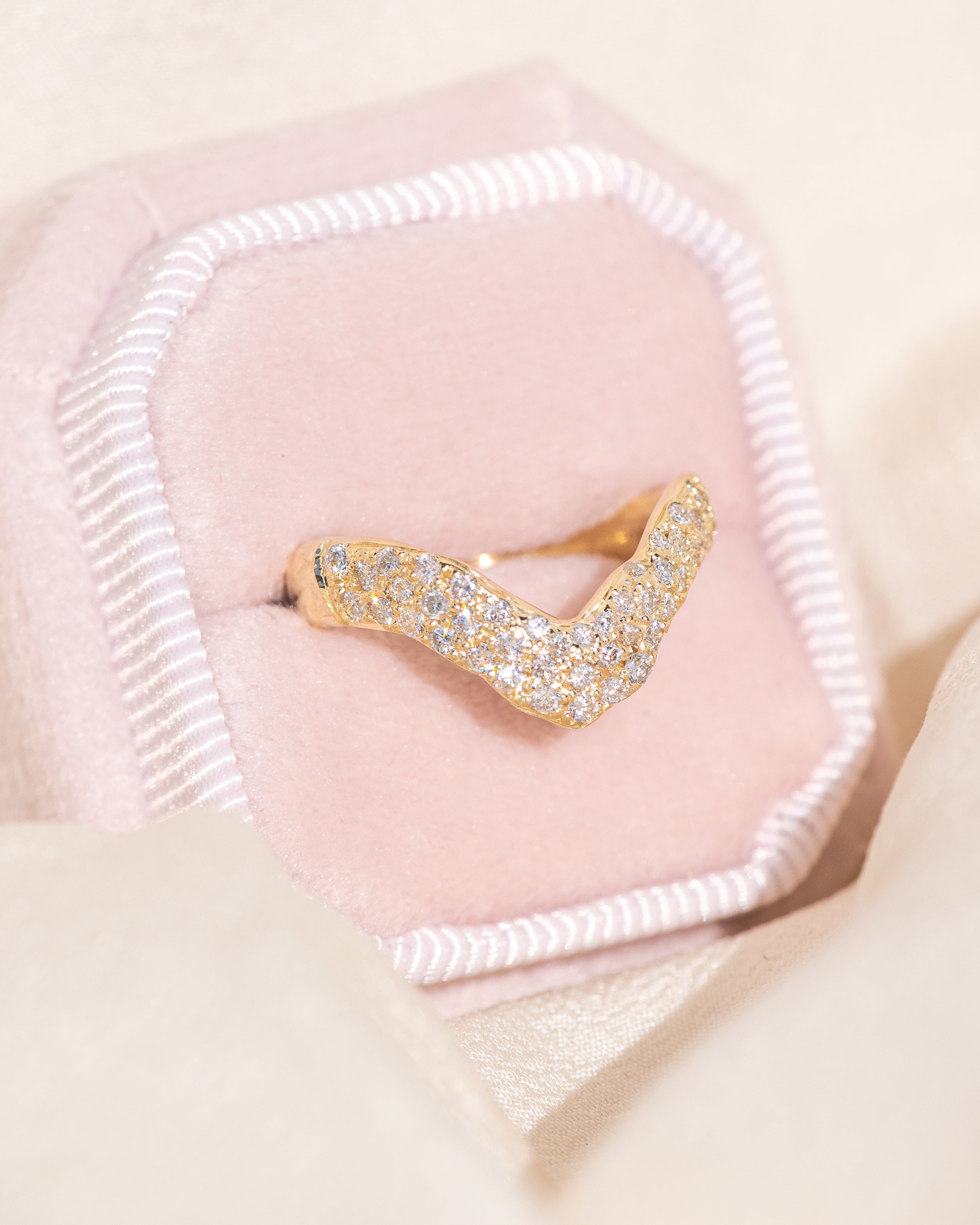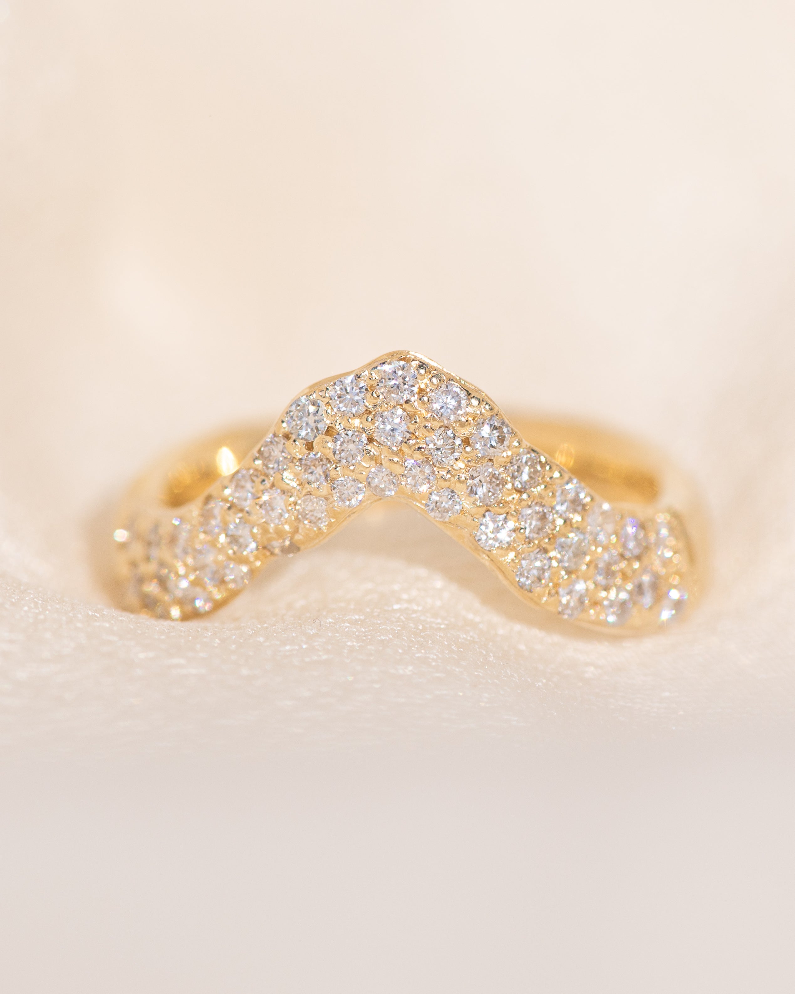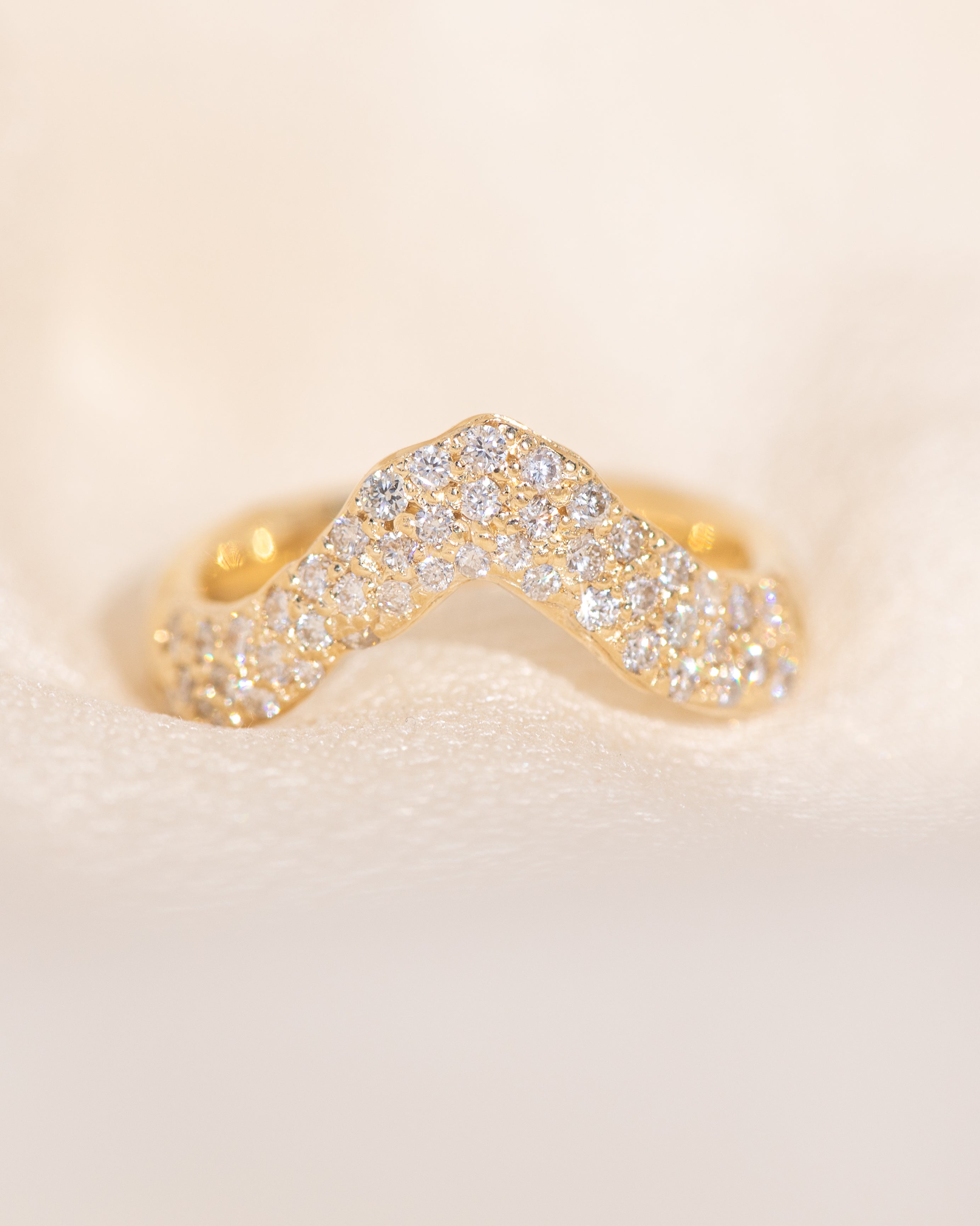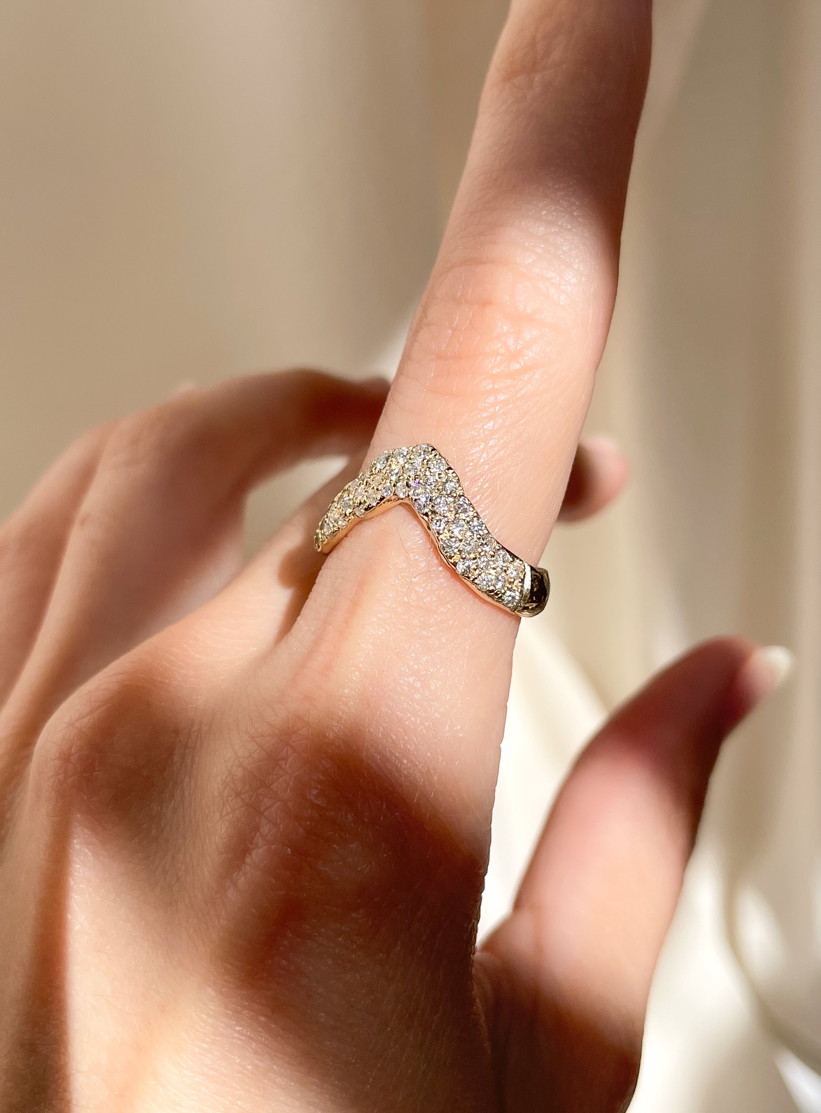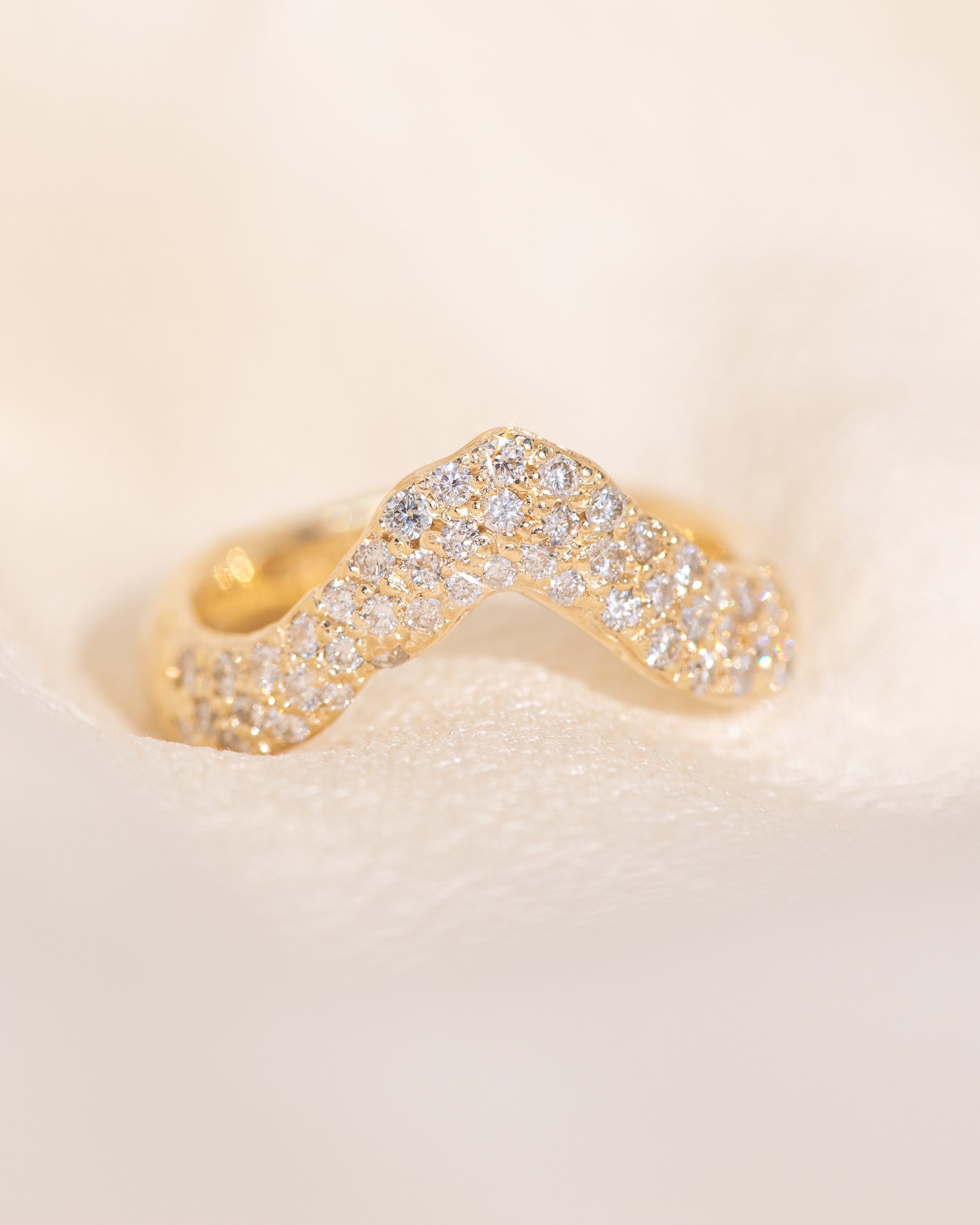 Hand-carved v-shaped band available in 14k Yellow, White, or Rose Gold, set with an incredible, shimmering disco party of 45 White Diamonds.