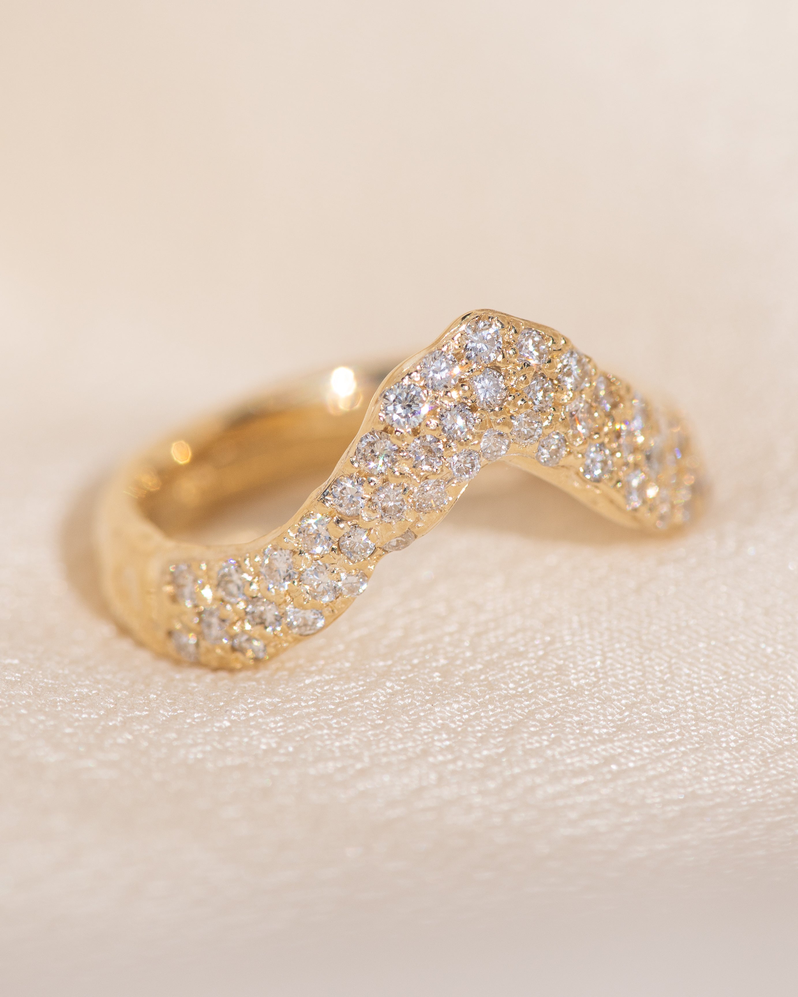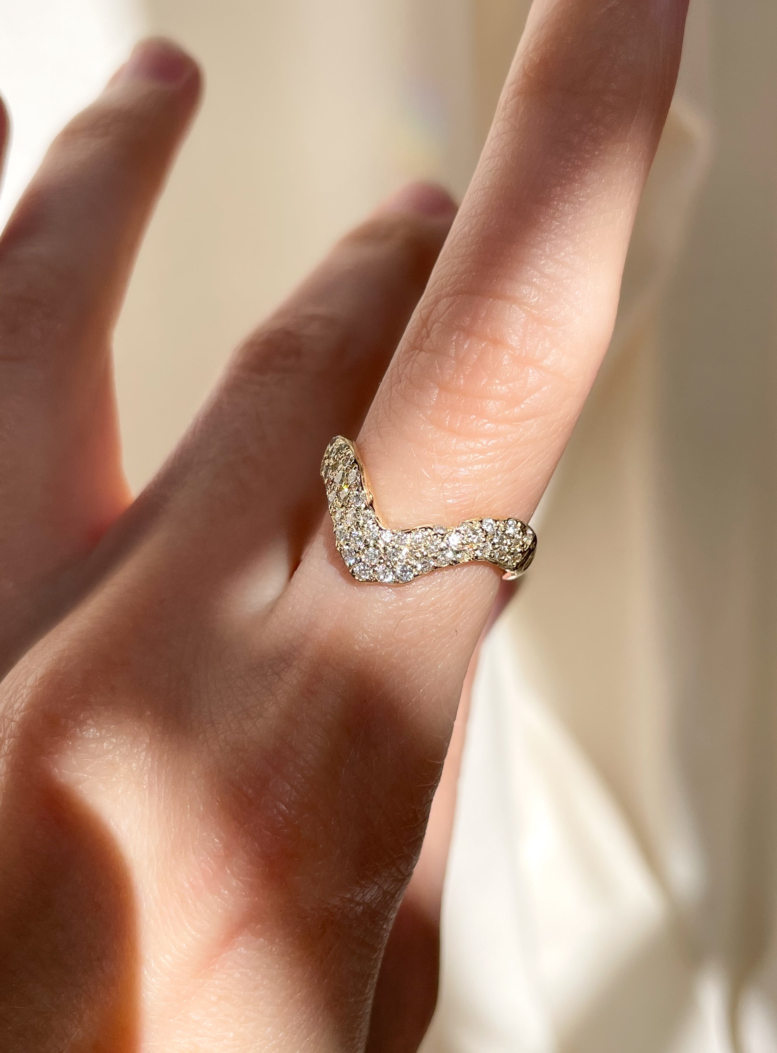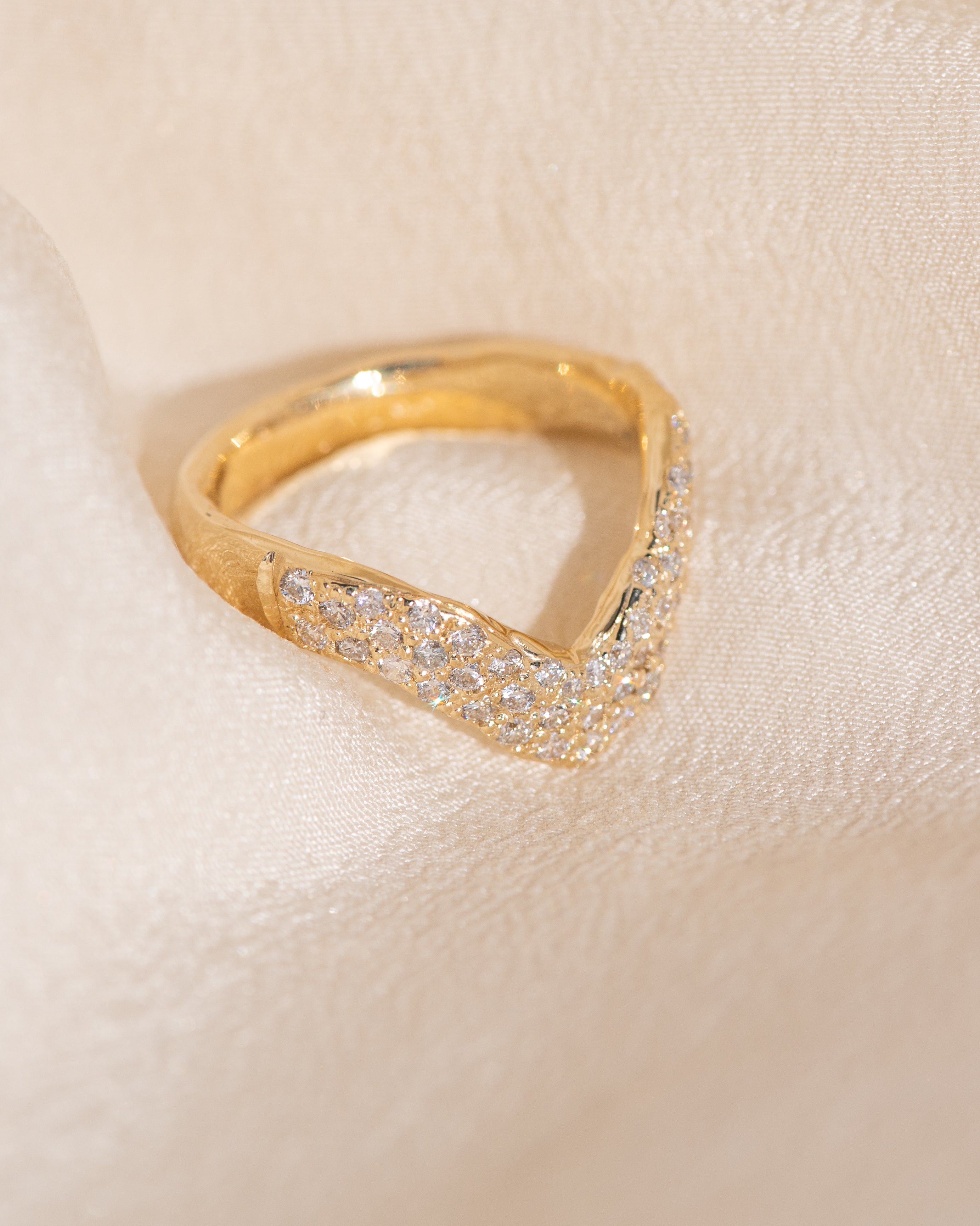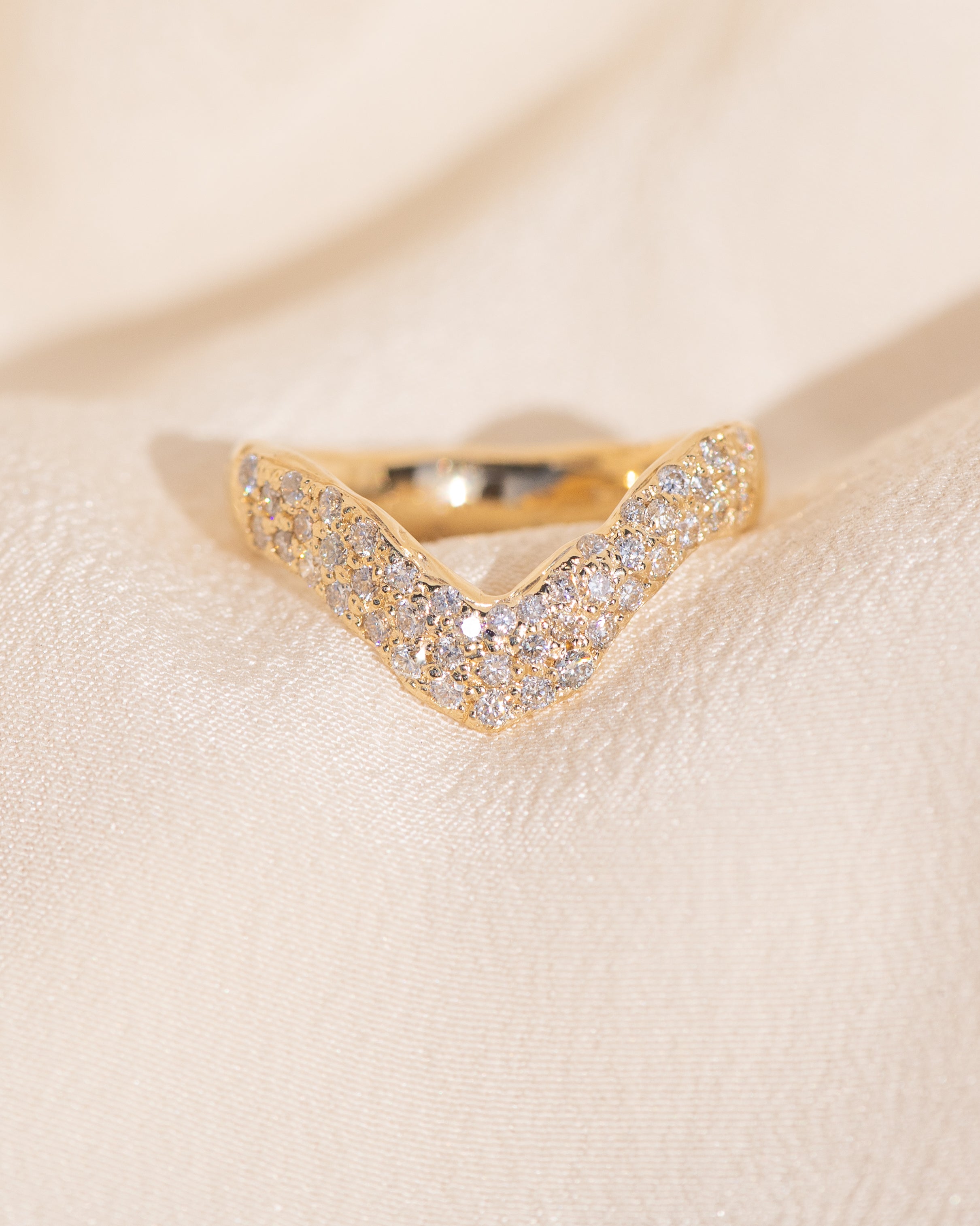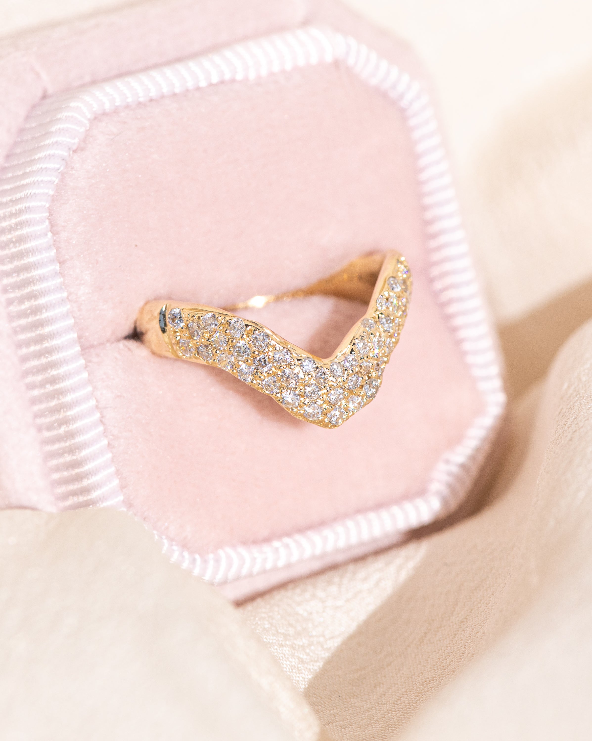 Hand-carved v-shaped band available in 14k Yellow, White, or Rose Gold, set with an incredible, shimmering disco party of 45 White Diamonds.