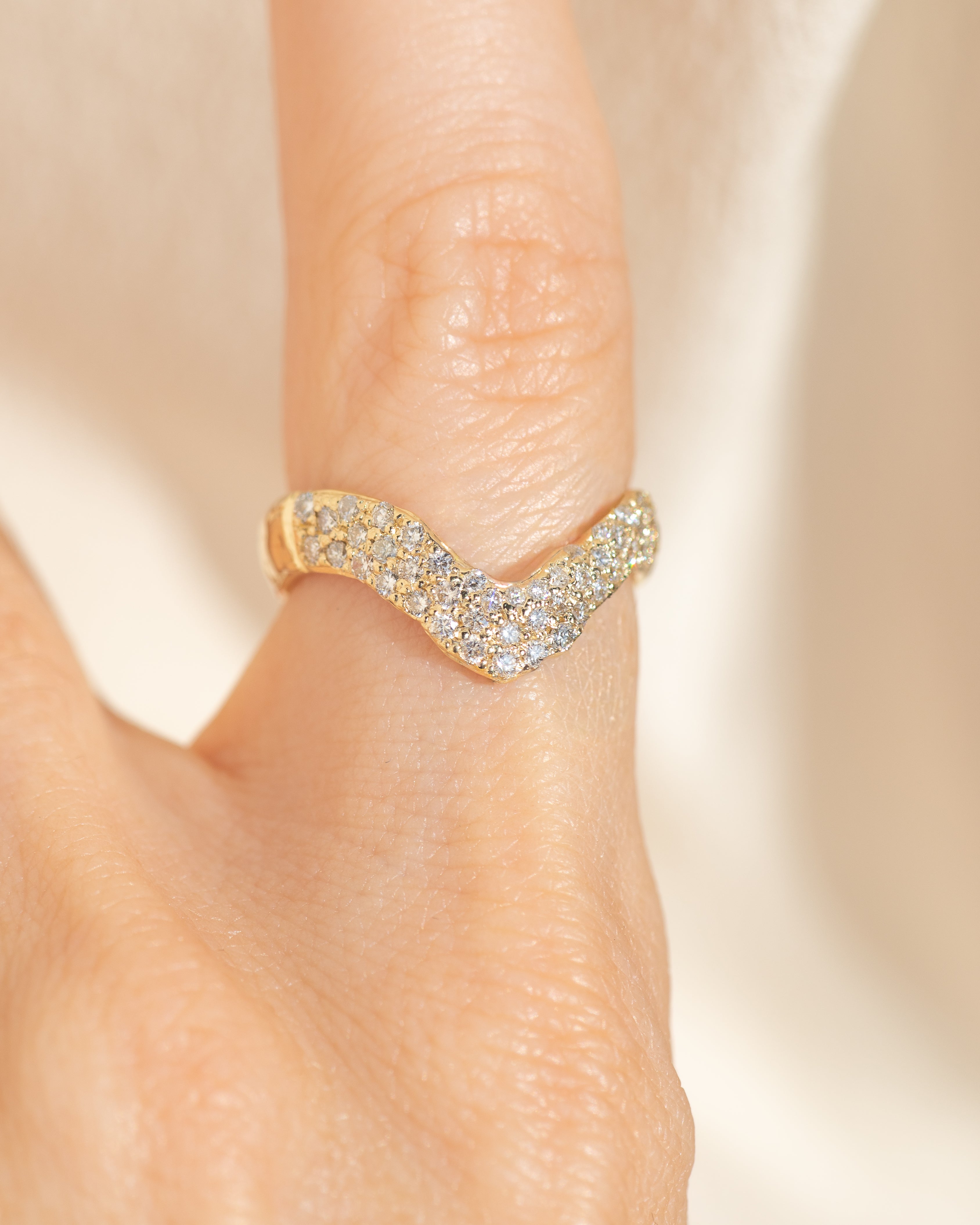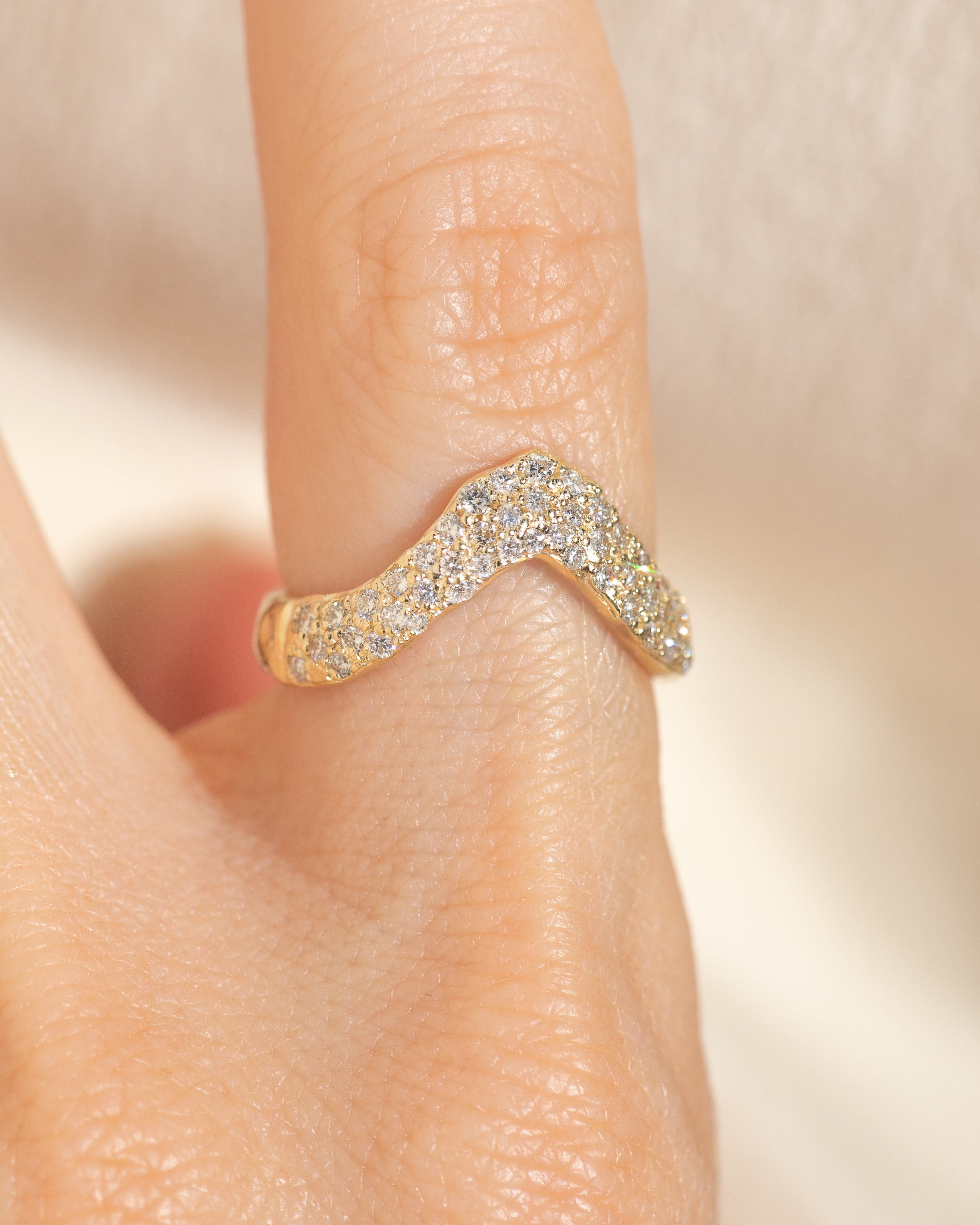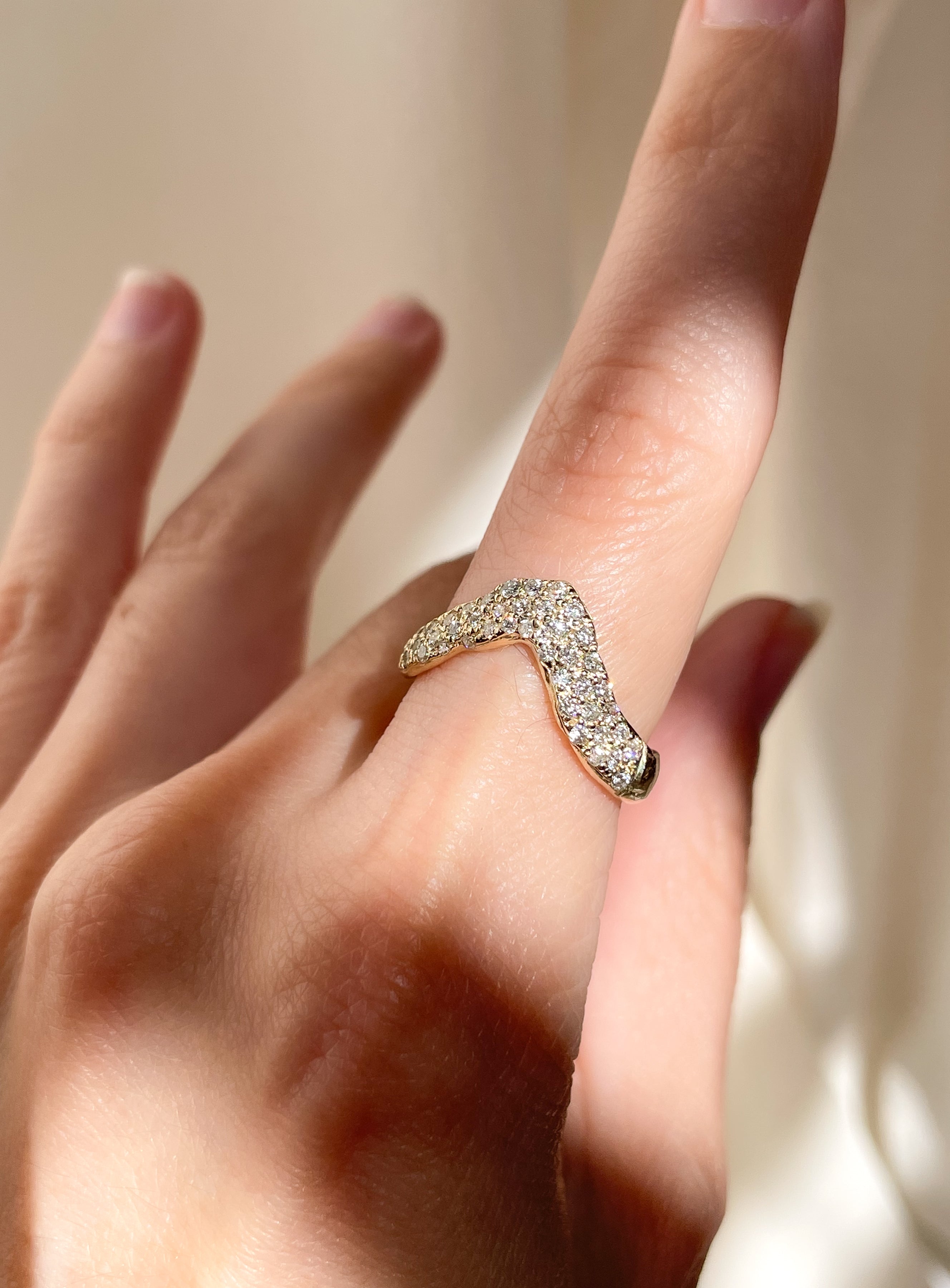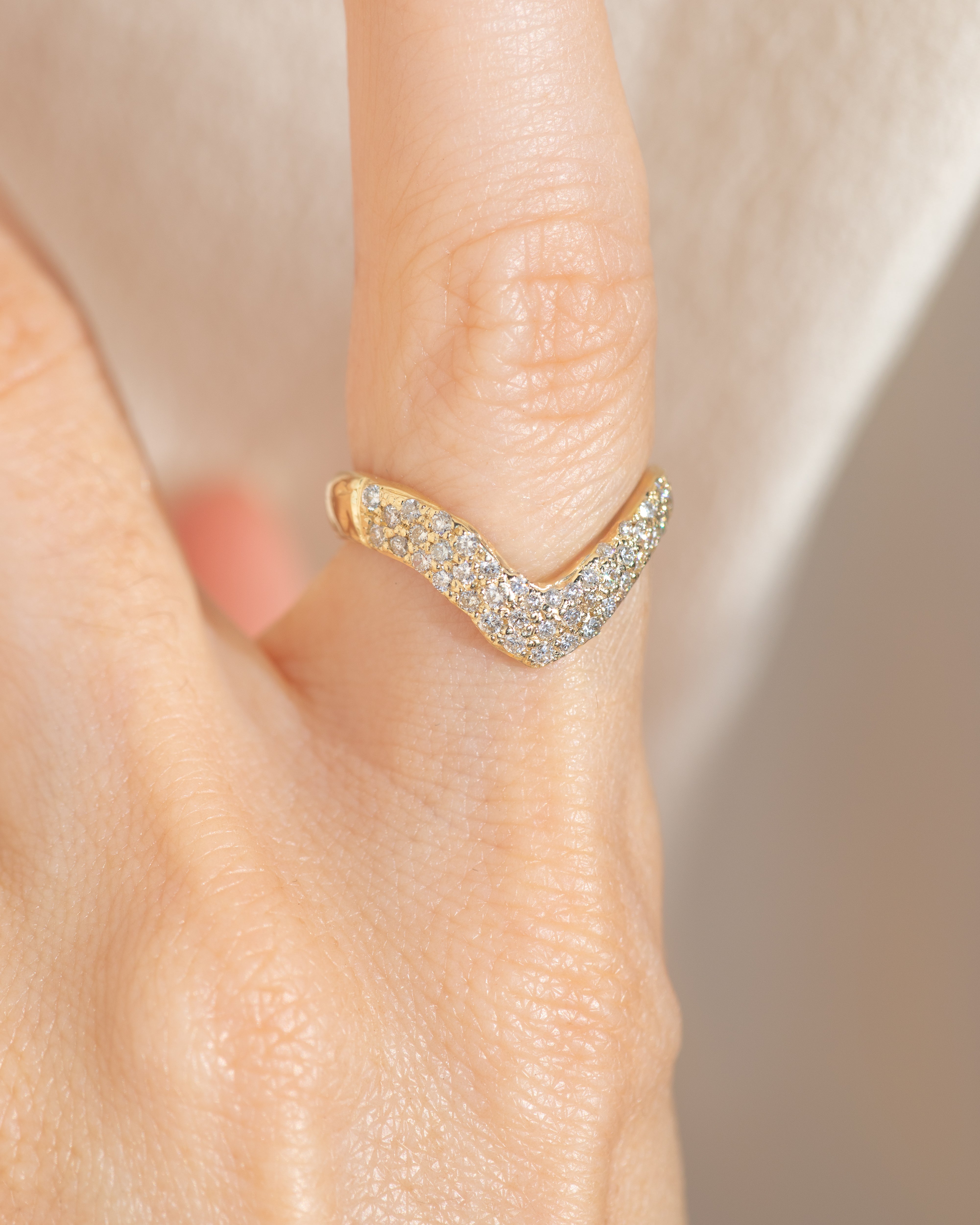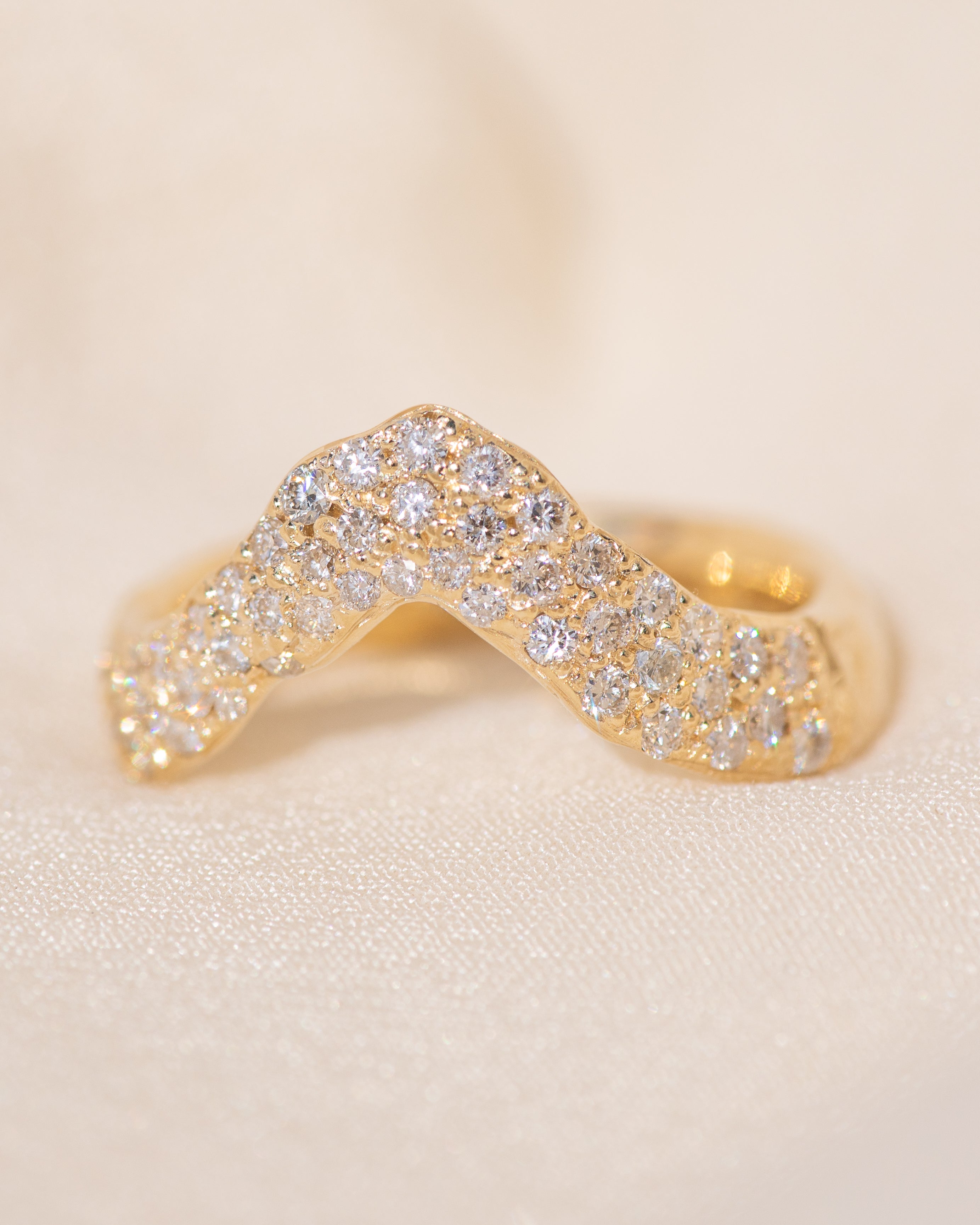 Hand-carved v-shaped band available in 14k Yellow, White, or Rose Gold, set with an incredible, shimmering disco party of 45 White Diamonds.