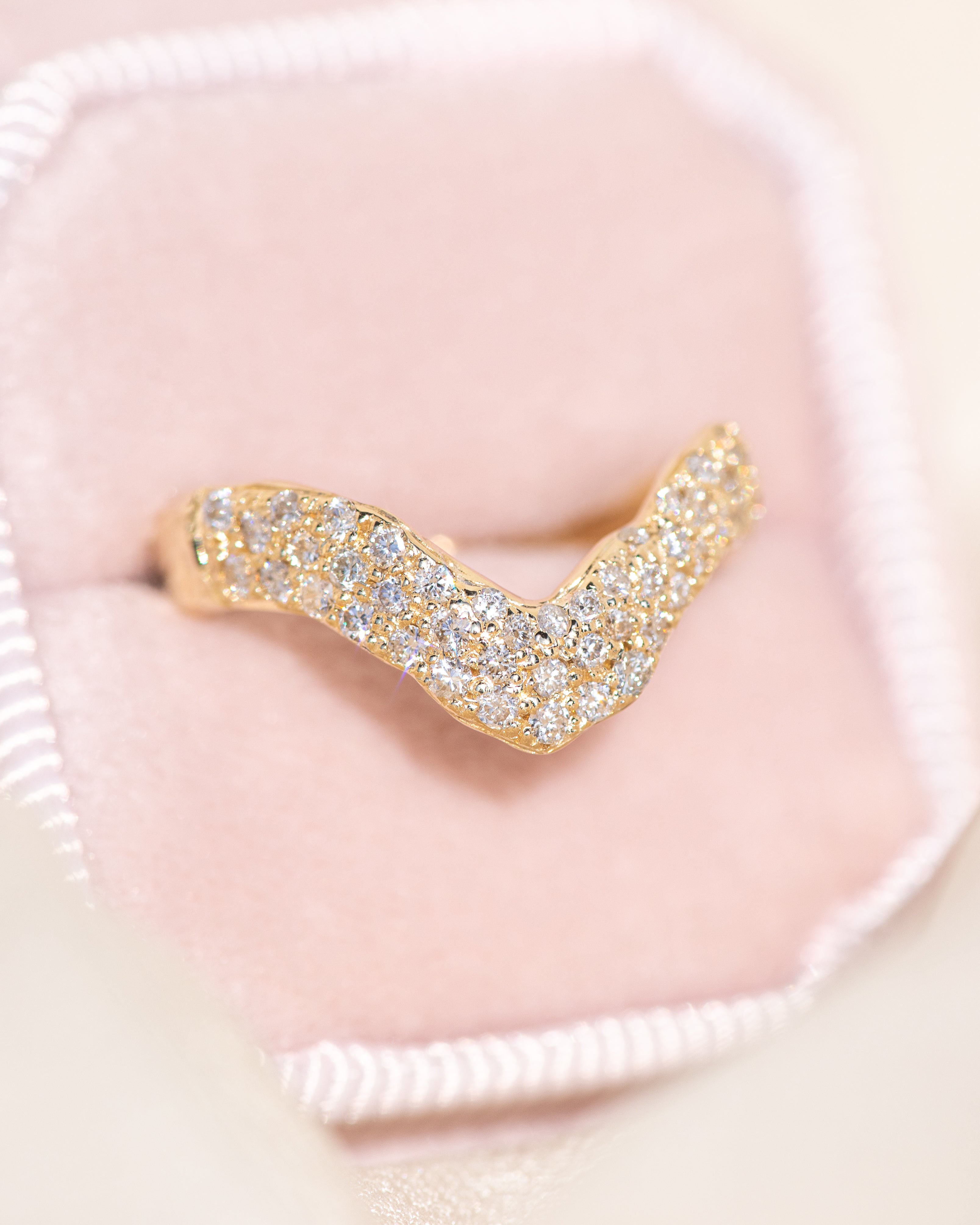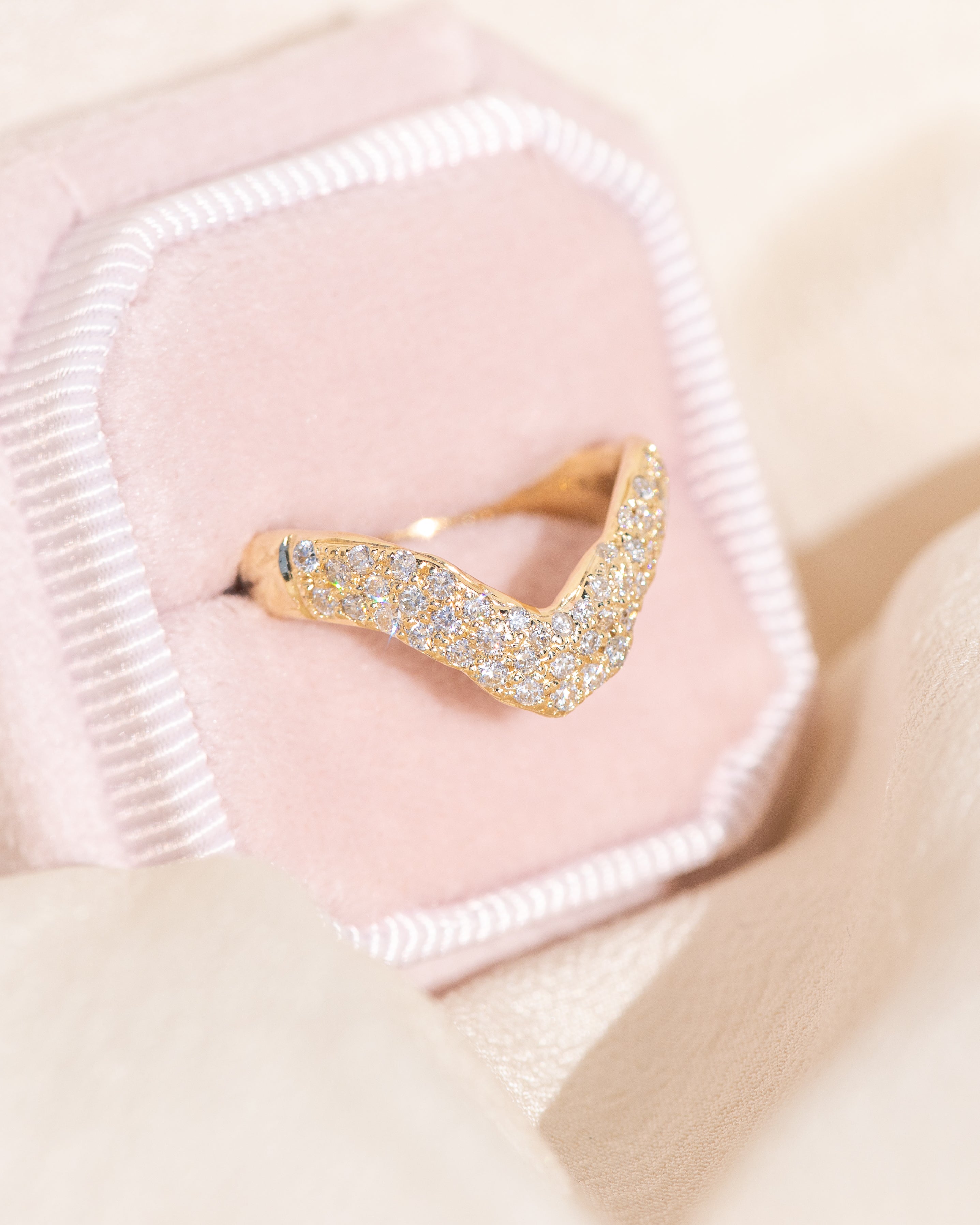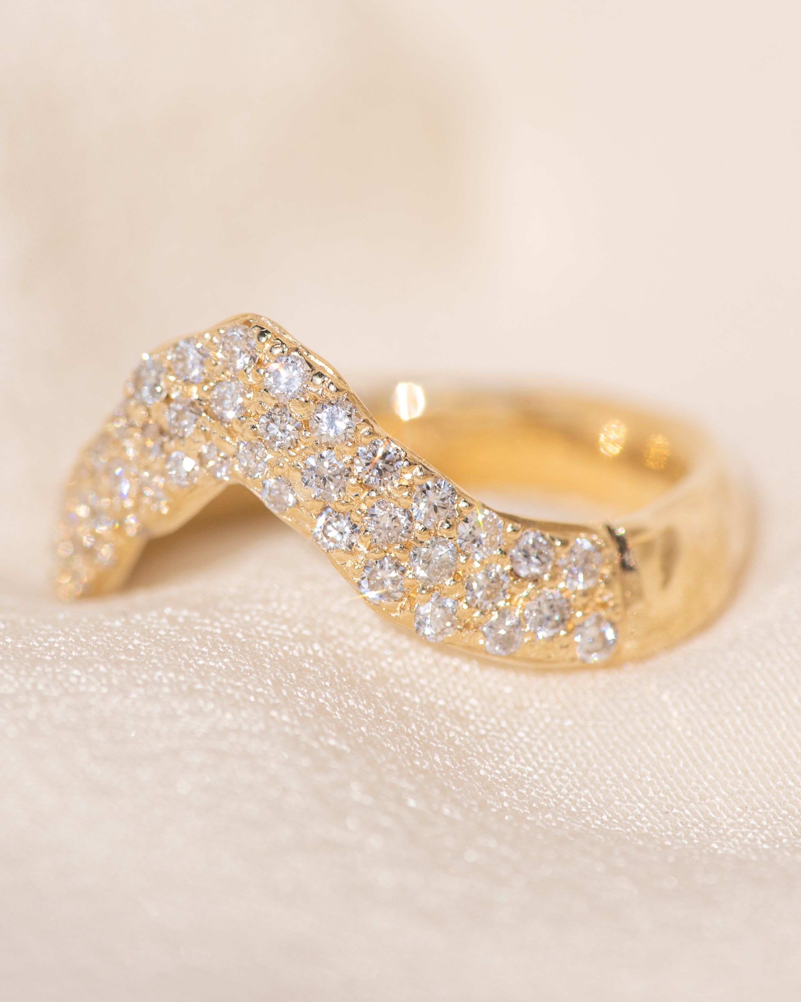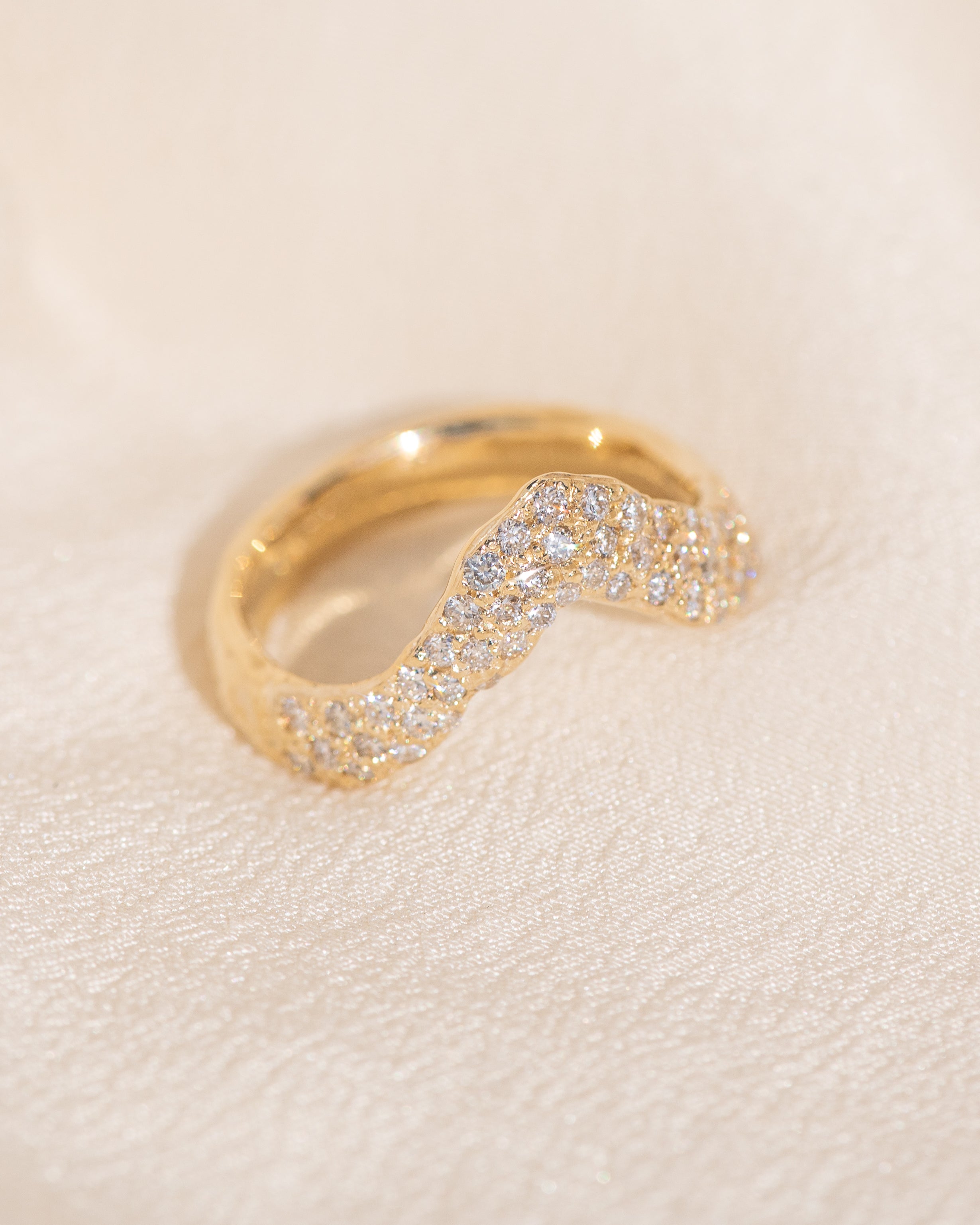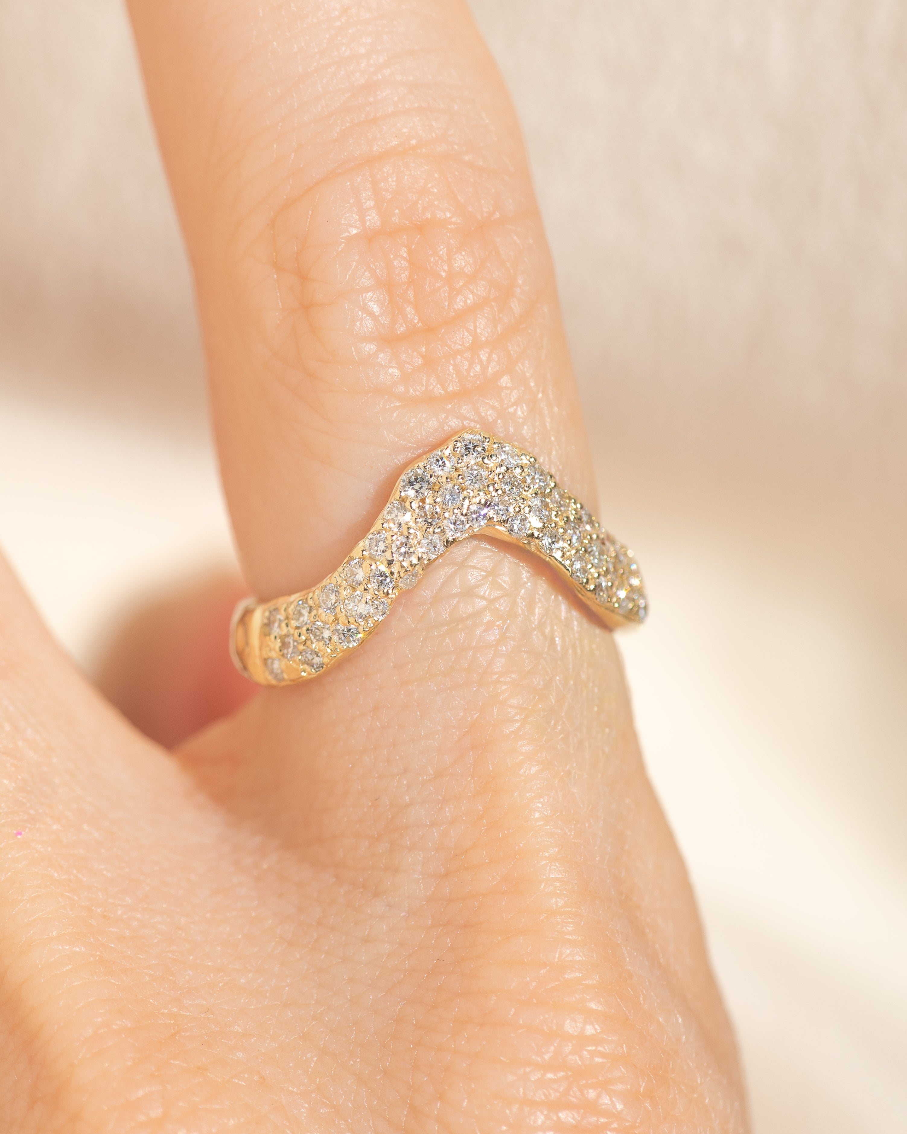 Hand-carved v-shaped band available in 14k Yellow, White, or Rose Gold, set with an incredible, shimmering disco party of 45 White Diamonds.