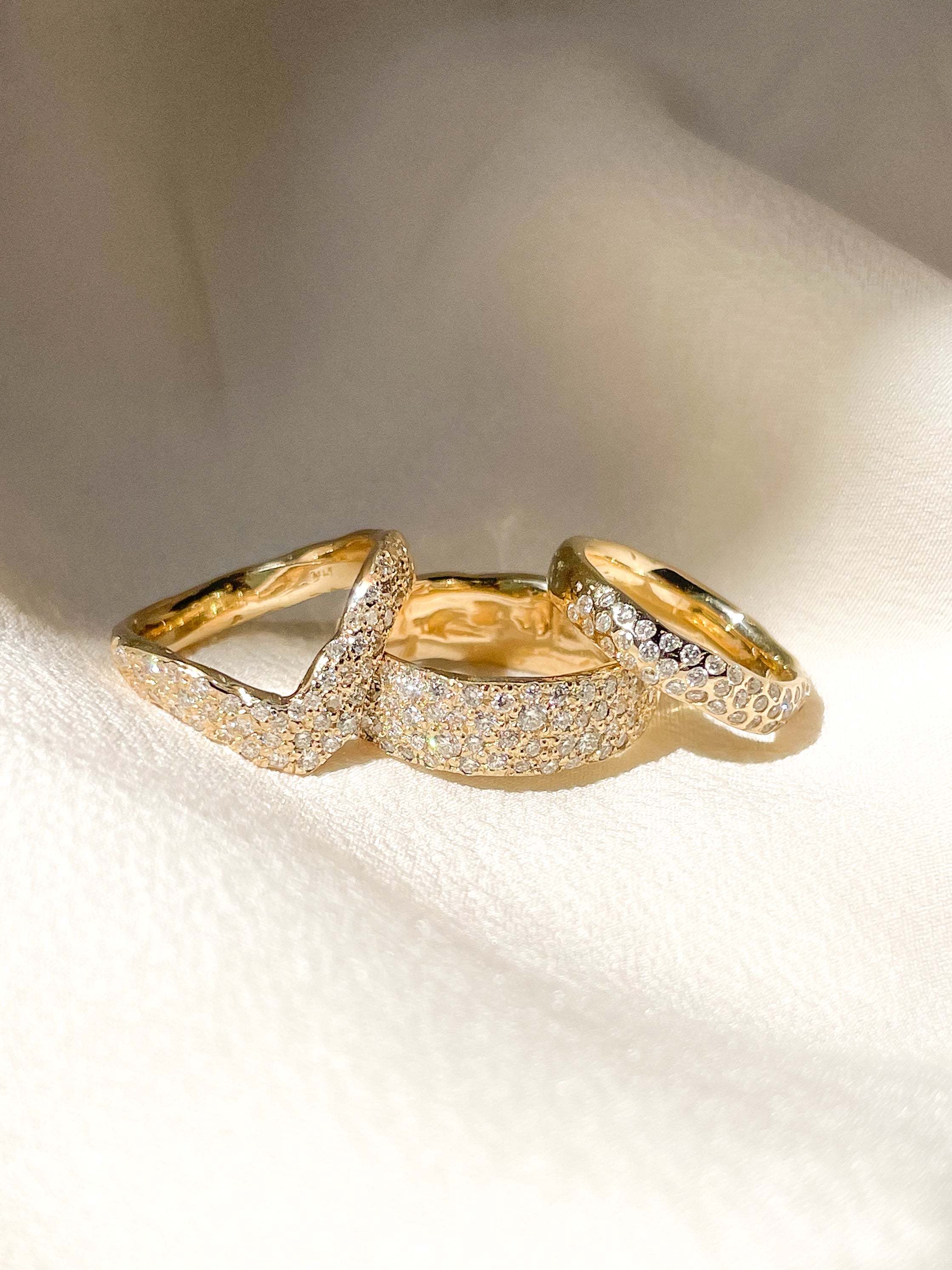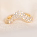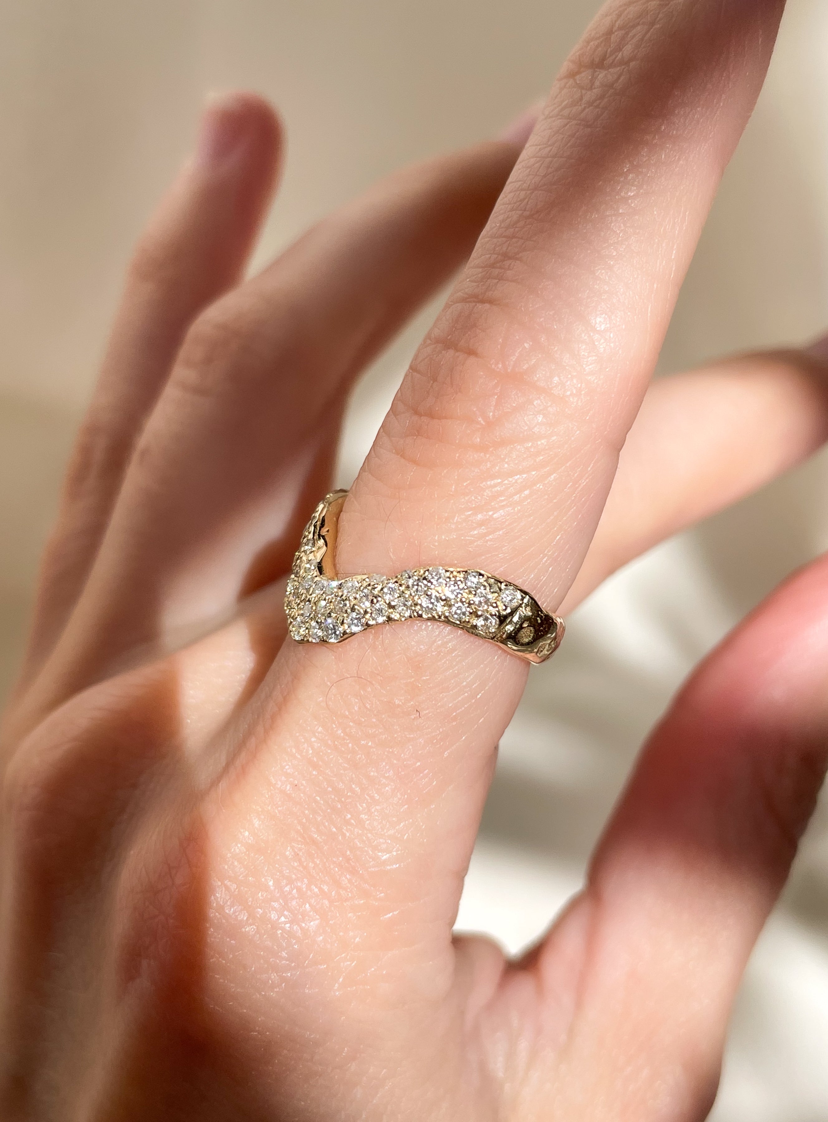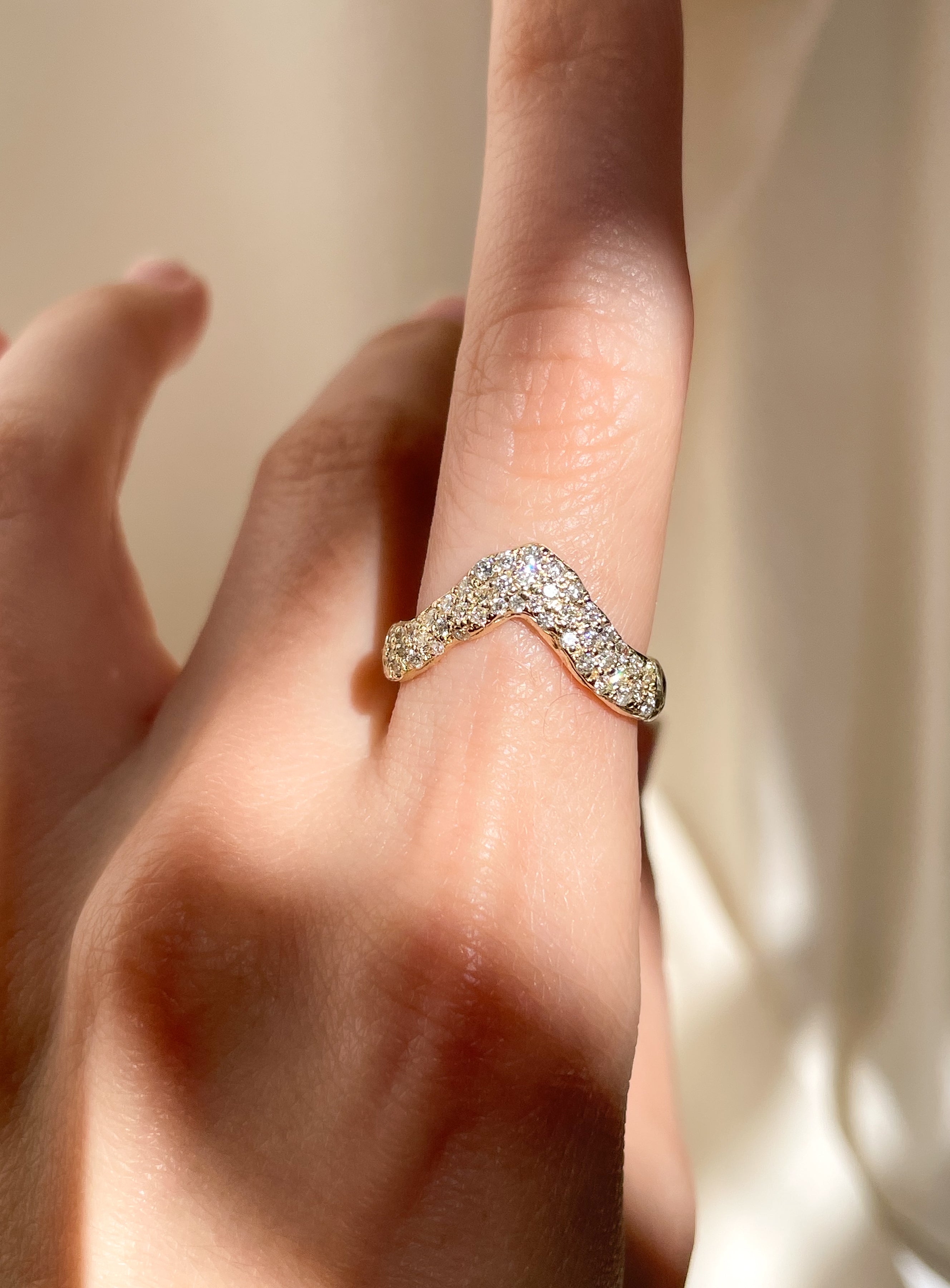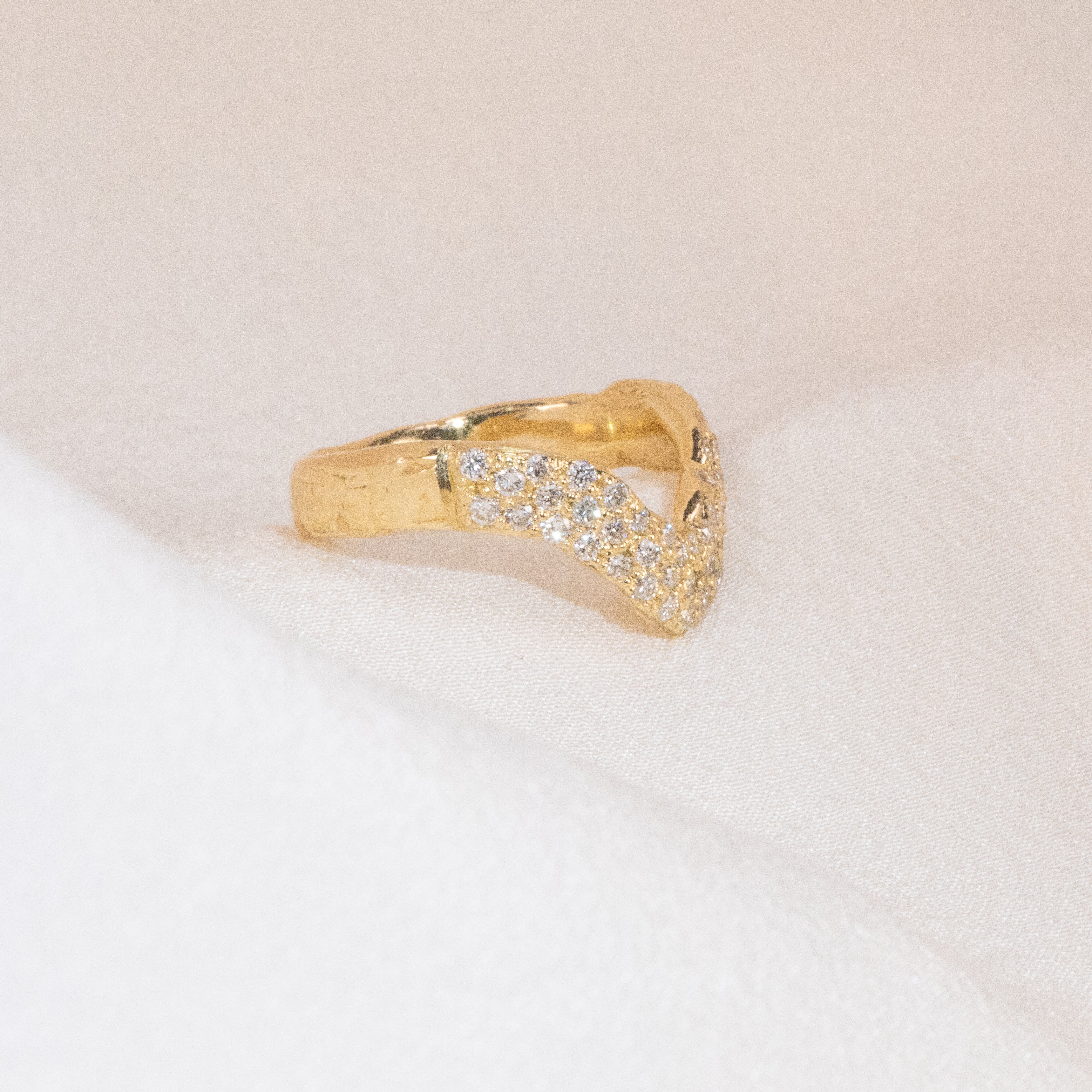 Hand-carved v-shaped band available in 14k Yellow, White, or Rose Gold, set with an incredible, shimmering disco party of 45 White Diamonds.