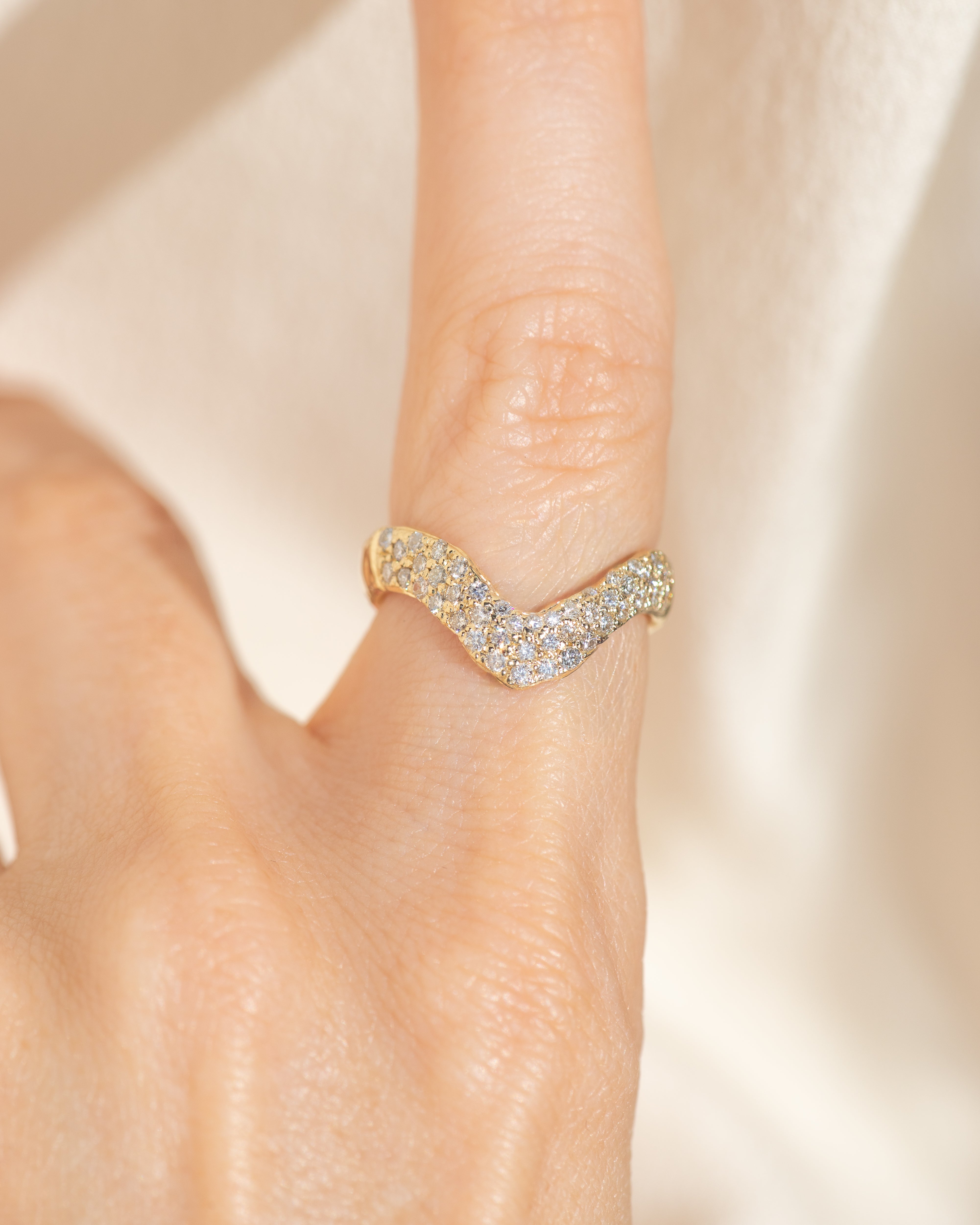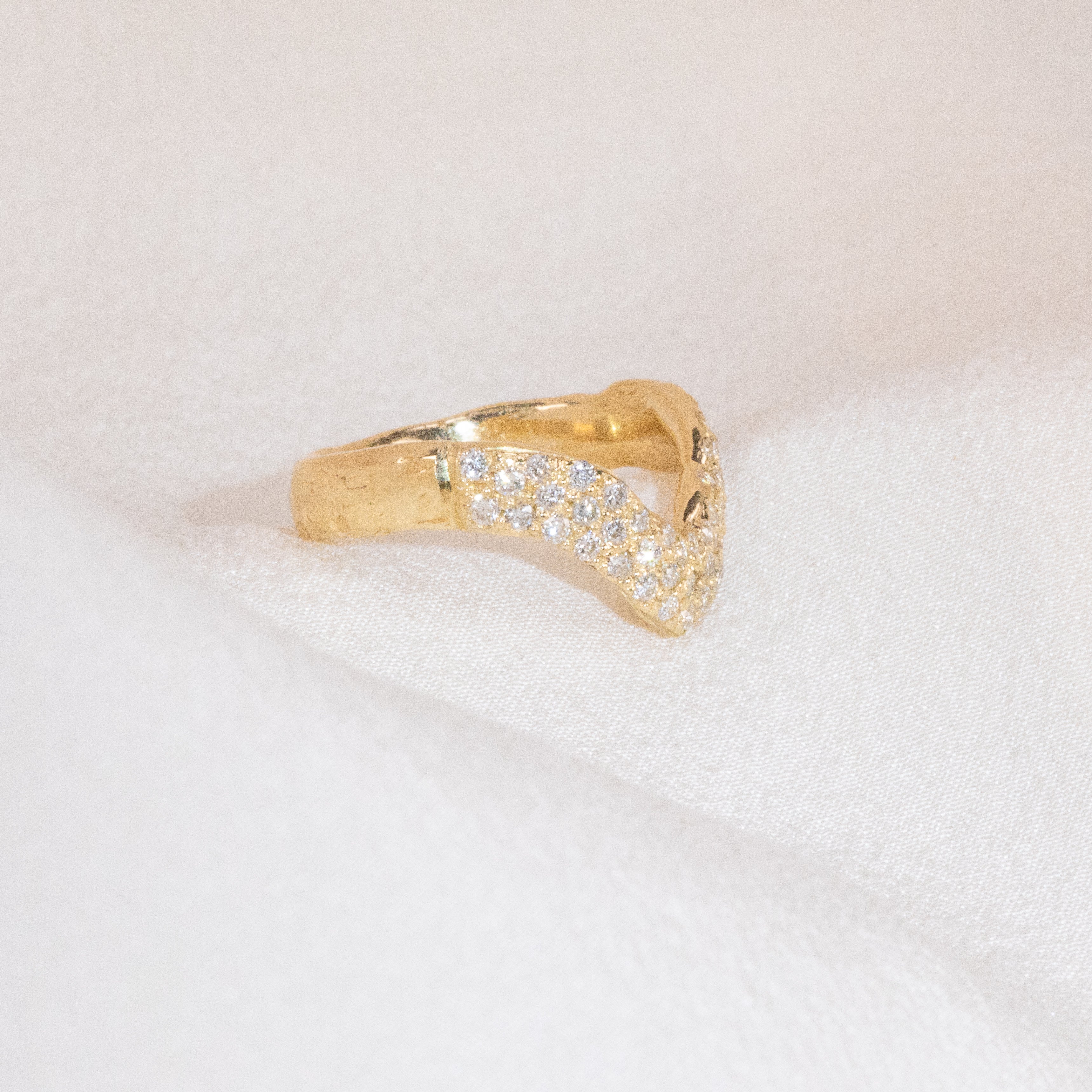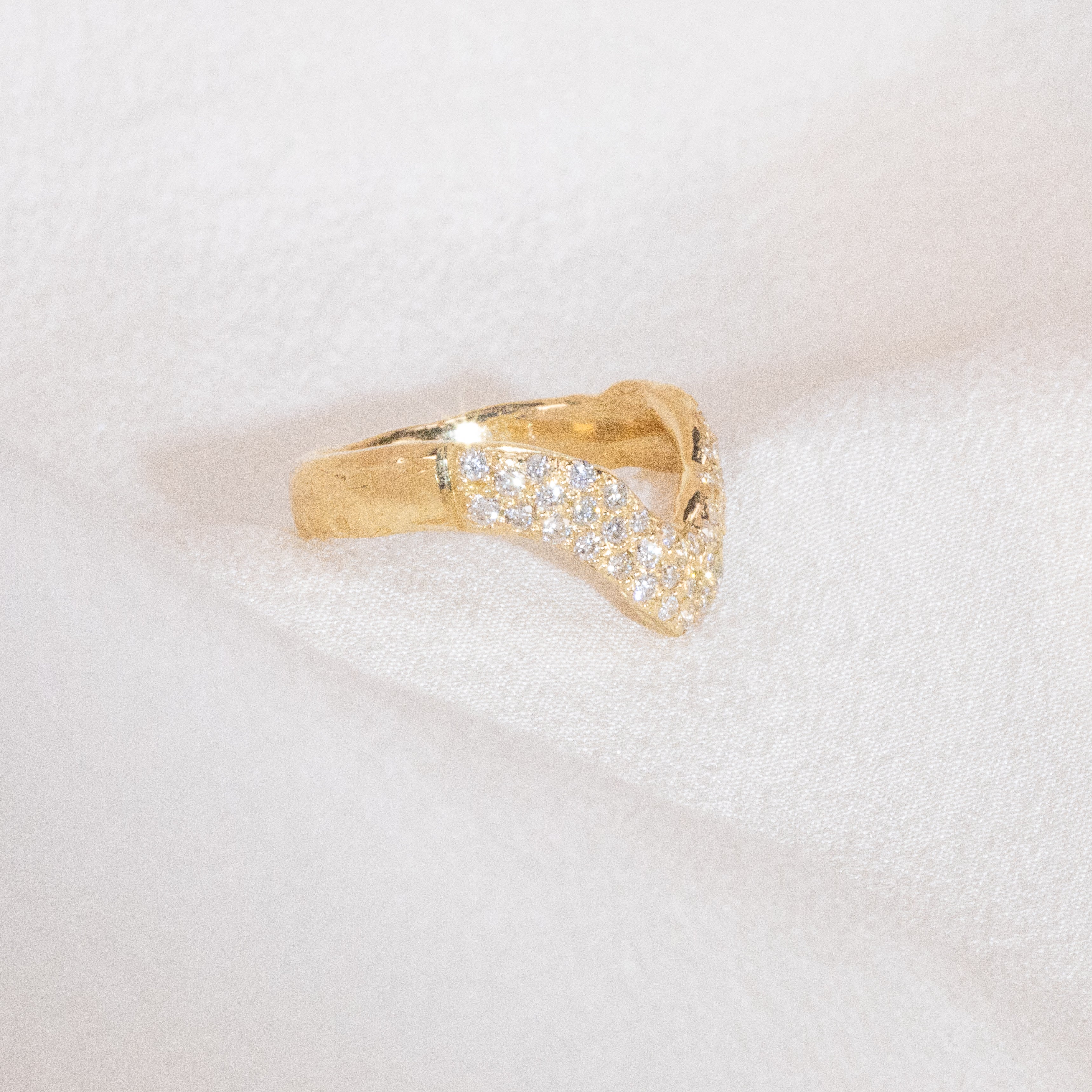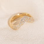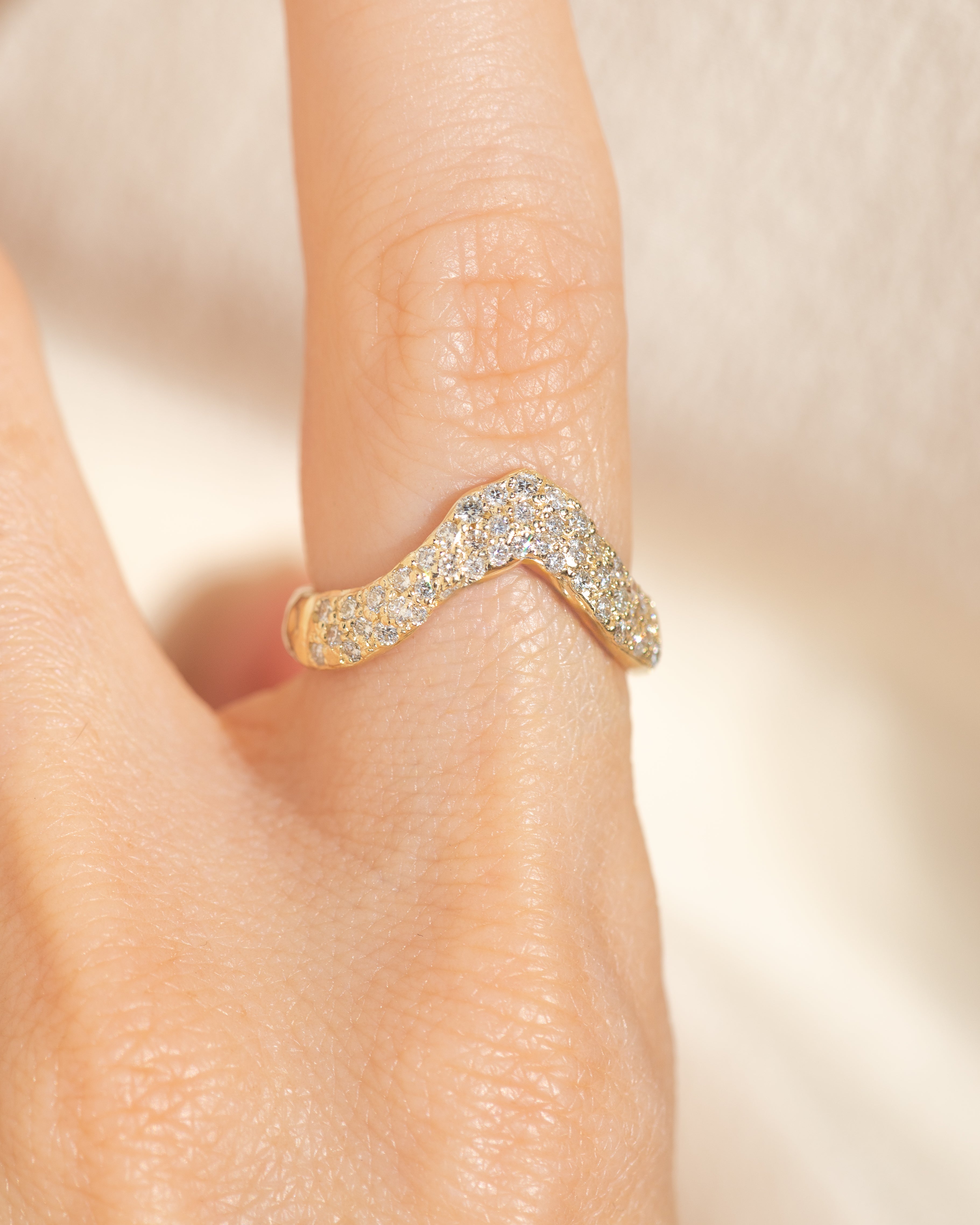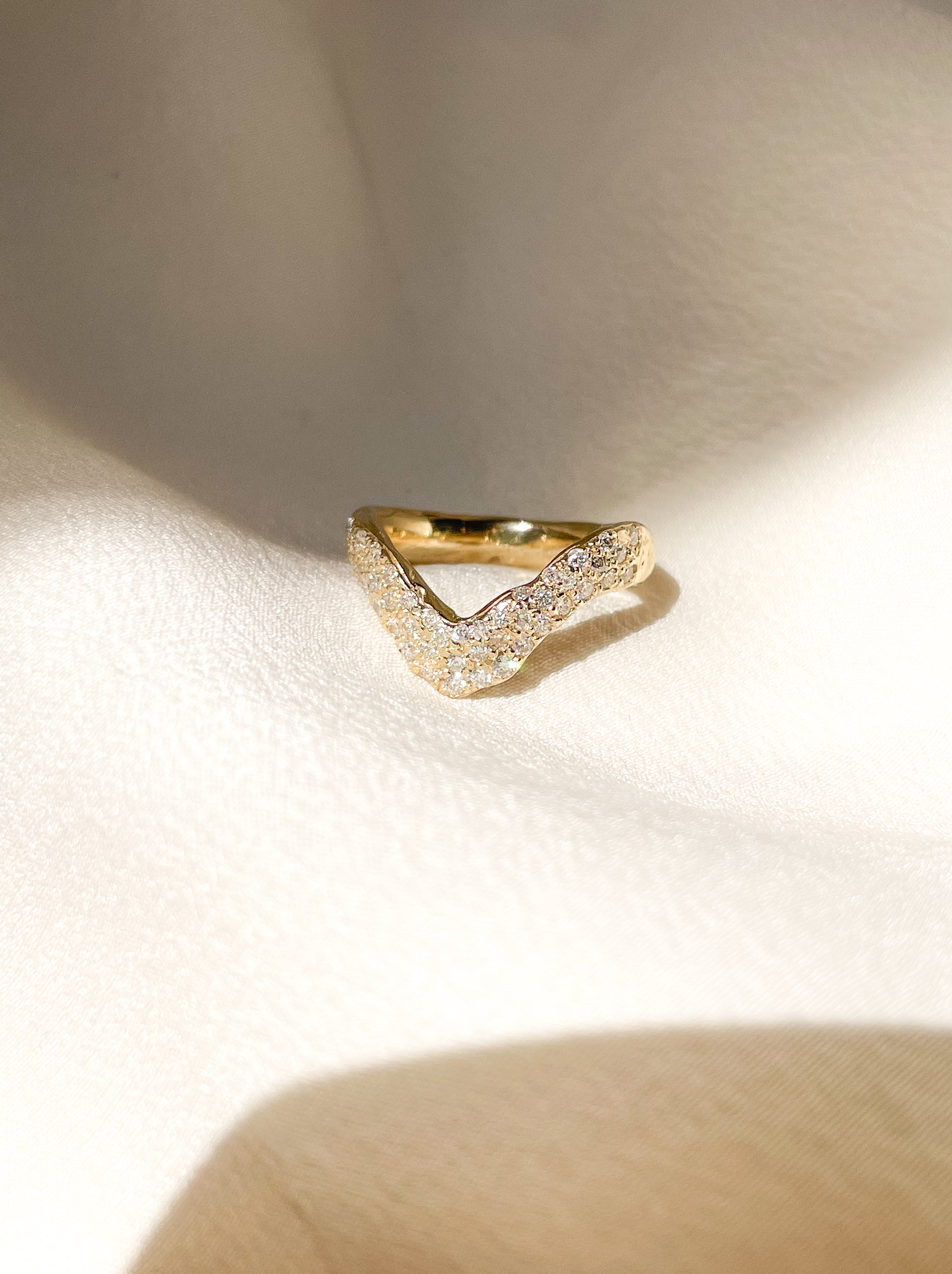 Hand-carved v-shaped band available in 14k Yellow, White, or Rose Gold, set with an incredible, shimmering disco party of 45 White Diamonds.