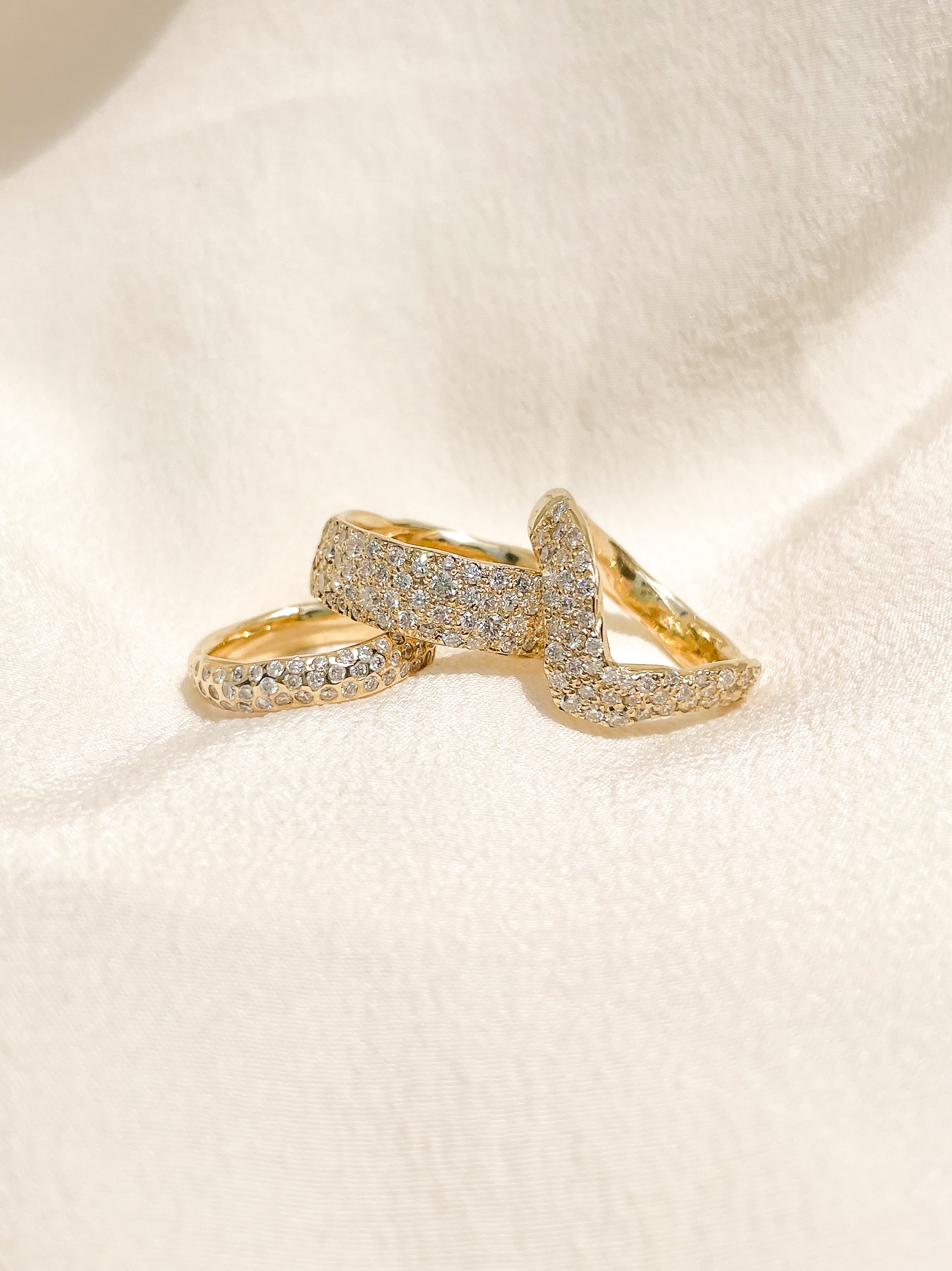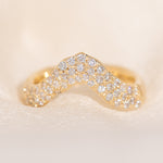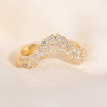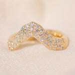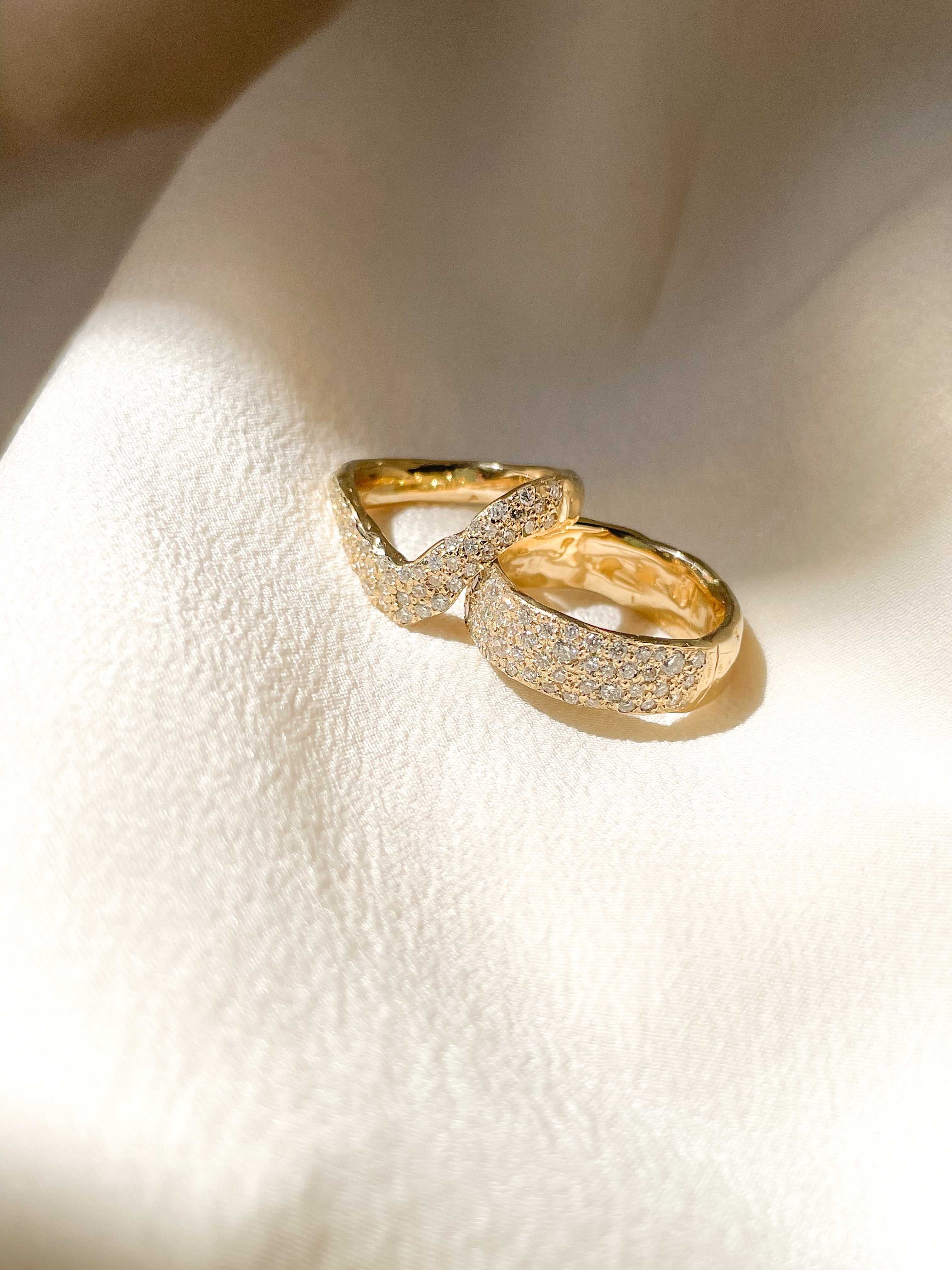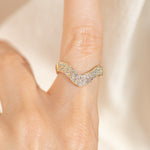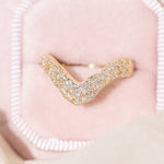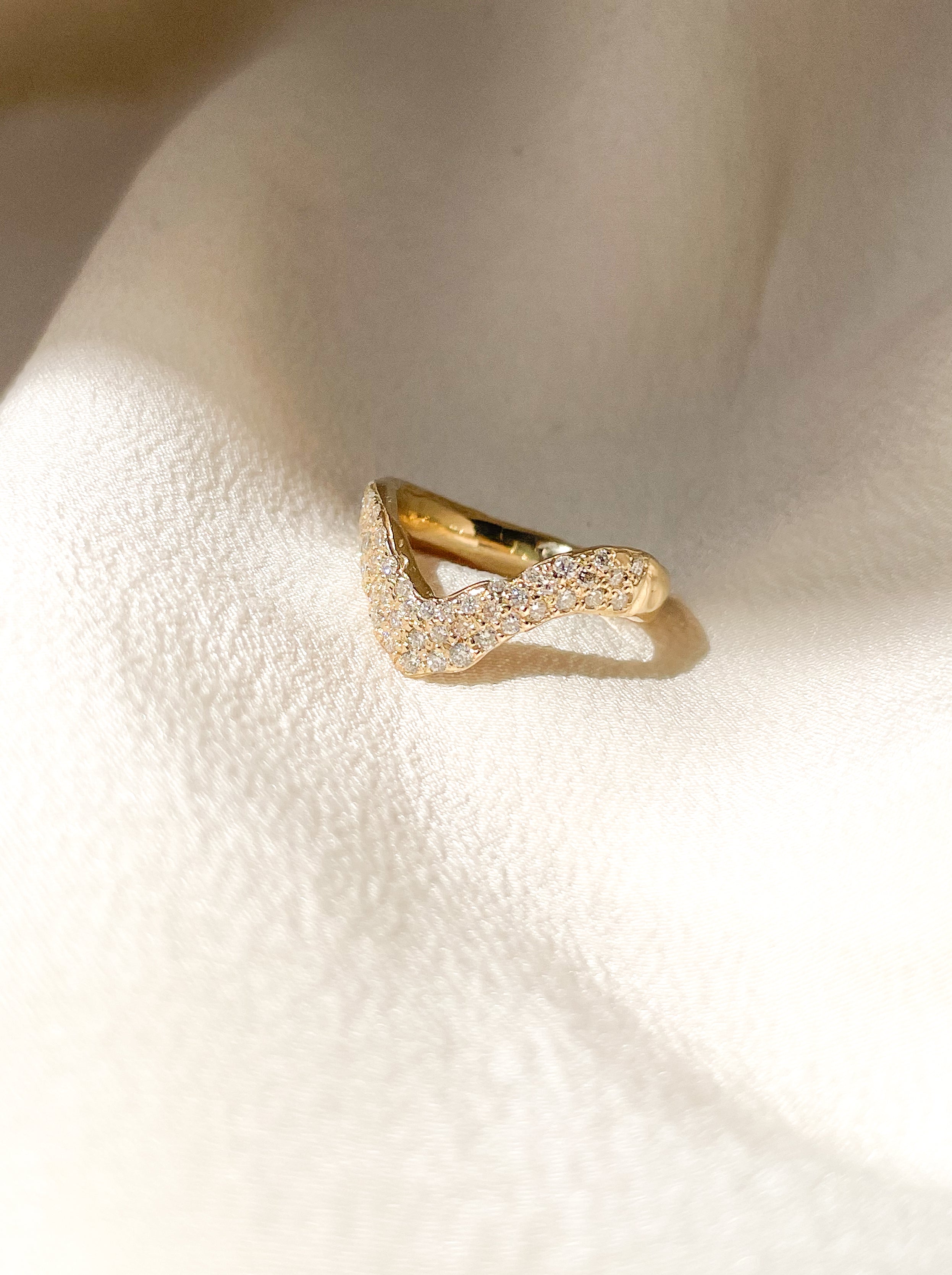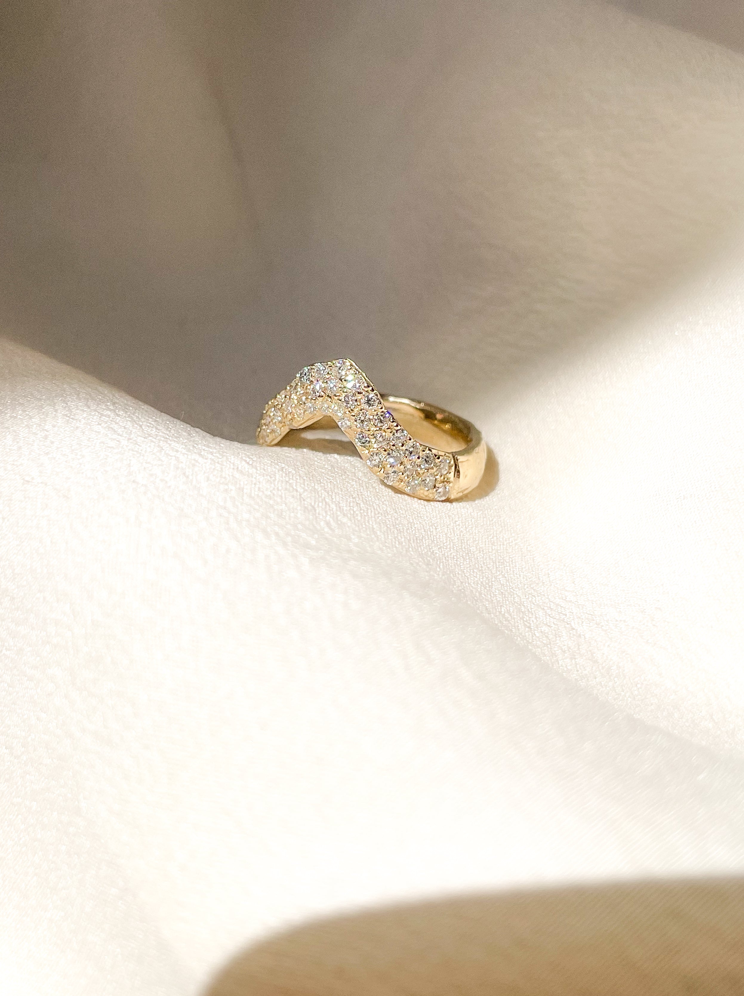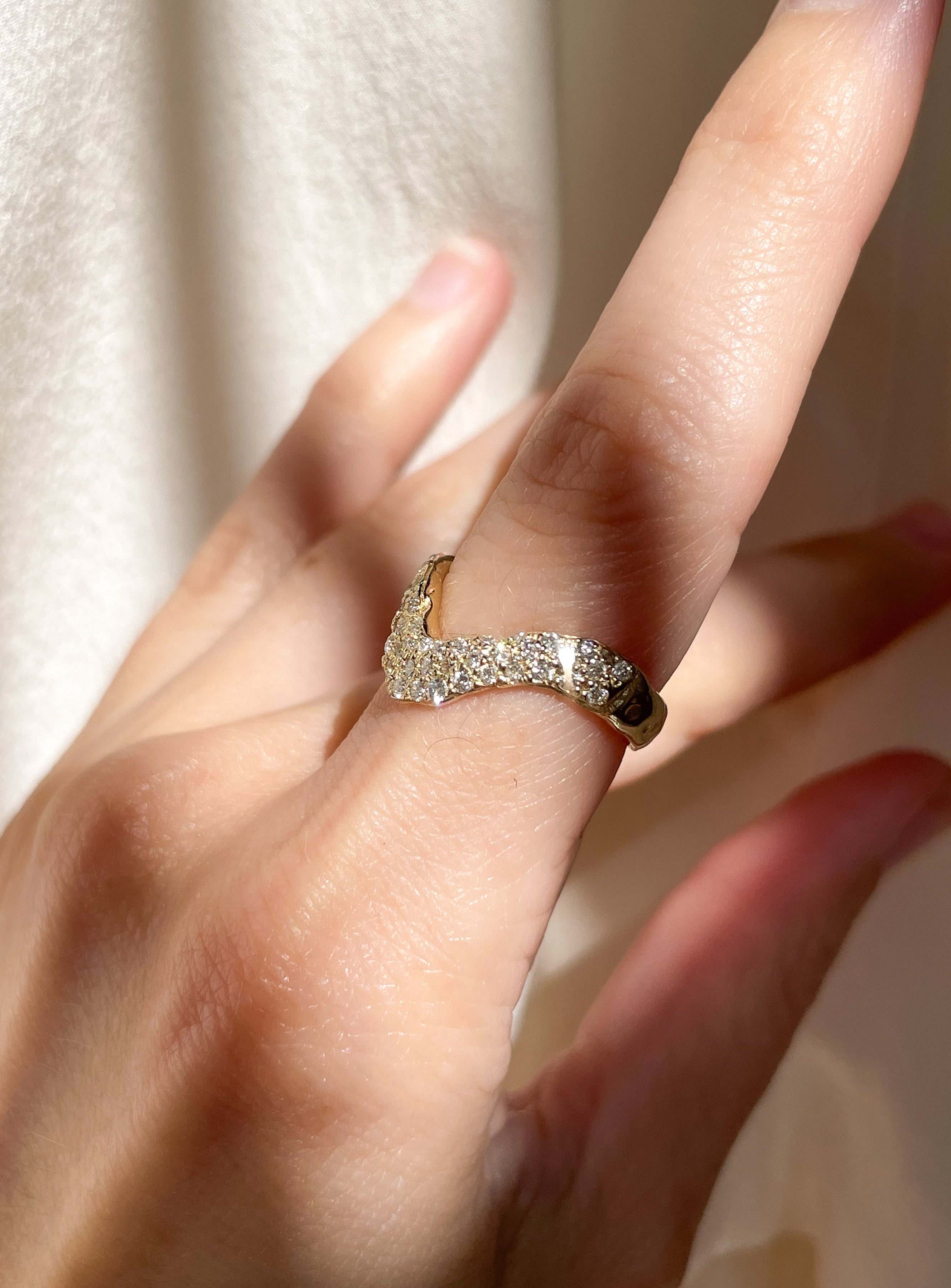 Hand-carved v-shaped band available in 14k Yellow, White, or Rose Gold, set with an incredible, shimmering disco party of 45 White Diamonds.
