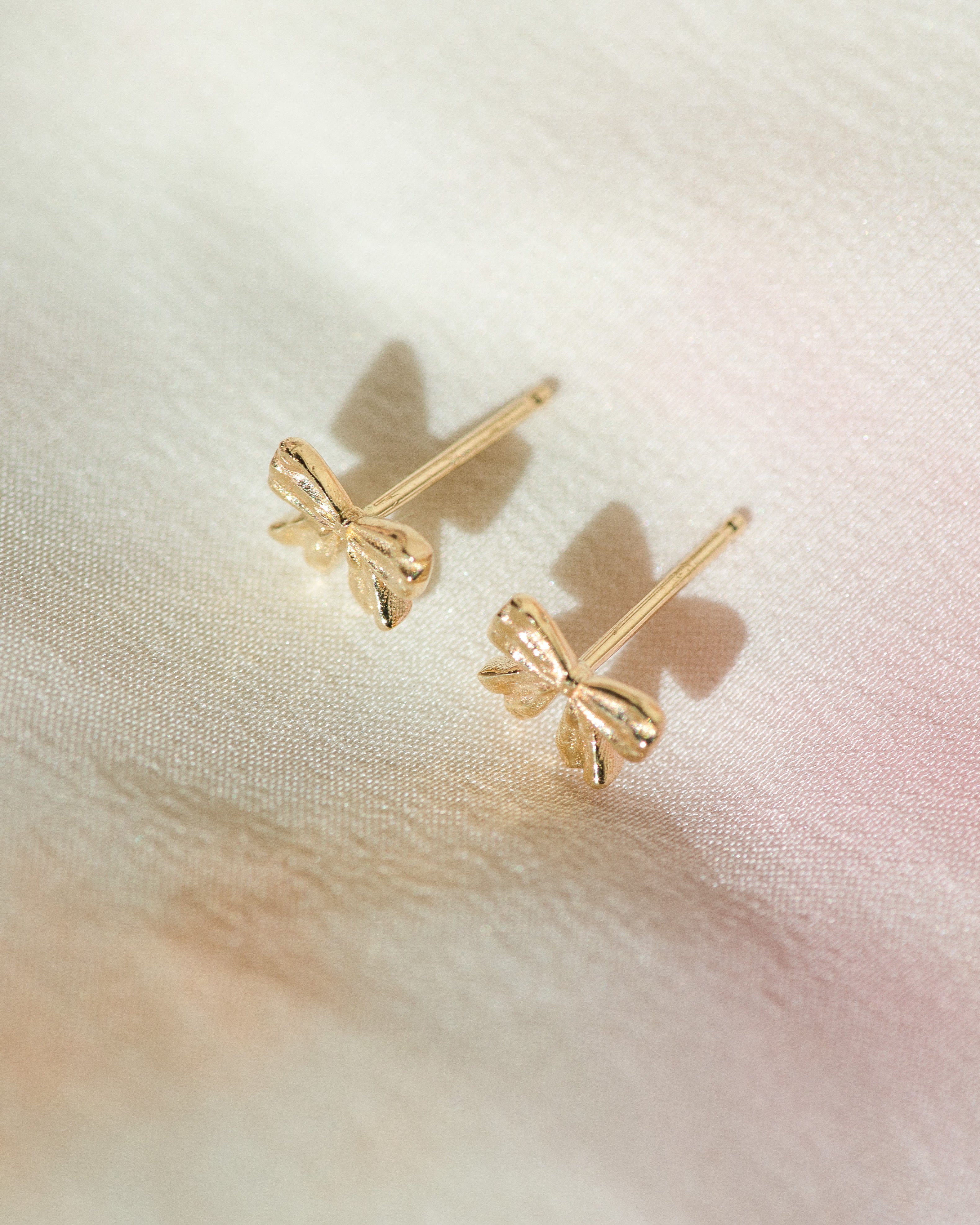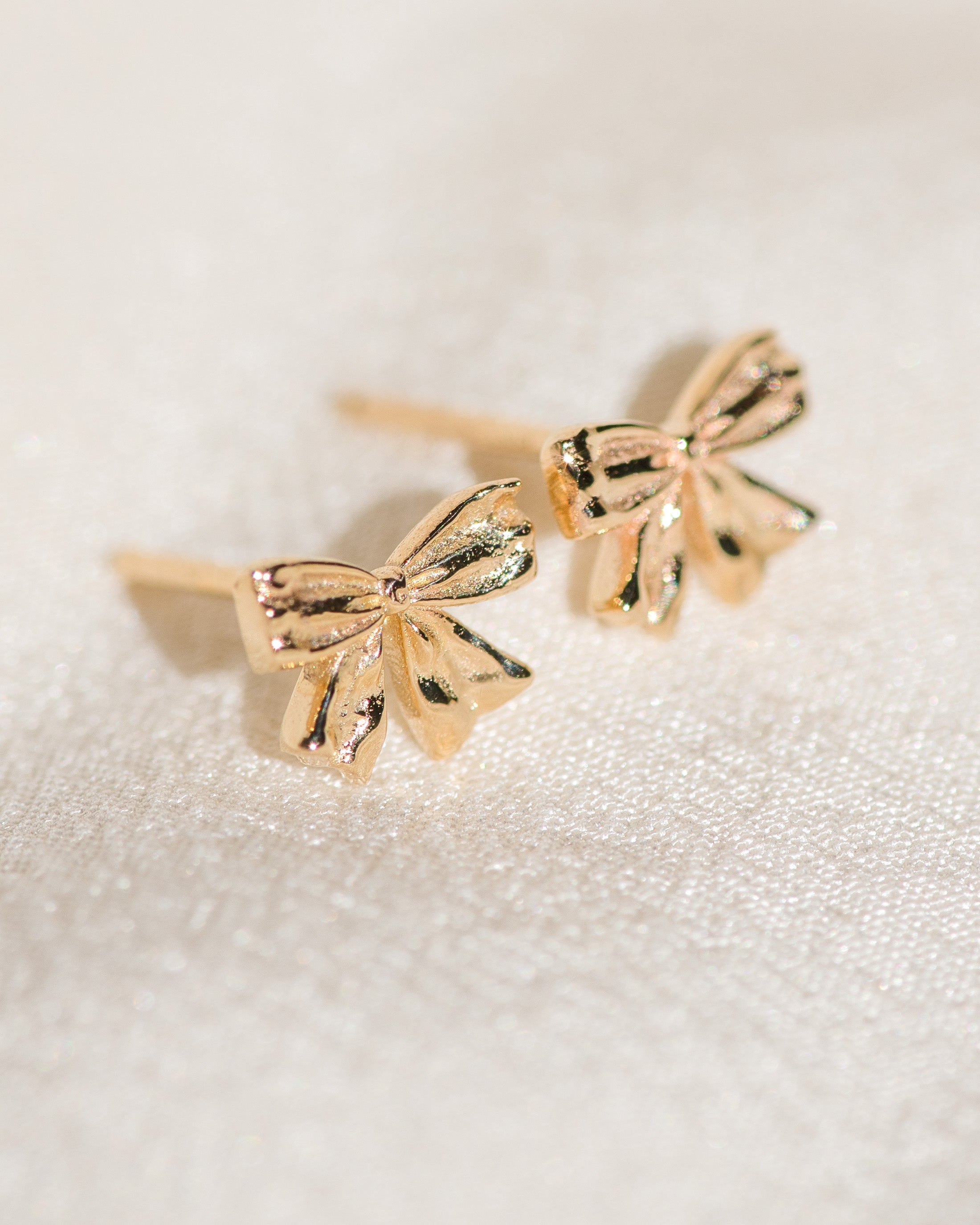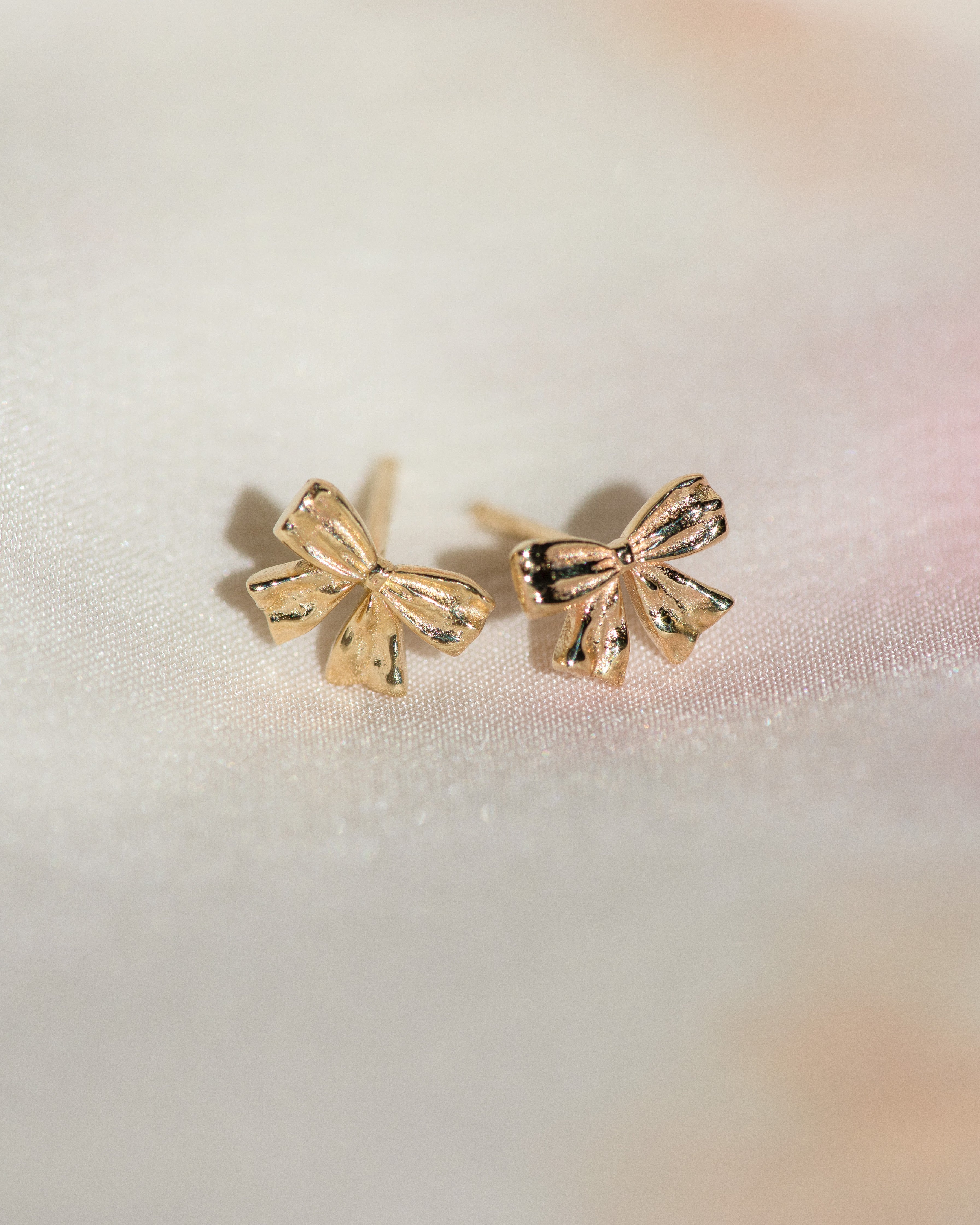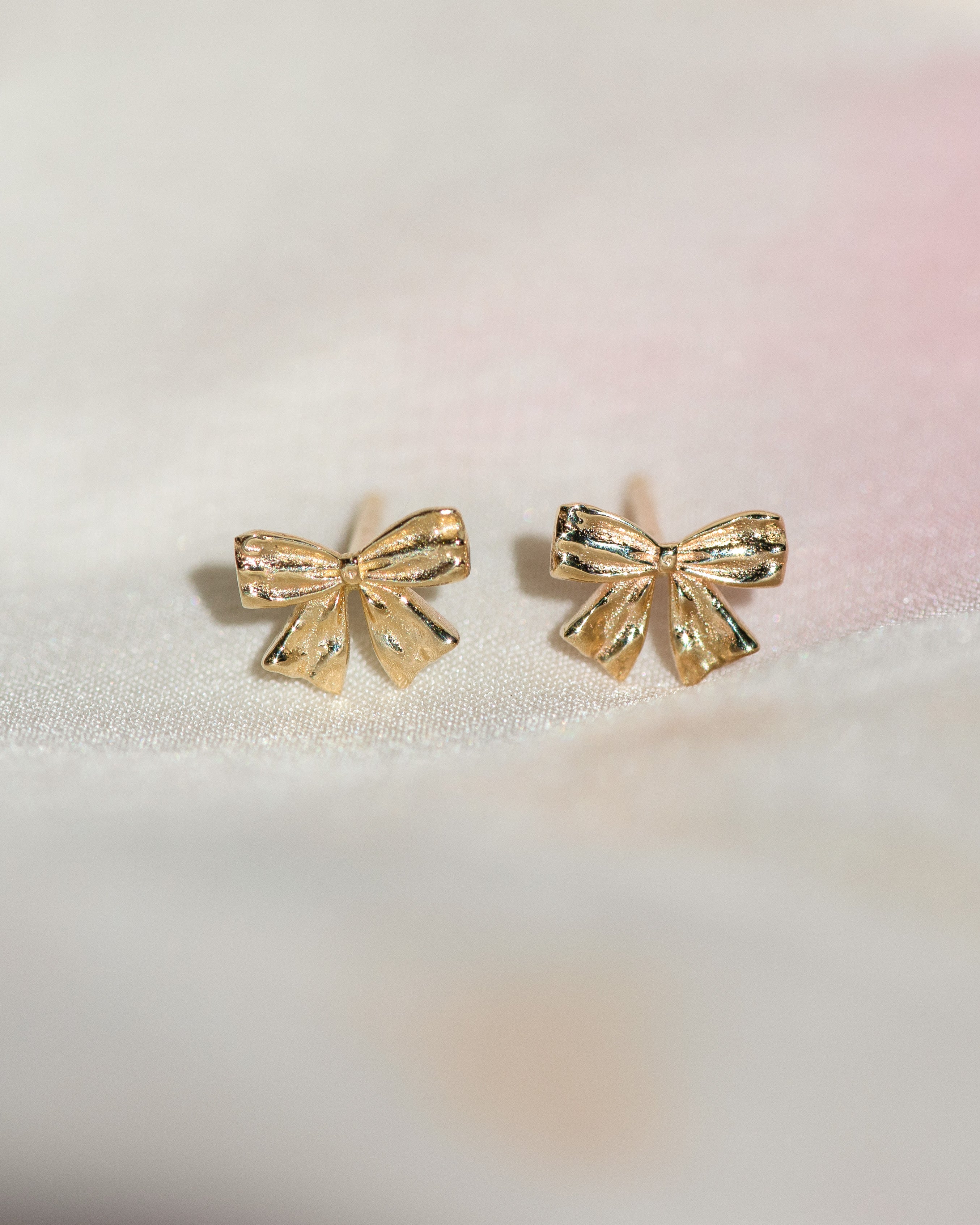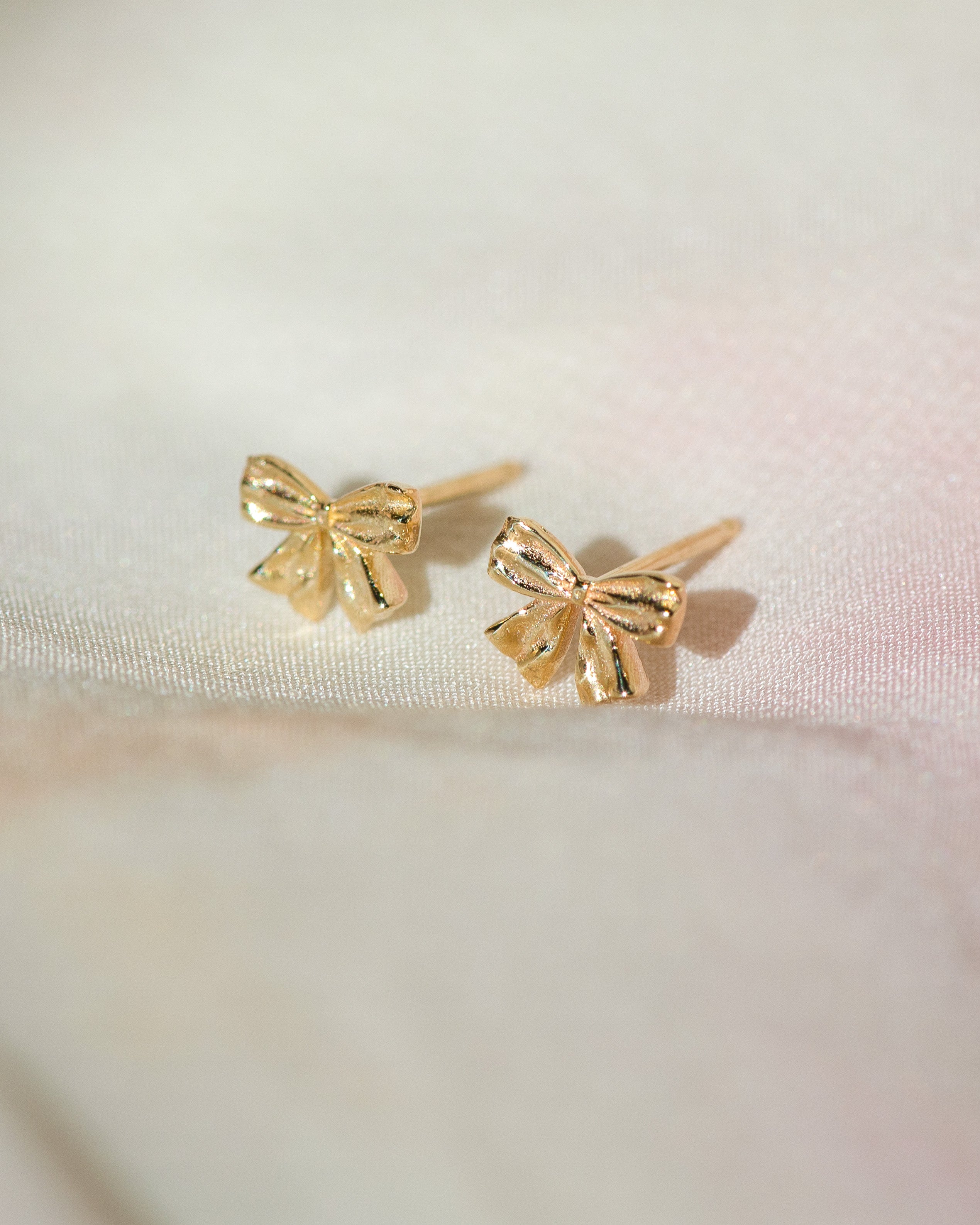 This pair of perfectly petite coquette bow studs are inspired by the pendants worn by Marie Antoinette, adorned in ribbon and sealed with a bow.