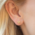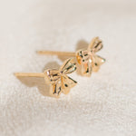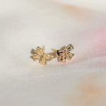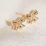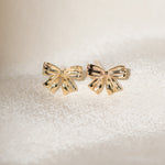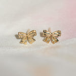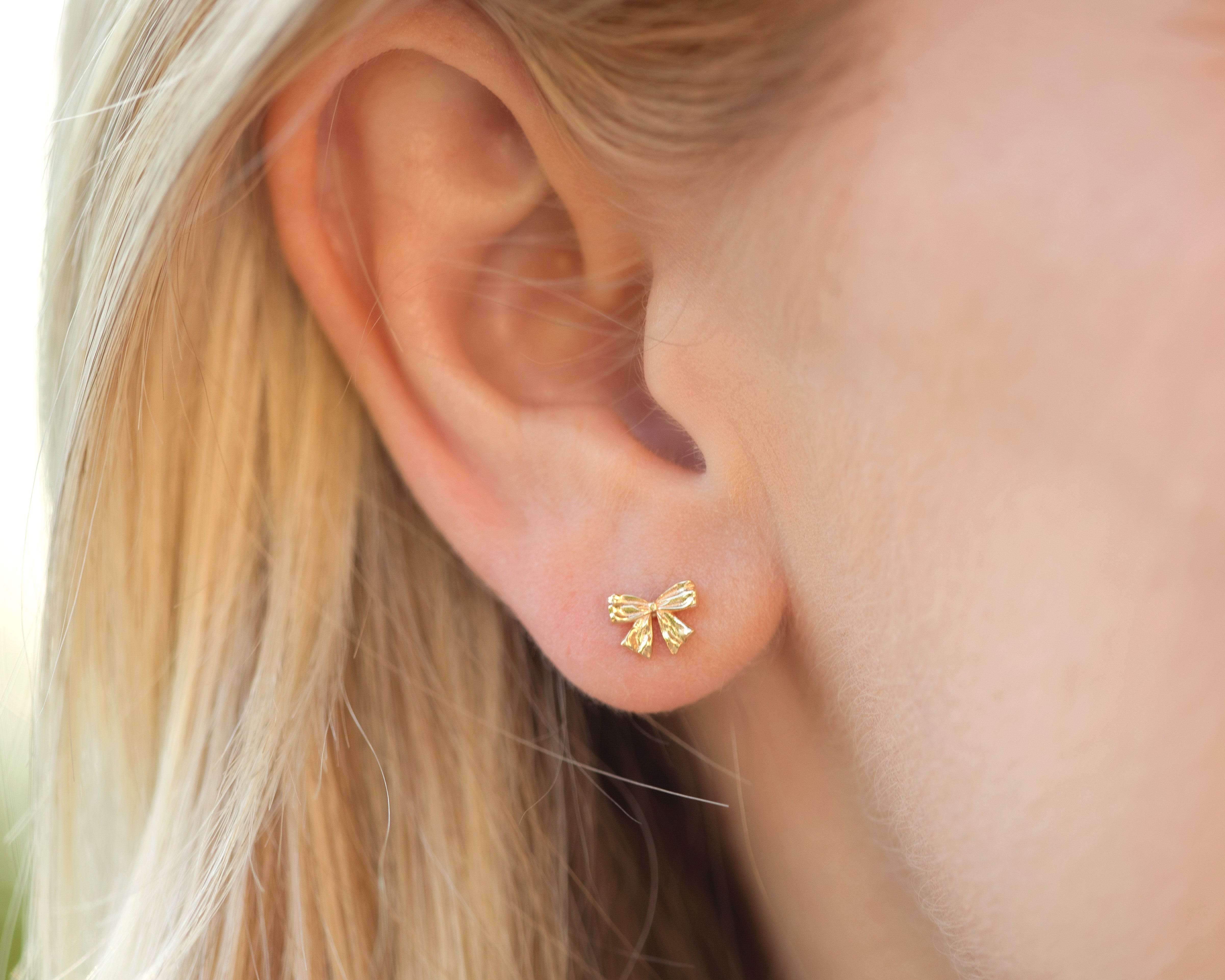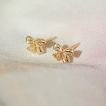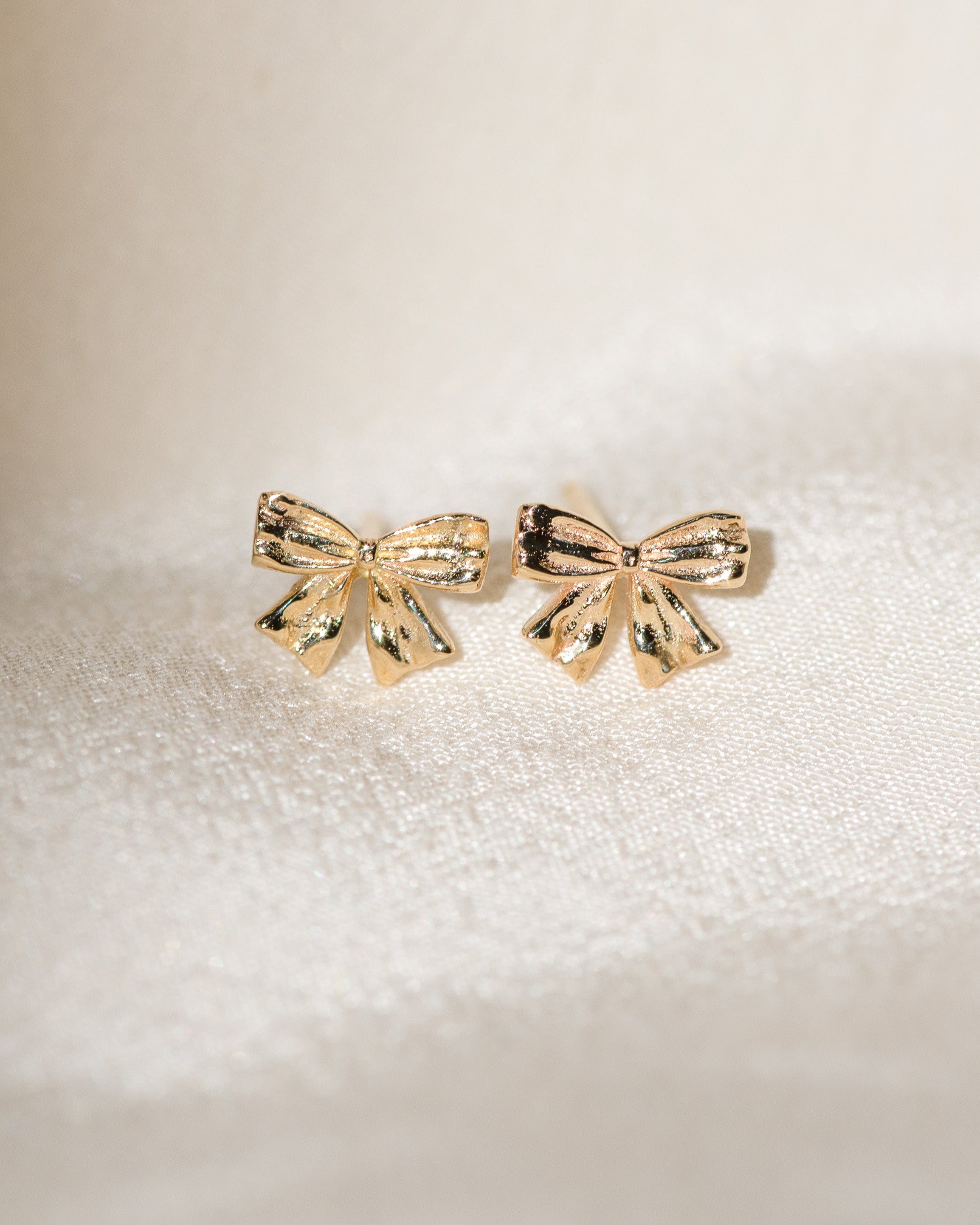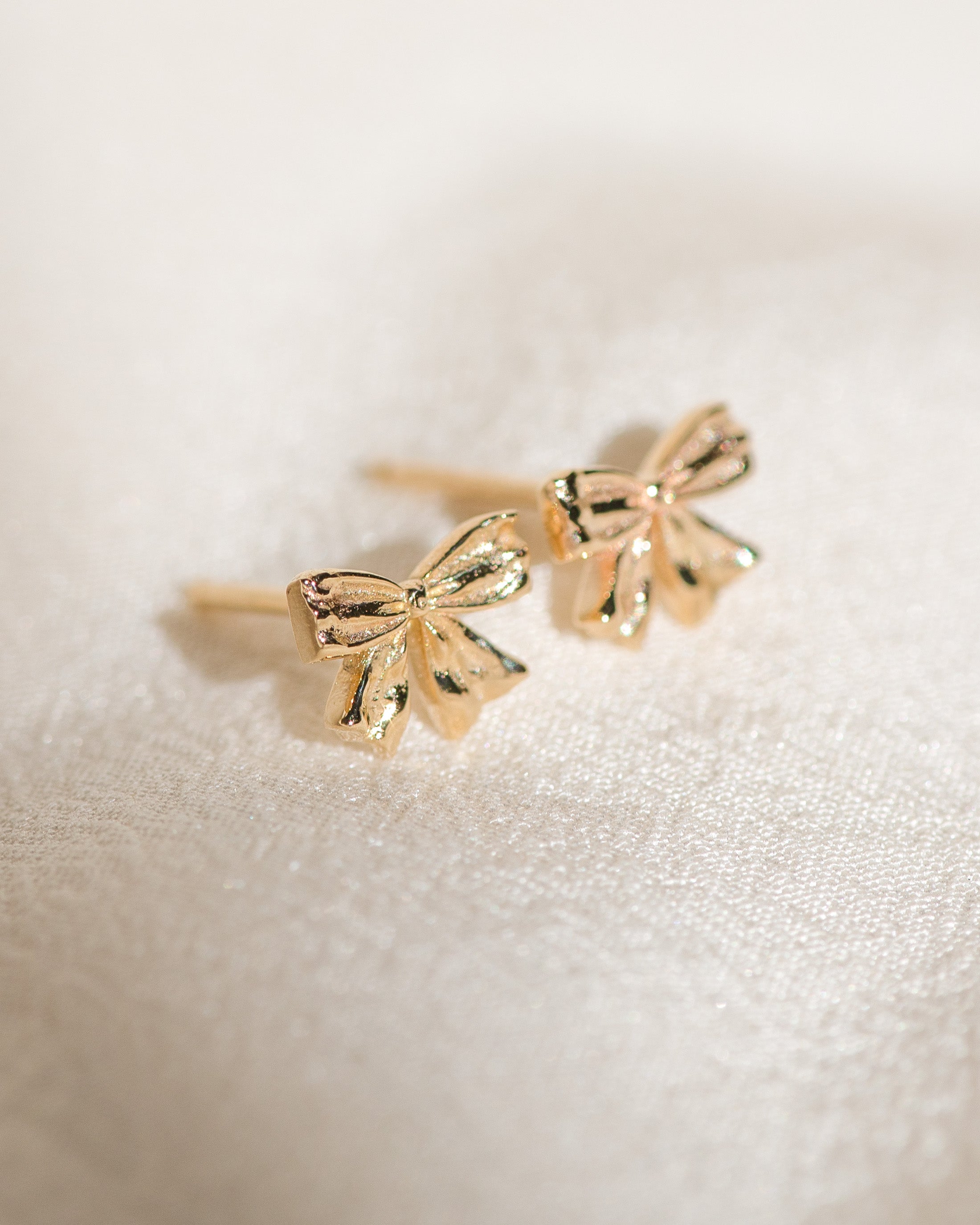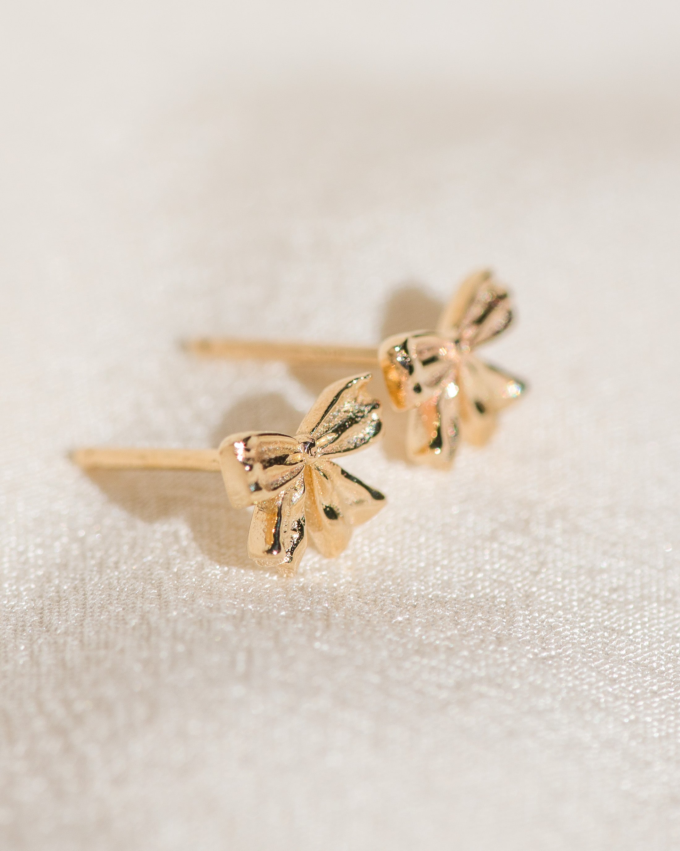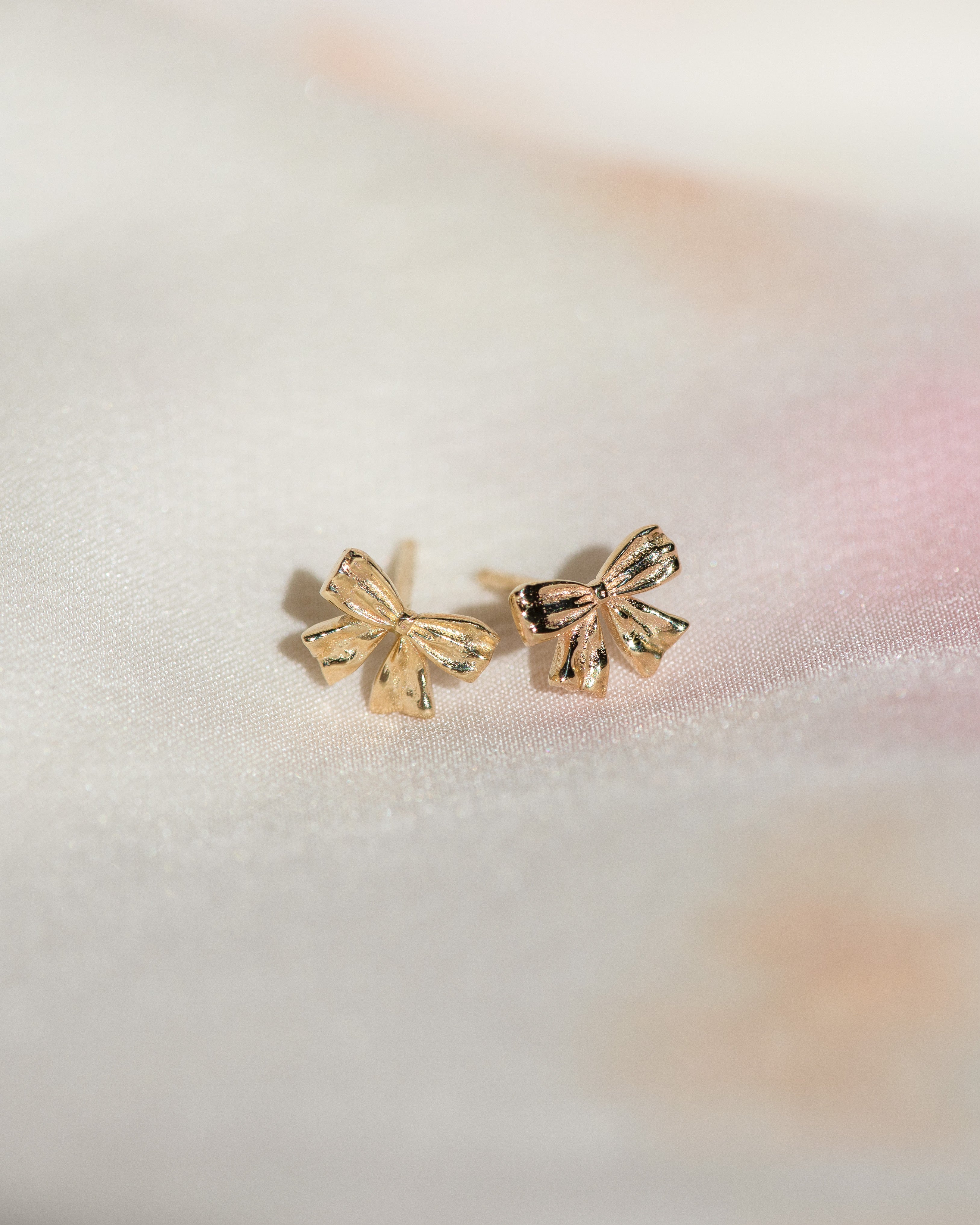 This pair of perfectly petite coquette bow studs are inspired by the pendants worn by Marie Antoinette, adorned in ribbon and sealed with a bow.