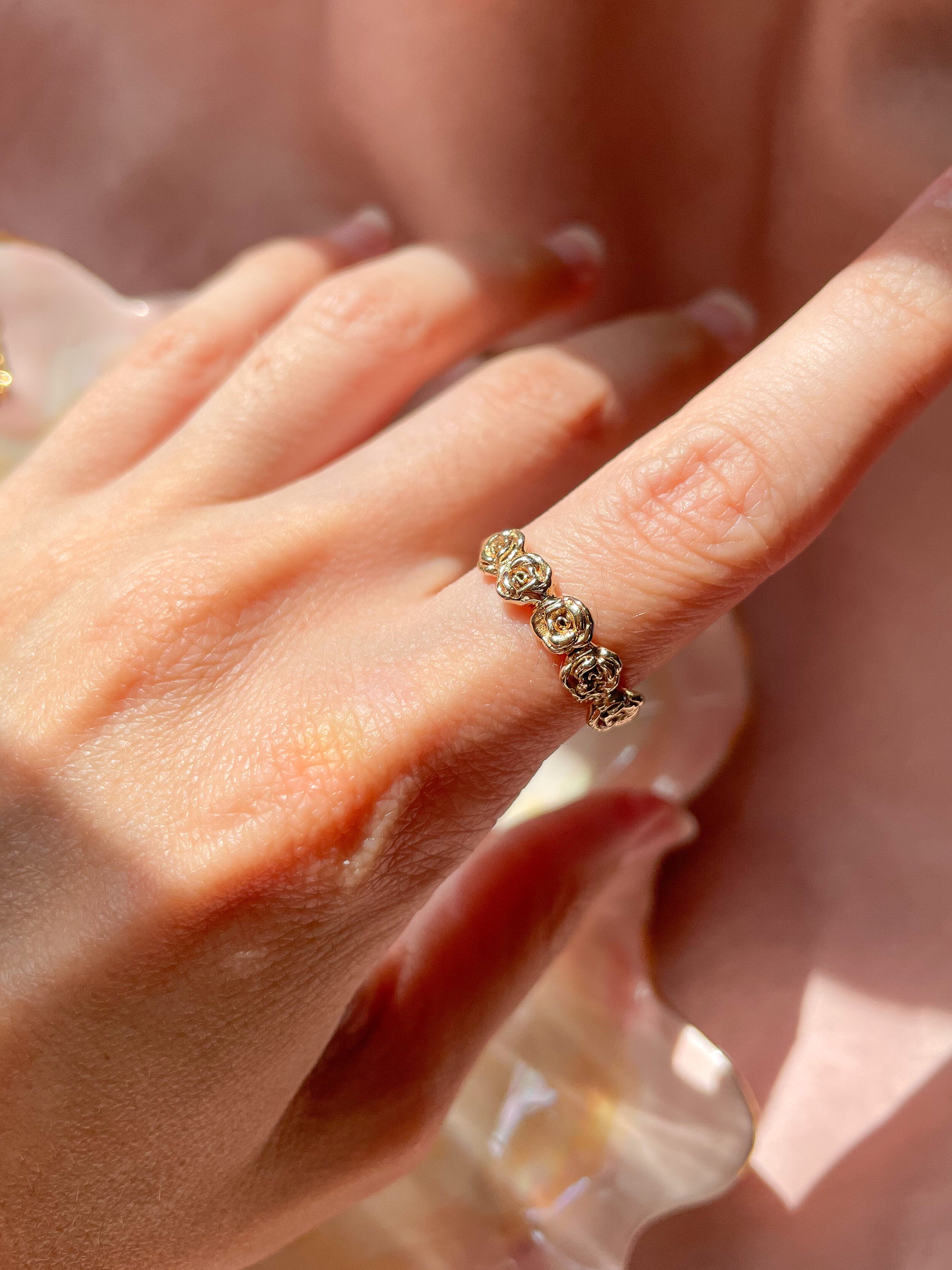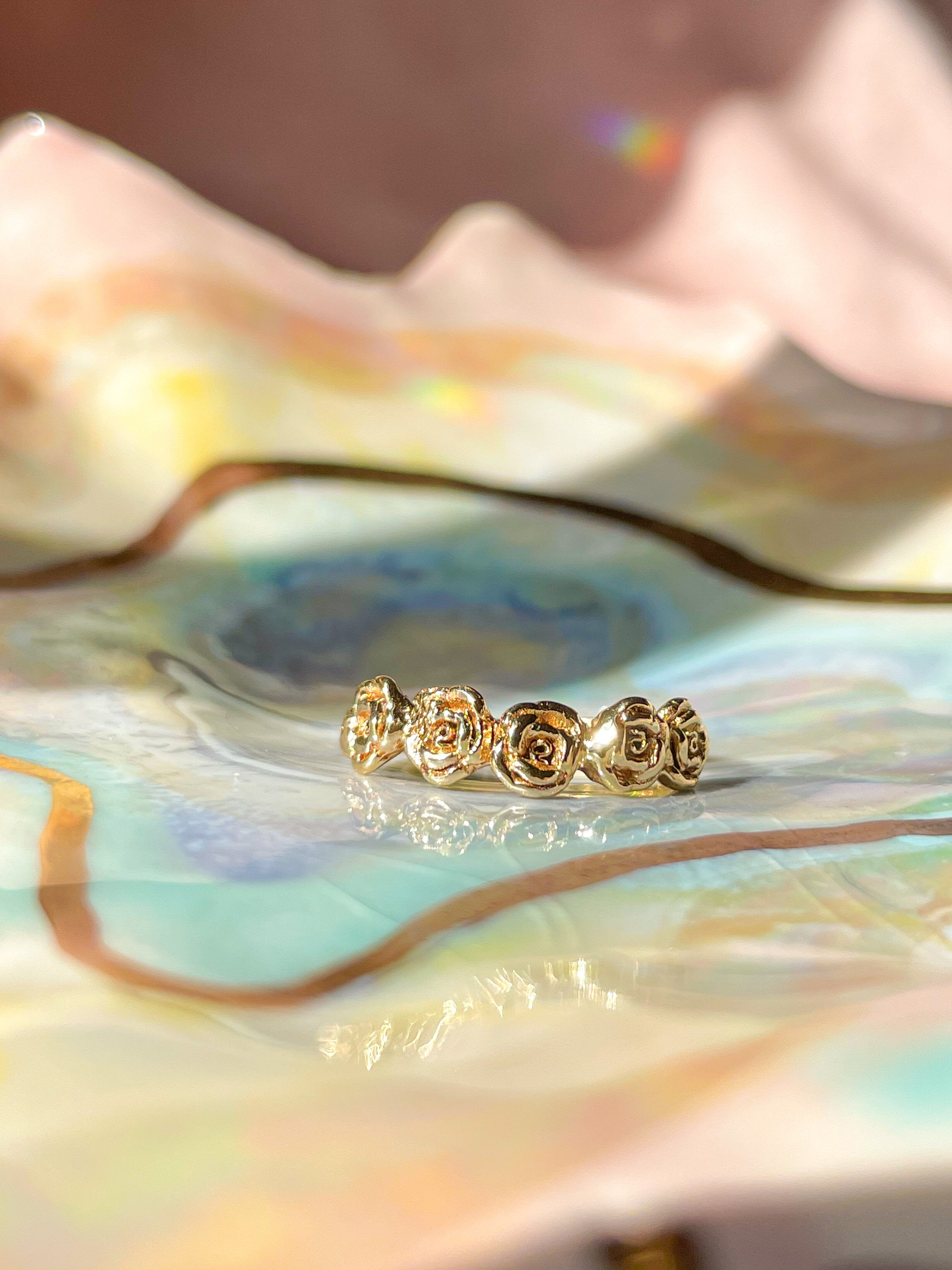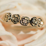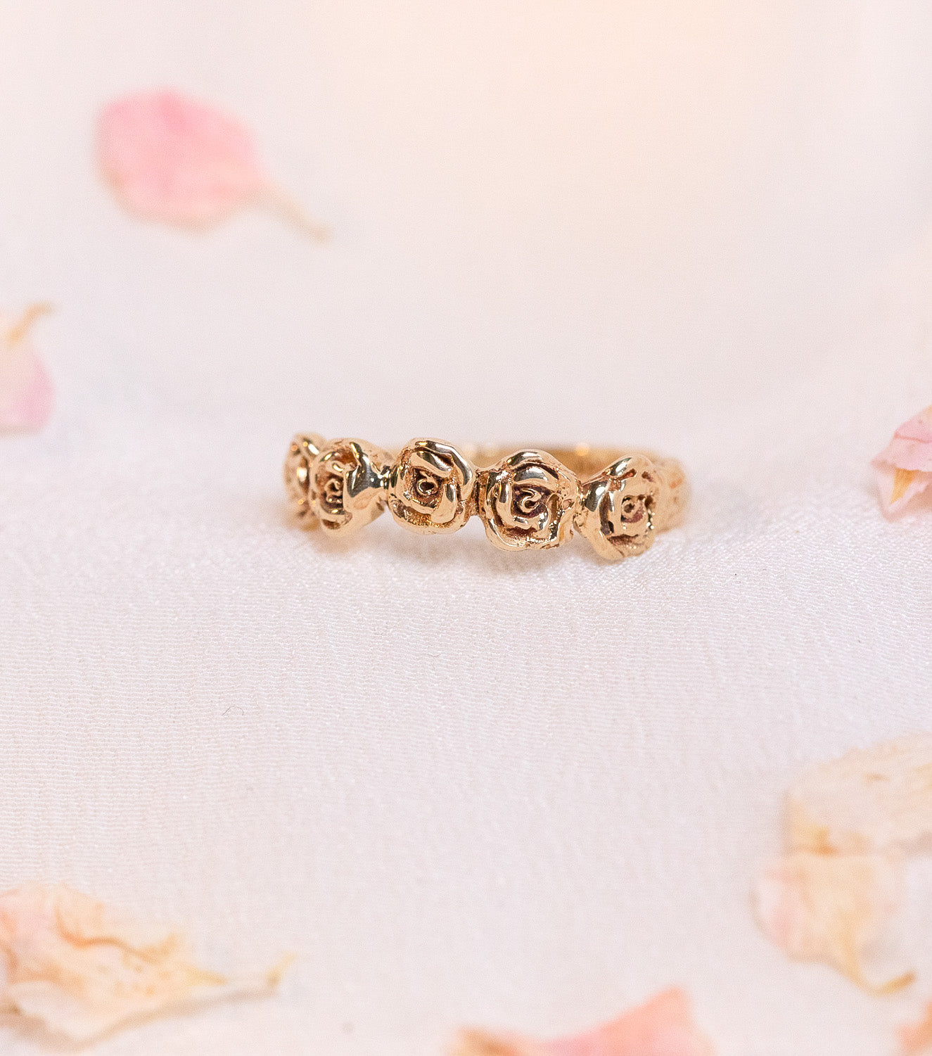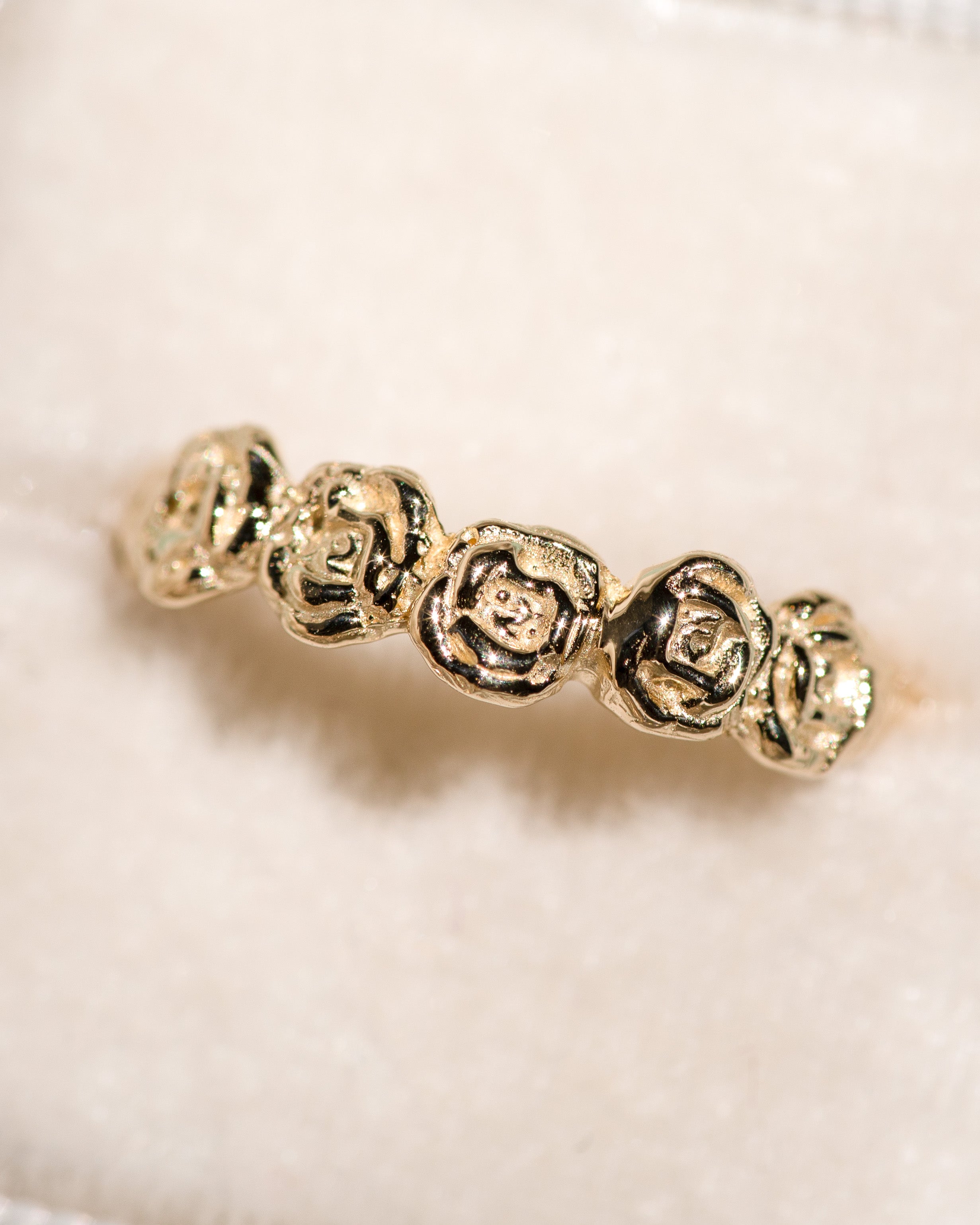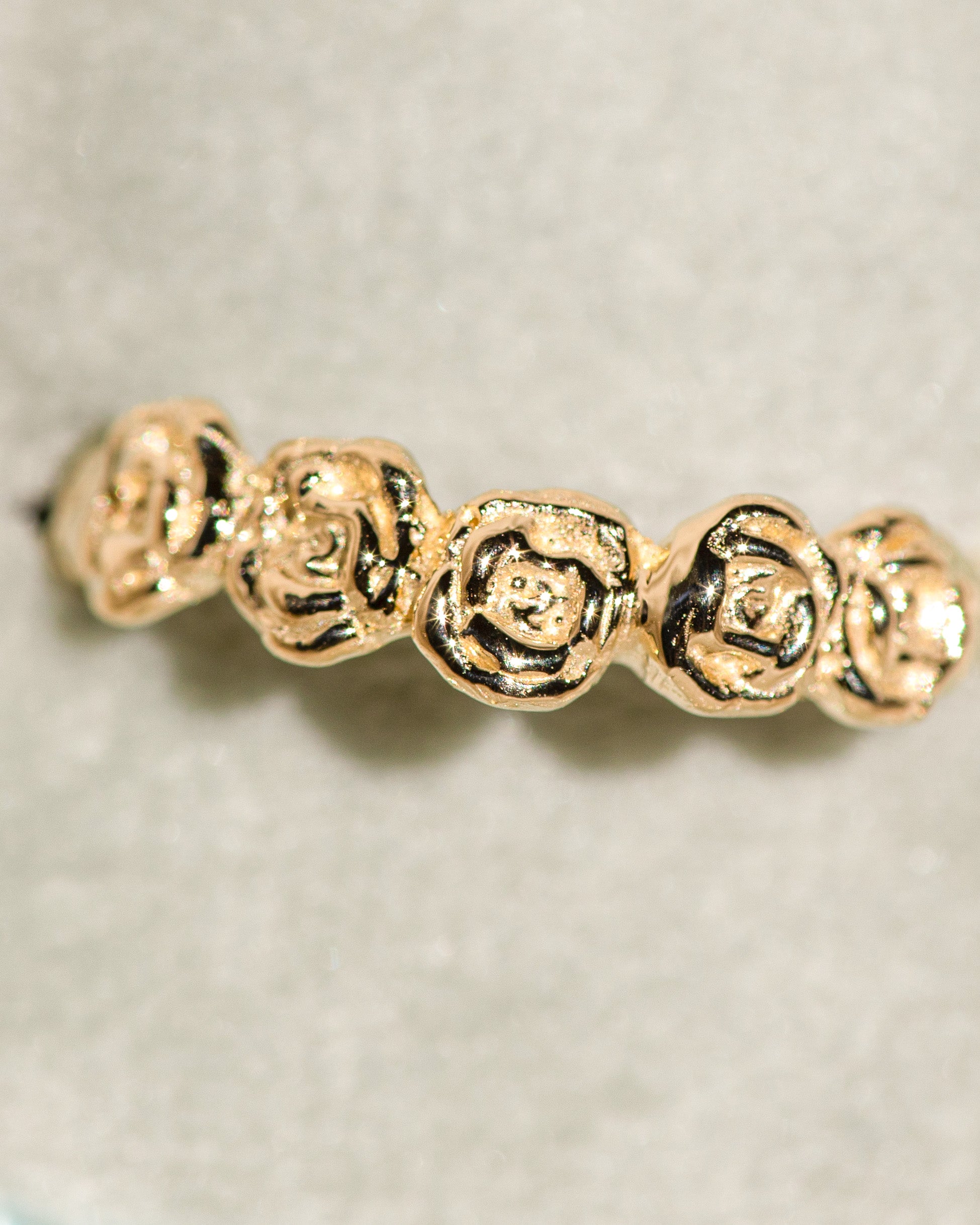 This hand-carved band features a halo of rosebuds, designed to enrapture you within the Divine love of your angels and serve as a reminder of your innate perfection and beauty.