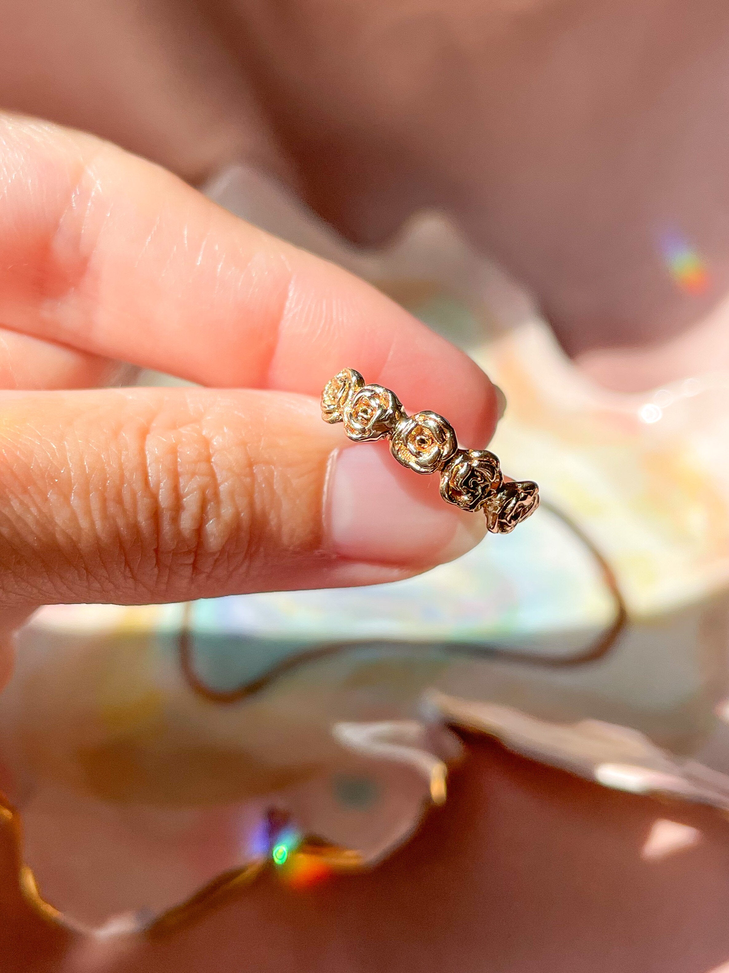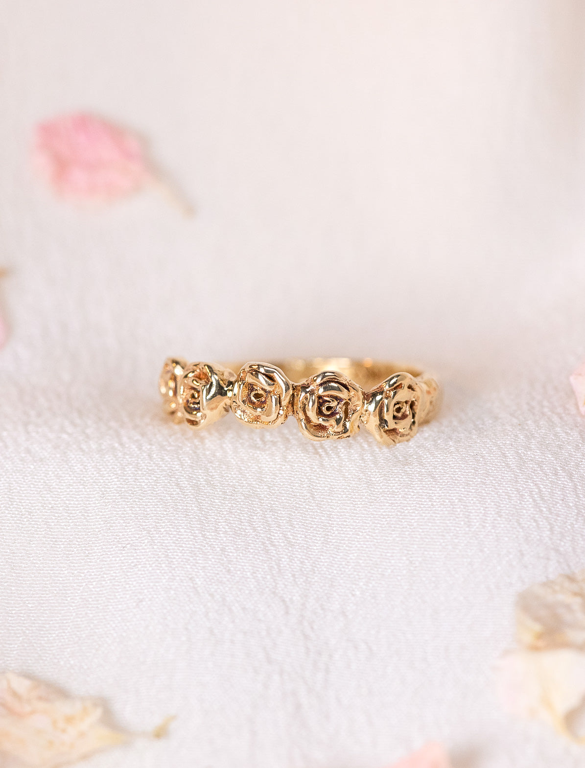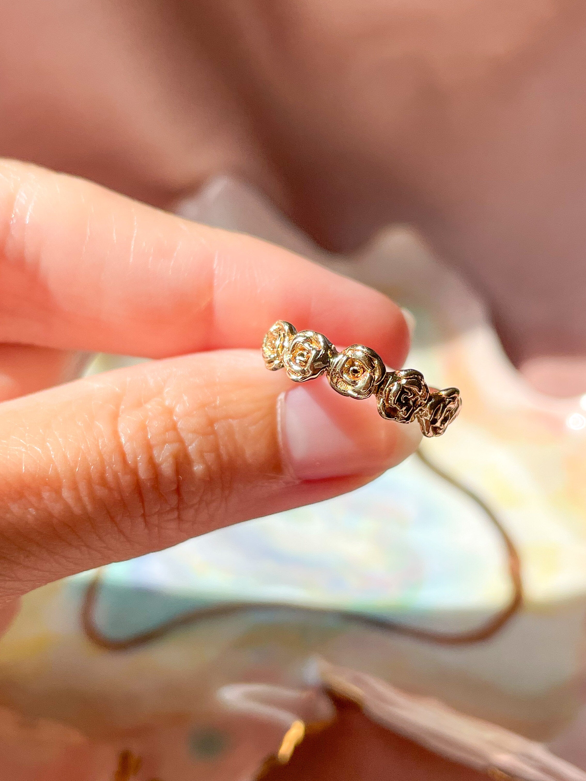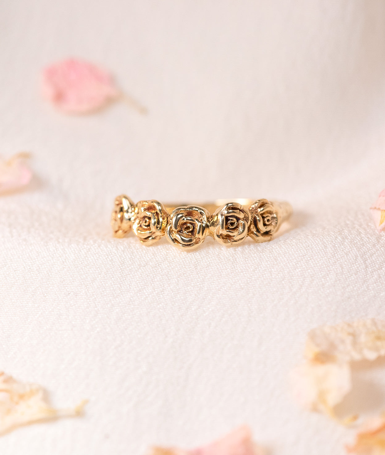 This hand-carved band features a halo of rosebuds, designed to enrapture you within the Divine love of your angels and serve as a reminder of your innate perfection and beauty.