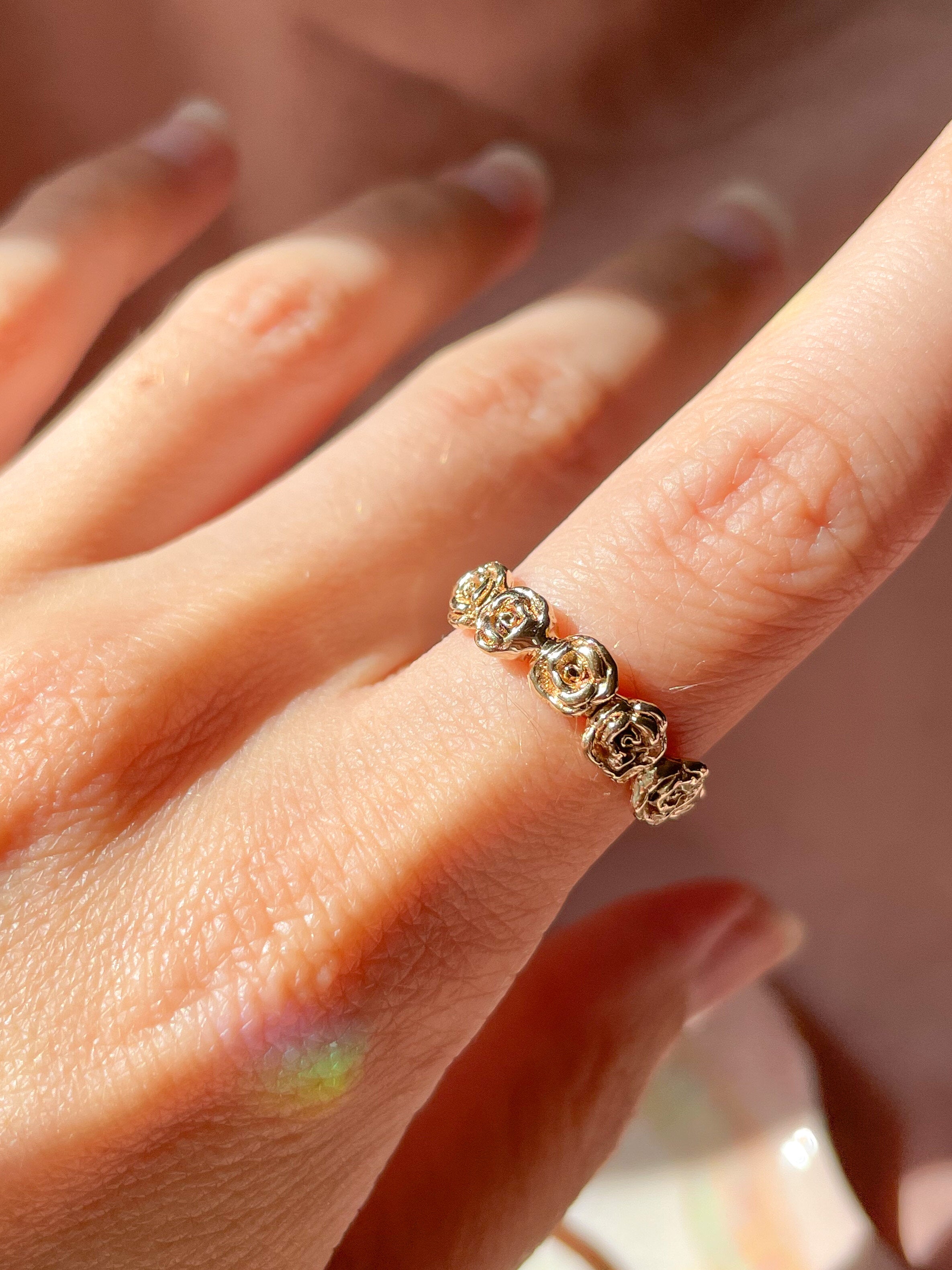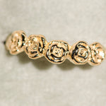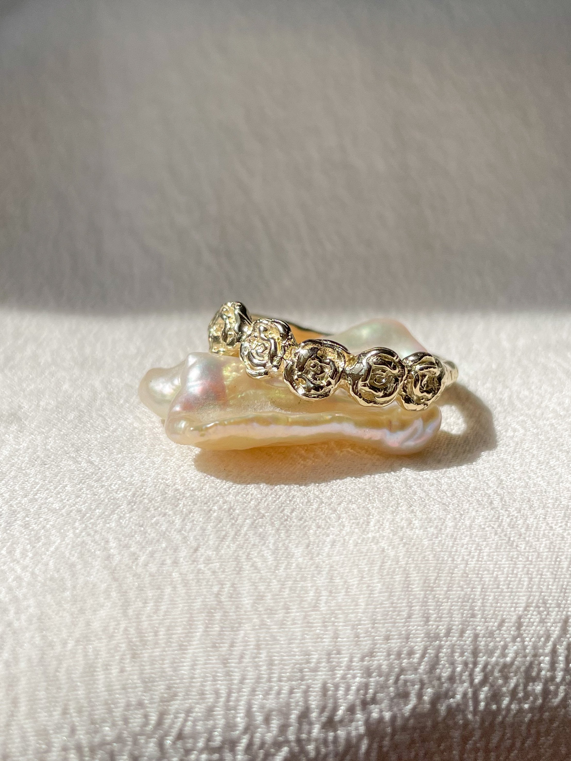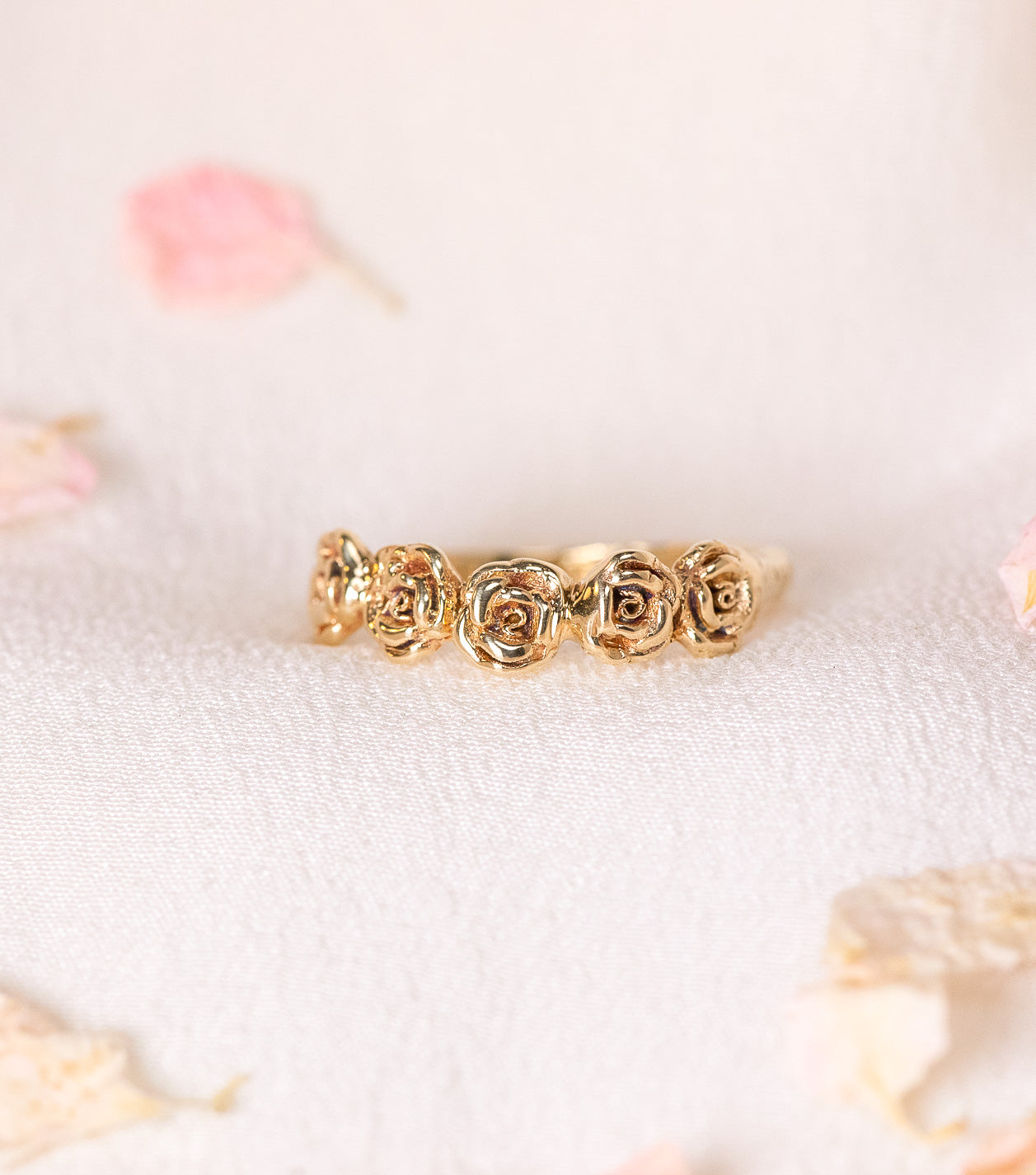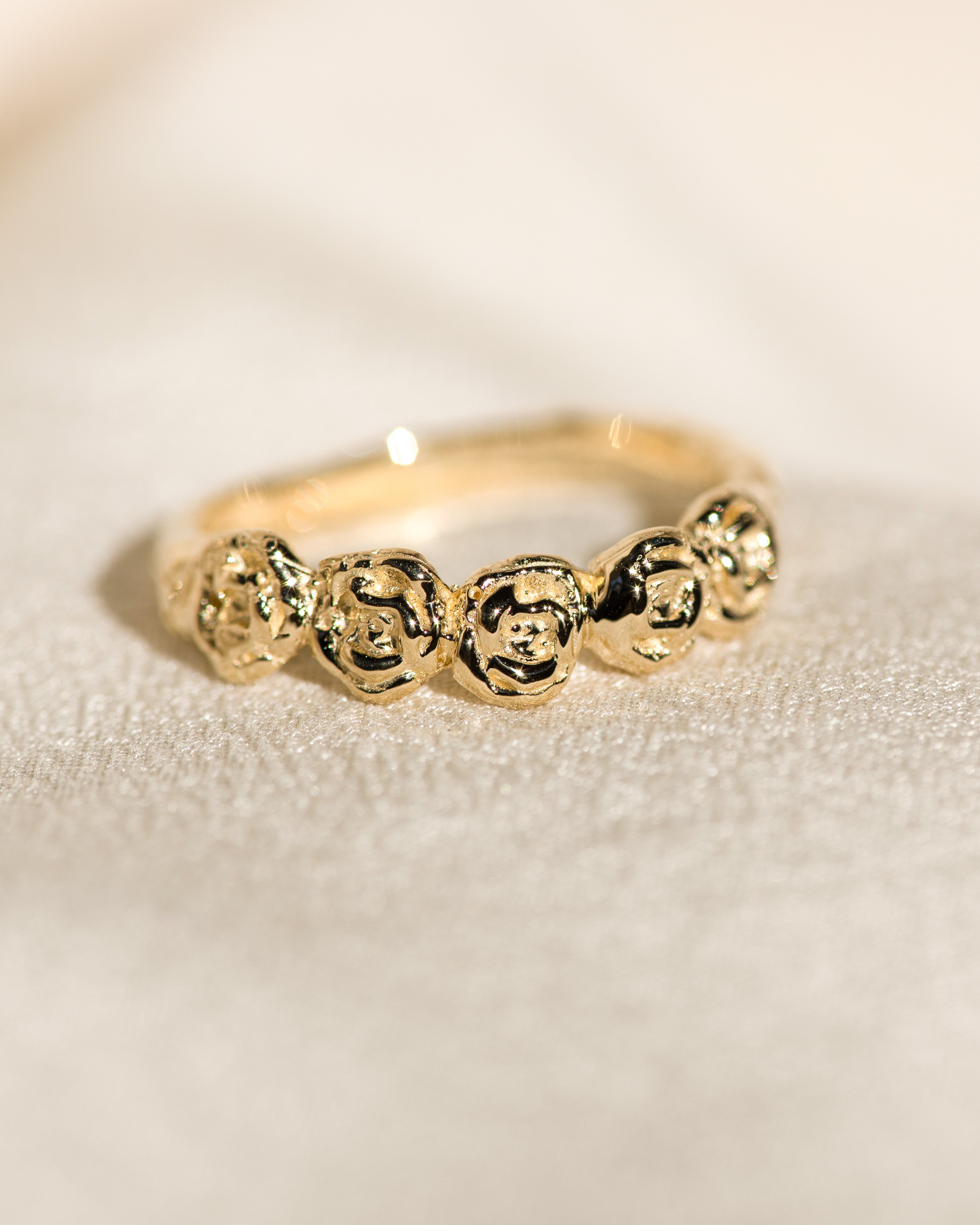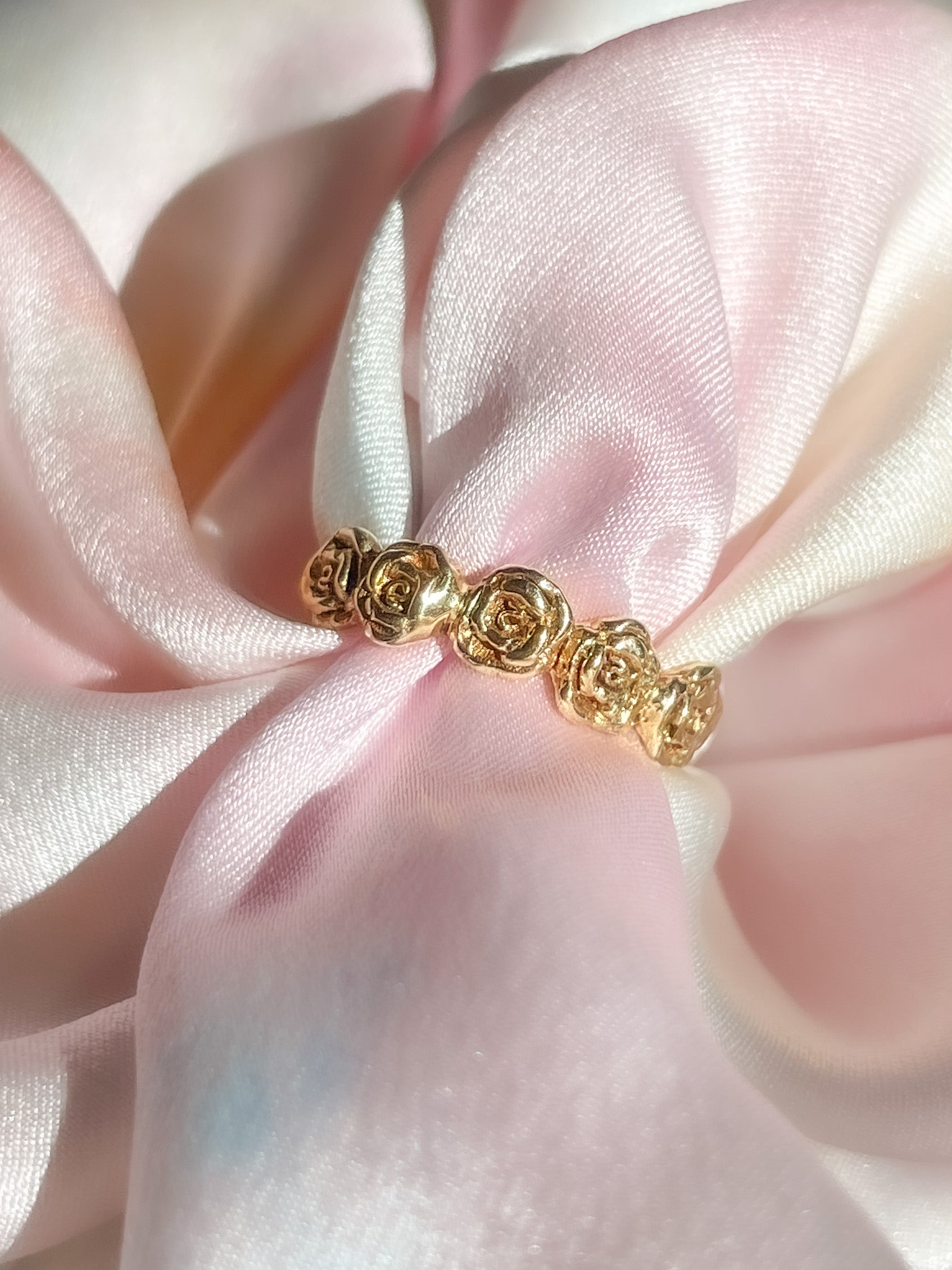 This hand-carved band features a halo of rosebuds, designed to enrapture you within the Divine love of your angels and serve as a reminder of your innate perfection and beauty.
