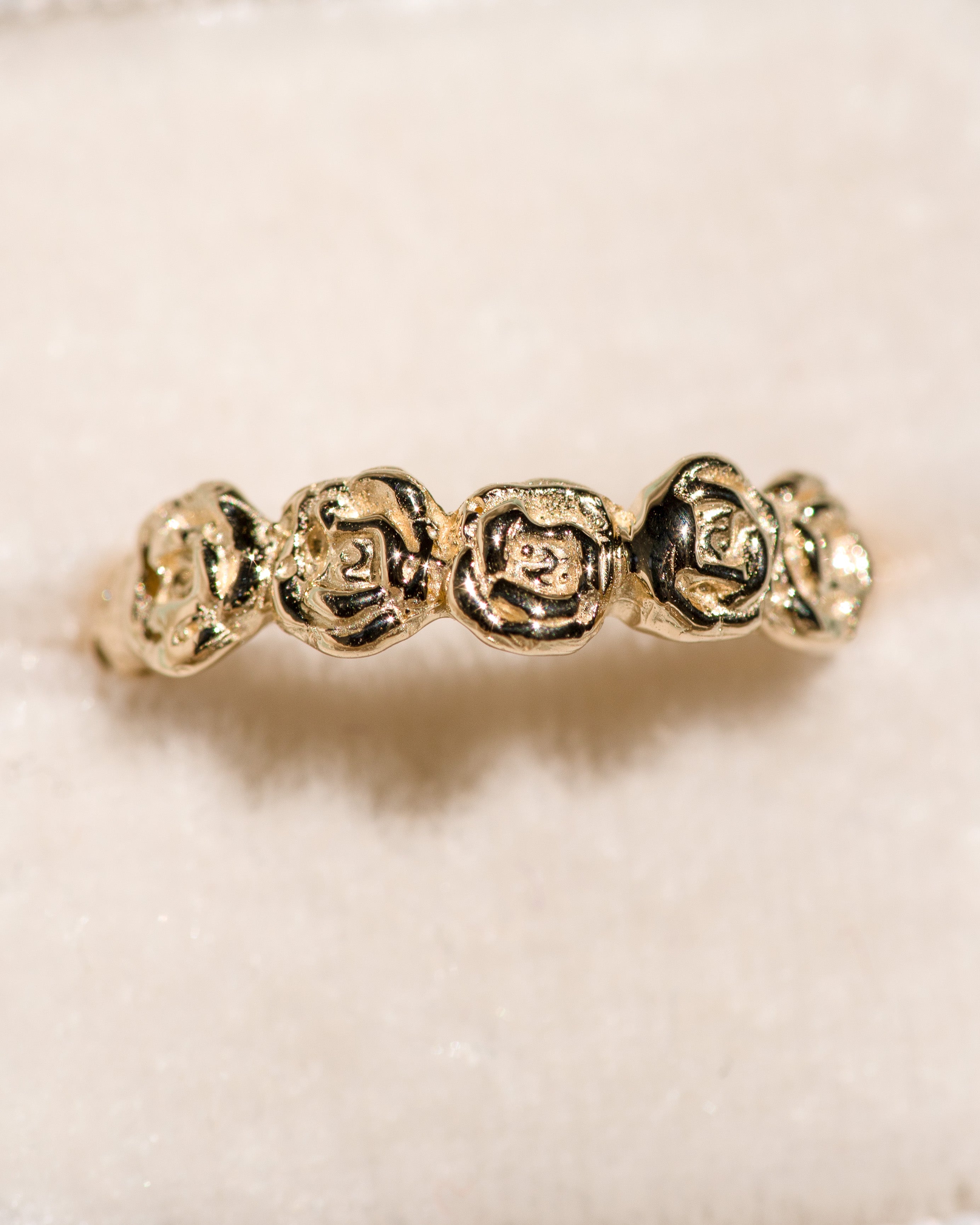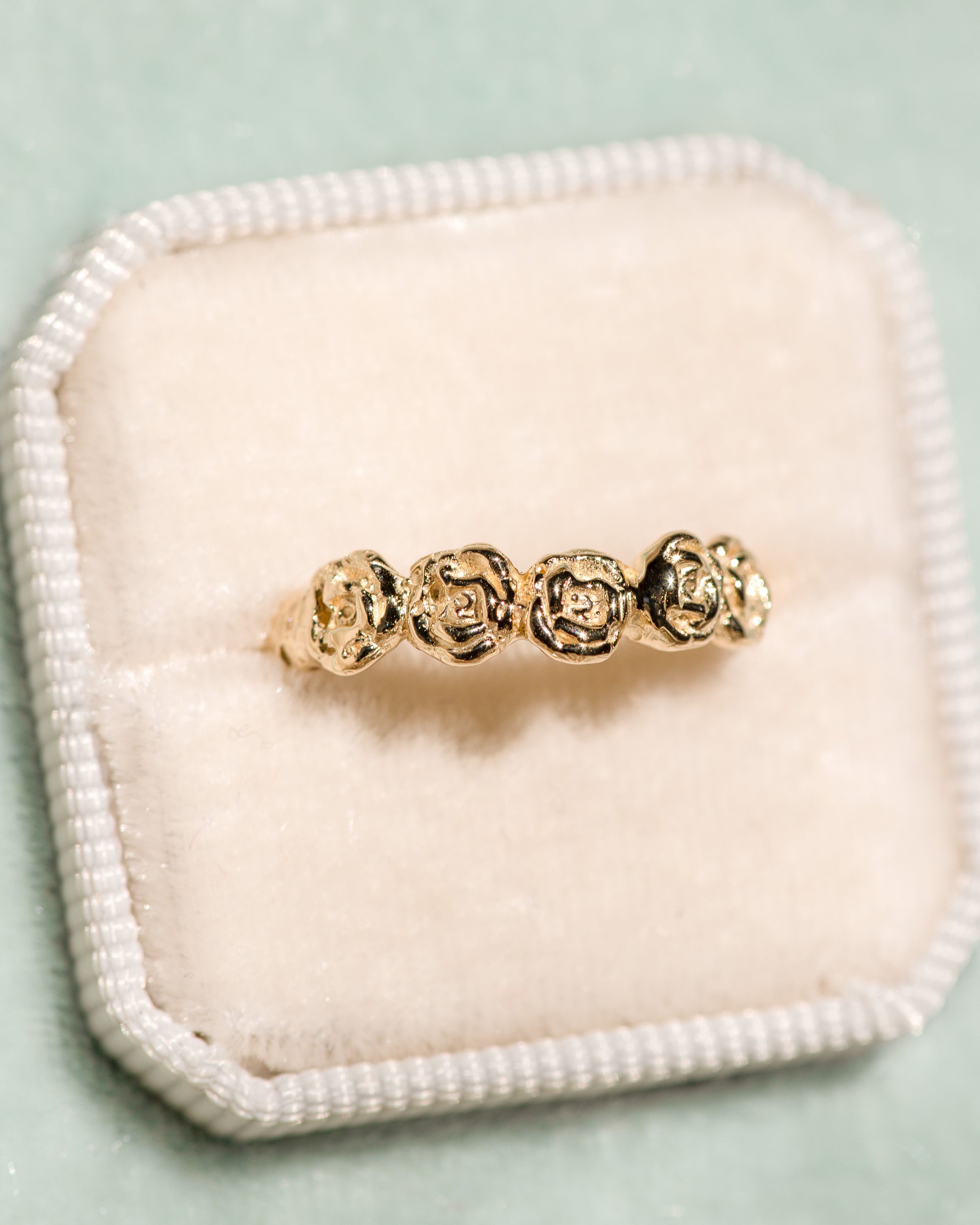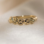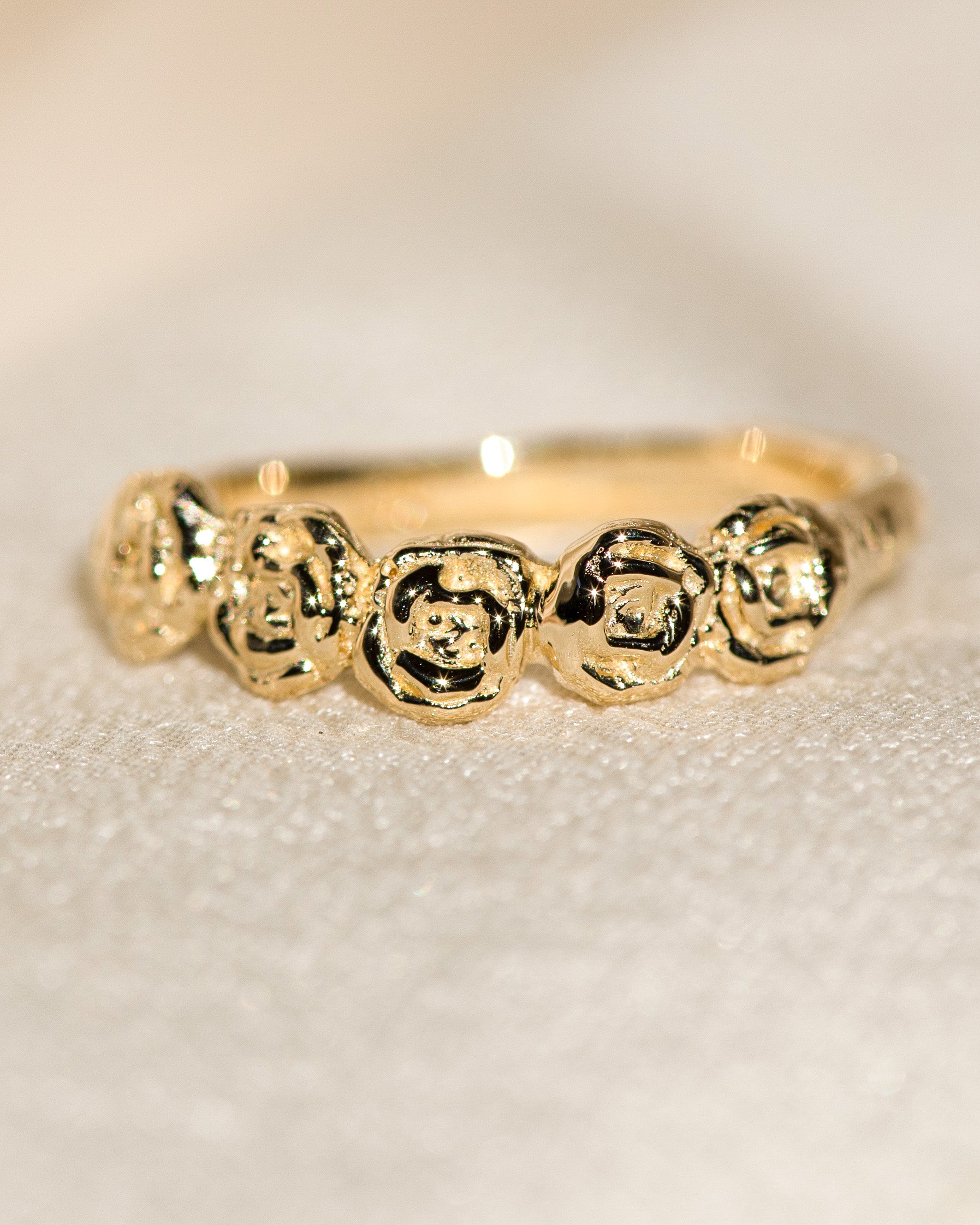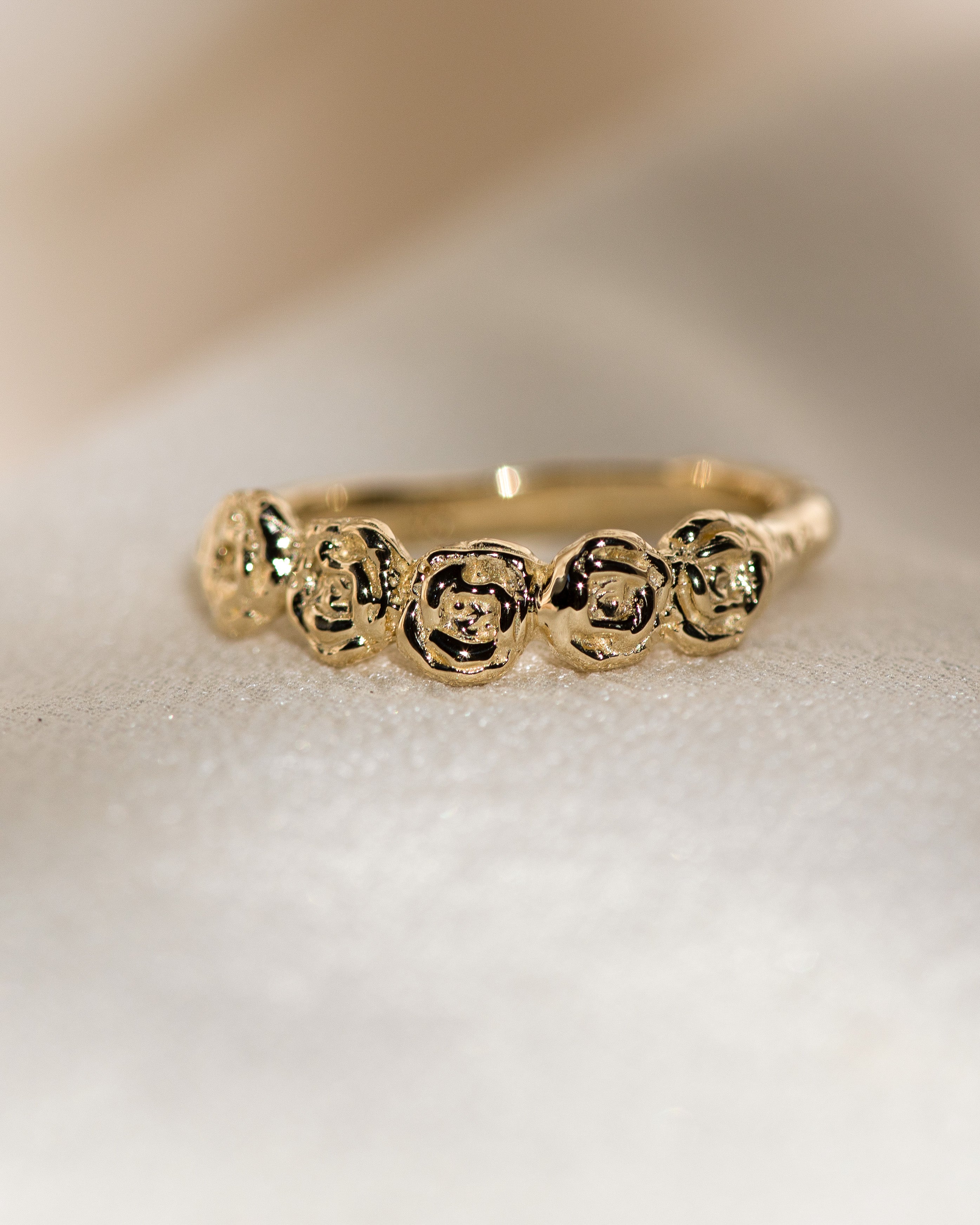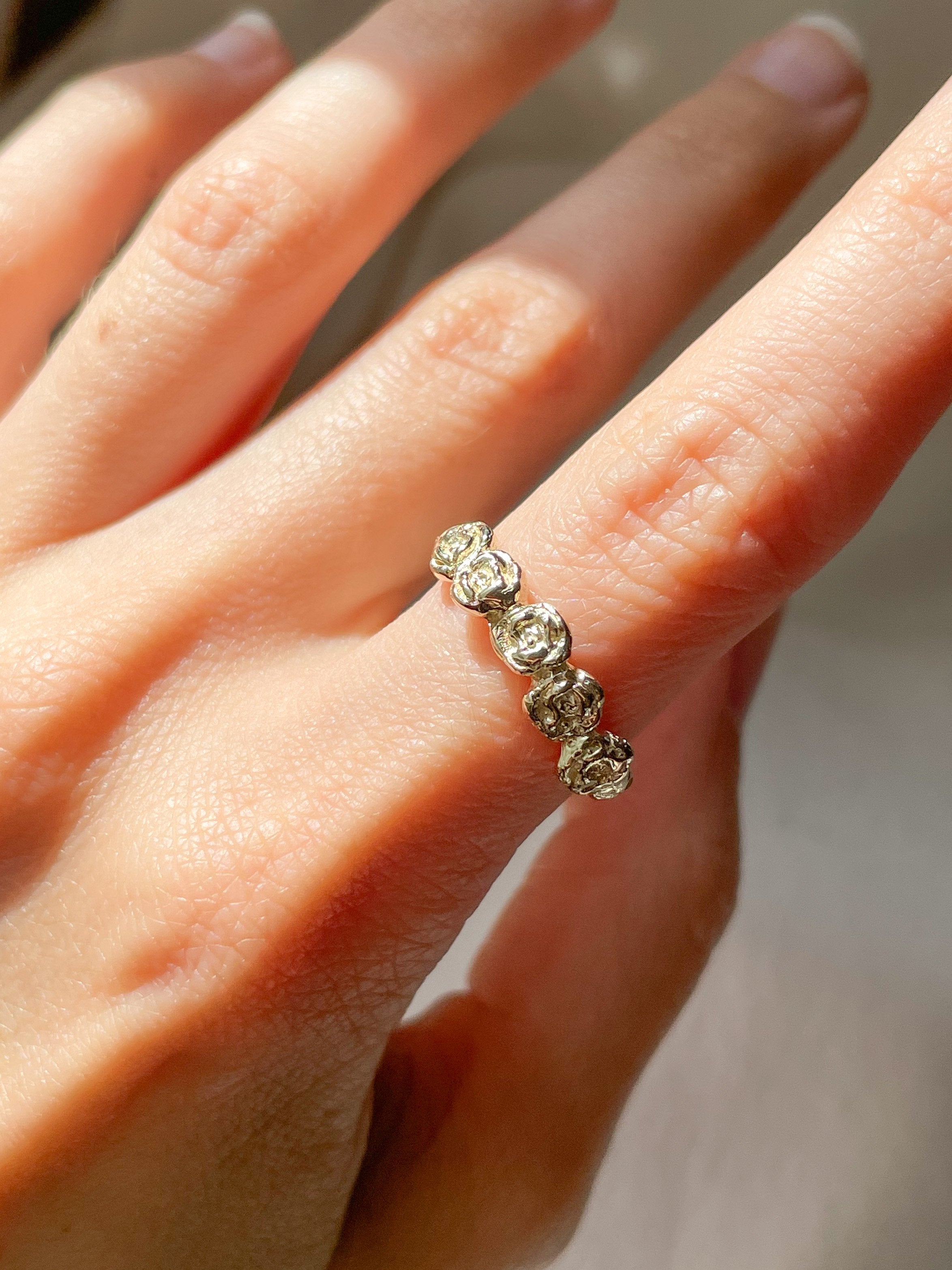 This hand-carved band features a halo of rosebuds, designed to enrapture you within the Divine love of your angels and serve as a reminder of your innate perfection and beauty.