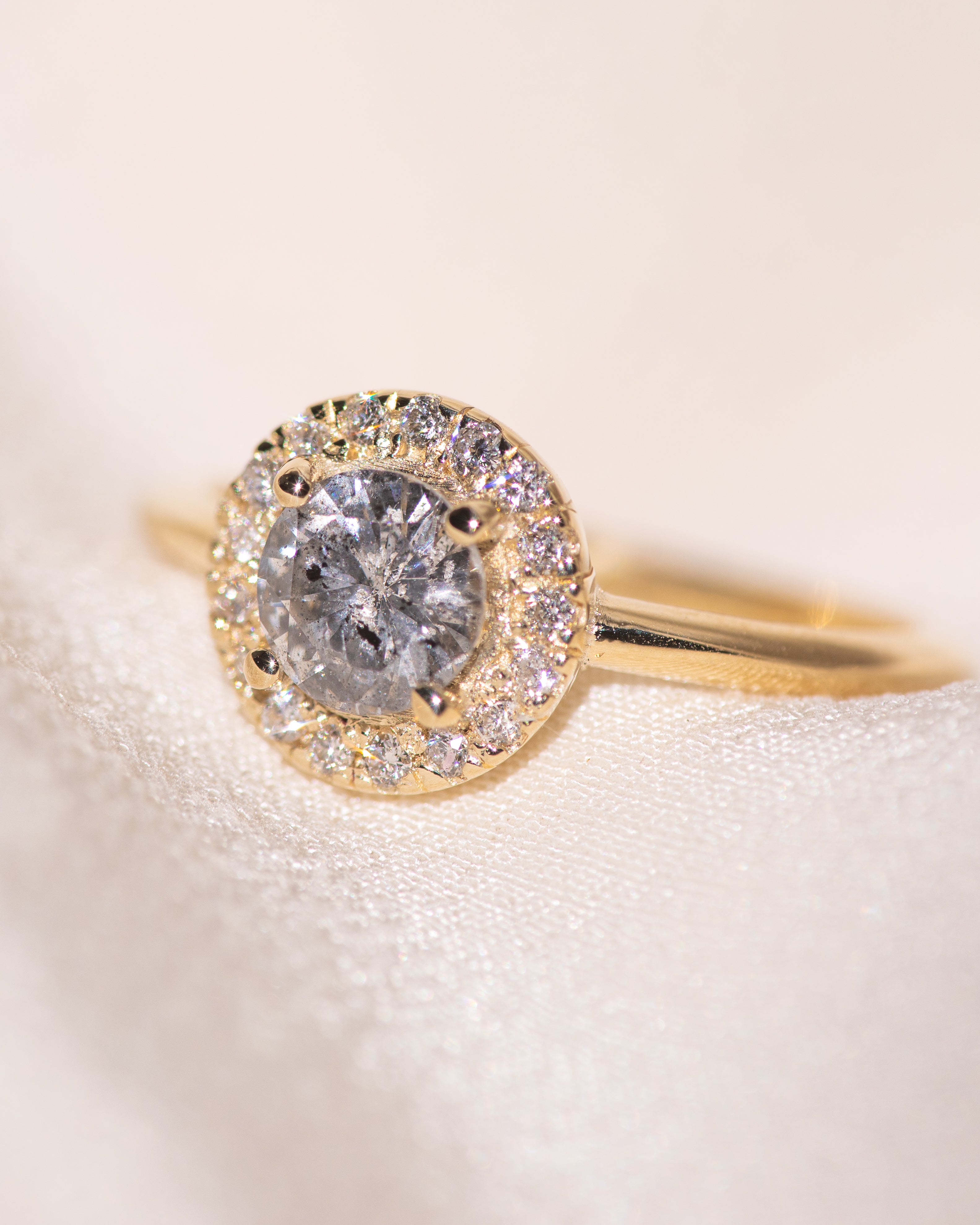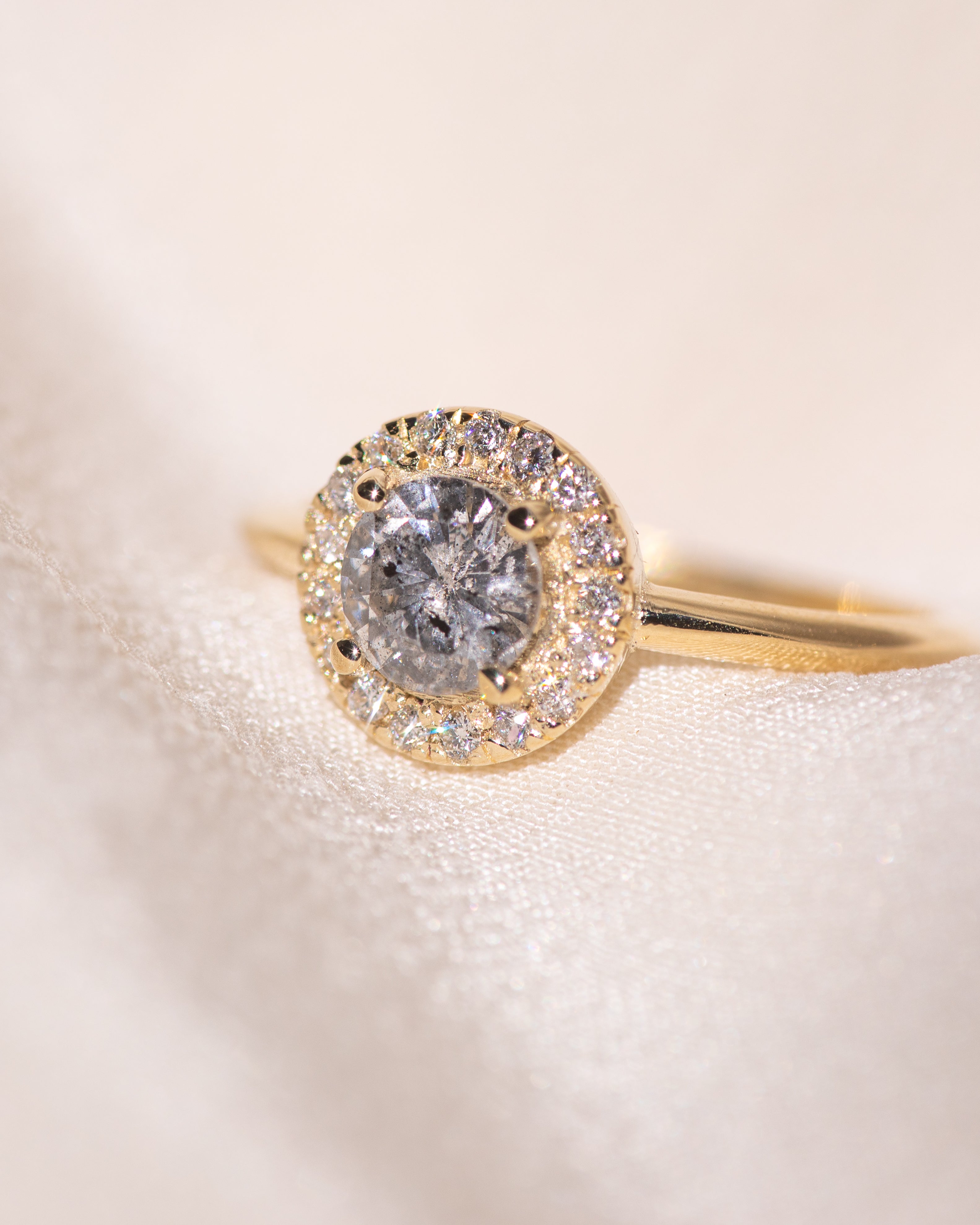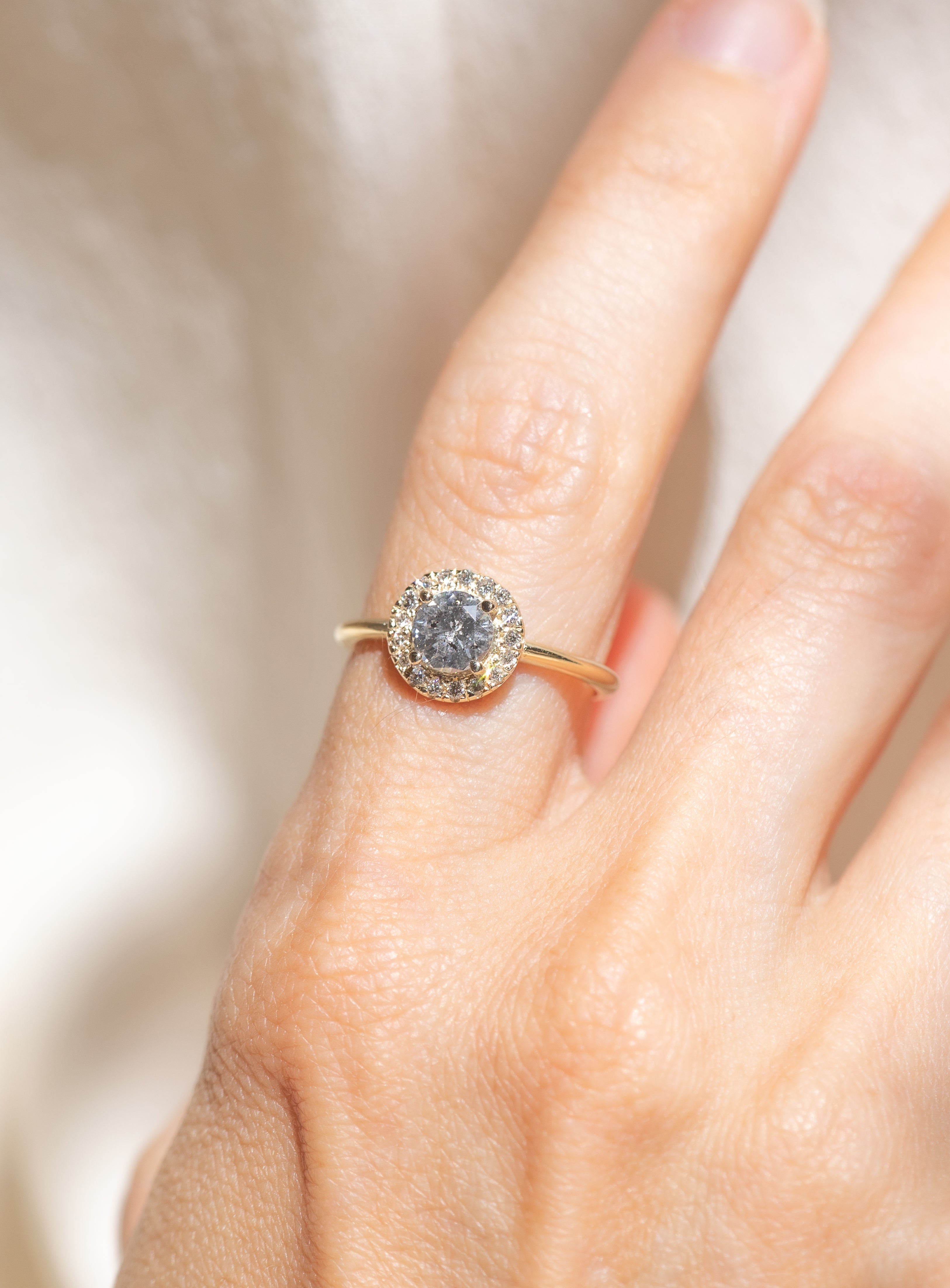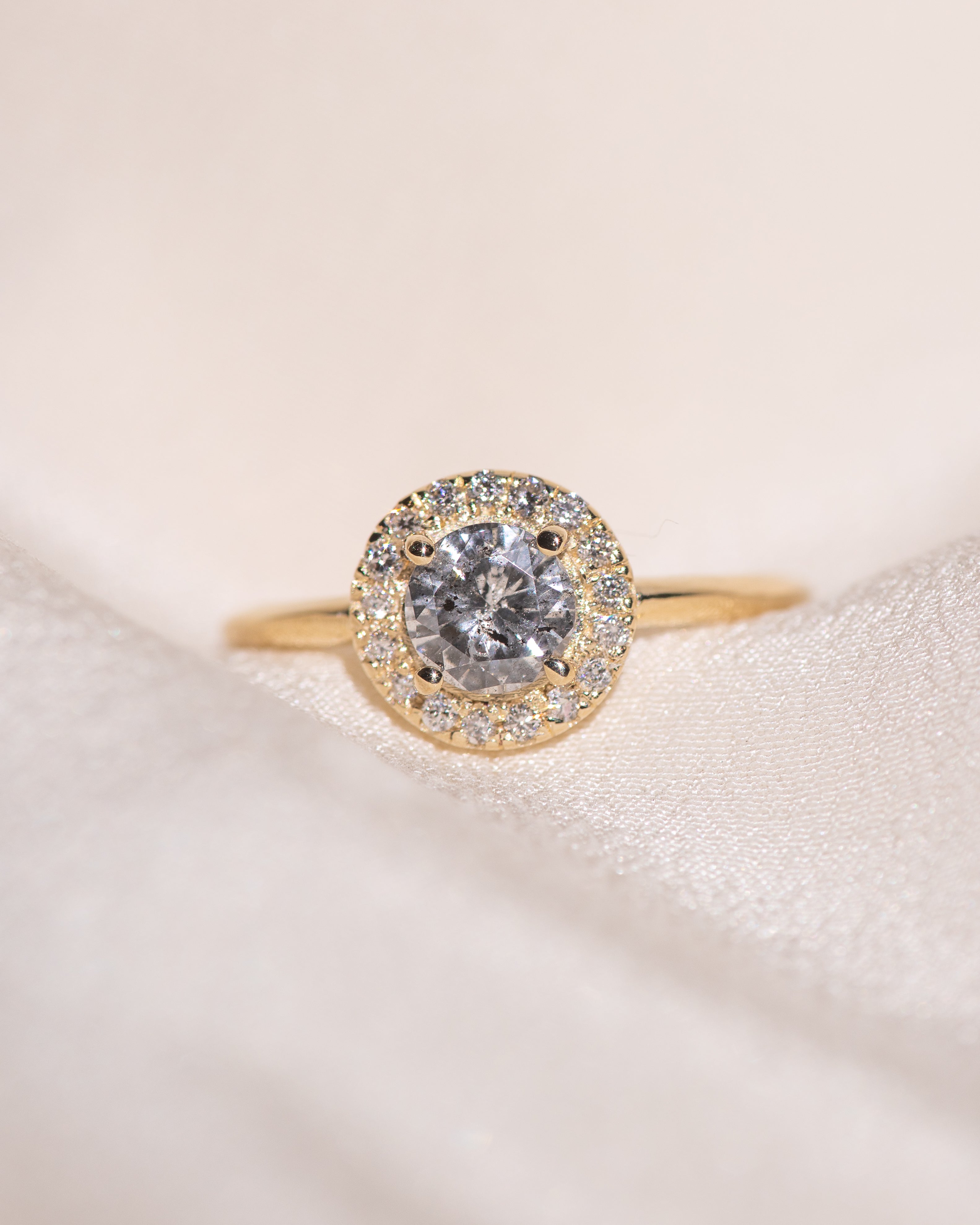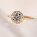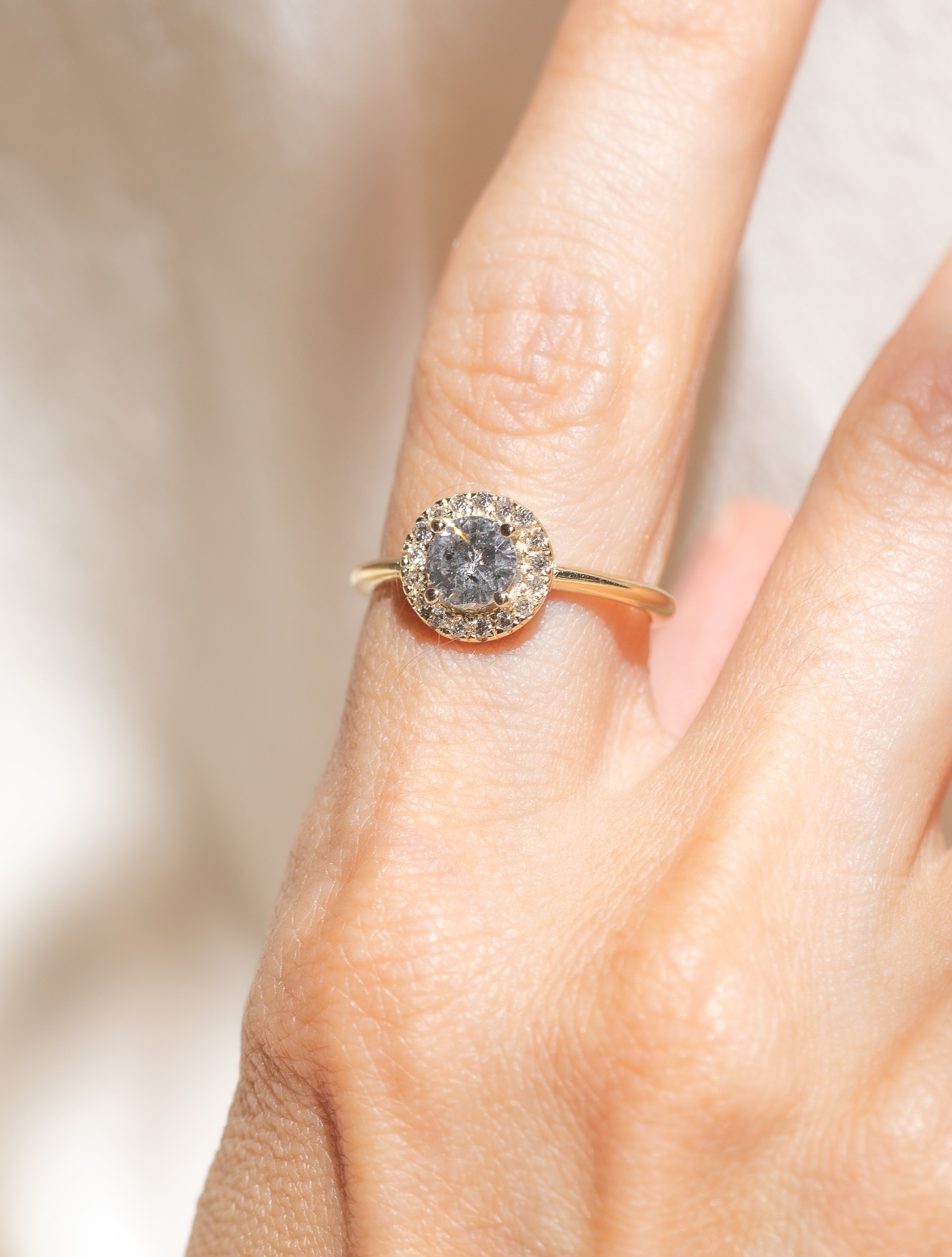 One of a kind 14k Yellow Gold ring featuring a stunning 0.66 CT round Salt & Pepper Diamond, snuggled by a halo of White Diamonds. Created to inspire regality, reminding you of your innate Divinity, to fill you with unconditional love and harmonize your strength, softness and power. Natural inclusions may be present within the stone.