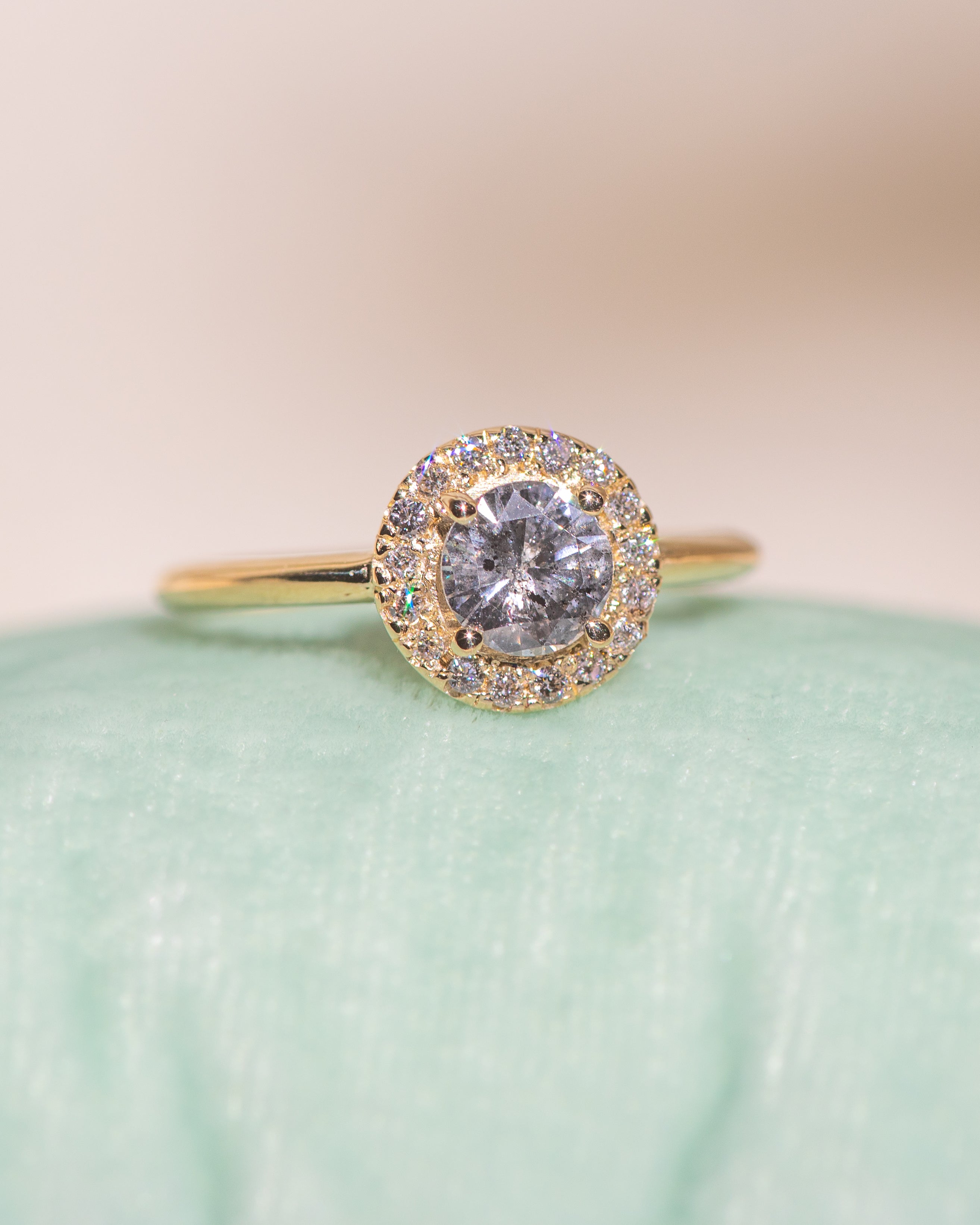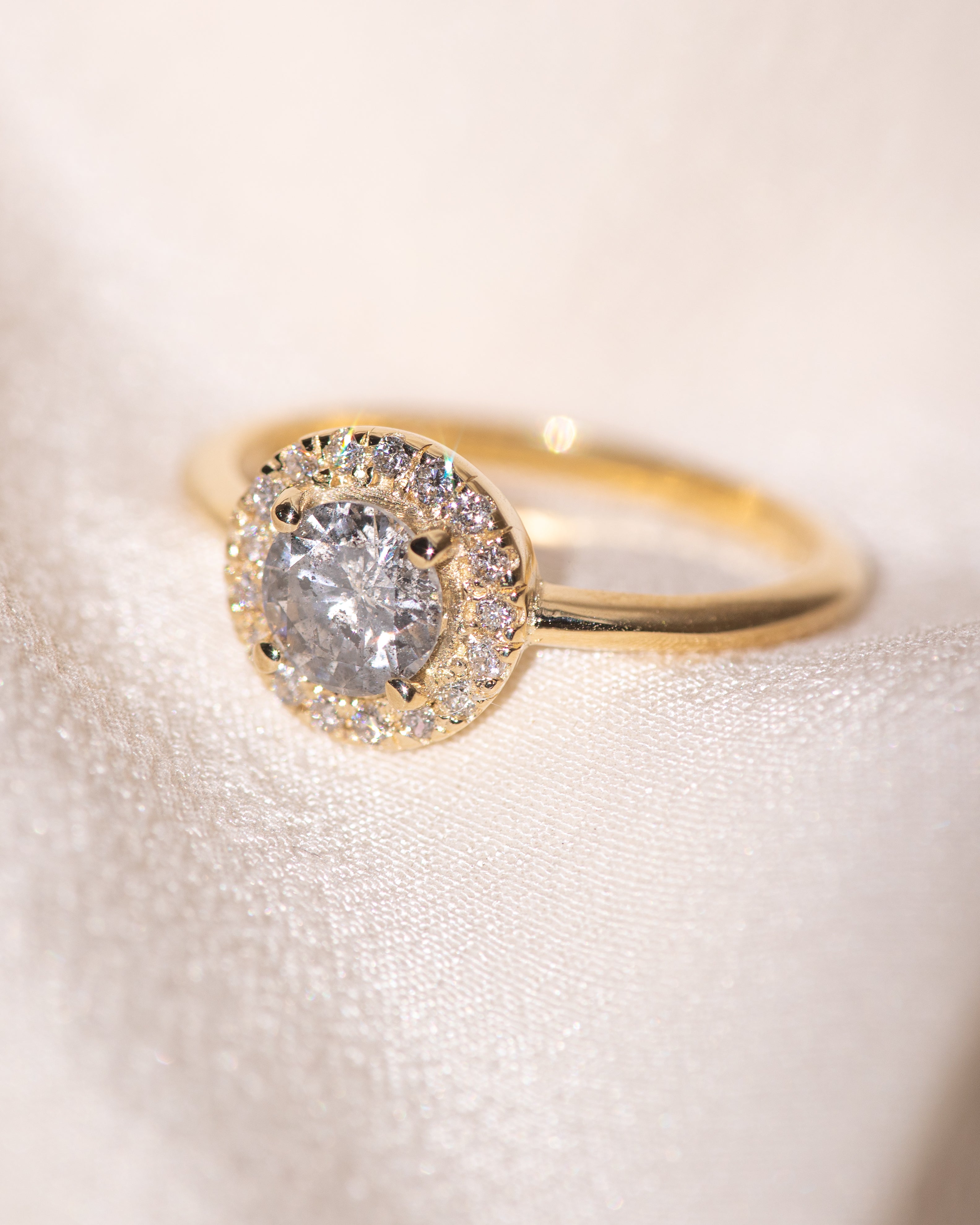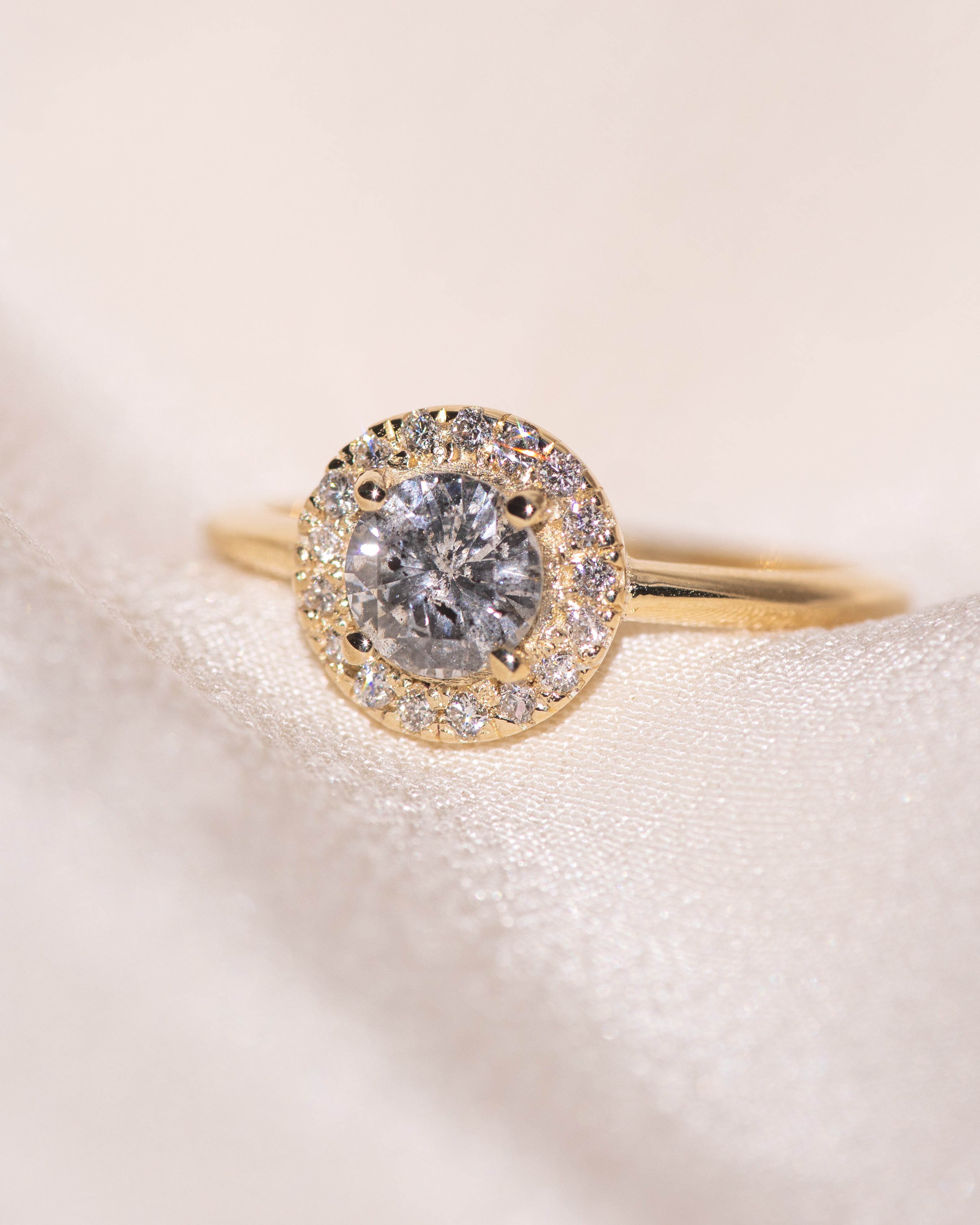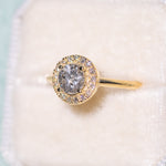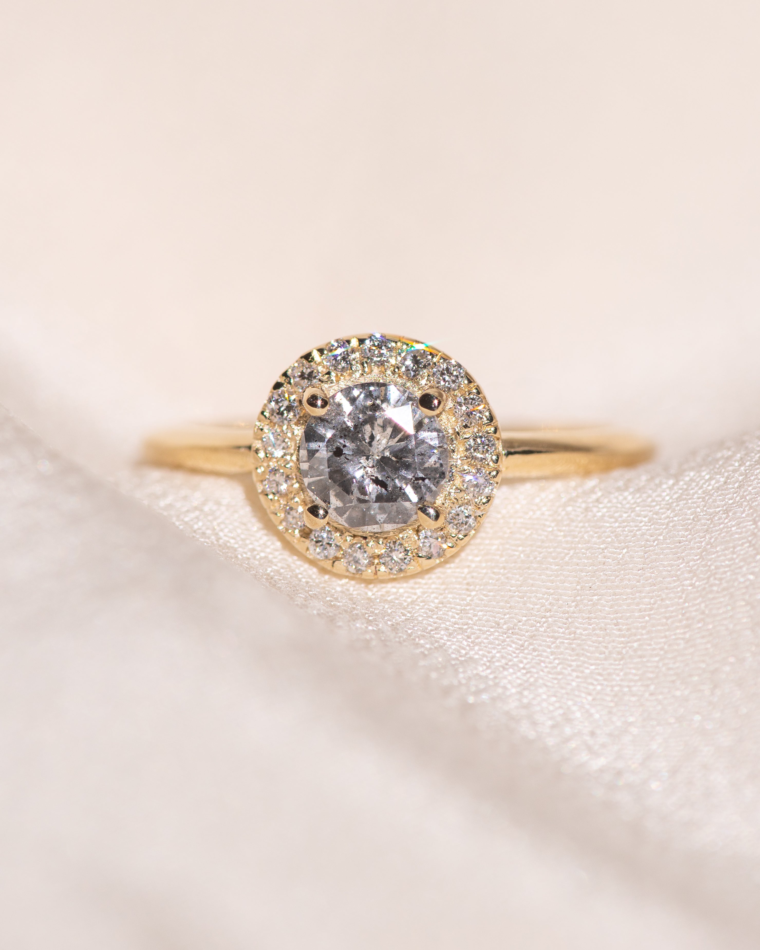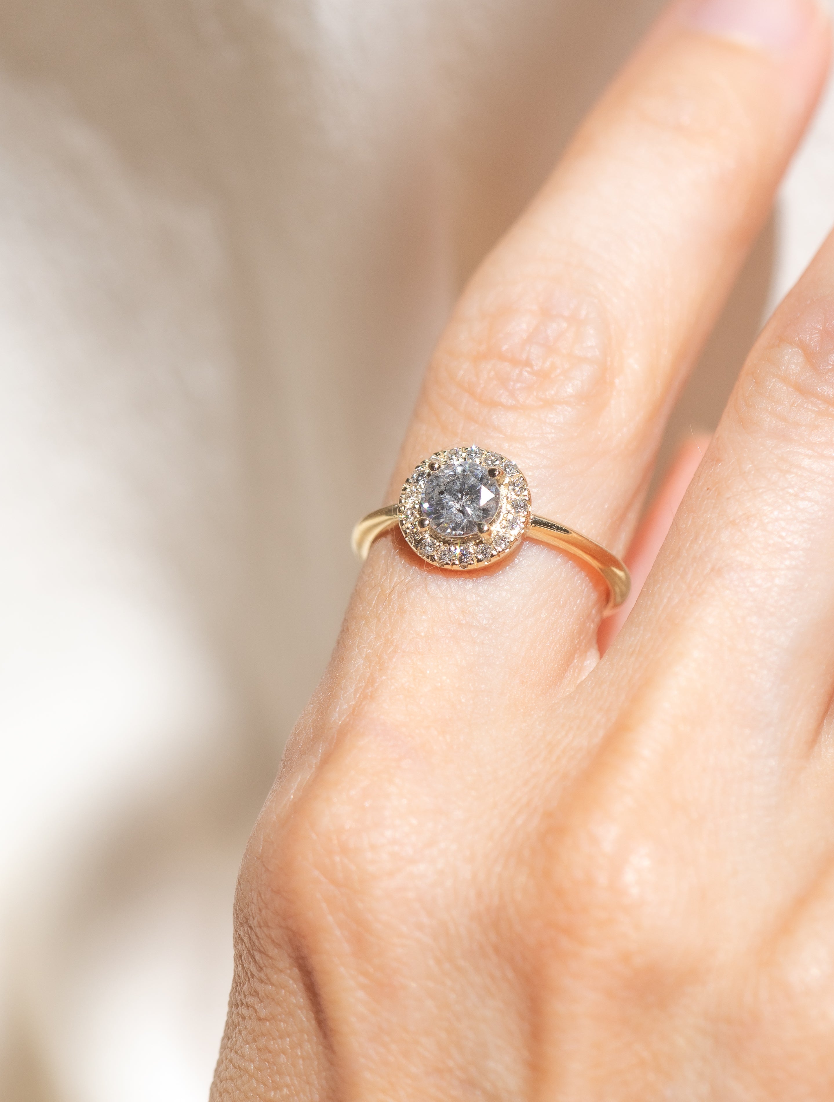 One of a kind 14k Yellow Gold ring featuring a stunning 0.66 CT round Salt & Pepper Diamond, snuggled by a halo of White Diamonds. Created to inspire regality, reminding you of your innate Divinity, to fill you with unconditional love and harmonize your strength, softness and power. Natural inclusions may be present within the stone.