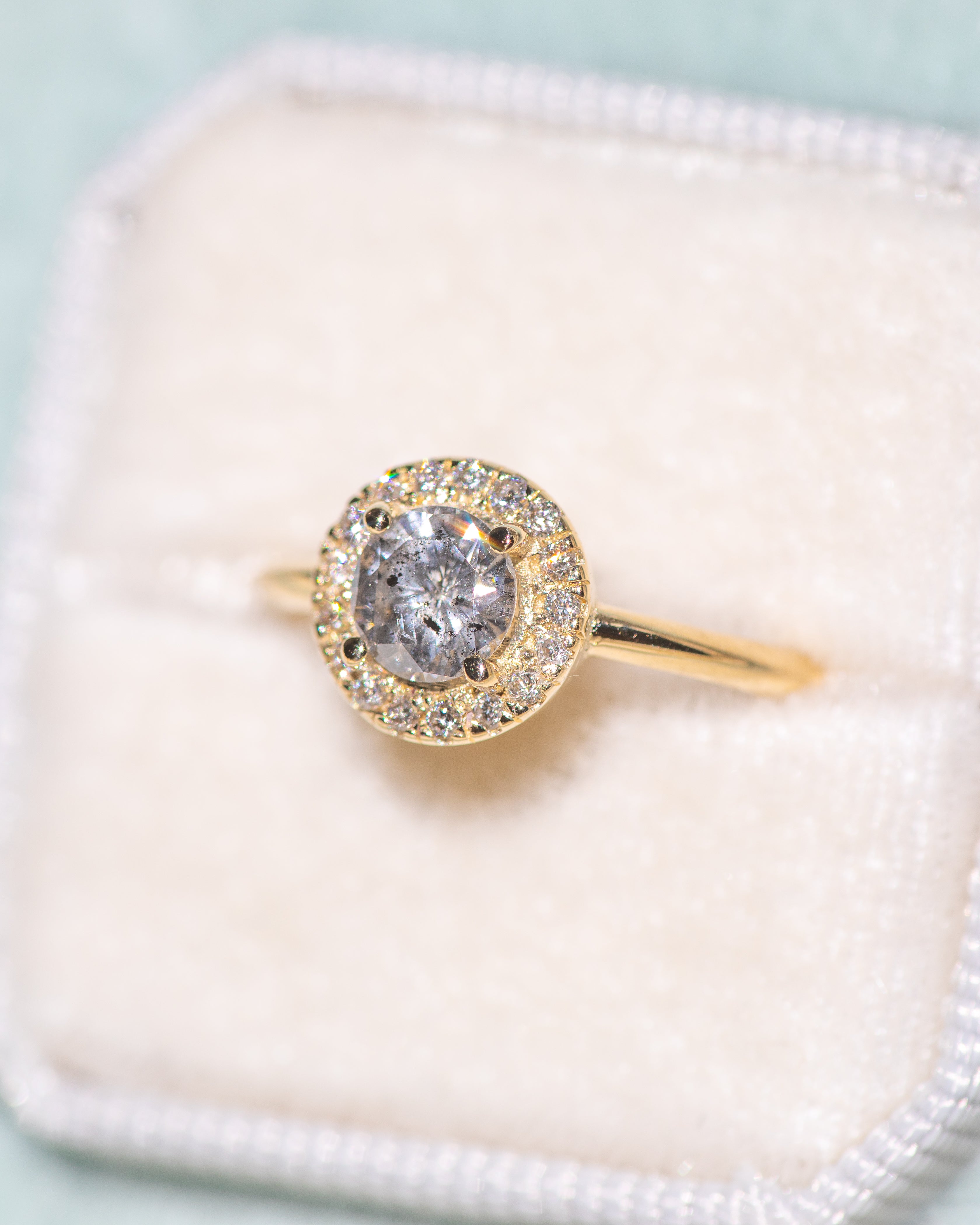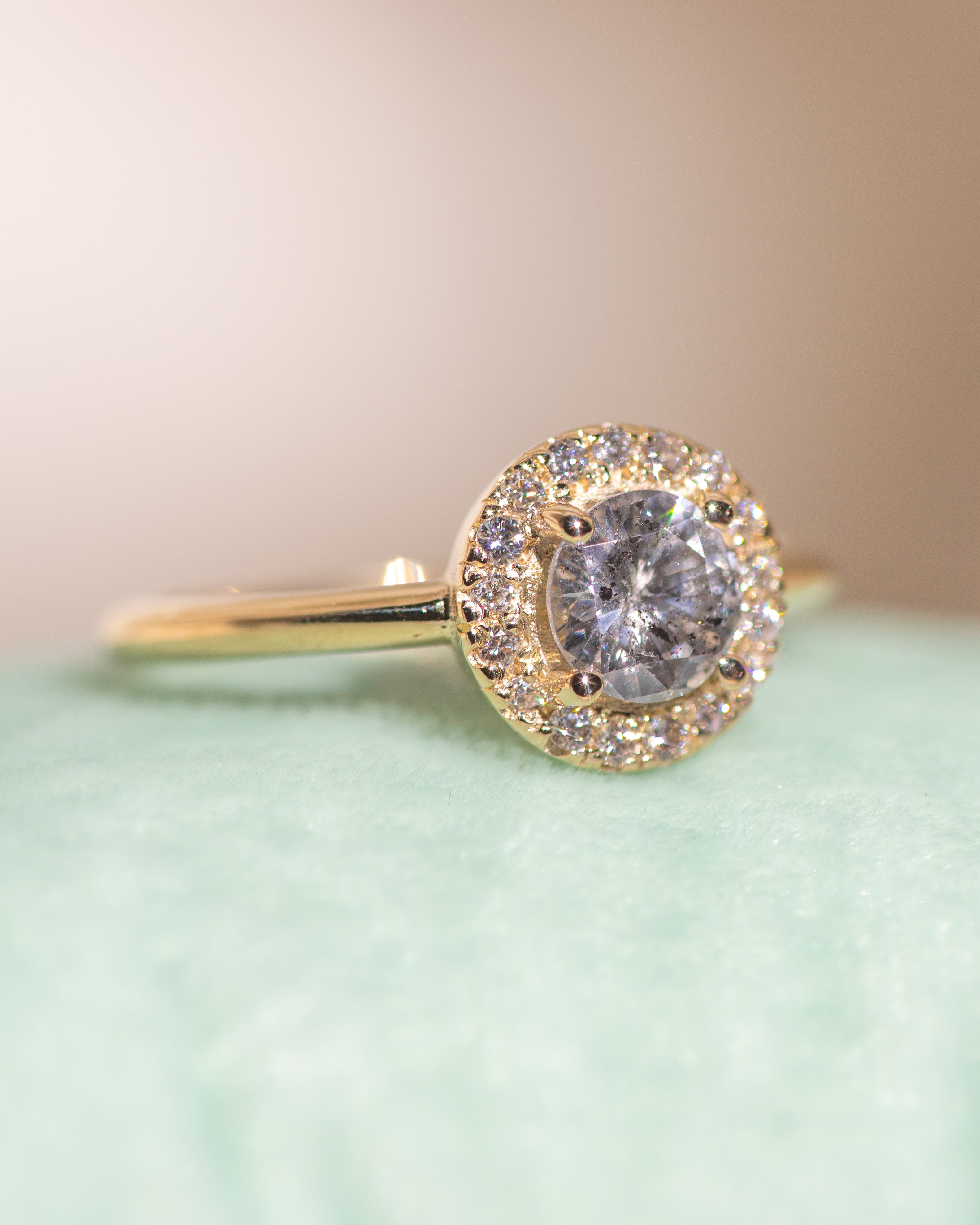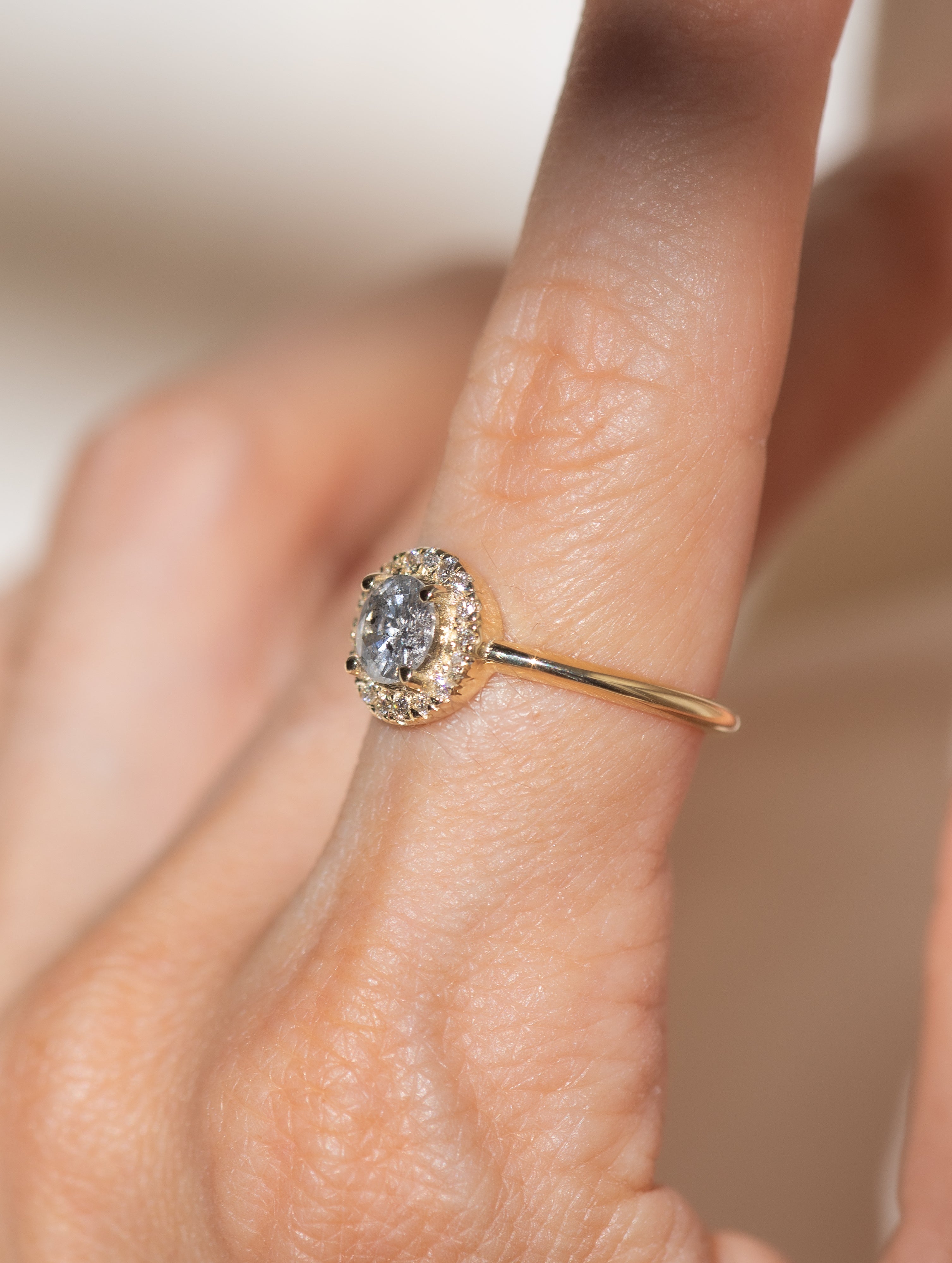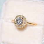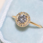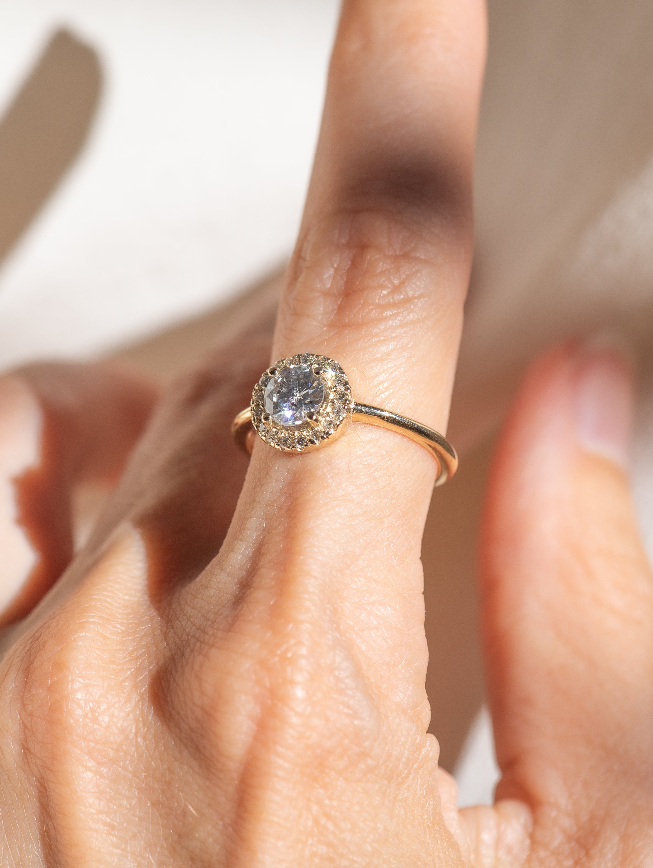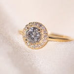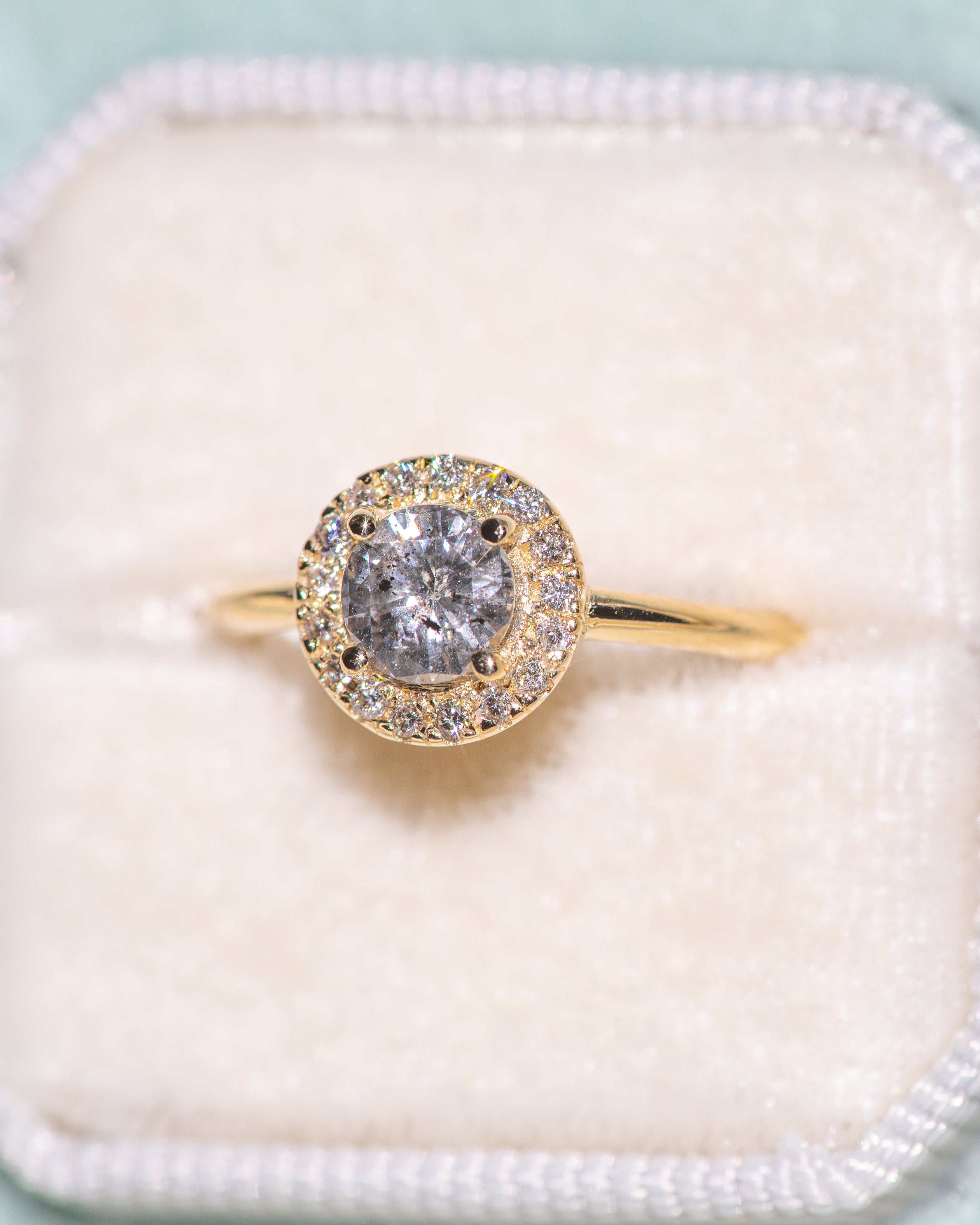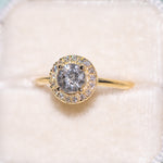 One of a kind 14k Yellow Gold ring featuring a stunning 0.66 CT round Salt & Pepper Diamond, snuggled by a halo of White Diamonds. Created to inspire regality, reminding you of your innate Divinity, to fill you with unconditional love and harmonize your strength, softness and power. Natural inclusions may be present within the stone.