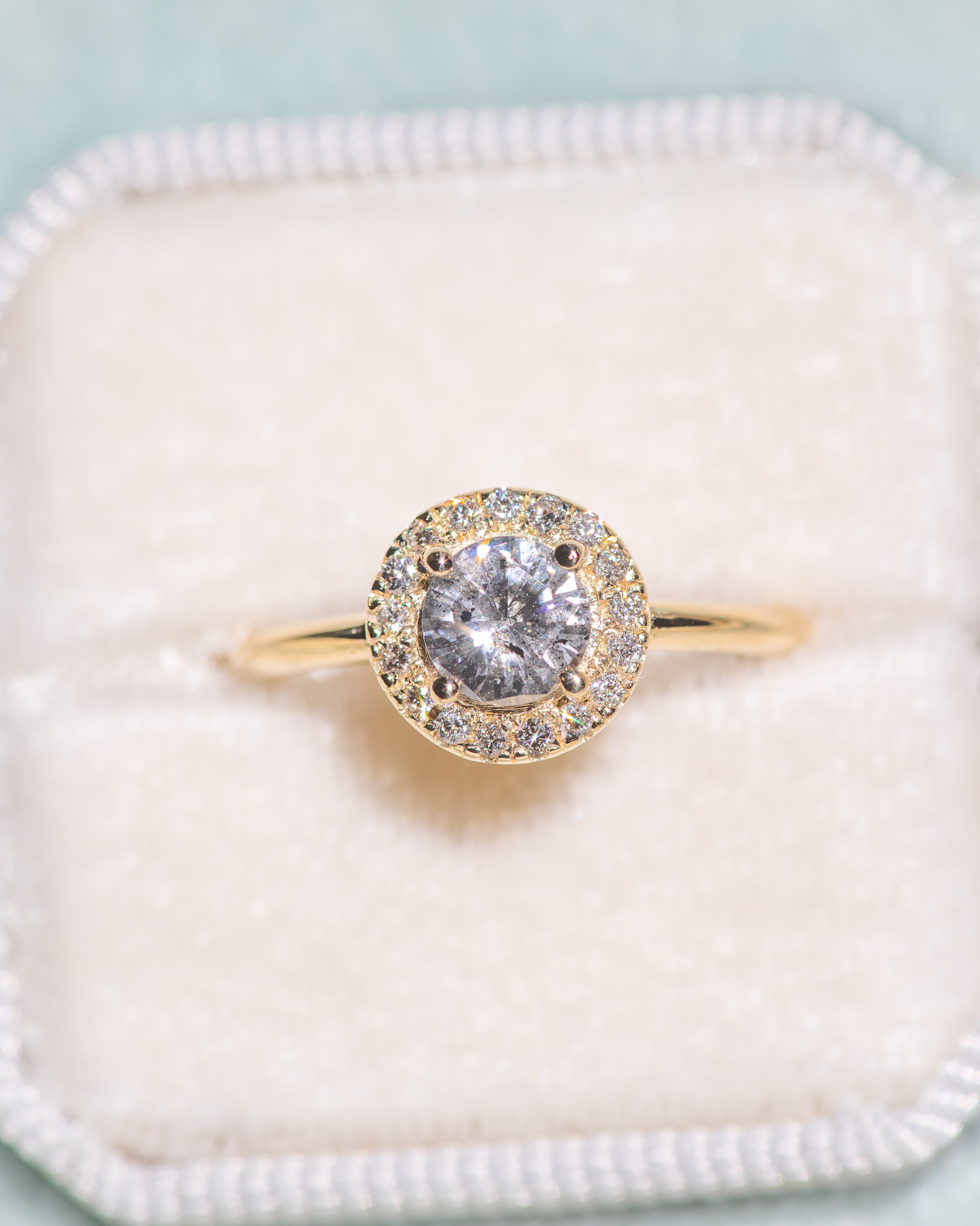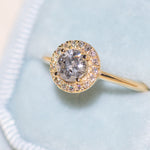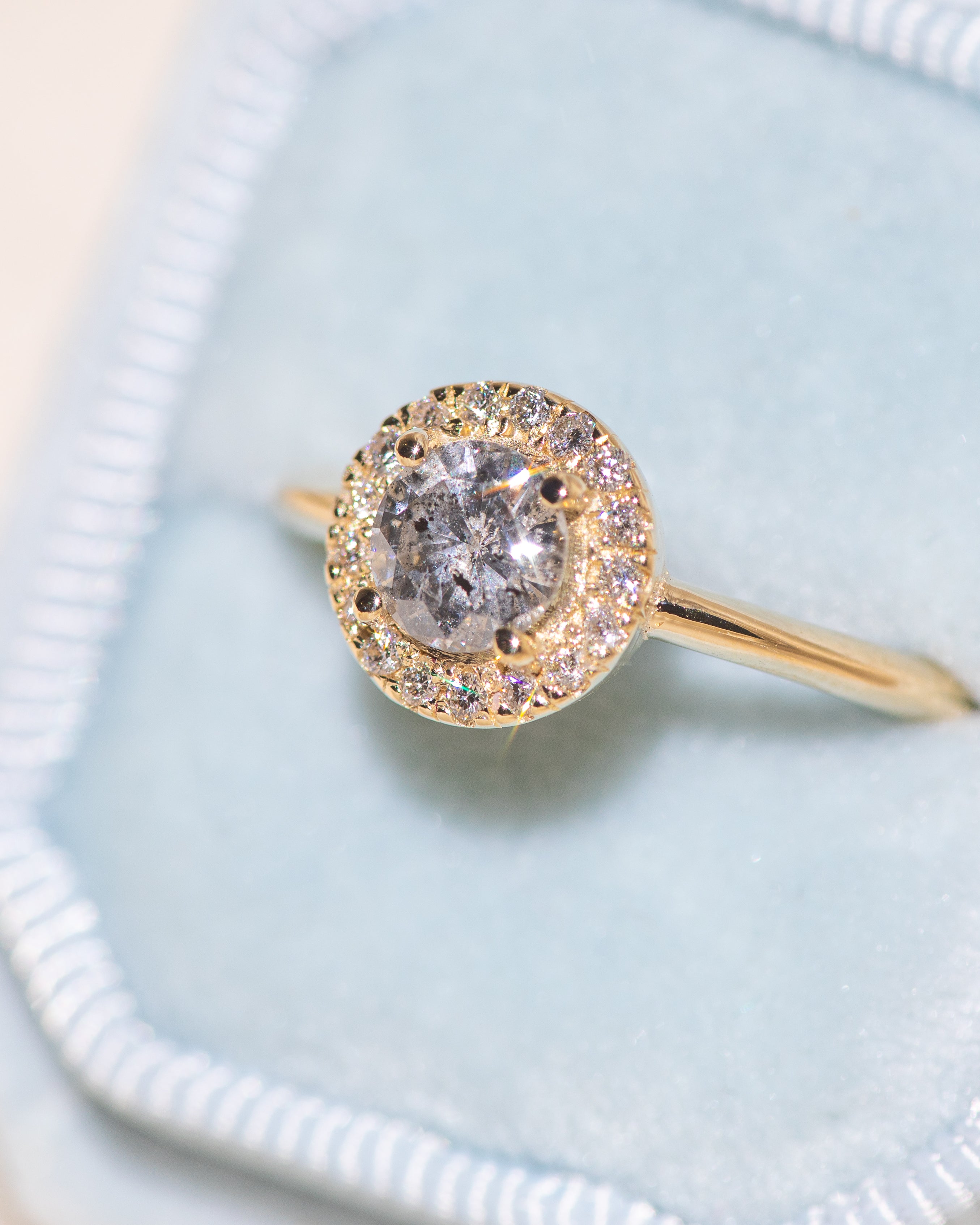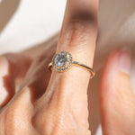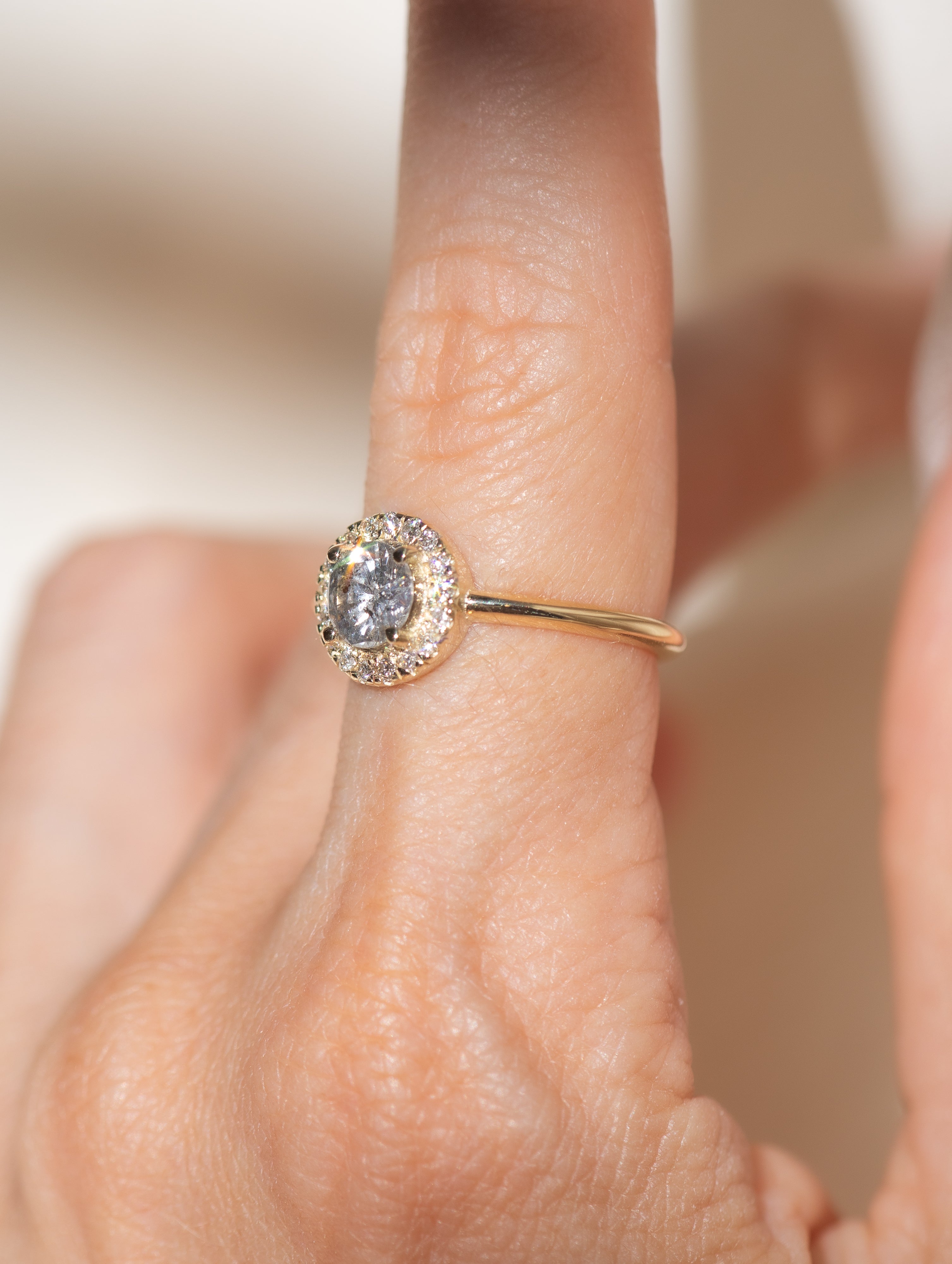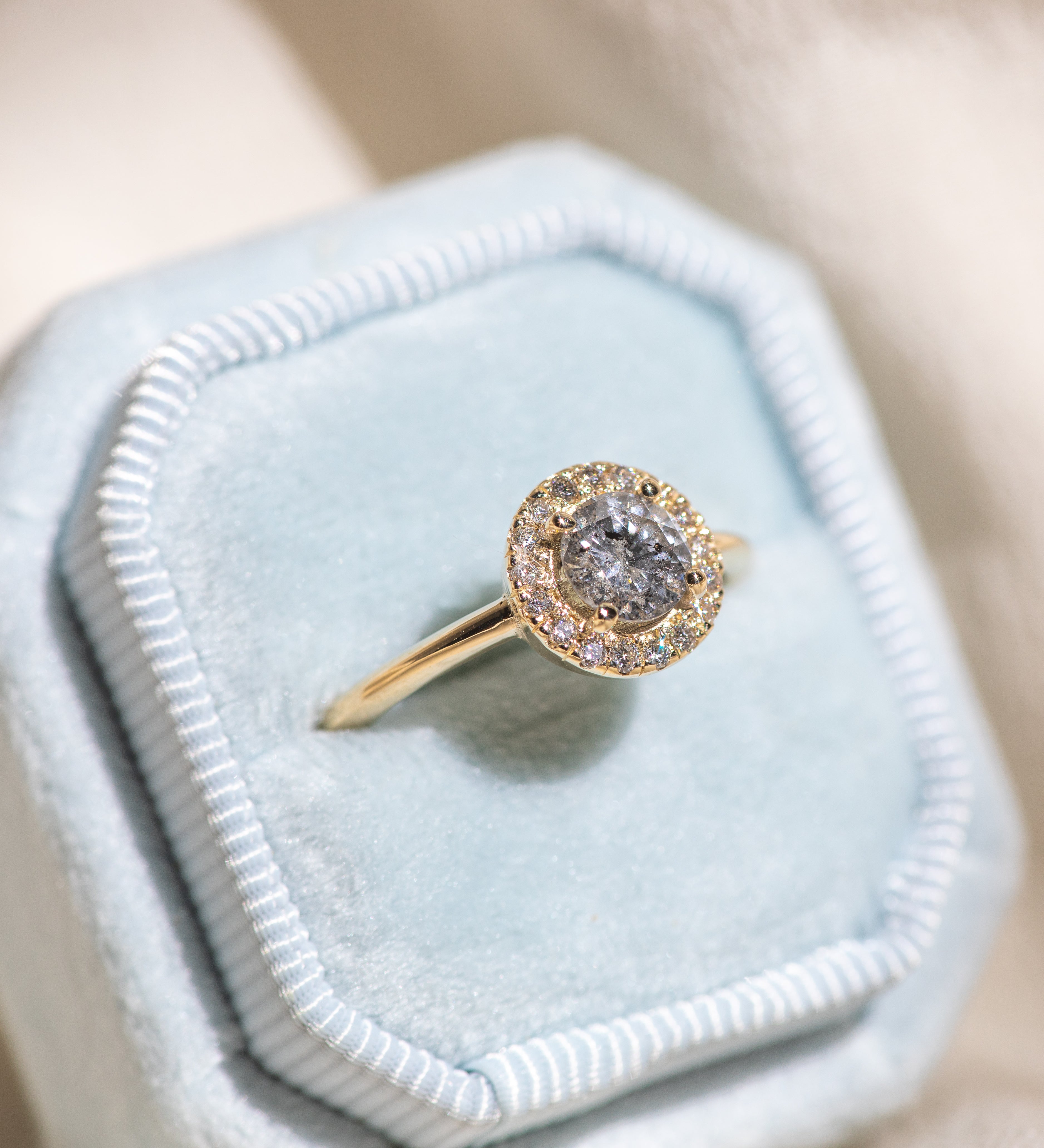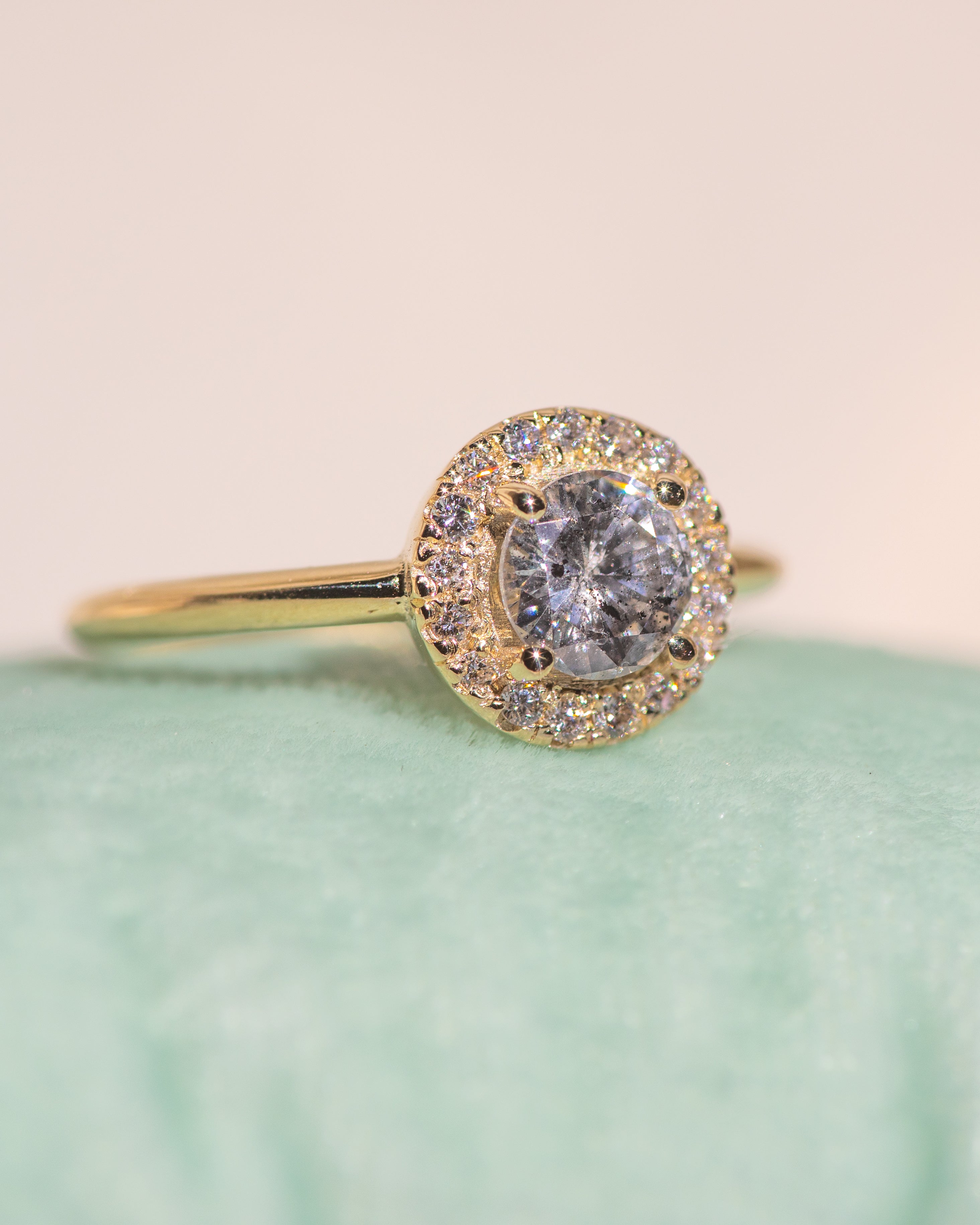One of a kind 14k Yellow Gold ring featuring a stunning 0.66 CT round Salt & Pepper Diamond, snuggled by a halo of White Diamonds. Created to inspire regality, reminding you of your innate Divinity, to fill you with unconditional love and harmonize your strength, softness and power. Natural inclusions may be present within the stone.
