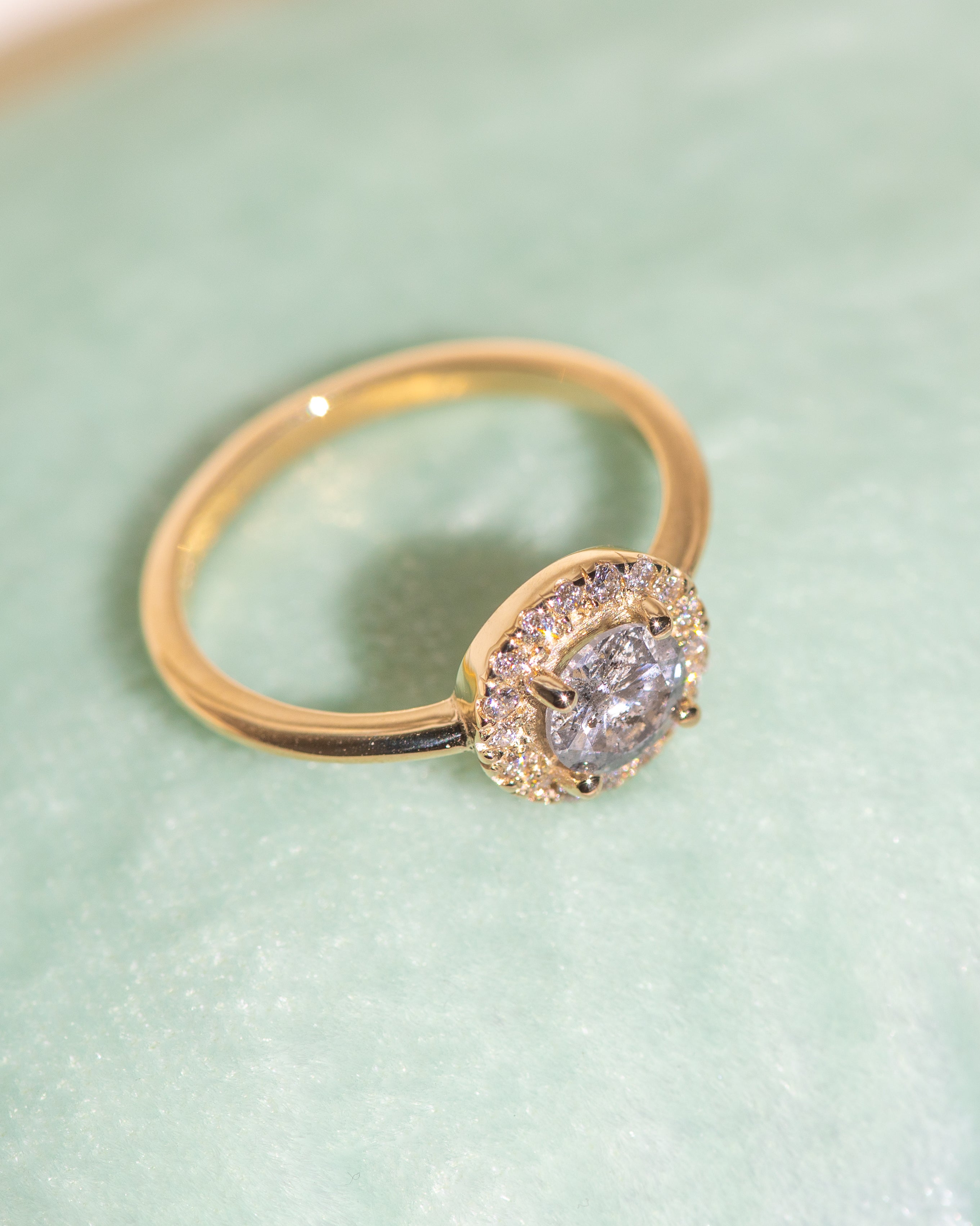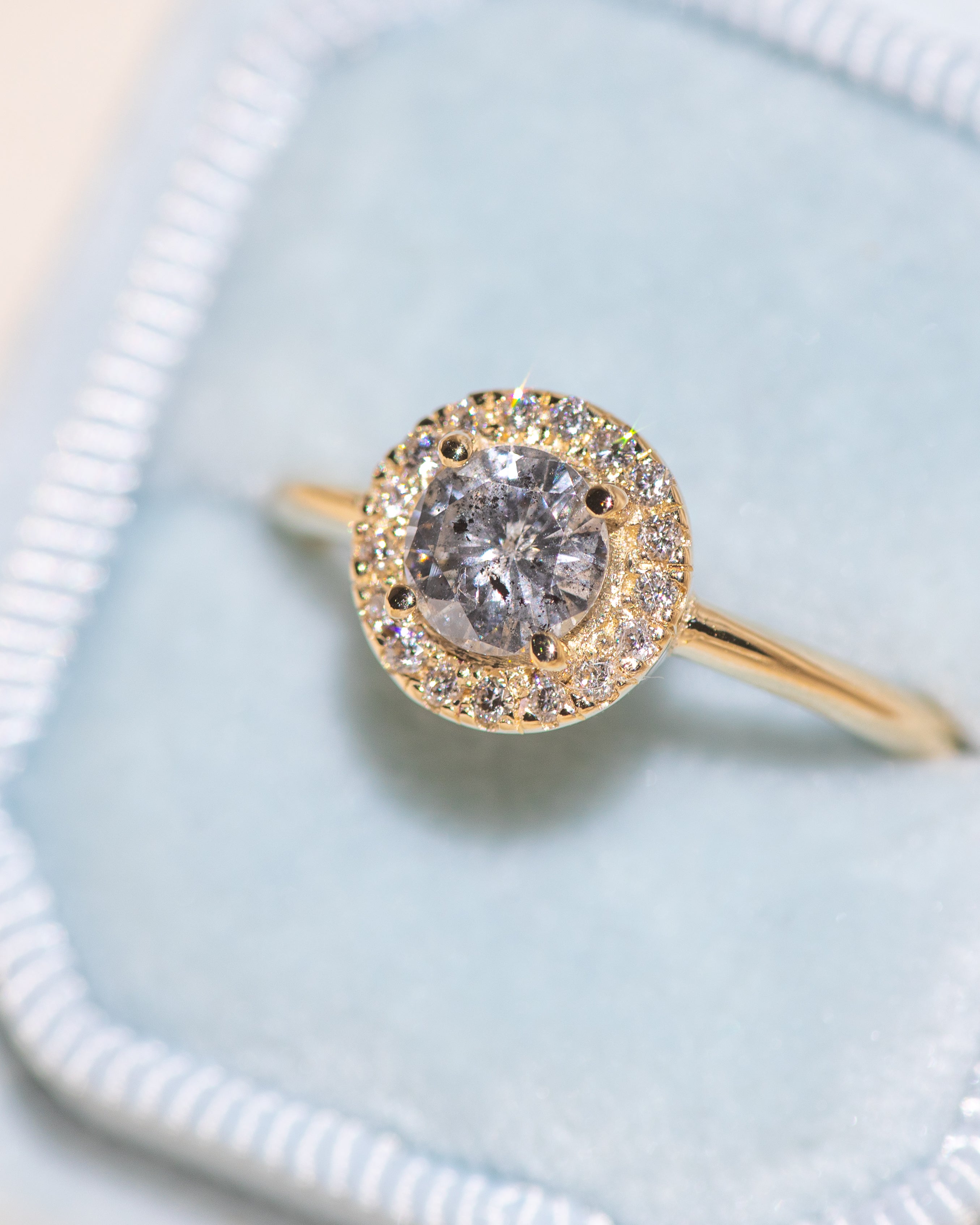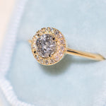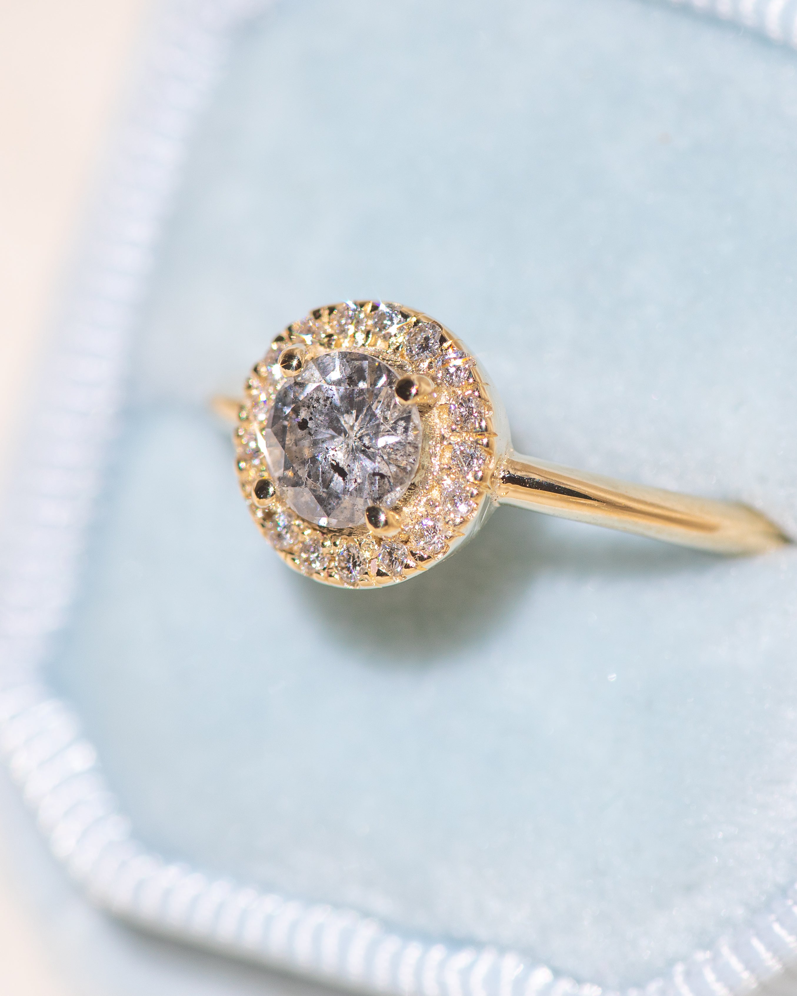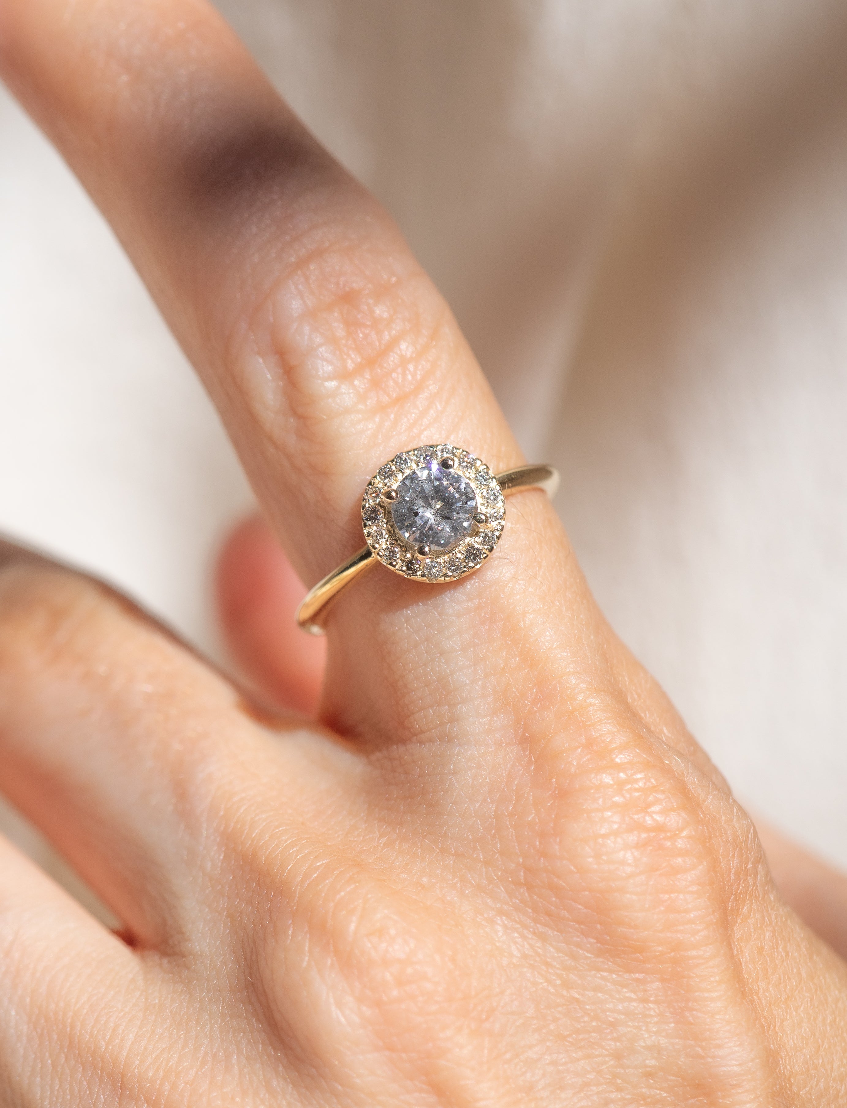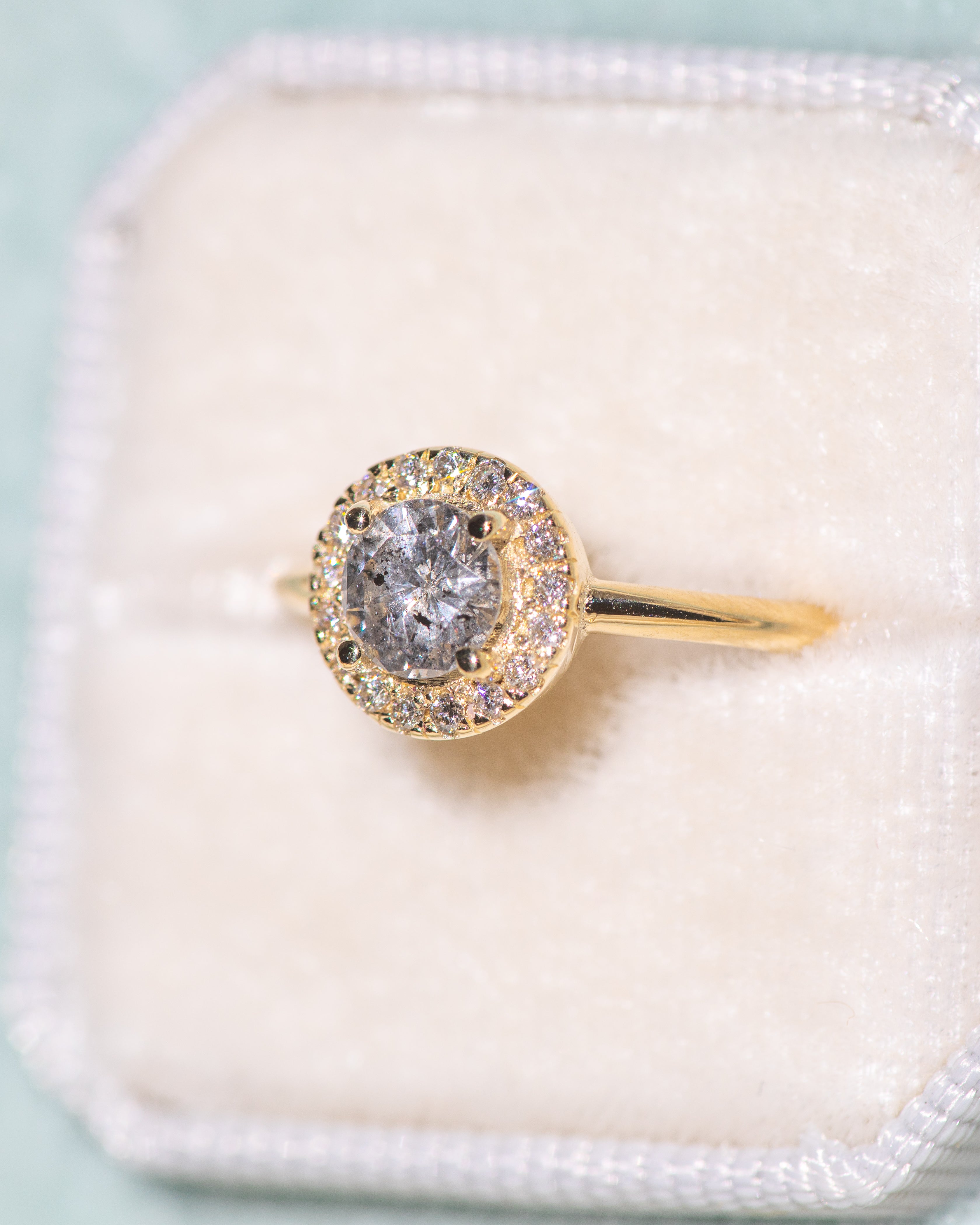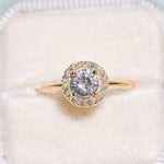 One of a kind 14k Yellow Gold ring featuring a stunning 0.66 CT round Salt & Pepper Diamond, snuggled by a halo of White Diamonds. Created to inspire regality, reminding you of your innate Divinity, to fill you with unconditional love and harmonize your strength, softness and power. Natural inclusions may be present within the stone.
