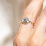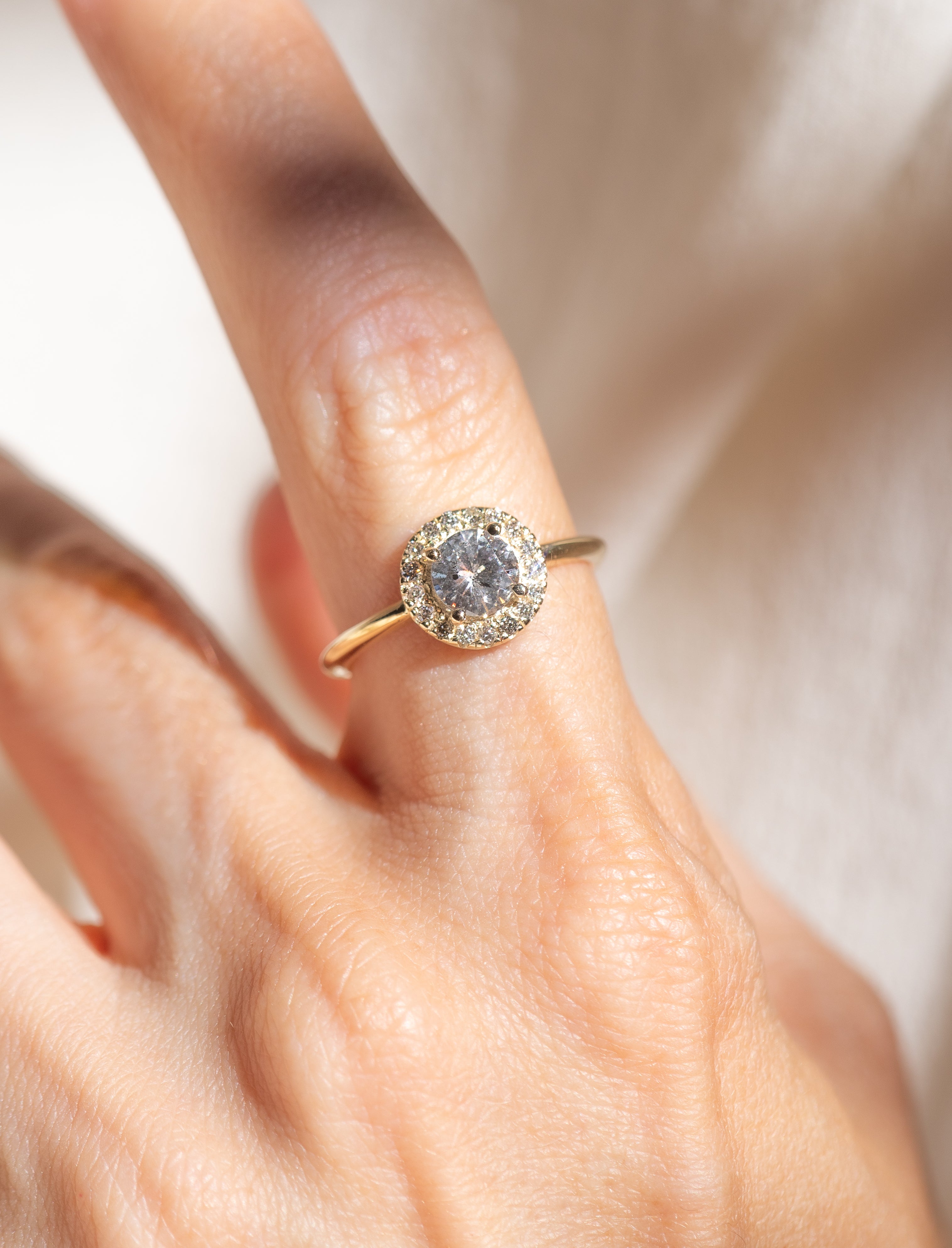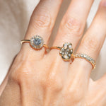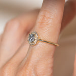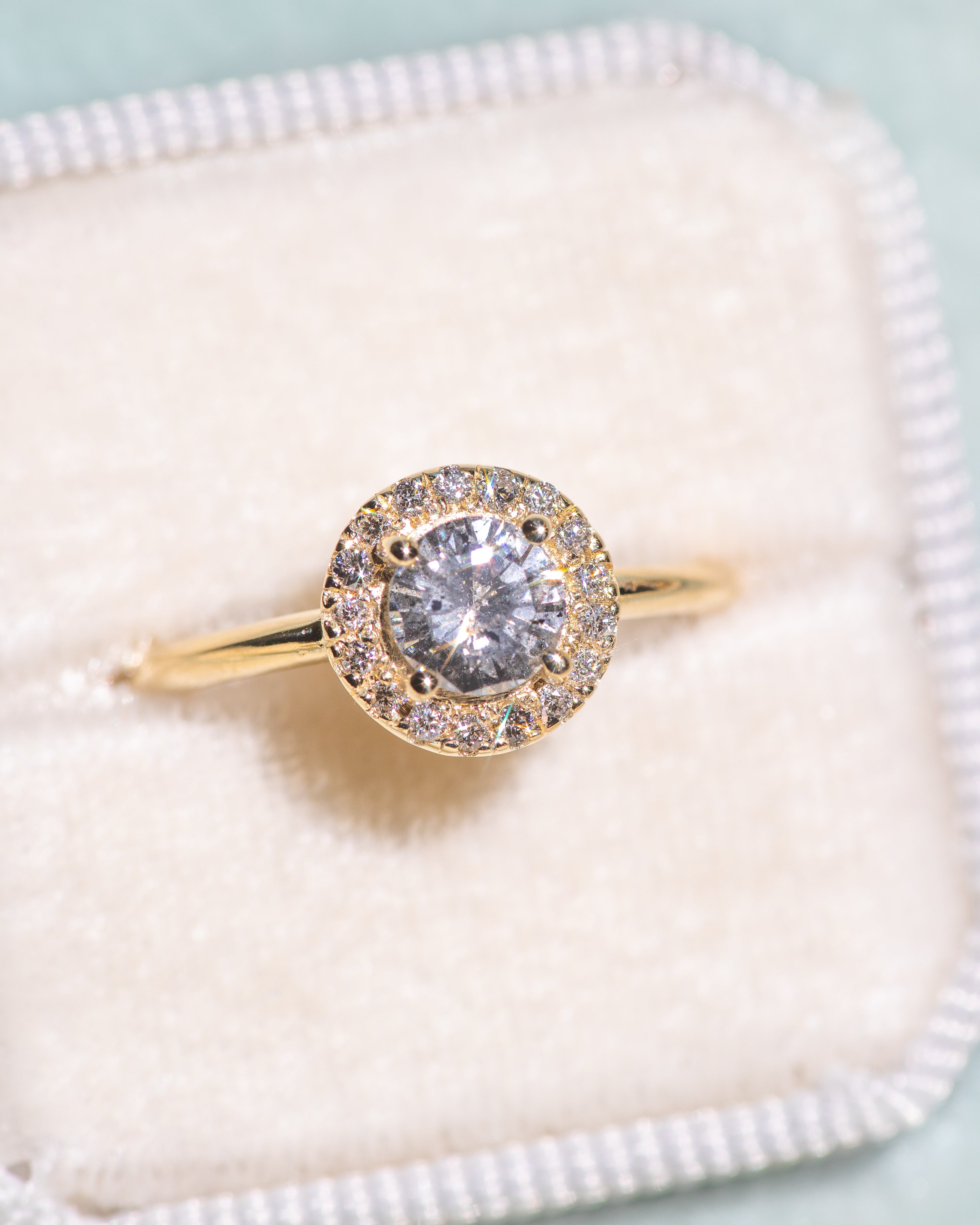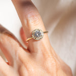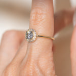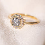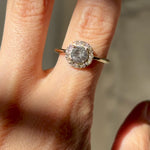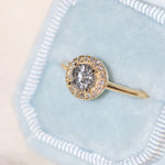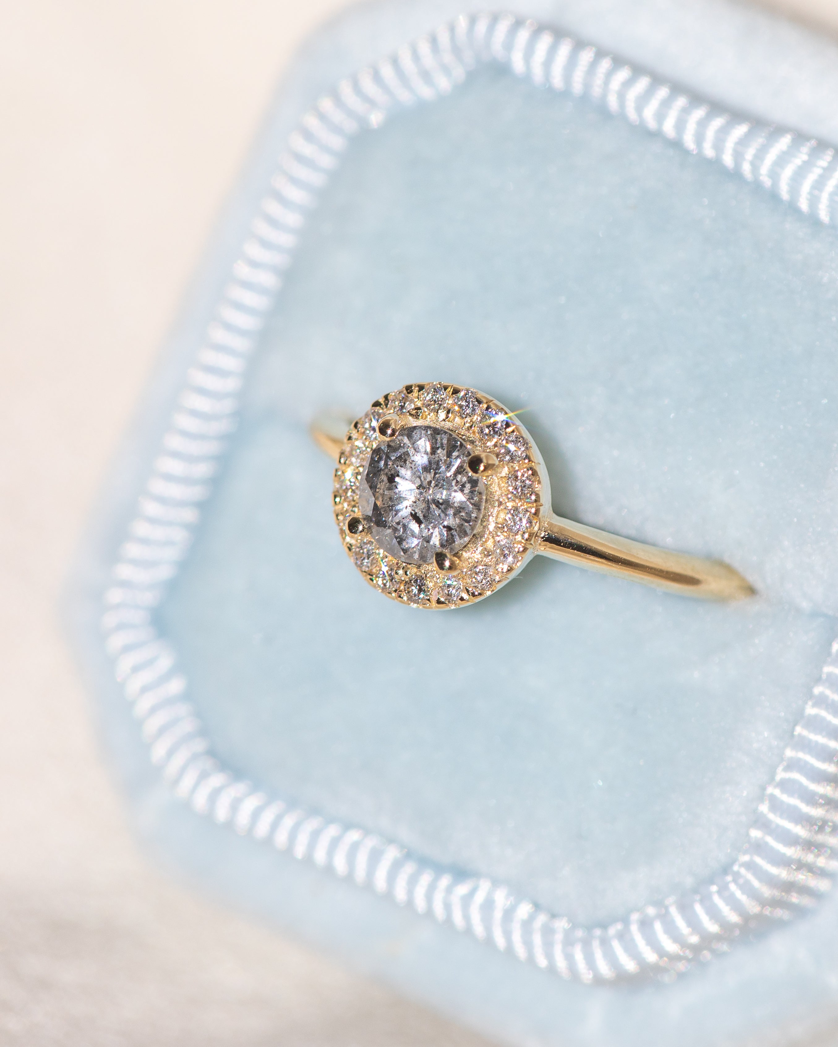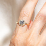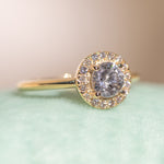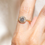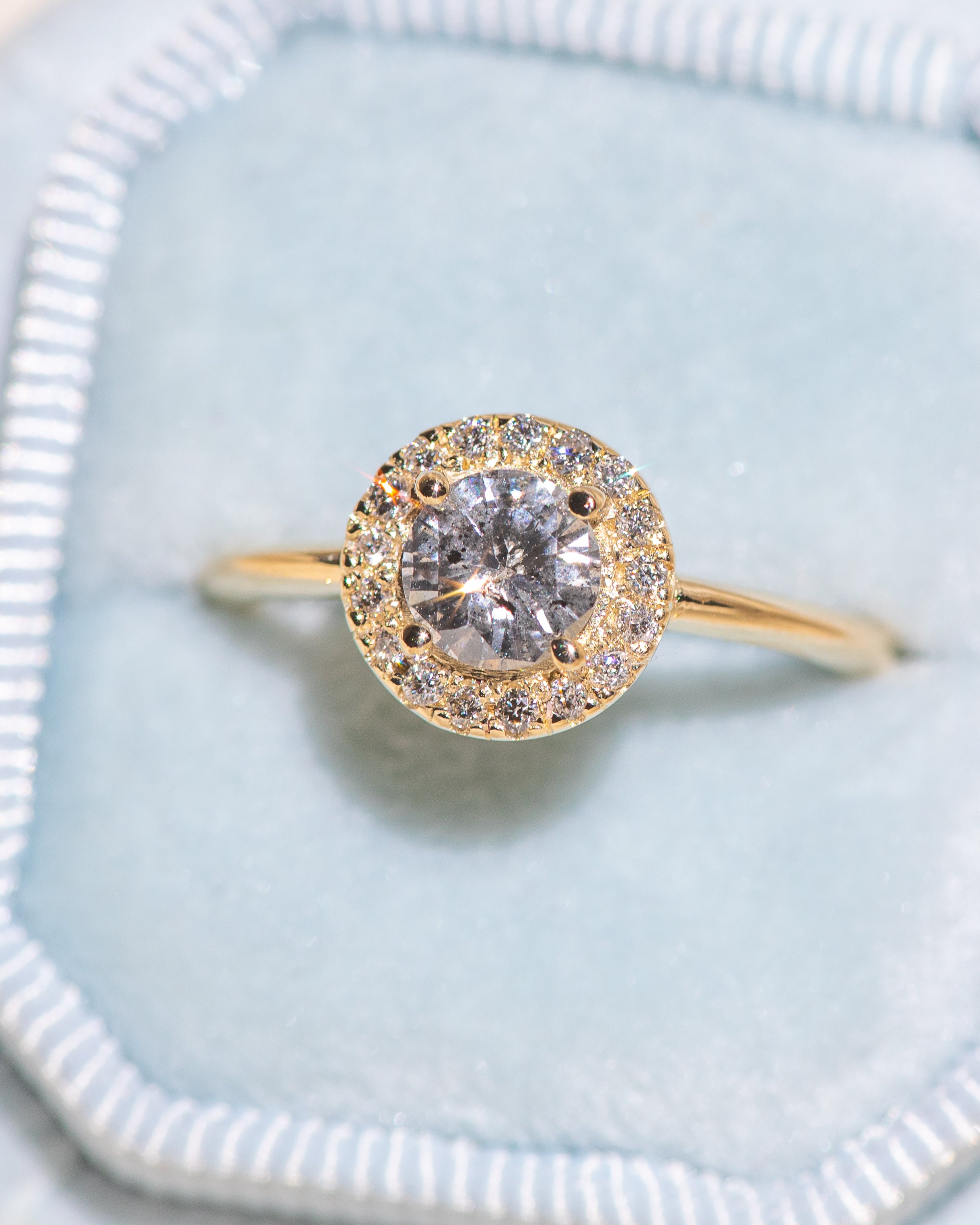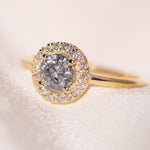 One of a kind 14k Yellow Gold ring featuring a stunning 0.66 CT round Salt & Pepper Diamond, snuggled by a halo of White Diamonds. Created to inspire regality, reminding you of your innate Divinity, to fill you with unconditional love and harmonize your strength, softness and power. Natural inclusions may be present within the stone.