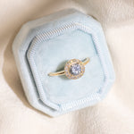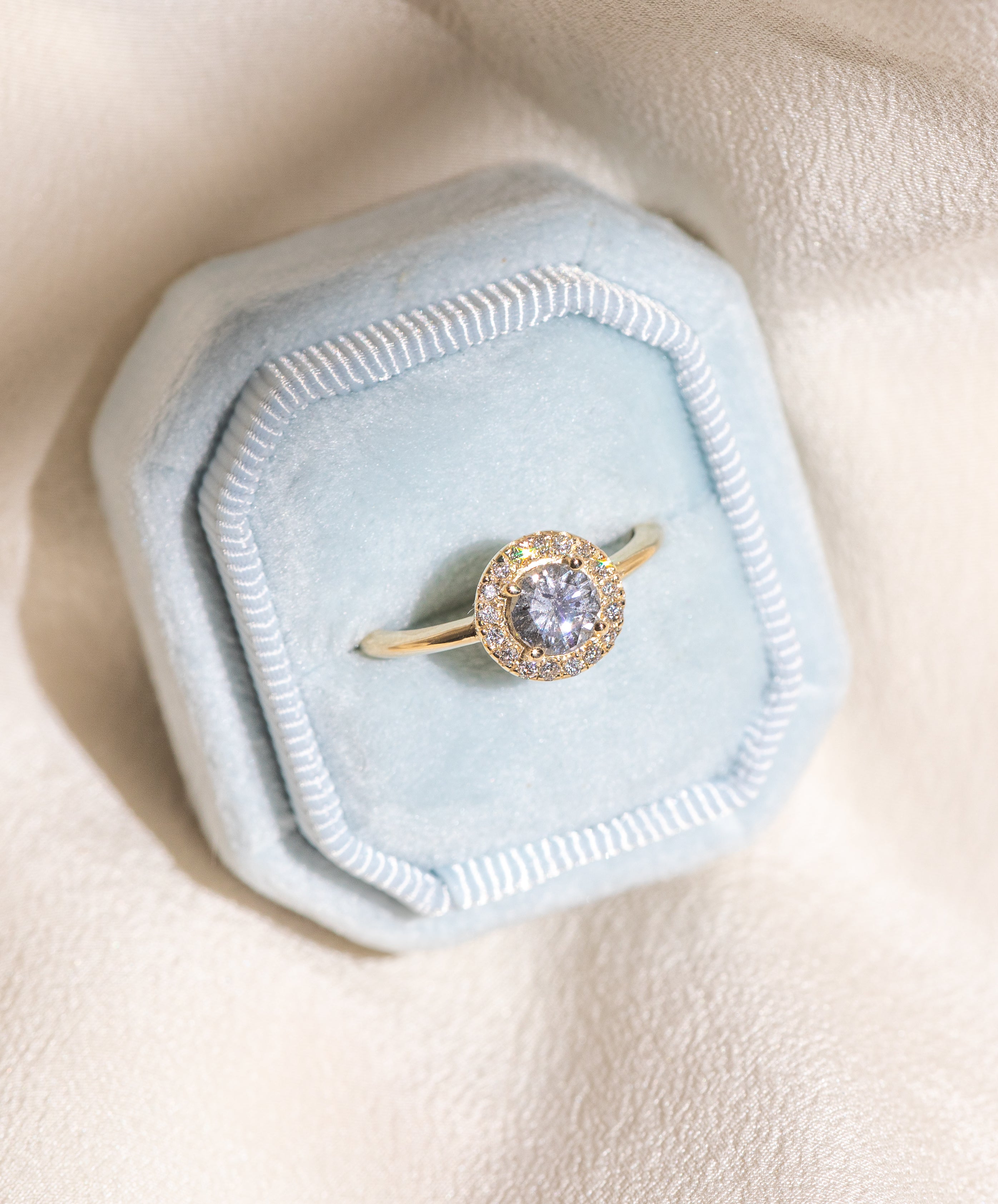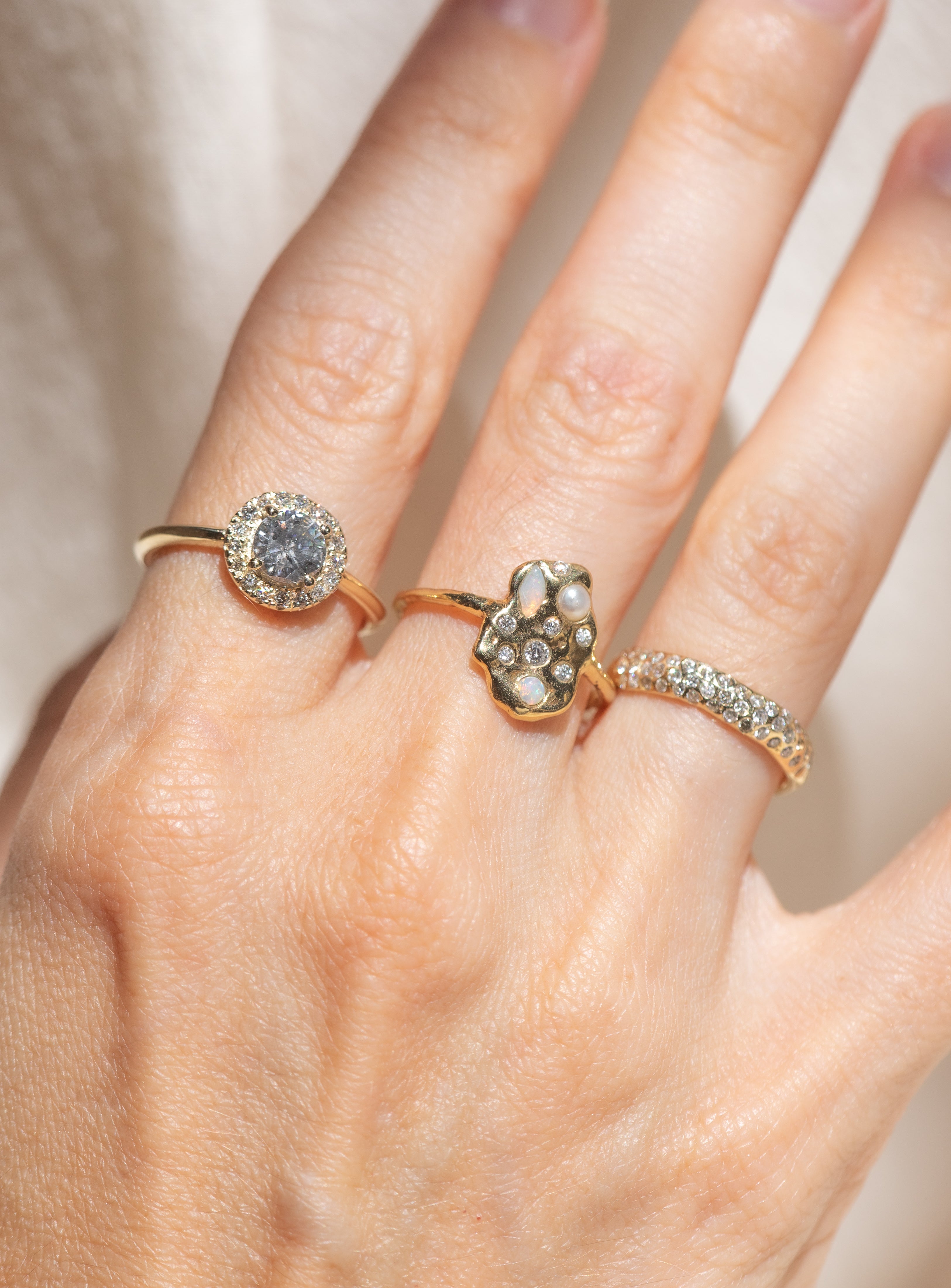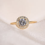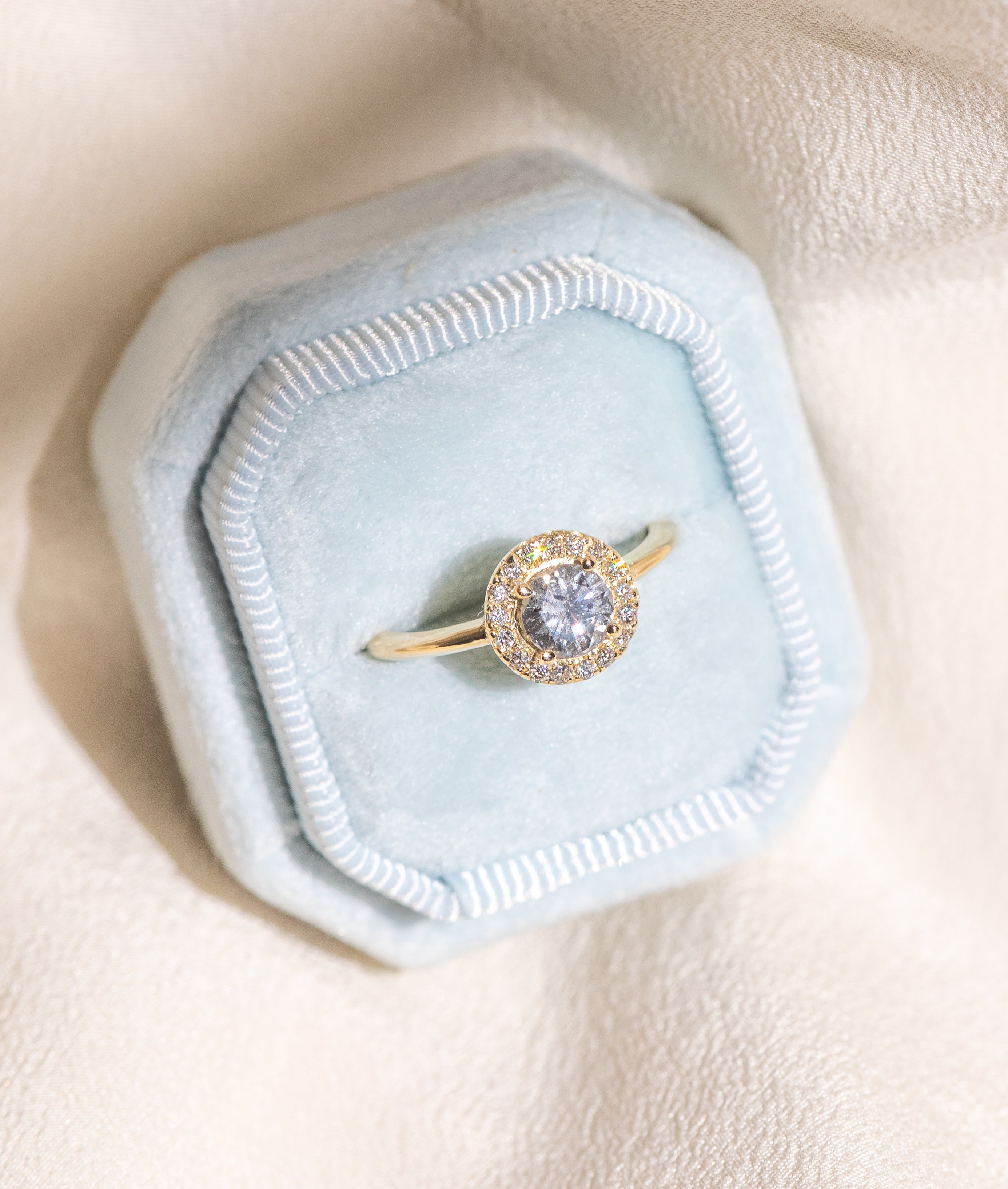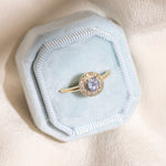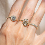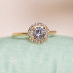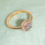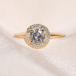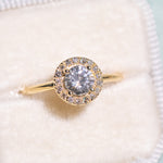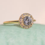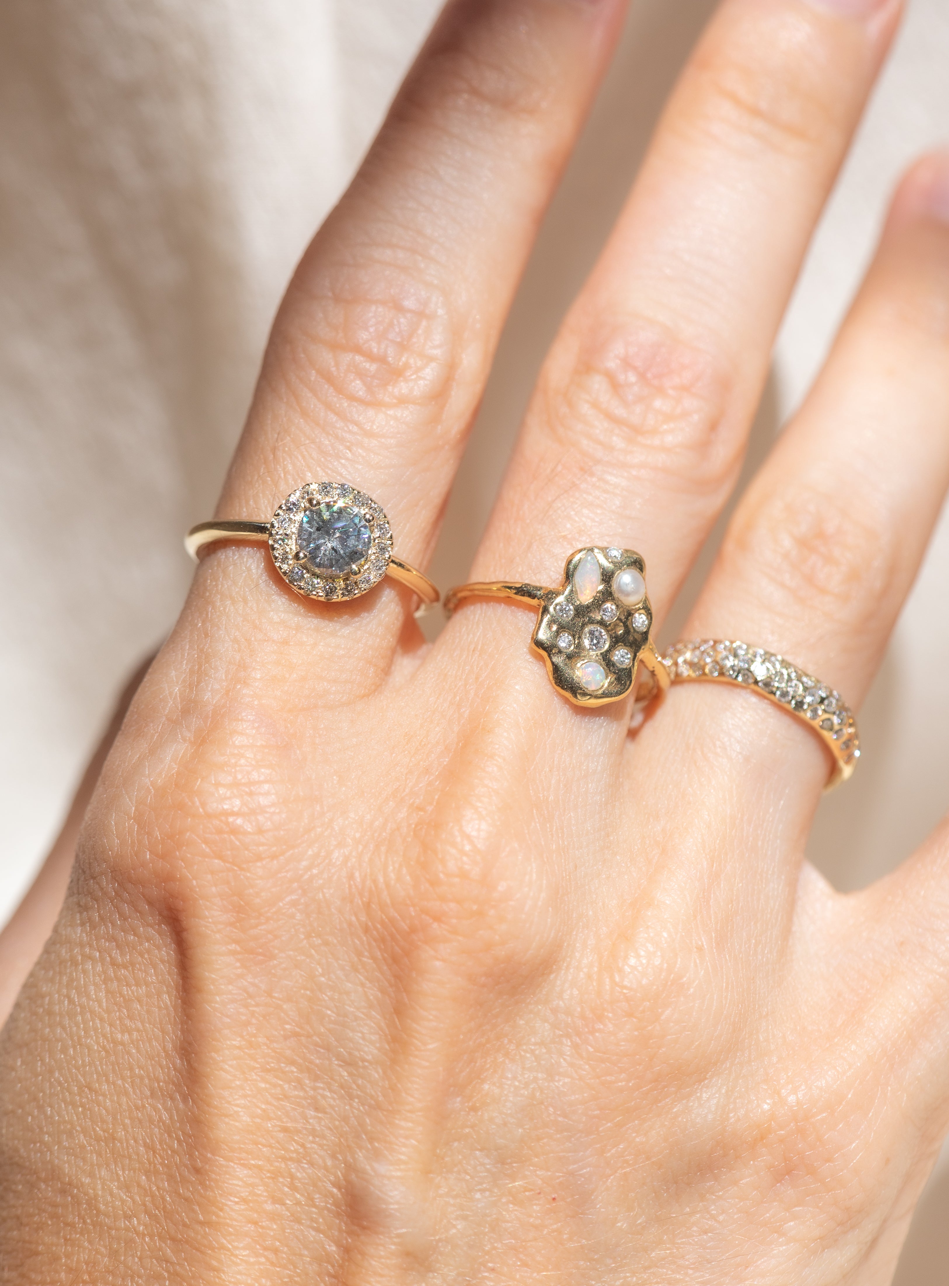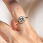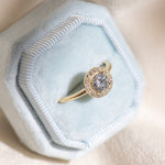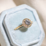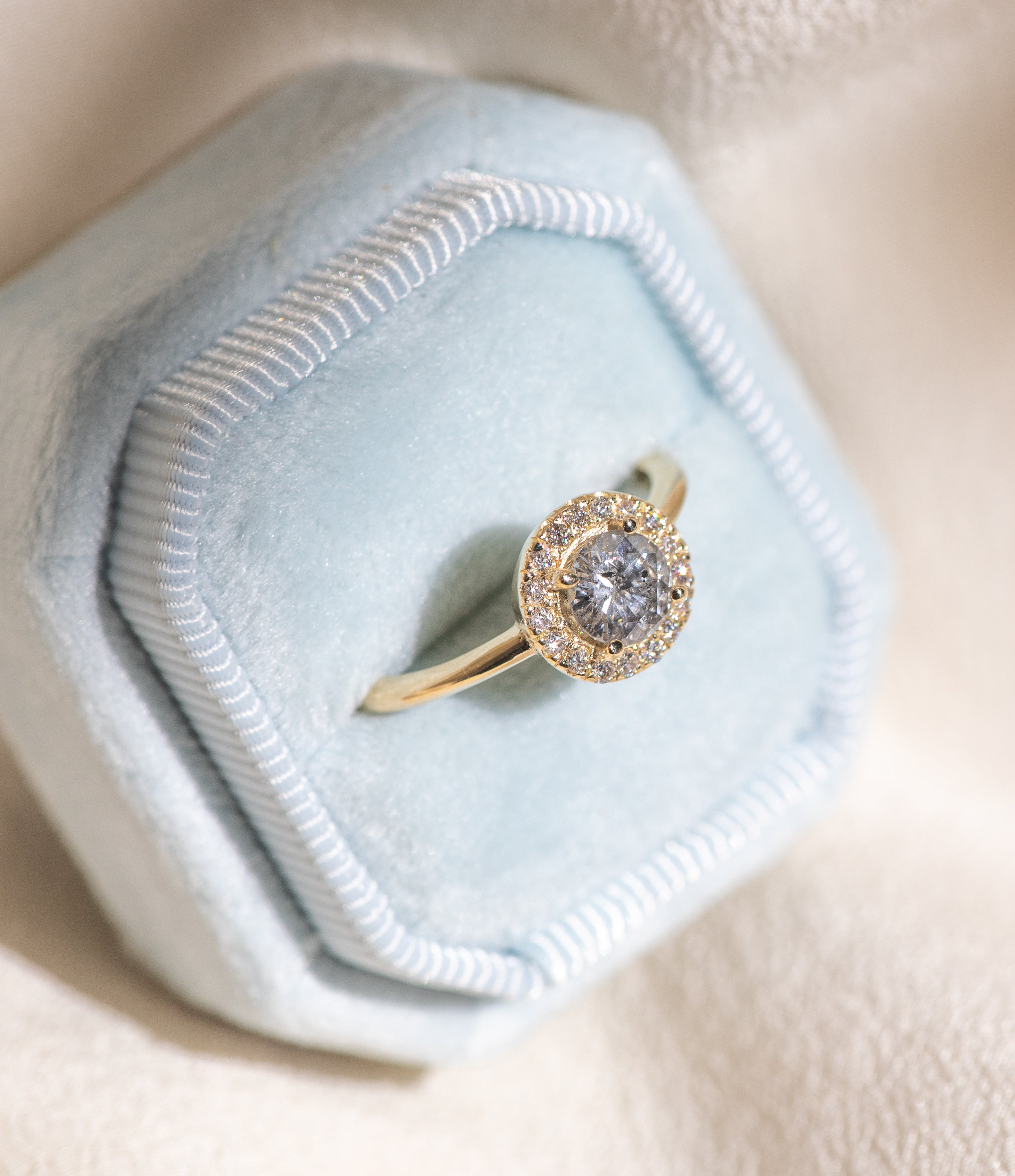 One of a kind 14k Yellow Gold ring featuring a stunning 0.66 CT round Salt & Pepper Diamond, snuggled by a halo of White Diamonds. Created to inspire regality, reminding you of your innate Divinity, to fill you with unconditional love and harmonize your strength, softness and power. Natural inclusions may be present within the stone.